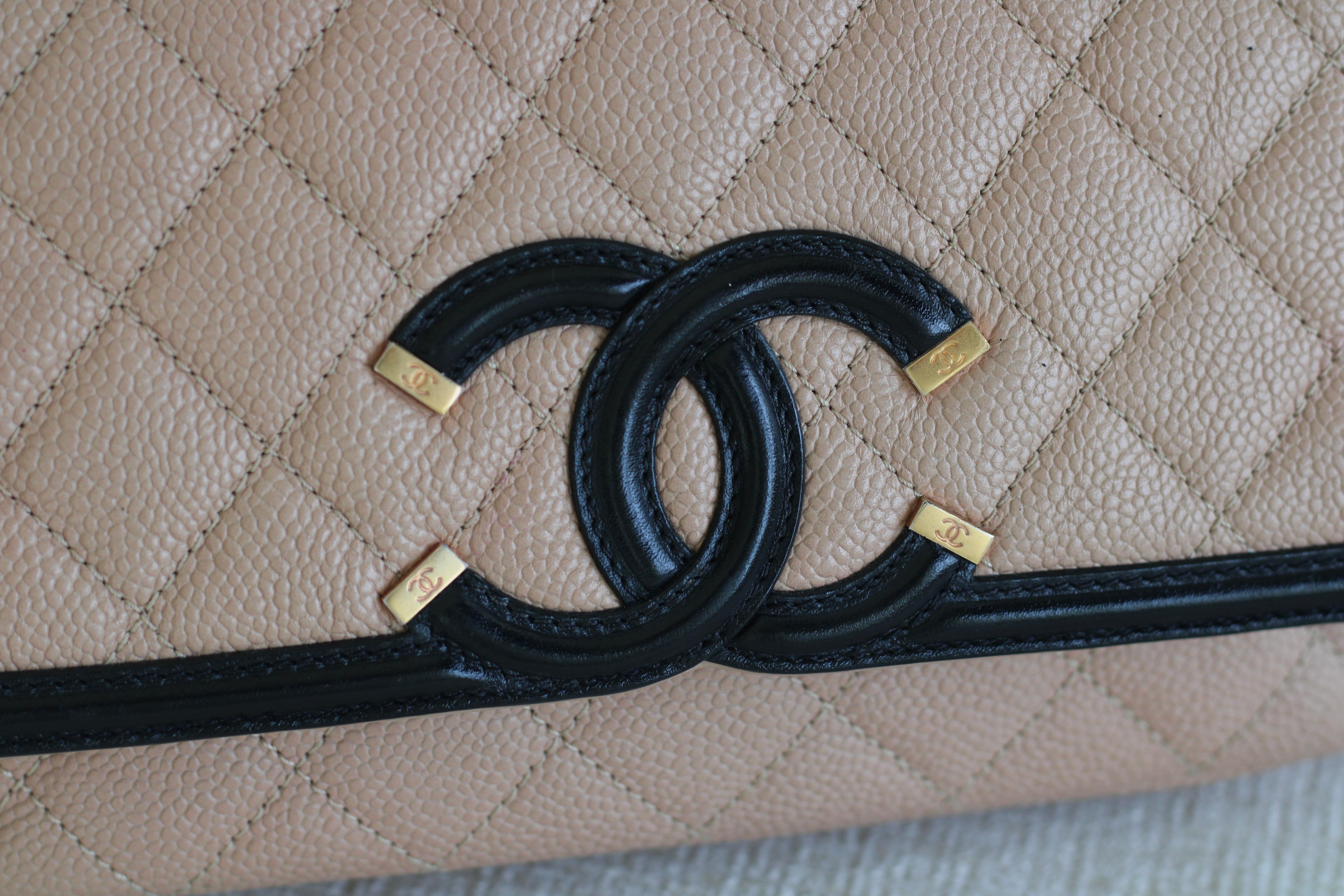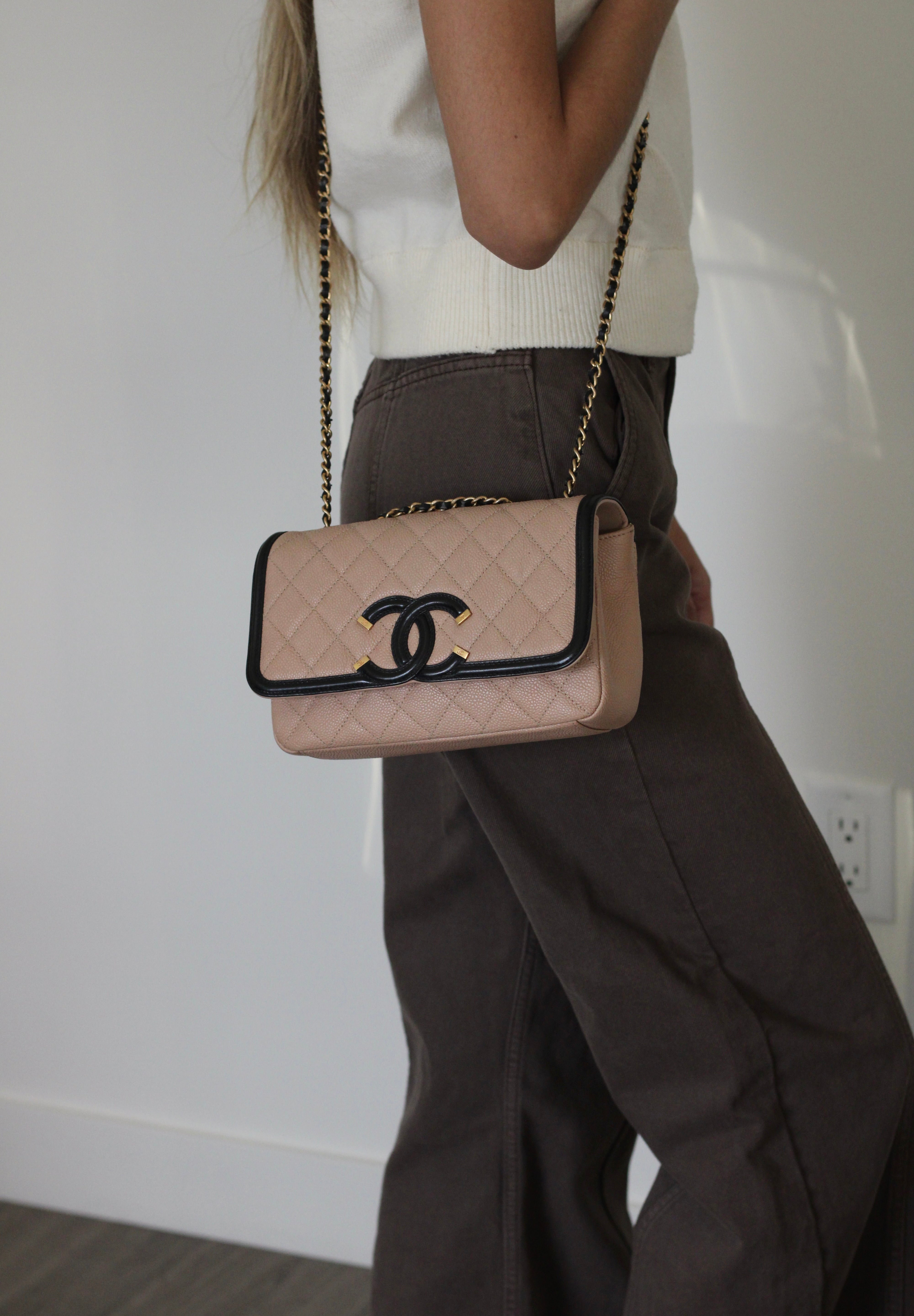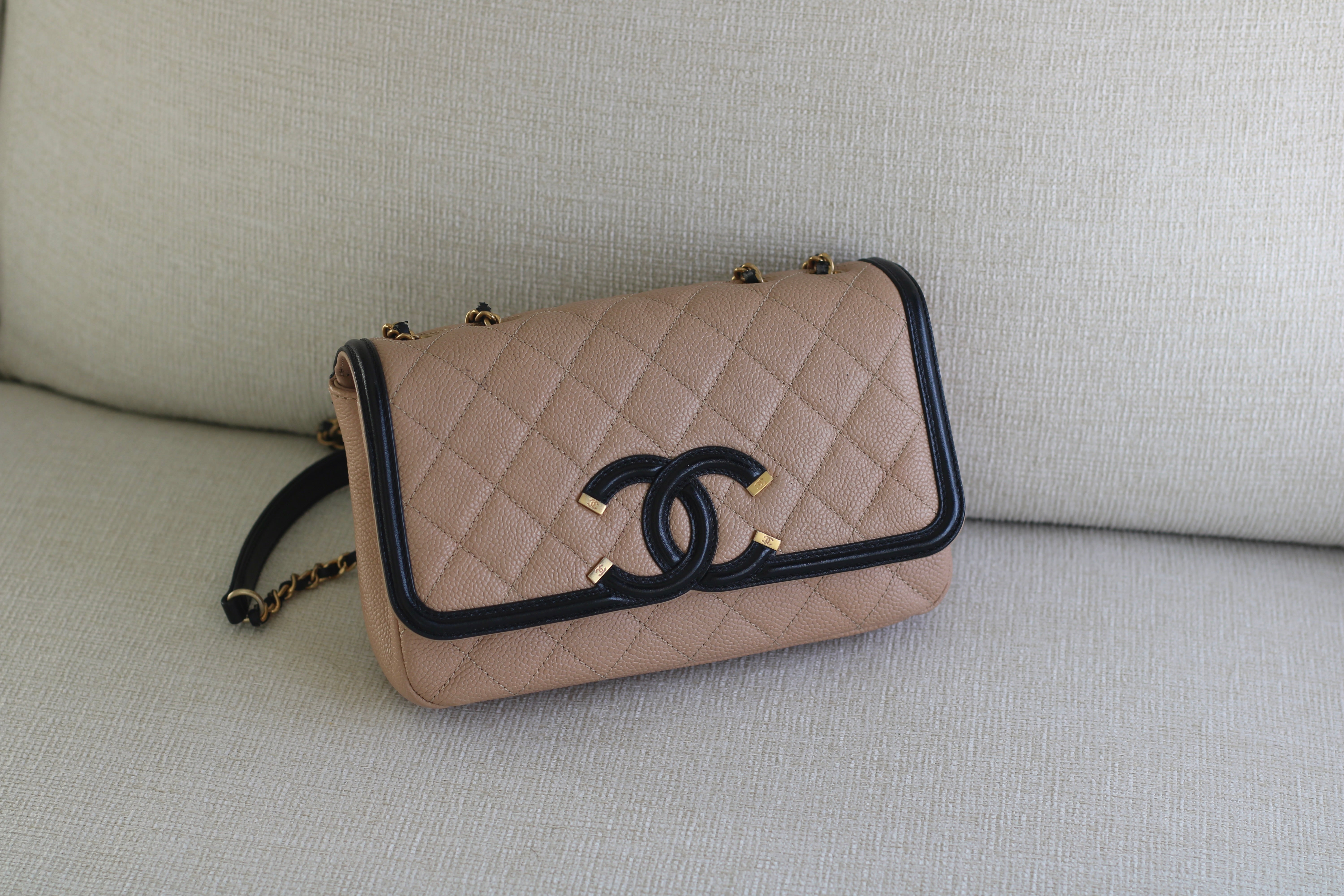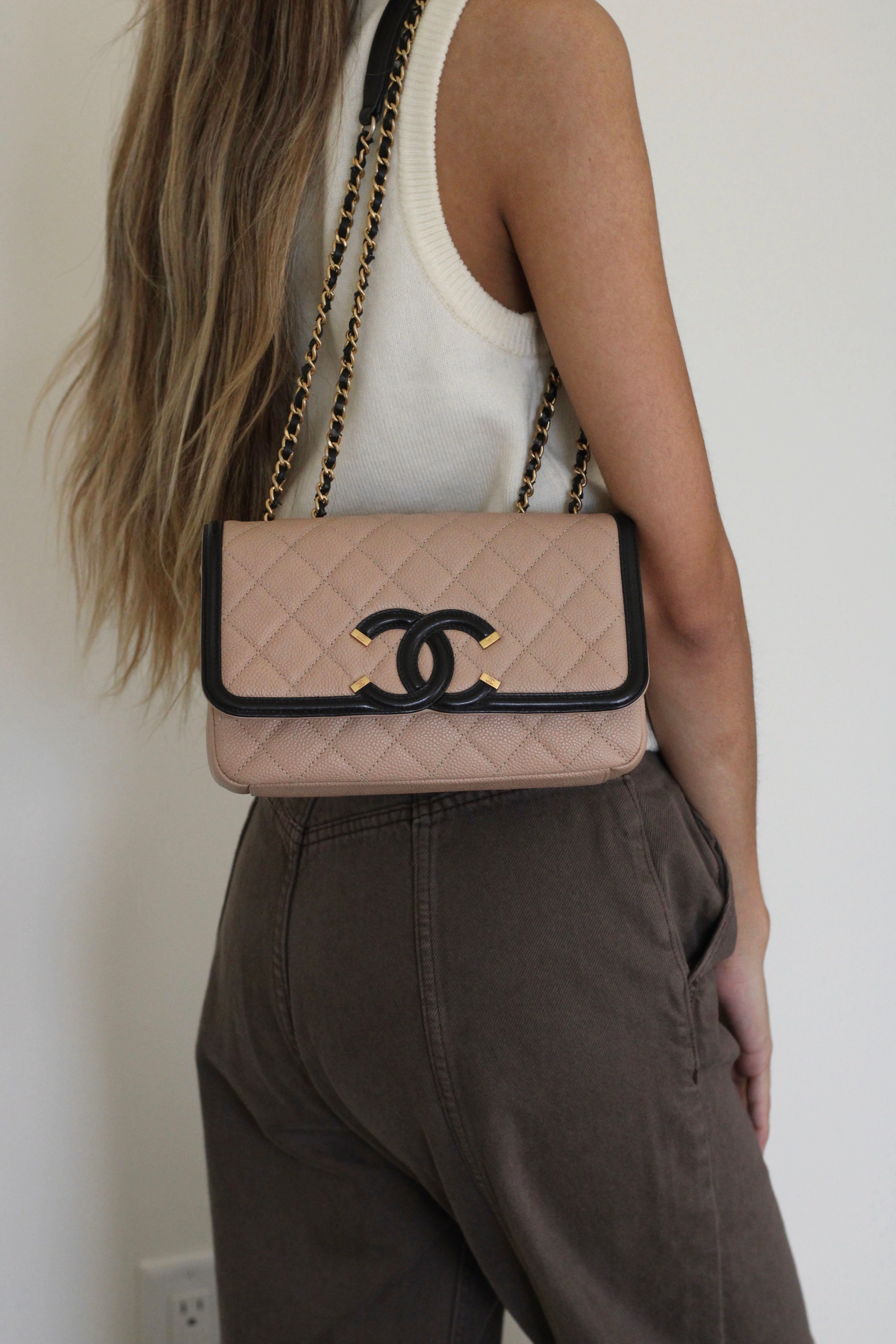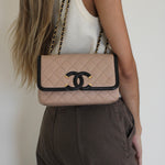 Chanel Beige & Black Caviar Small Filigree Flap with Aged Gold Hardware