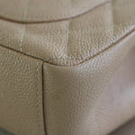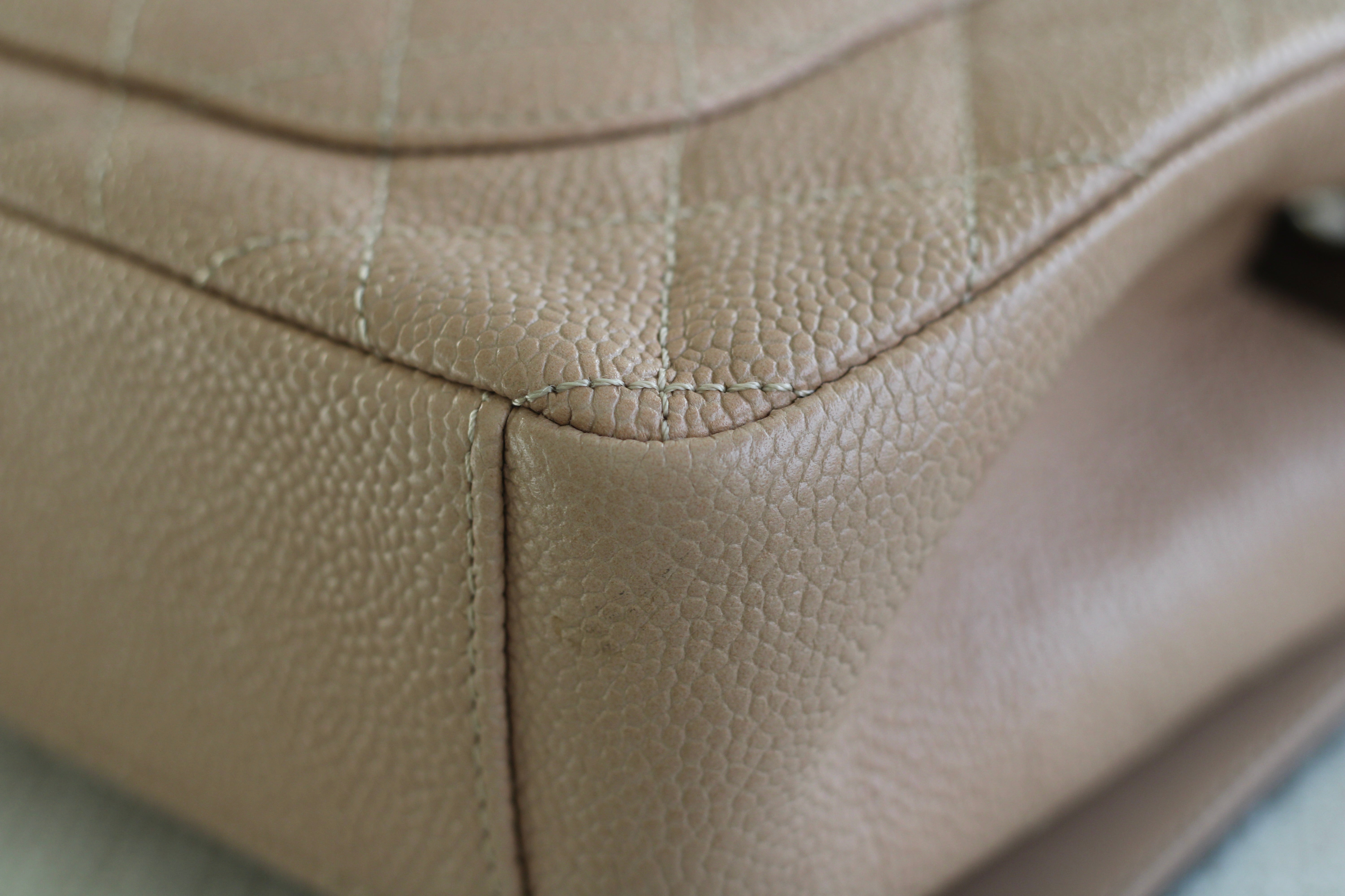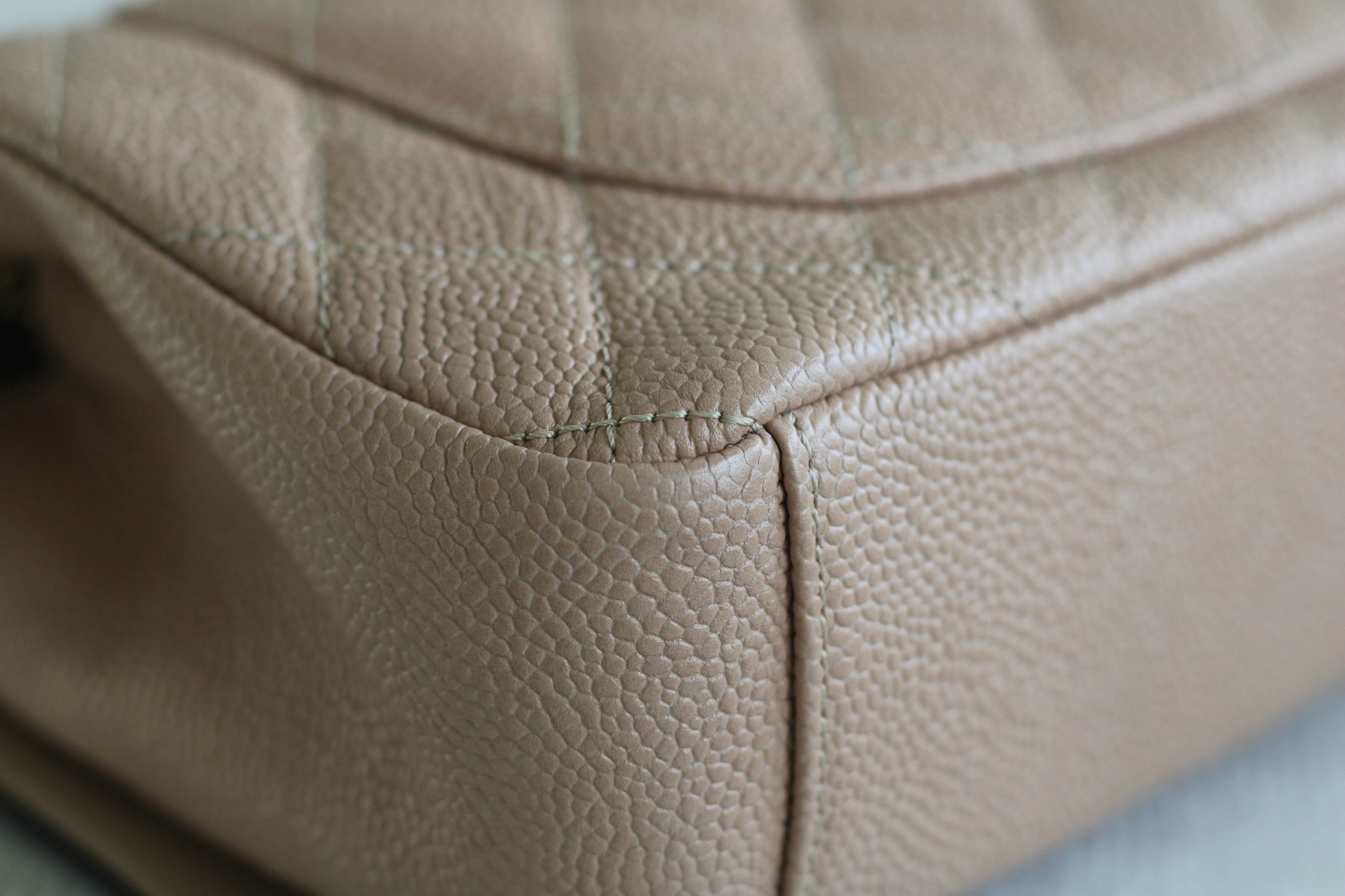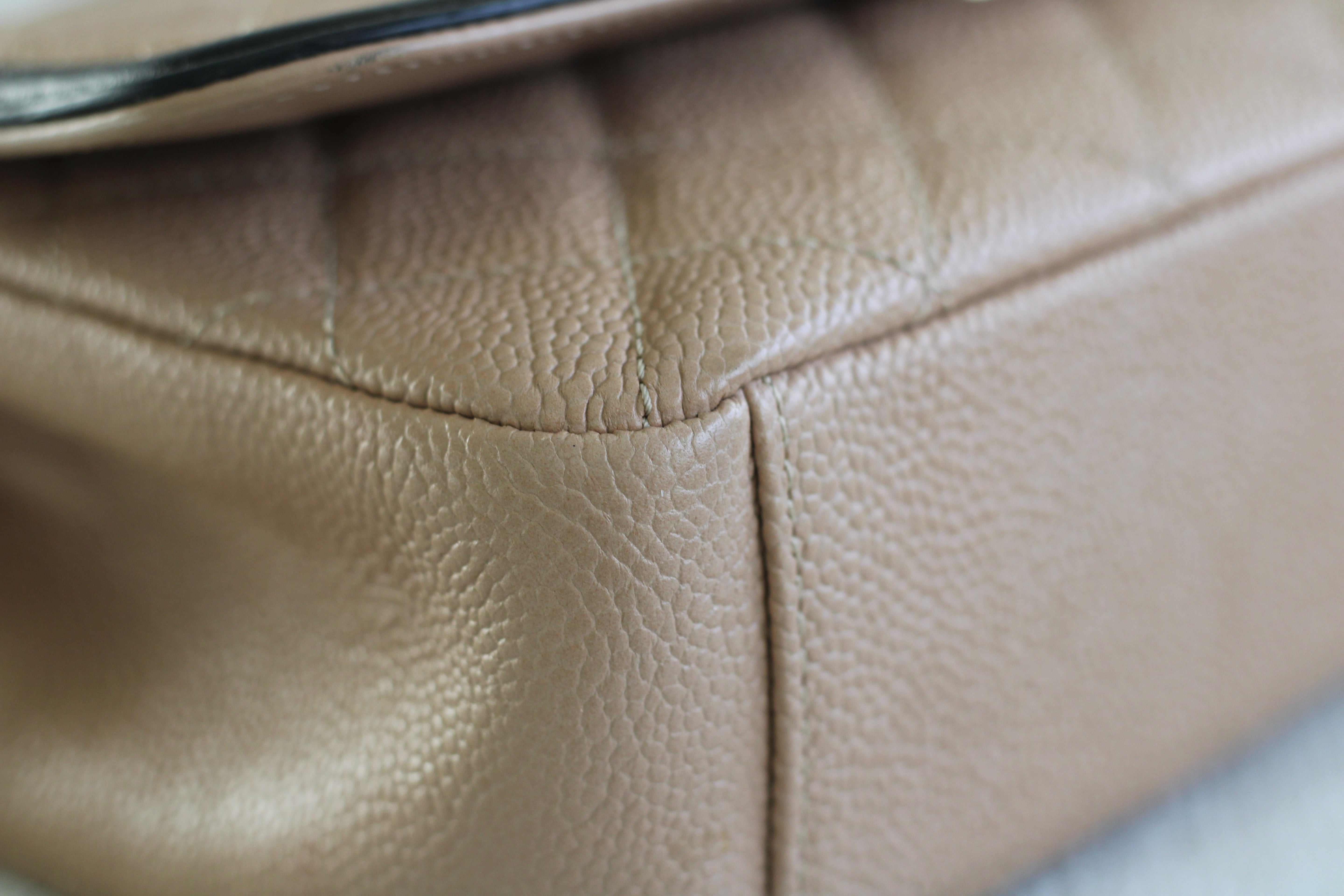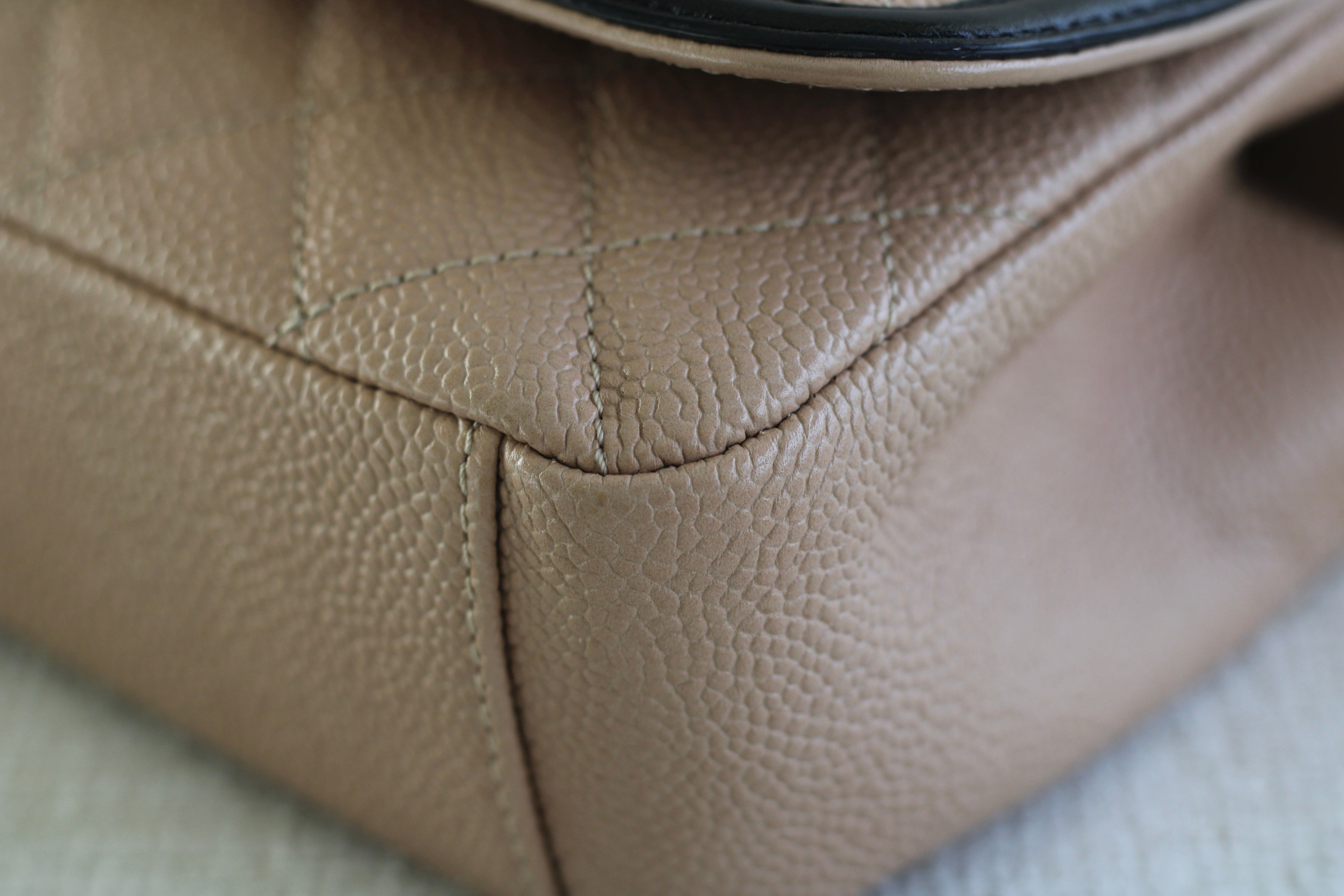 Excellent Condition. Stunning beige caviar leather lined with a smooth black leather trim. Excellent structure and corners. Straps have wear and some leather peeling. Some small marks near bottom and corners as pictured. Beautiful aged gold hardware with stickers still attached.