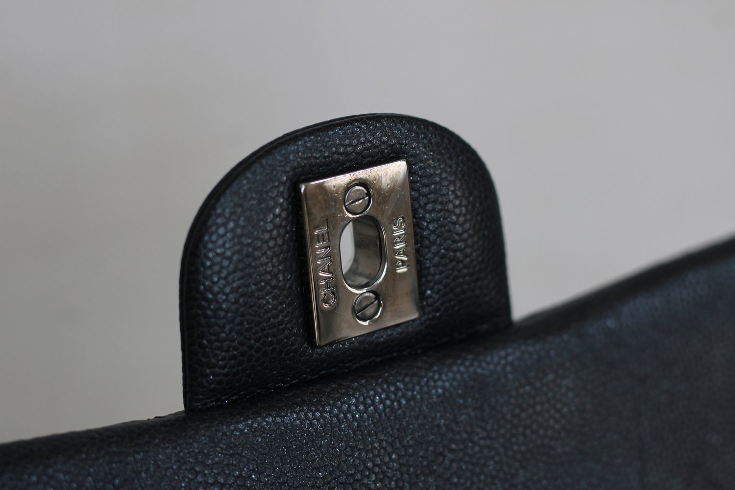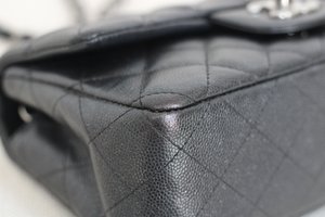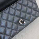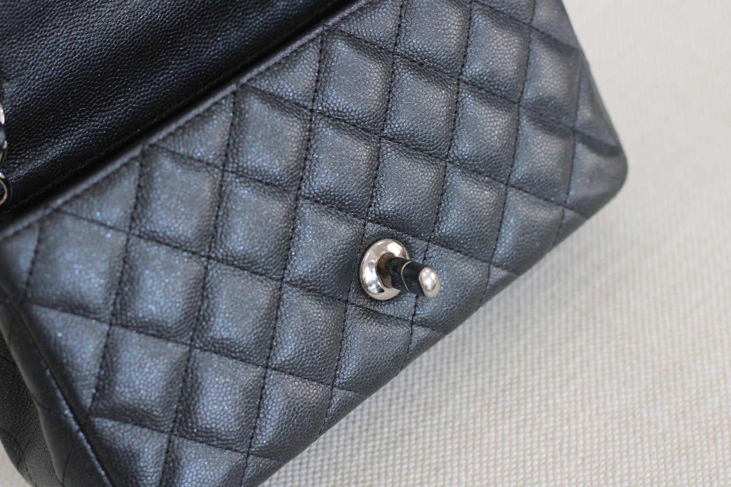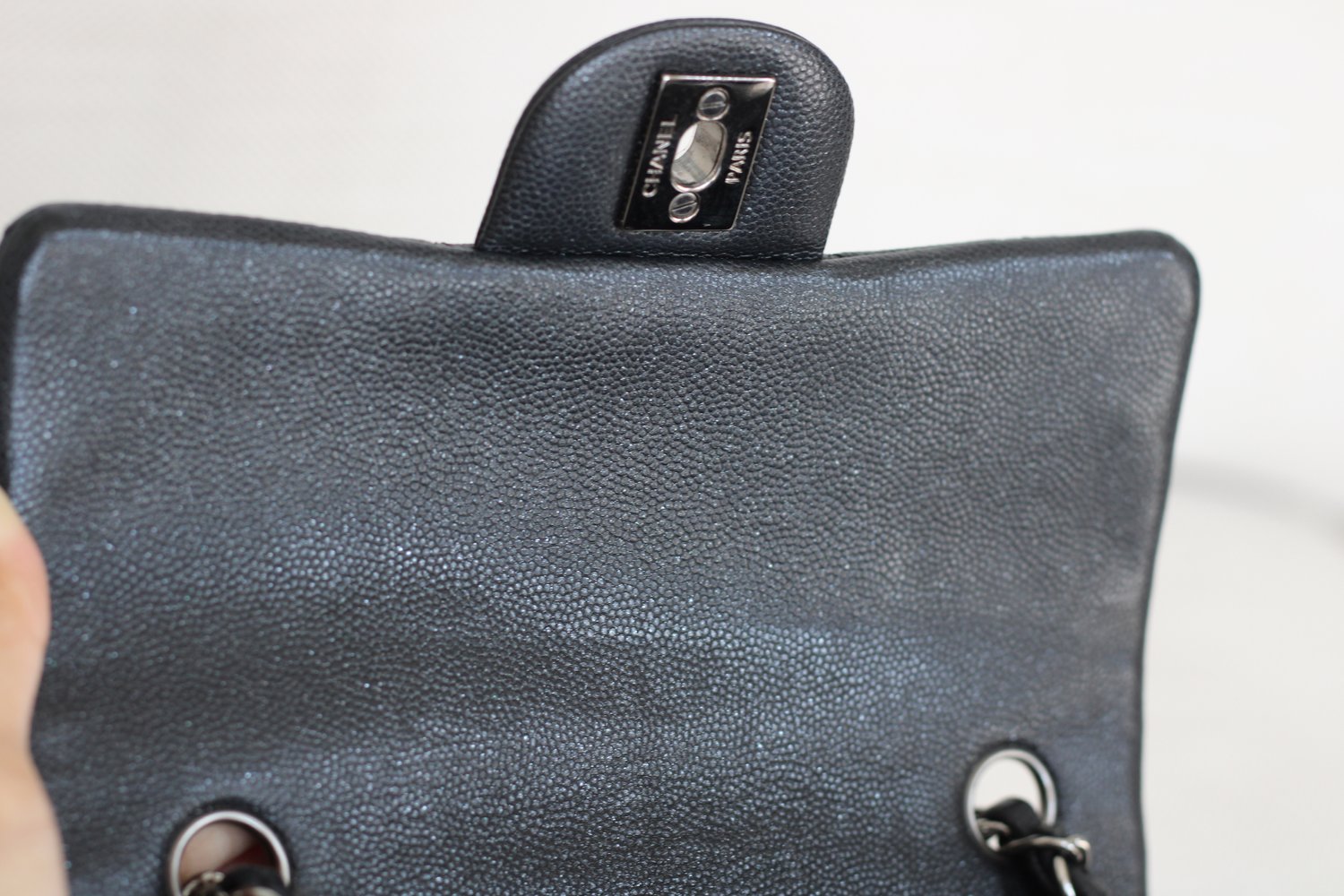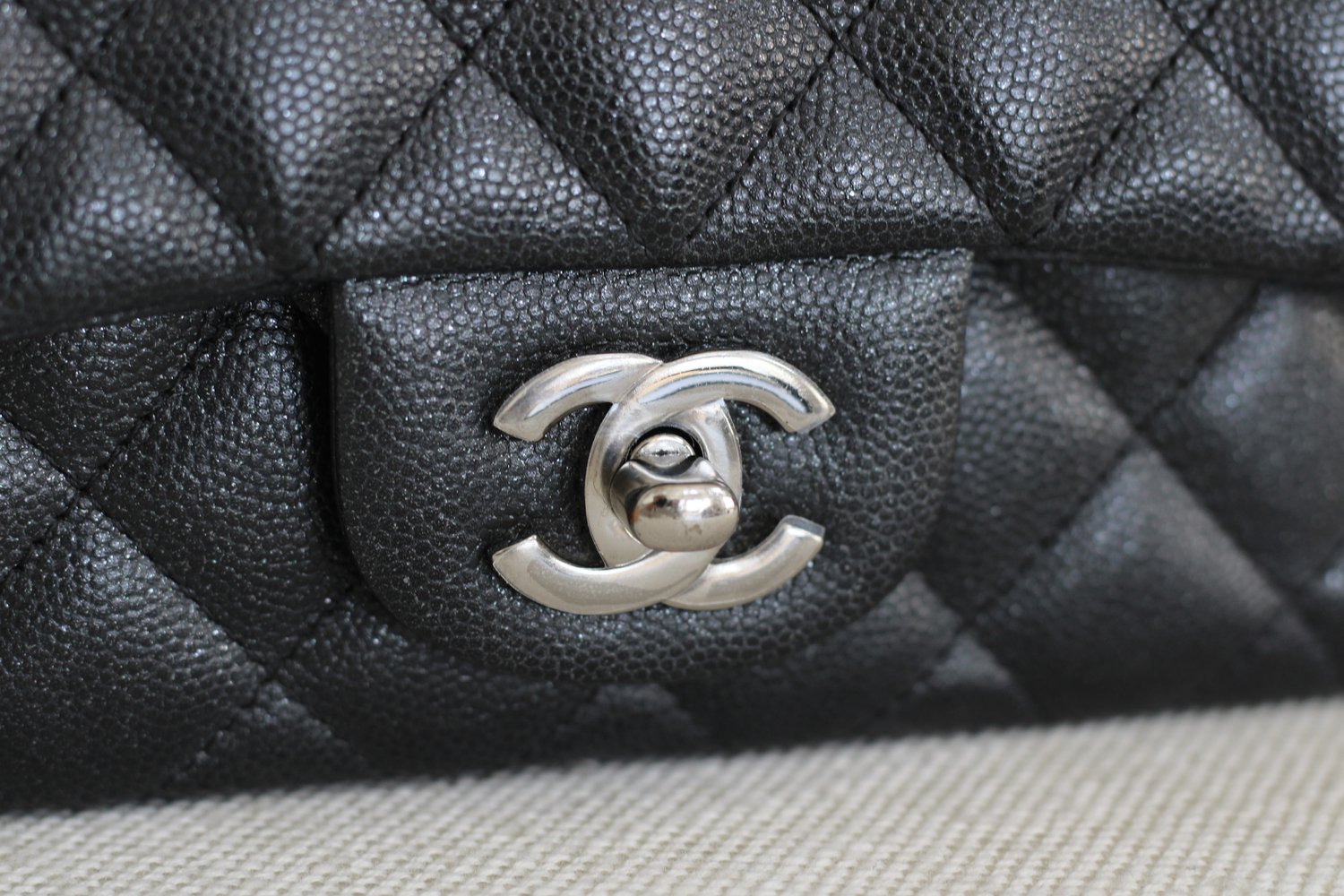 Excellent Condition. Excellent structure and corners. Stunning iridescent black caviar complimented by brilliant ruthenium hardware. Light hairline scratches on hardware. Sticker on CC hardware. Minimal to no wear on corners. Some tiny lightening in the middle of male part of cc lock.