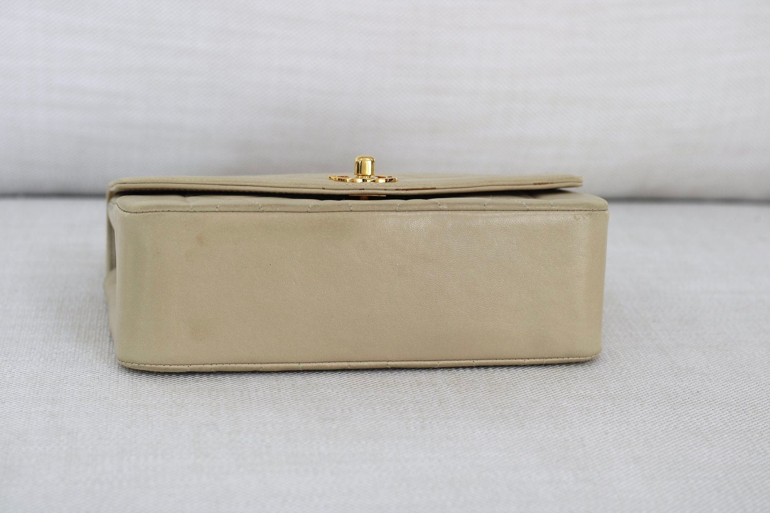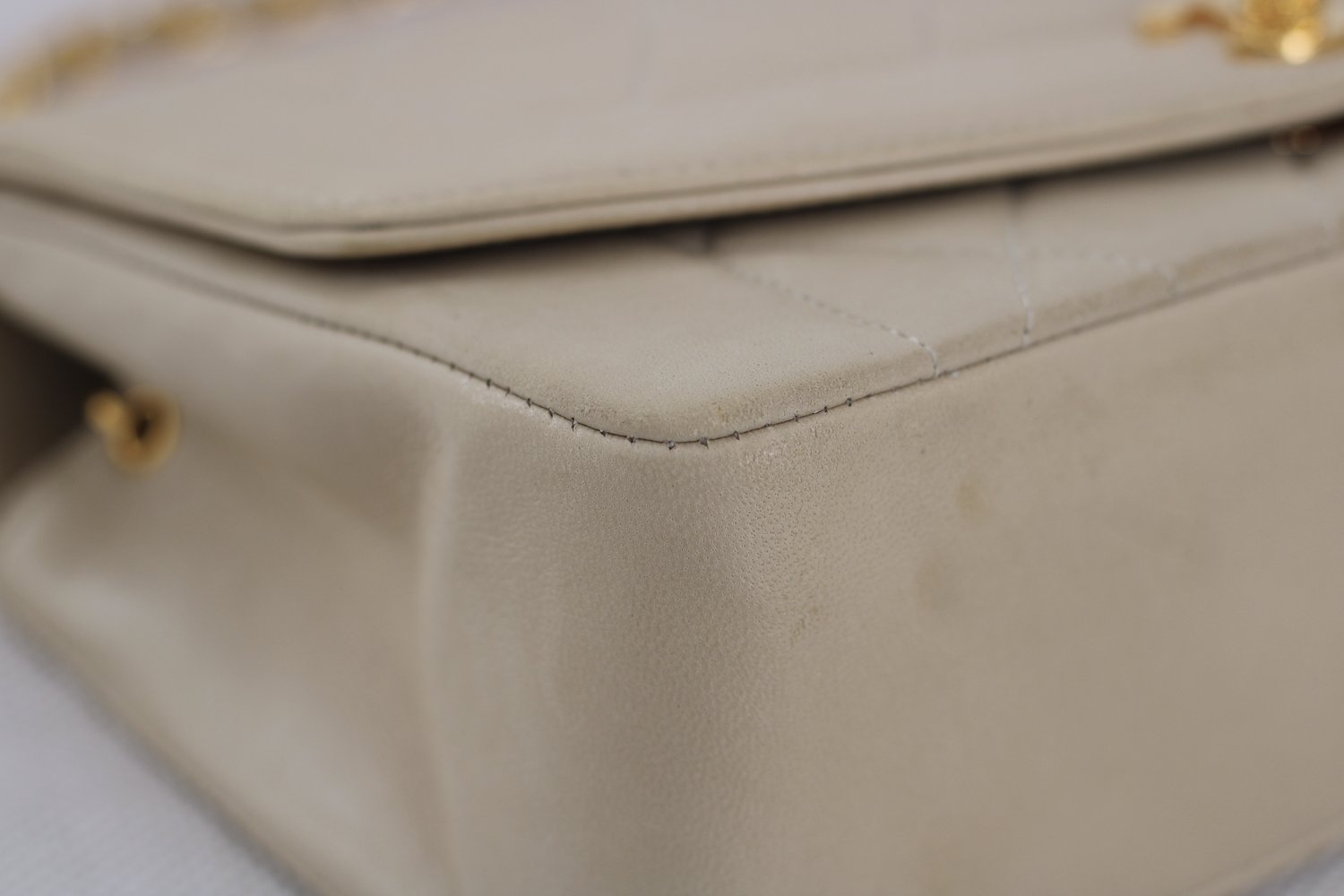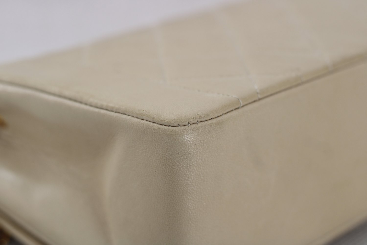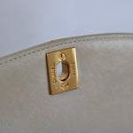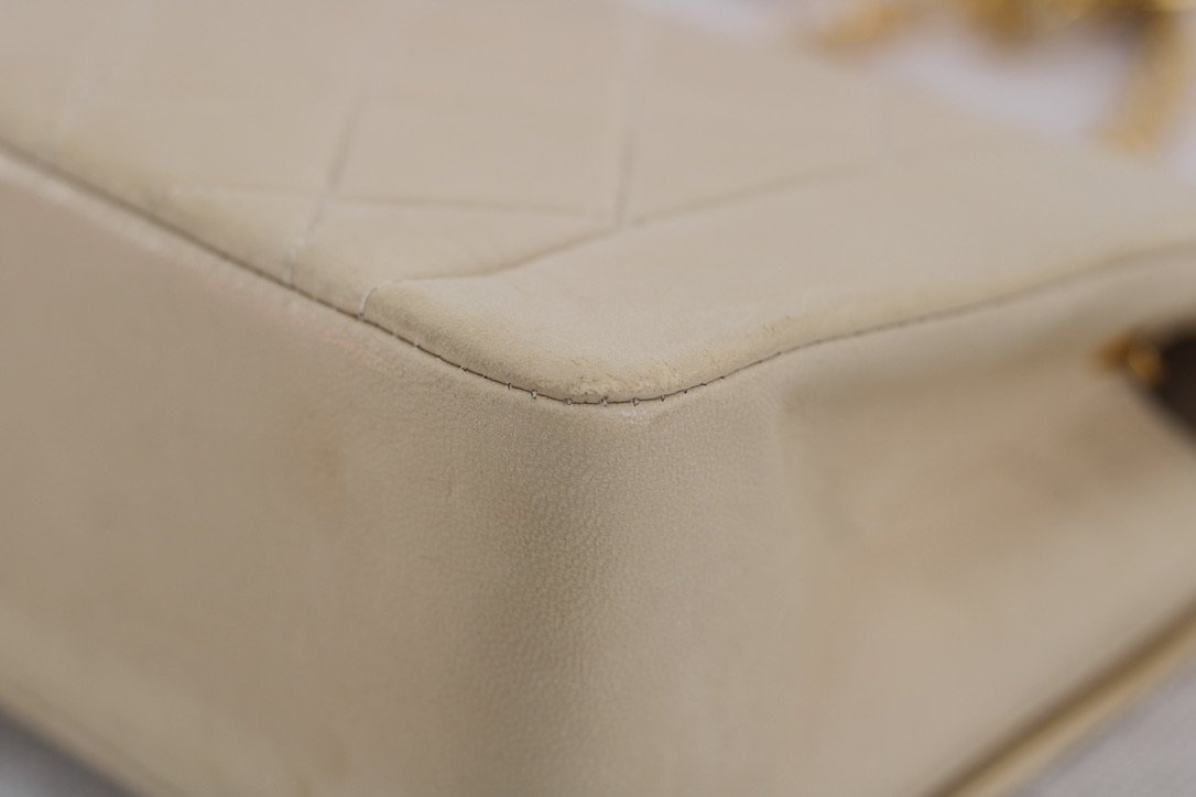 Great Vintage Condition. Gorgeous light beige lambskin in a cream shade. Excellent structure and some light wear on edges and corners. Some darkening on bottom and some light to minimal color transfer on back. Some scratches on 24k Gold Hardware.