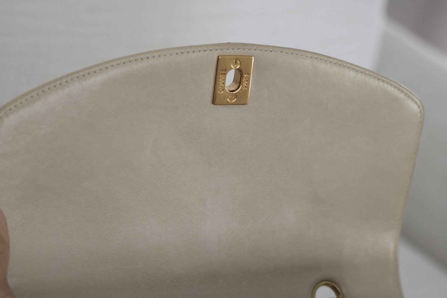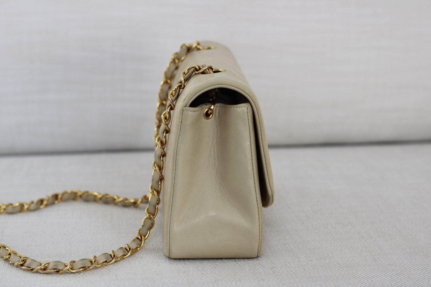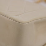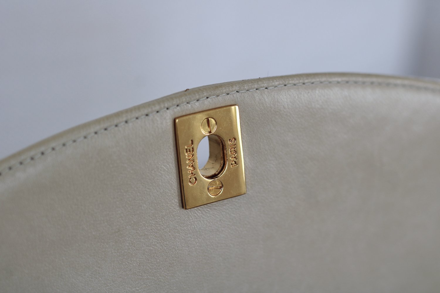 Great Vintage Condition. Gorgeous light beige lambskin in a cream shade. Excellent structure and some light wear on edges and corners. Some darkening on bottom and some light to minimal color transfer on back. Some scratches on 24k Gold Hardware.