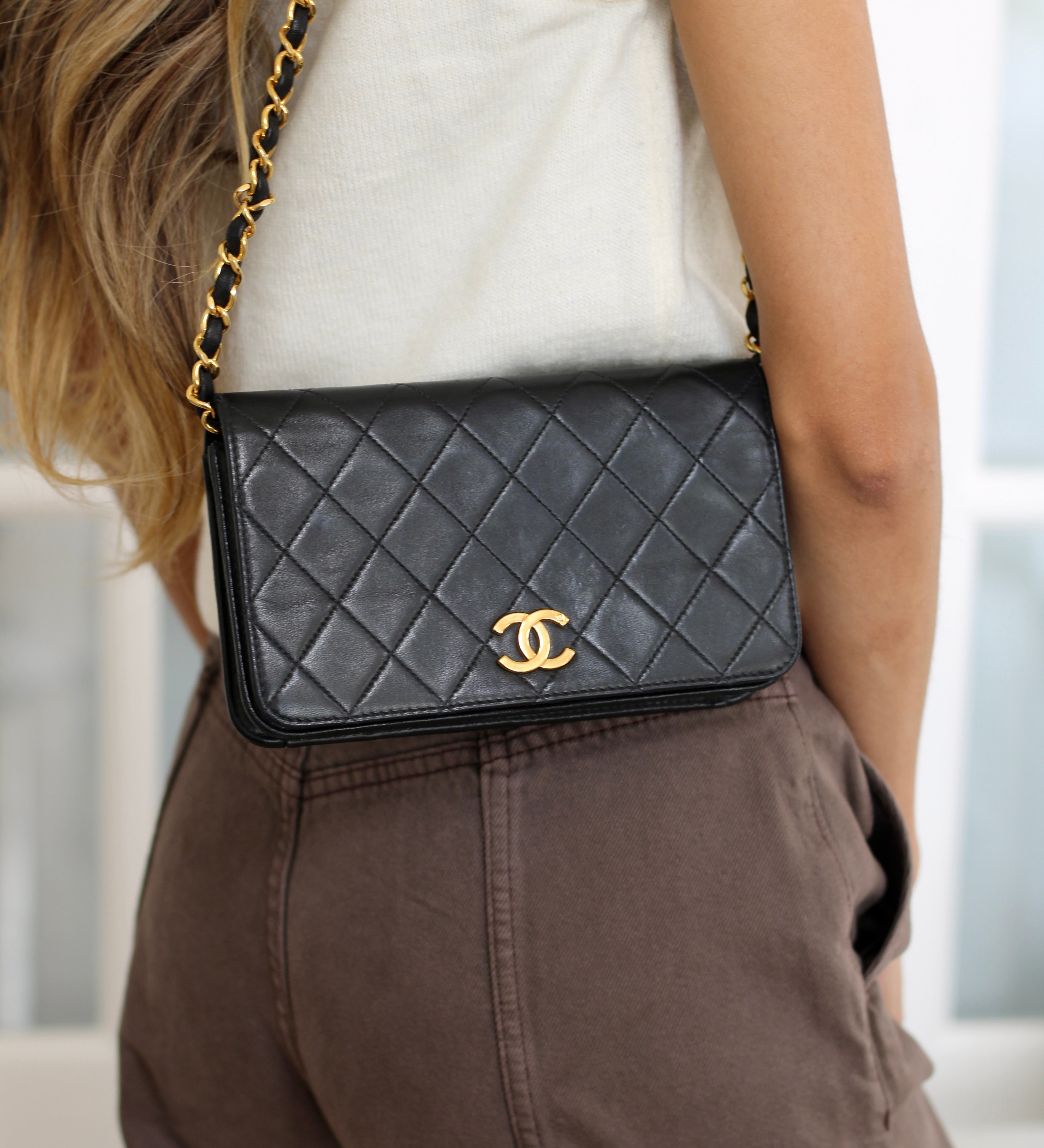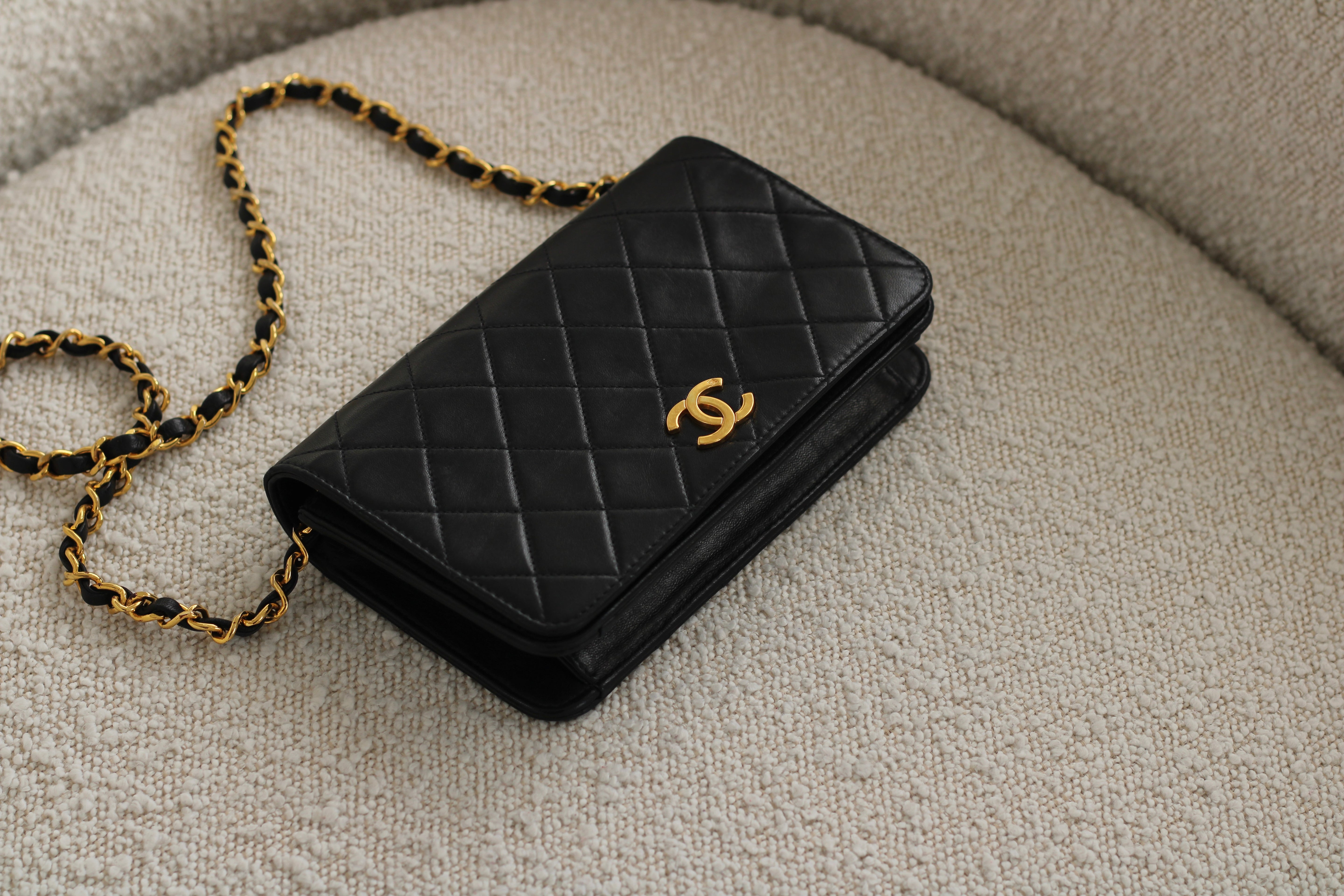 Vintage Chanel Black Lambskin Full Flap Wallet on Chain with 24k Gold Hardware