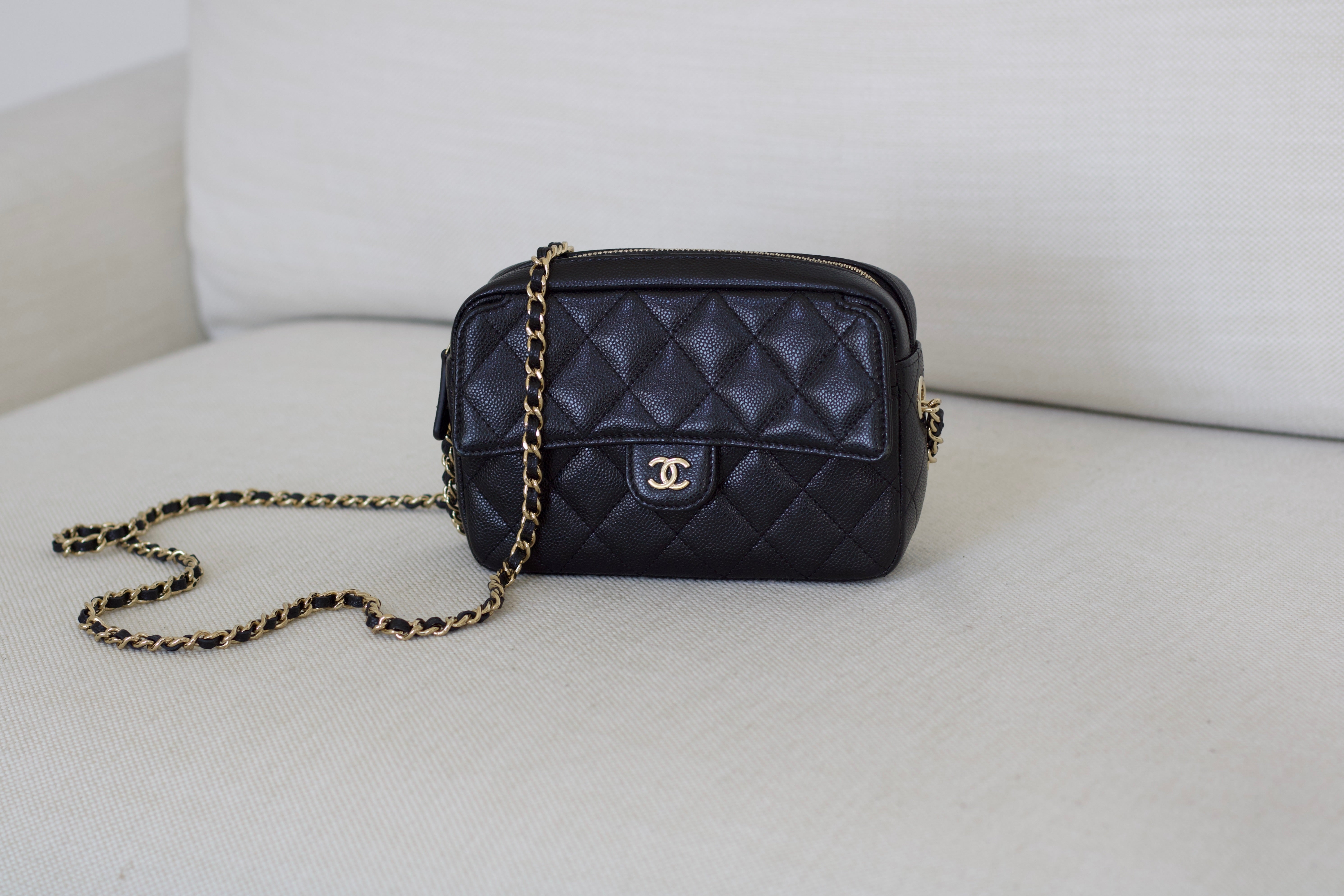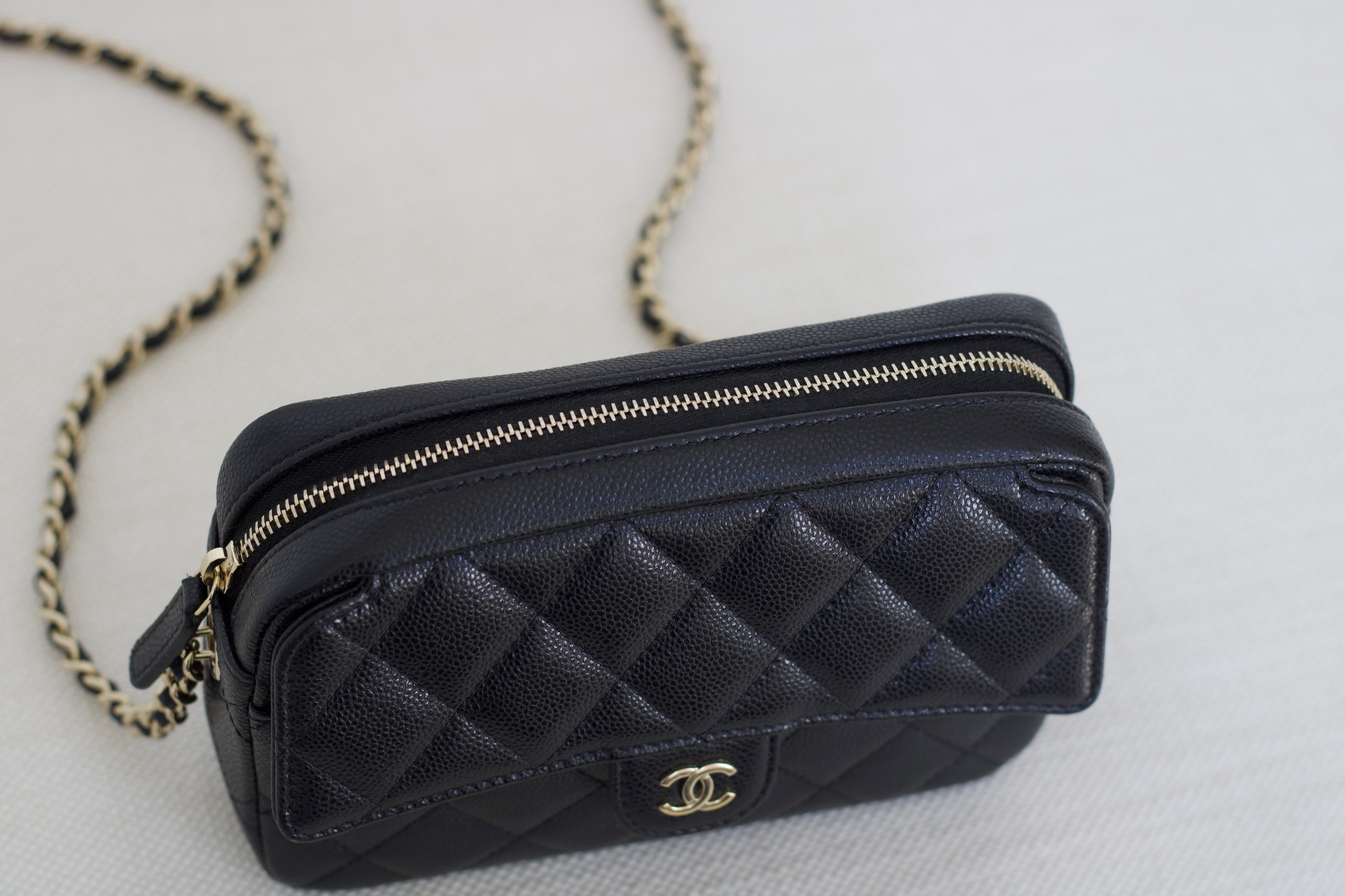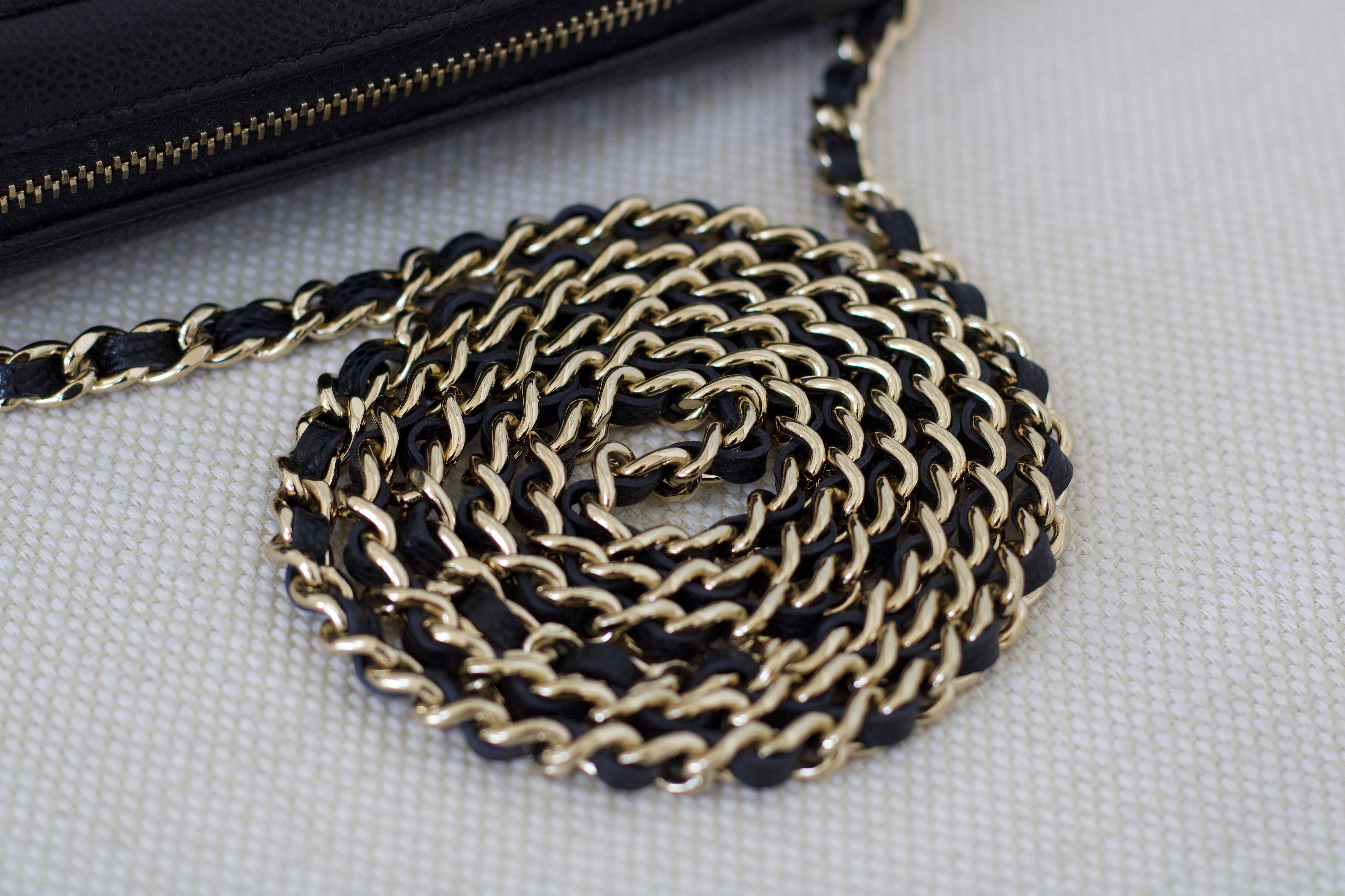 Chanel 25C Black Caviar Mini Zip Clutch on Chain with Light Gold Hardware
