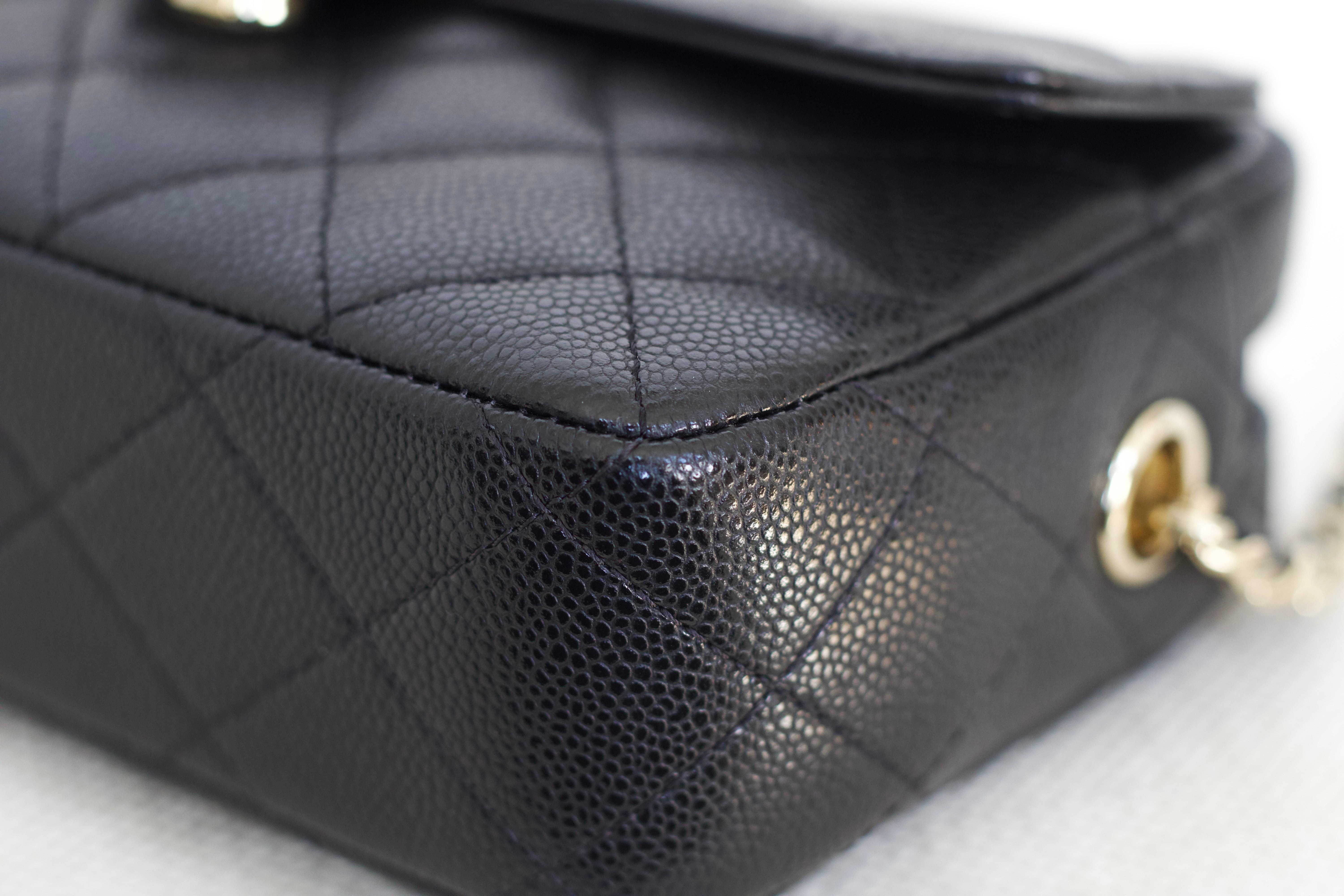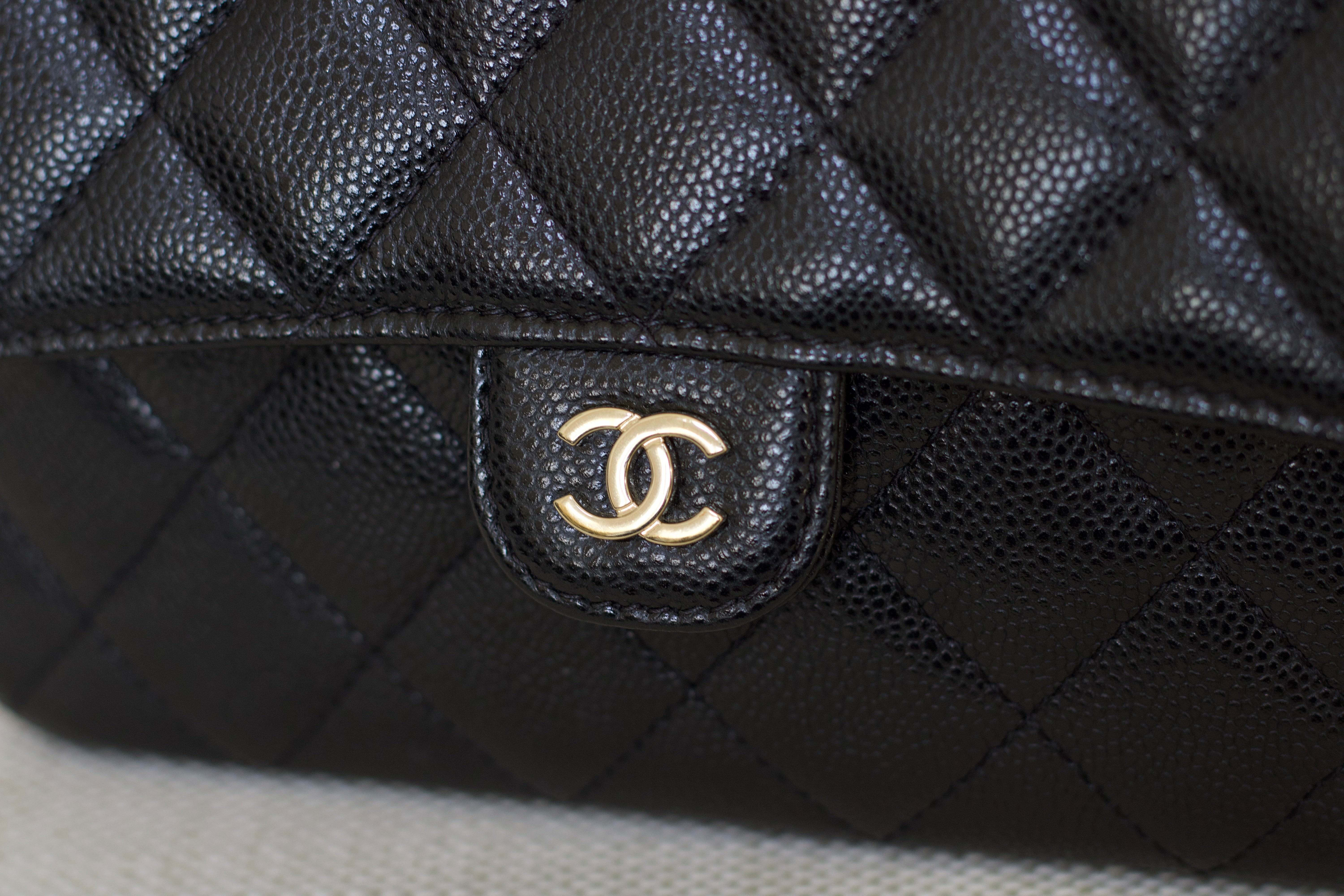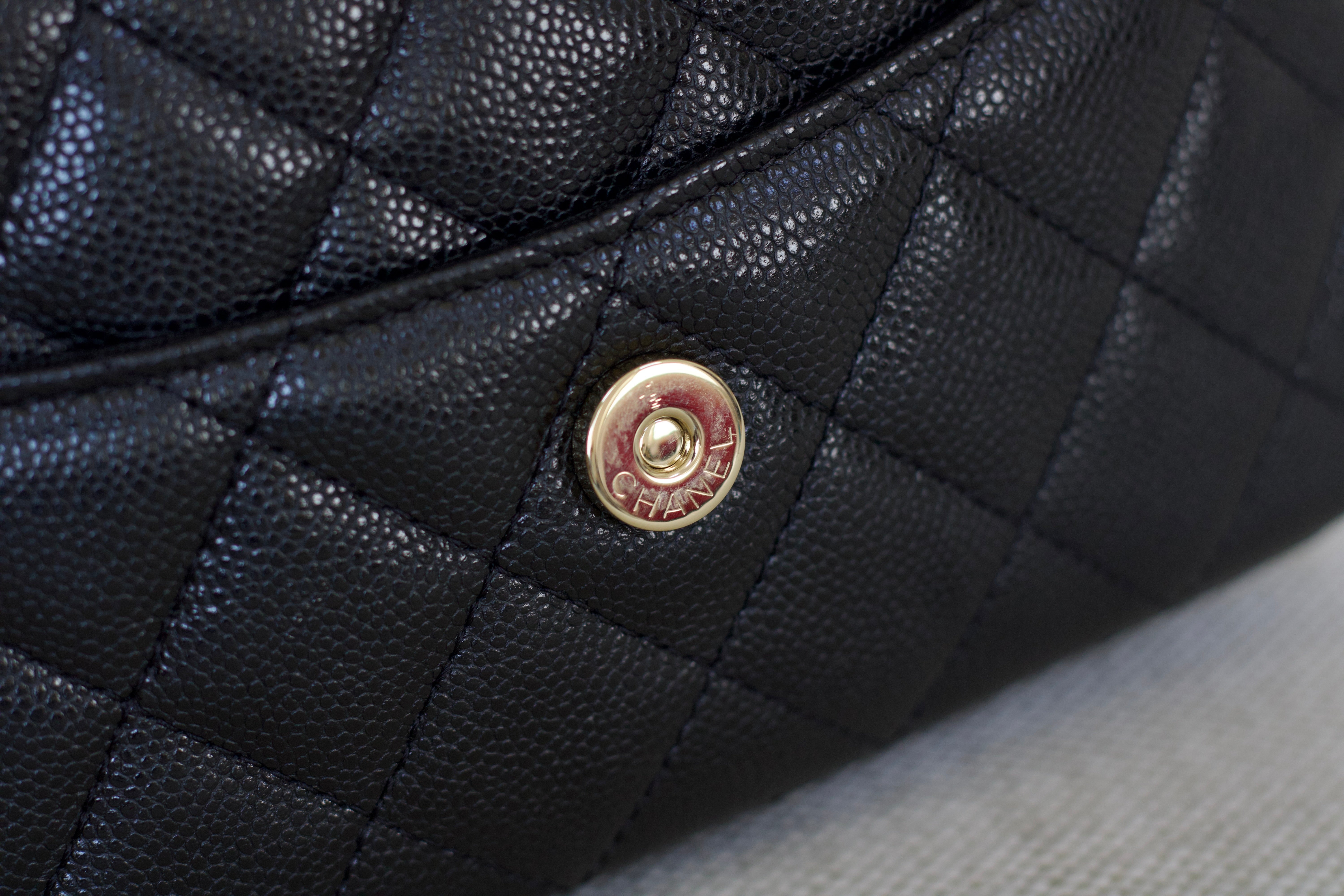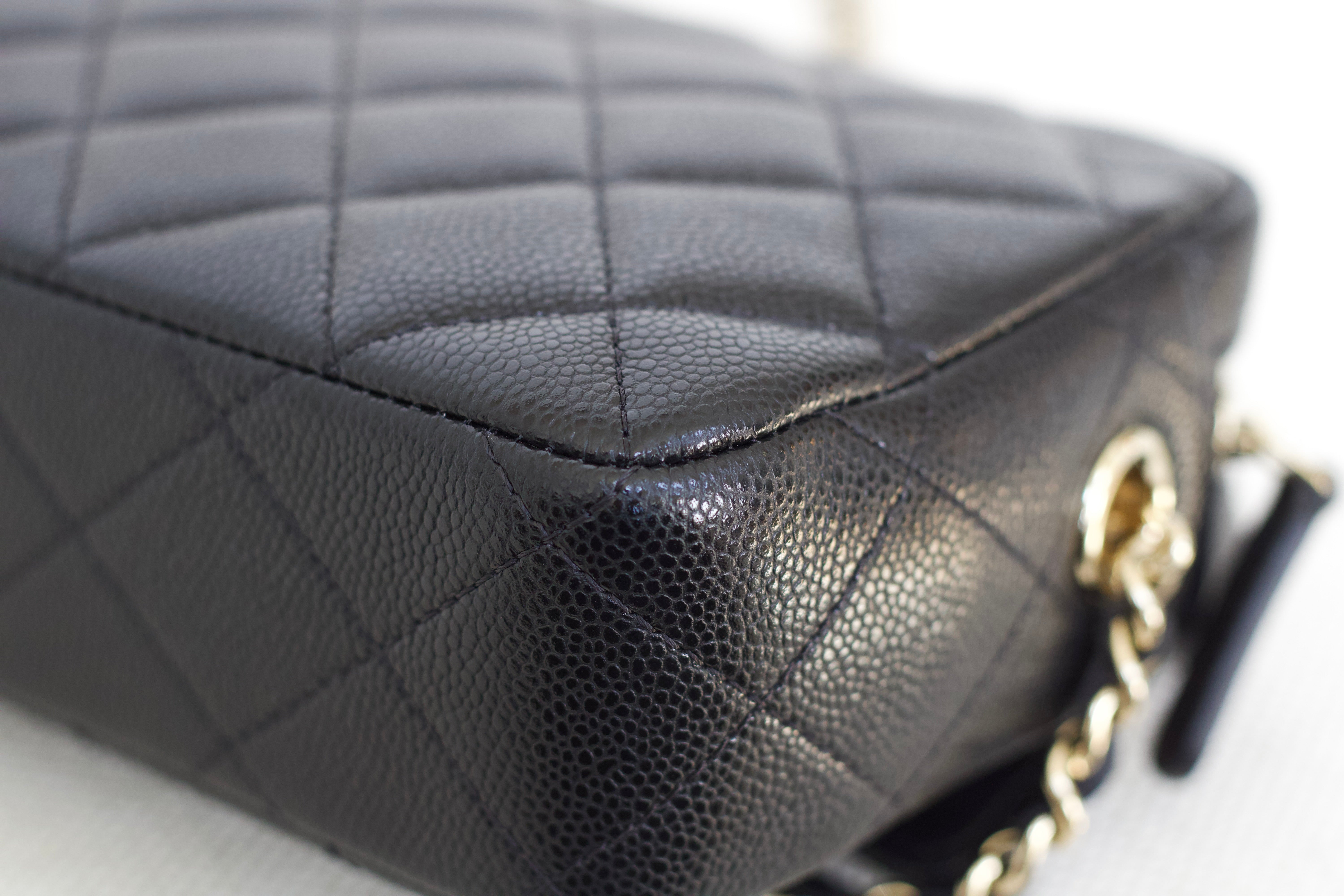 Excellent Condition. Beautifully pebbly black caviar leather complimented by a stunning sheen. Excellent structure and corners. Brilliant light gold hardware with some scratches.