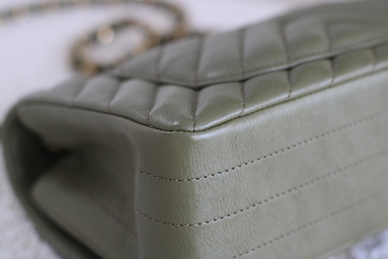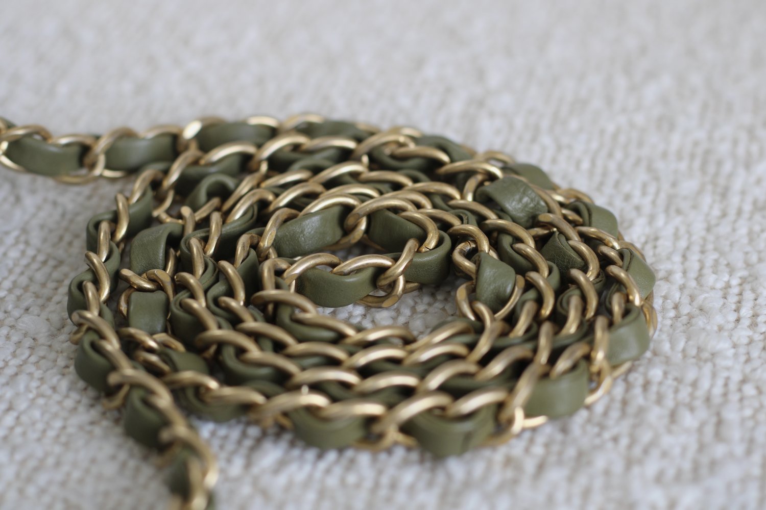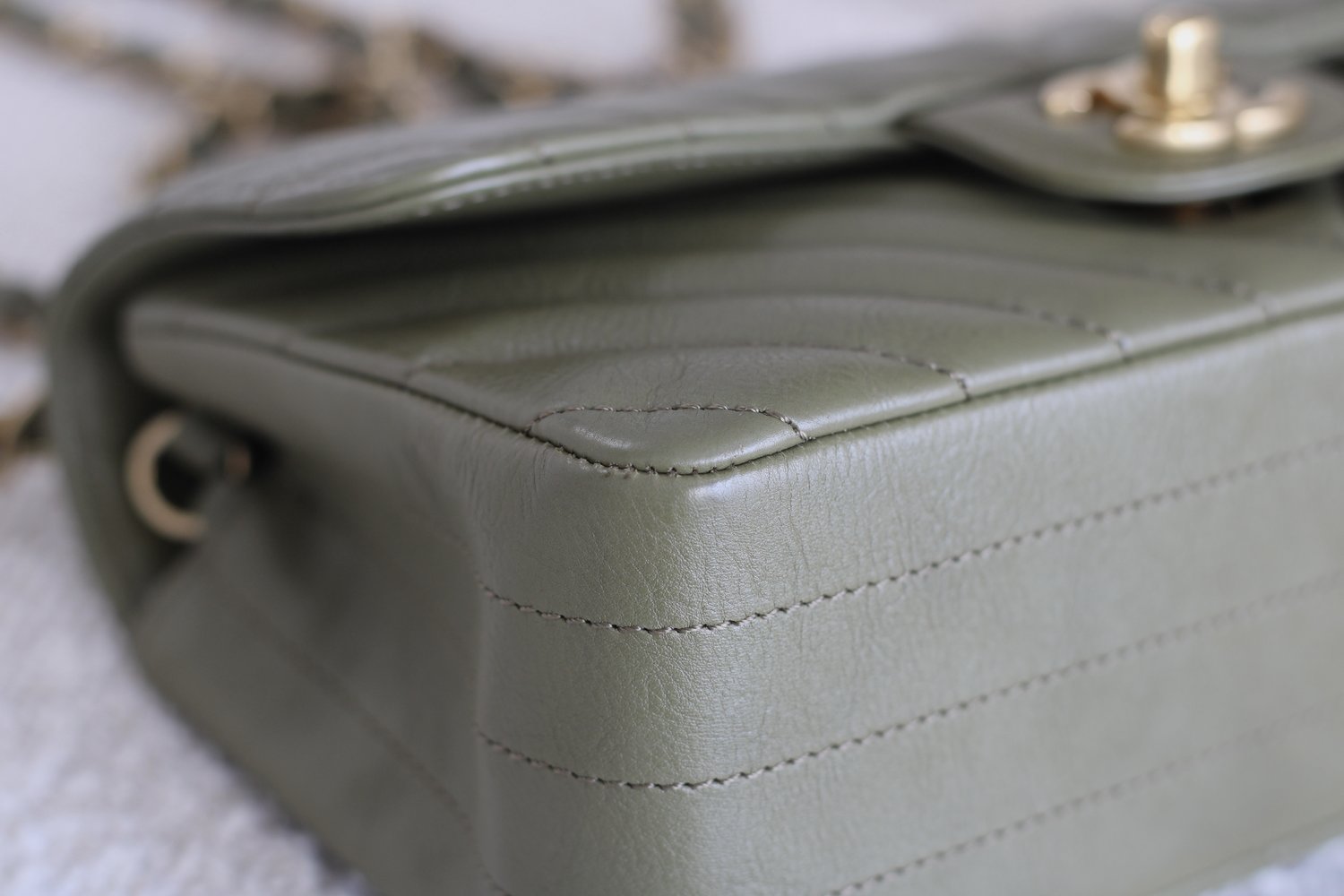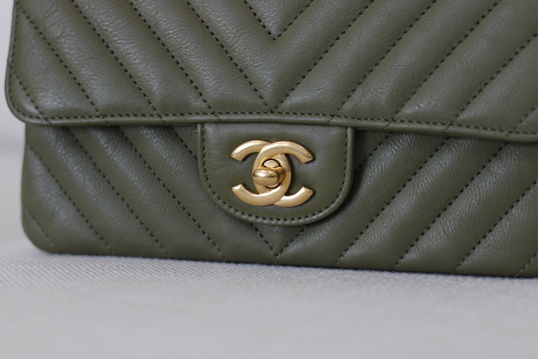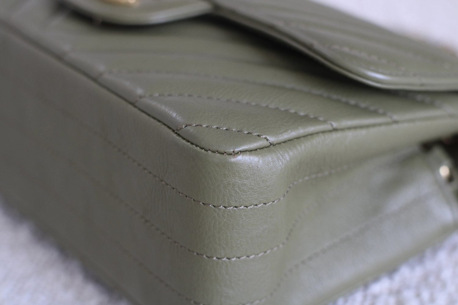 - Durable and gorgeous olive green calfskin leather with chevron quilting