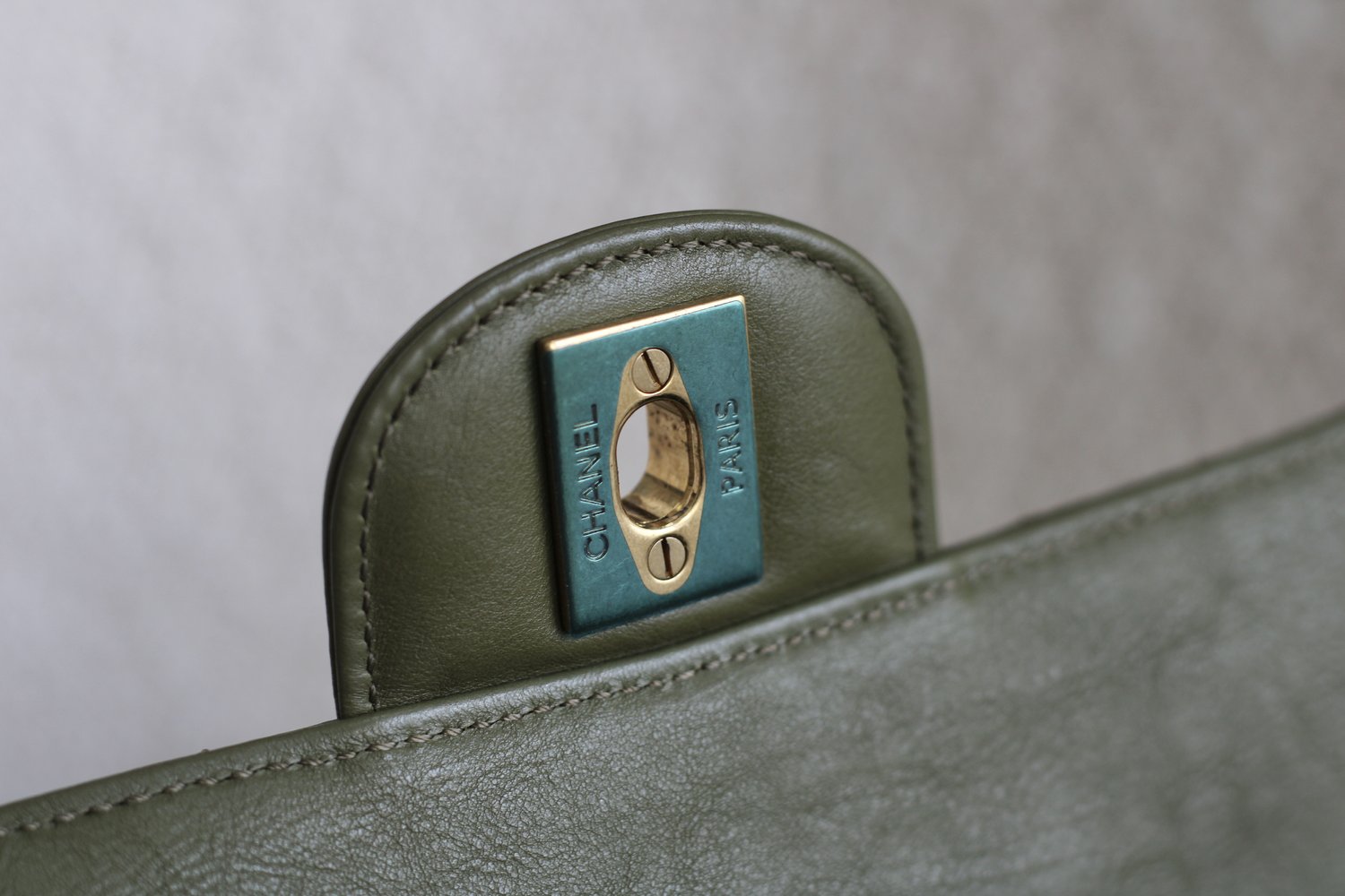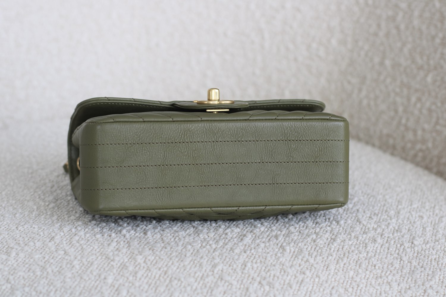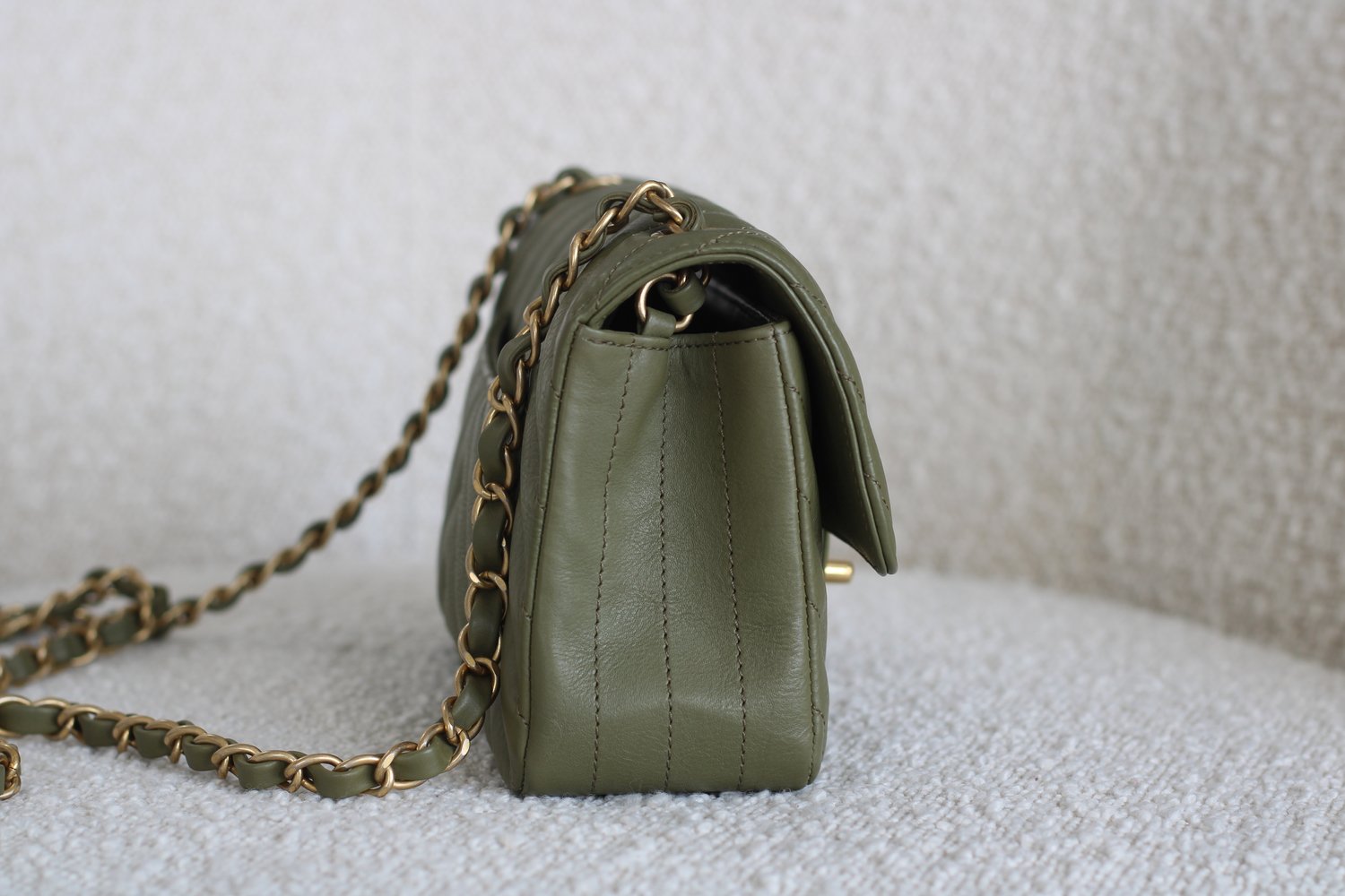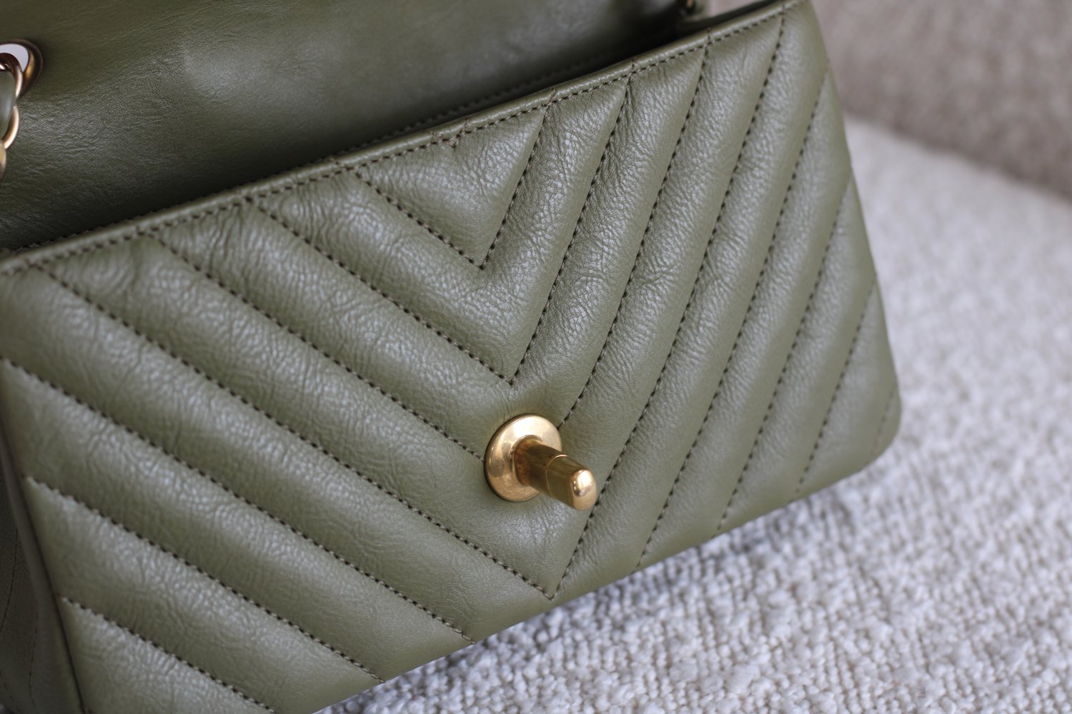 - Durable and gorgeous olive green calfskin leather with chevron quilting