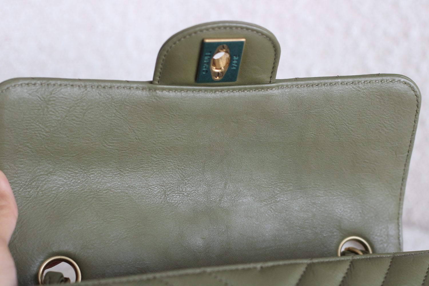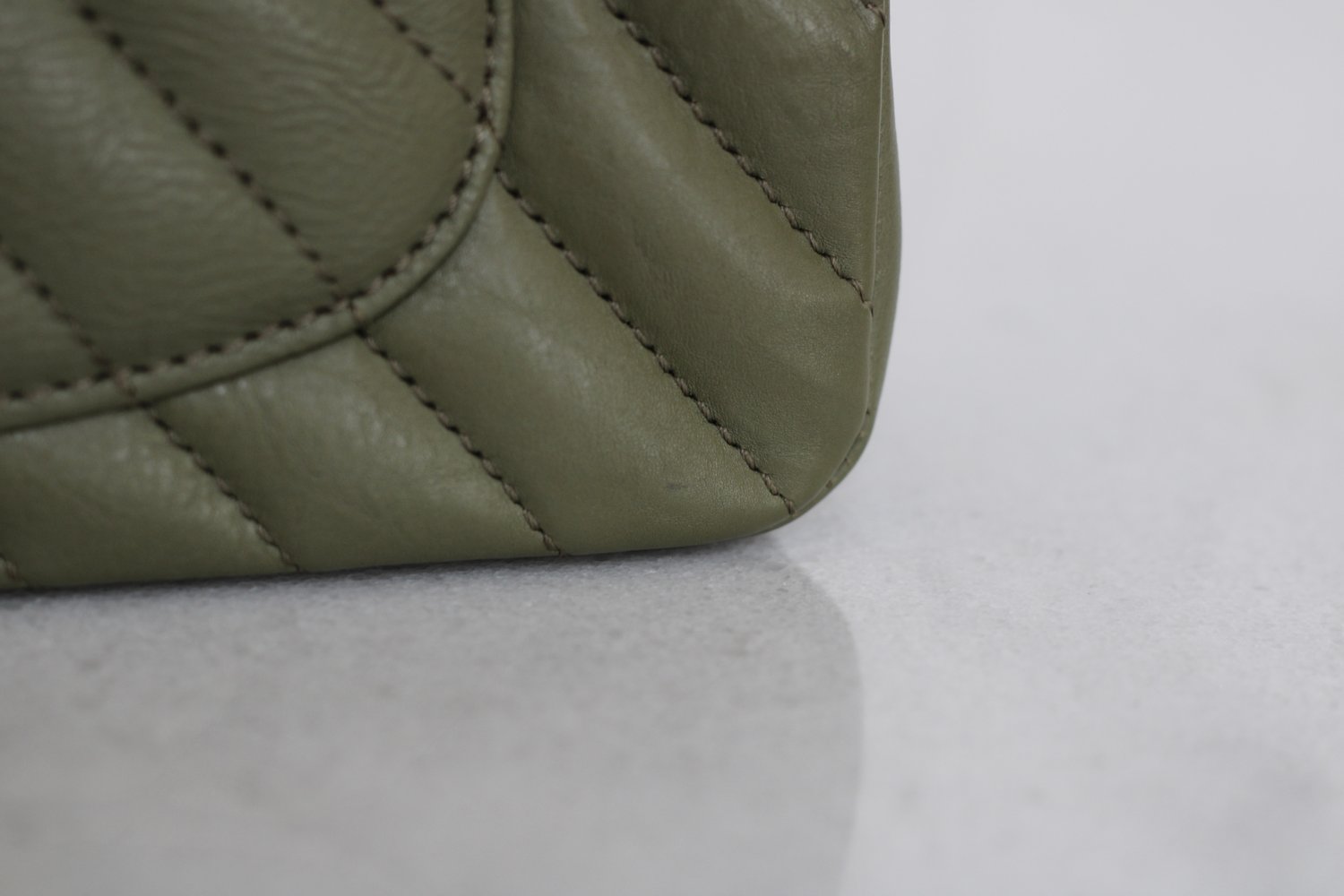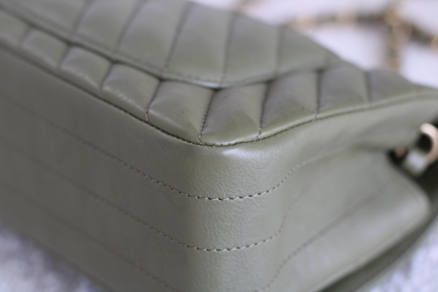Excellent Condition. Gorgeous shade of sage green and soft calfskin. Stunning aged gold hardware with light hairline scratches and beautifully even chevron quilts. Excellent structure and minimal corner wear. Some light marks on edge of back pocket.