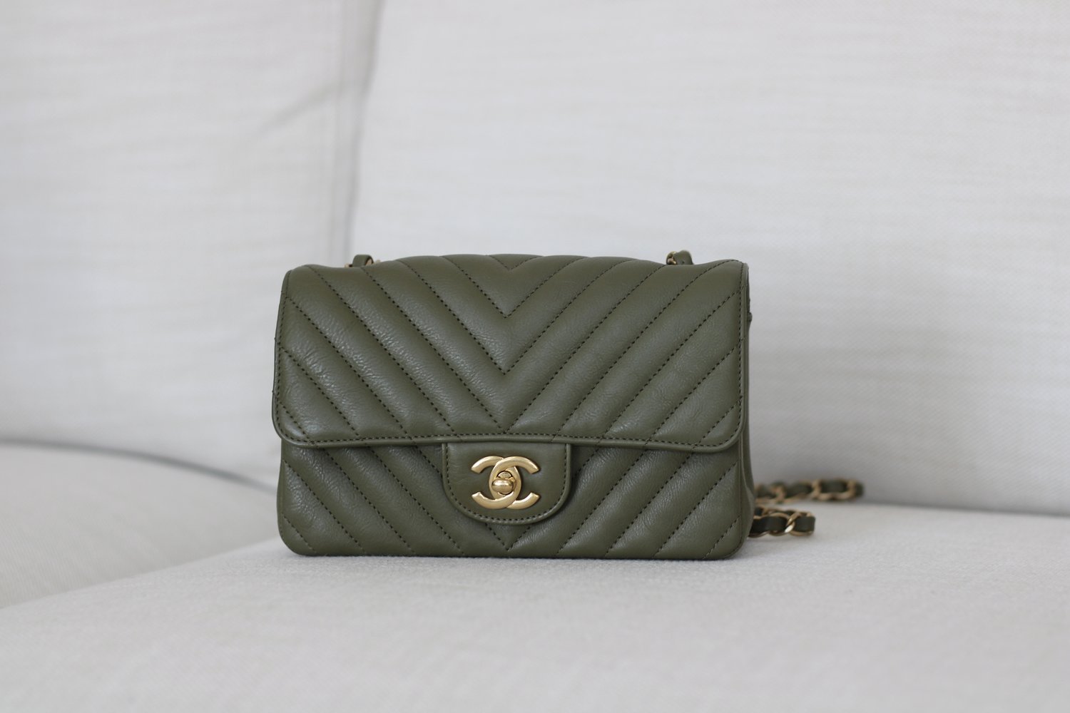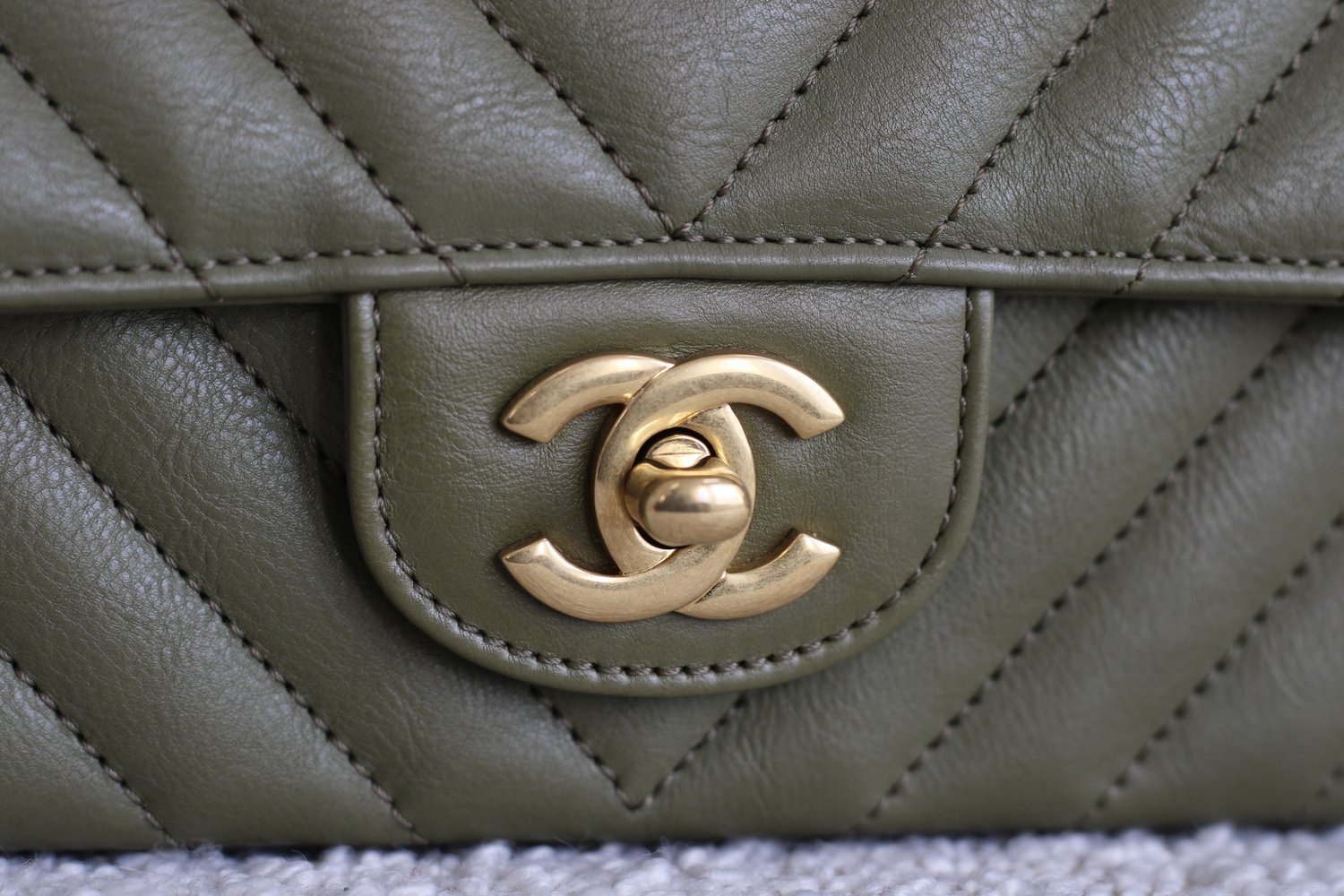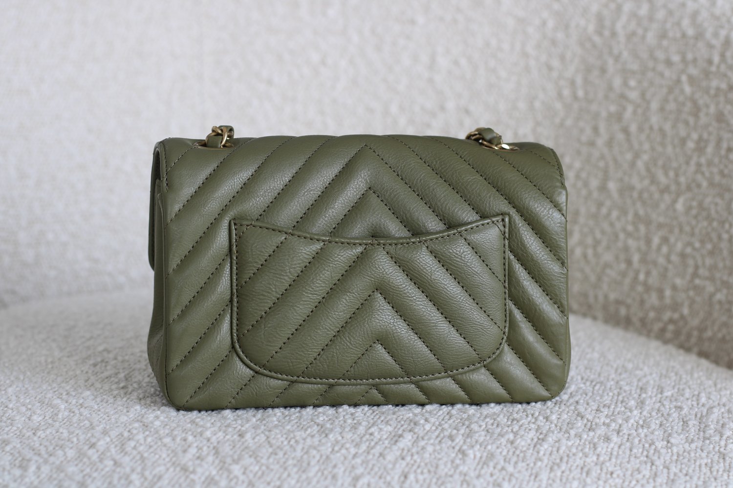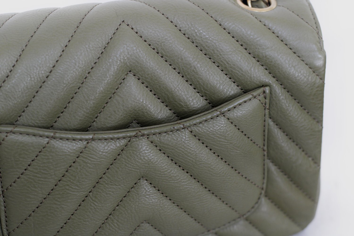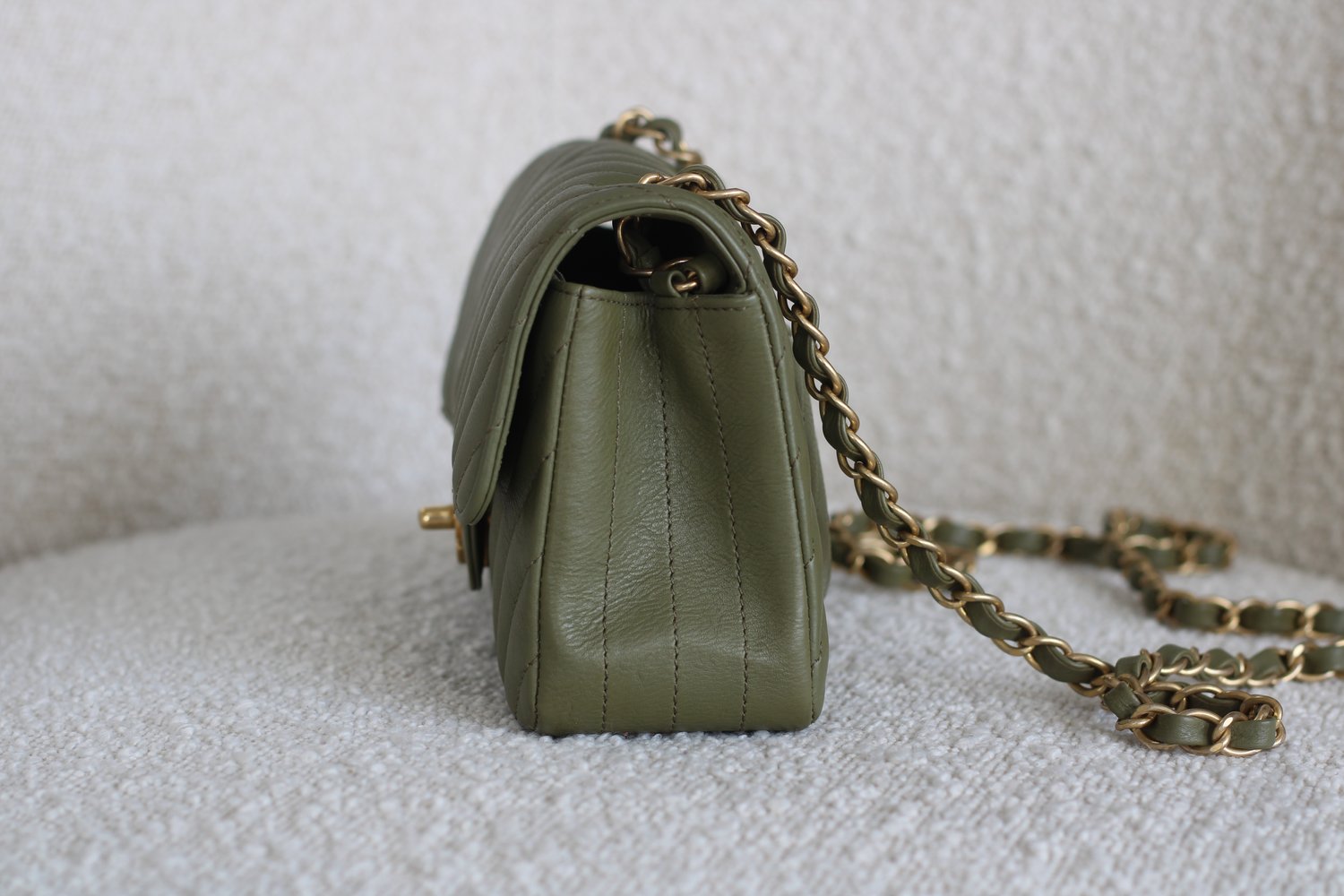 Chanel Olive Green Calfskin Chevron Mini Rectangle with Aged Gold Hardware