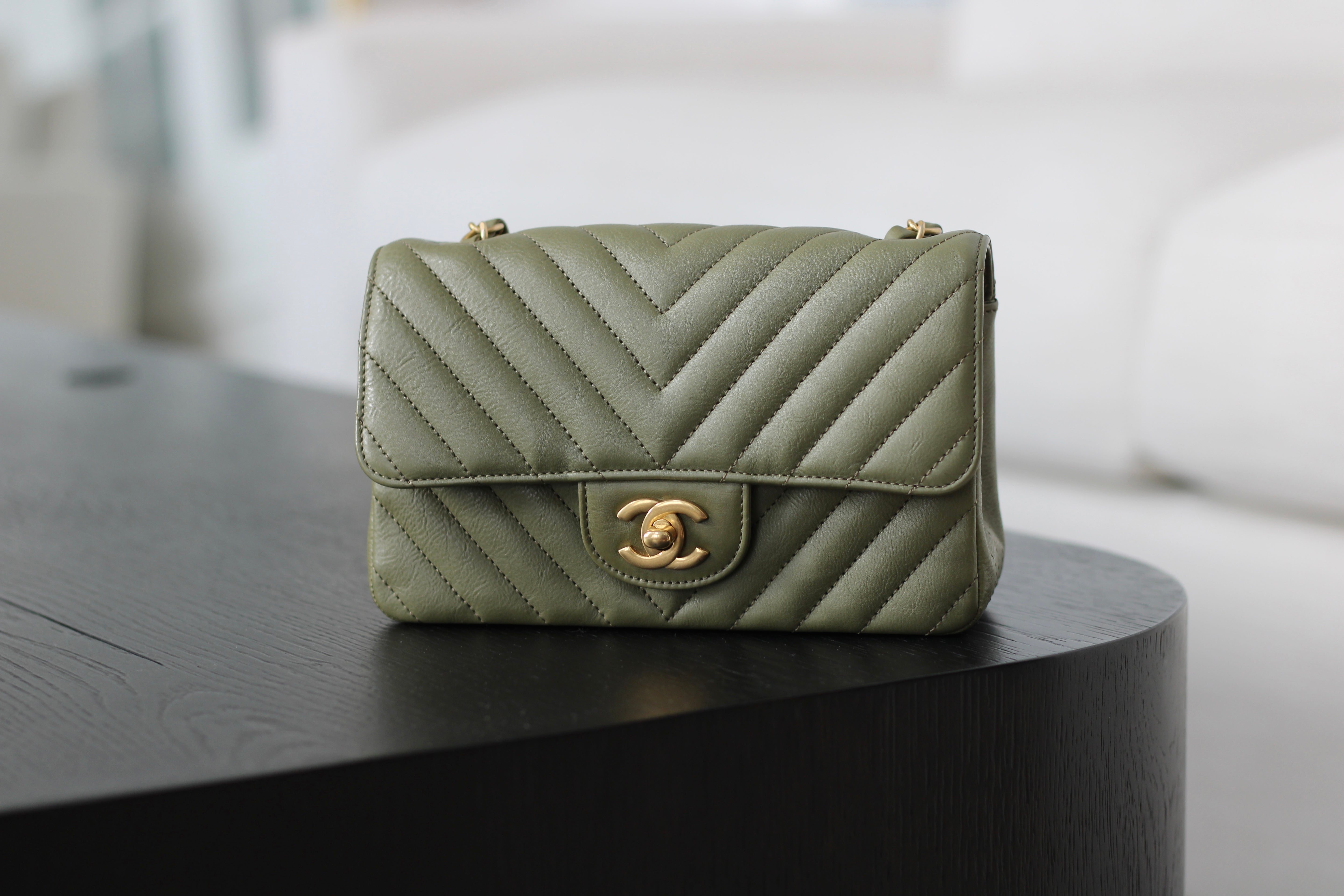 Chanel Olive Green Calfskin Chevron Mini Rectangle with Aged Gold Hardware