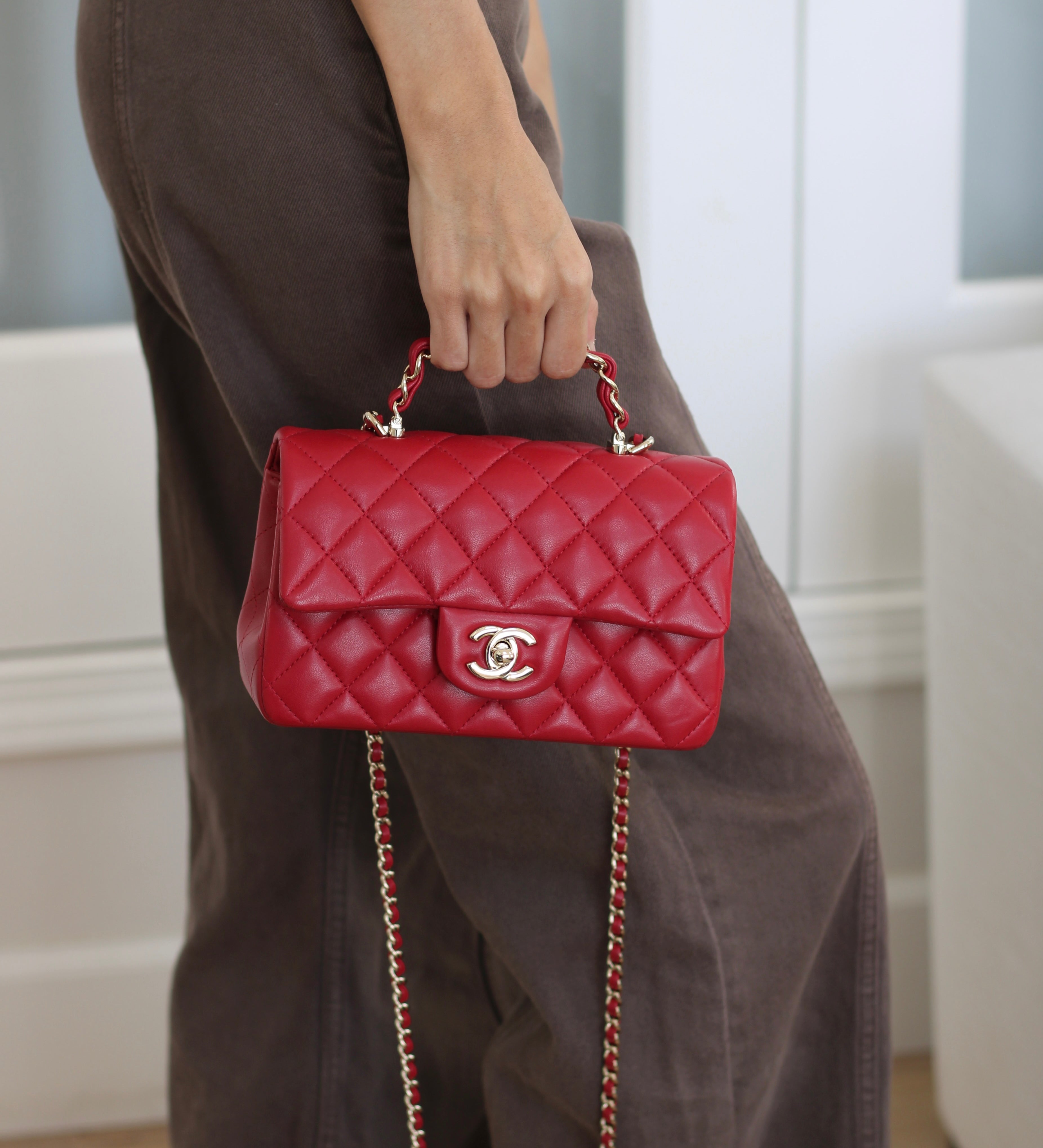 Chanel Red Lambskin Mini Top Handle with Light Gold Hardware