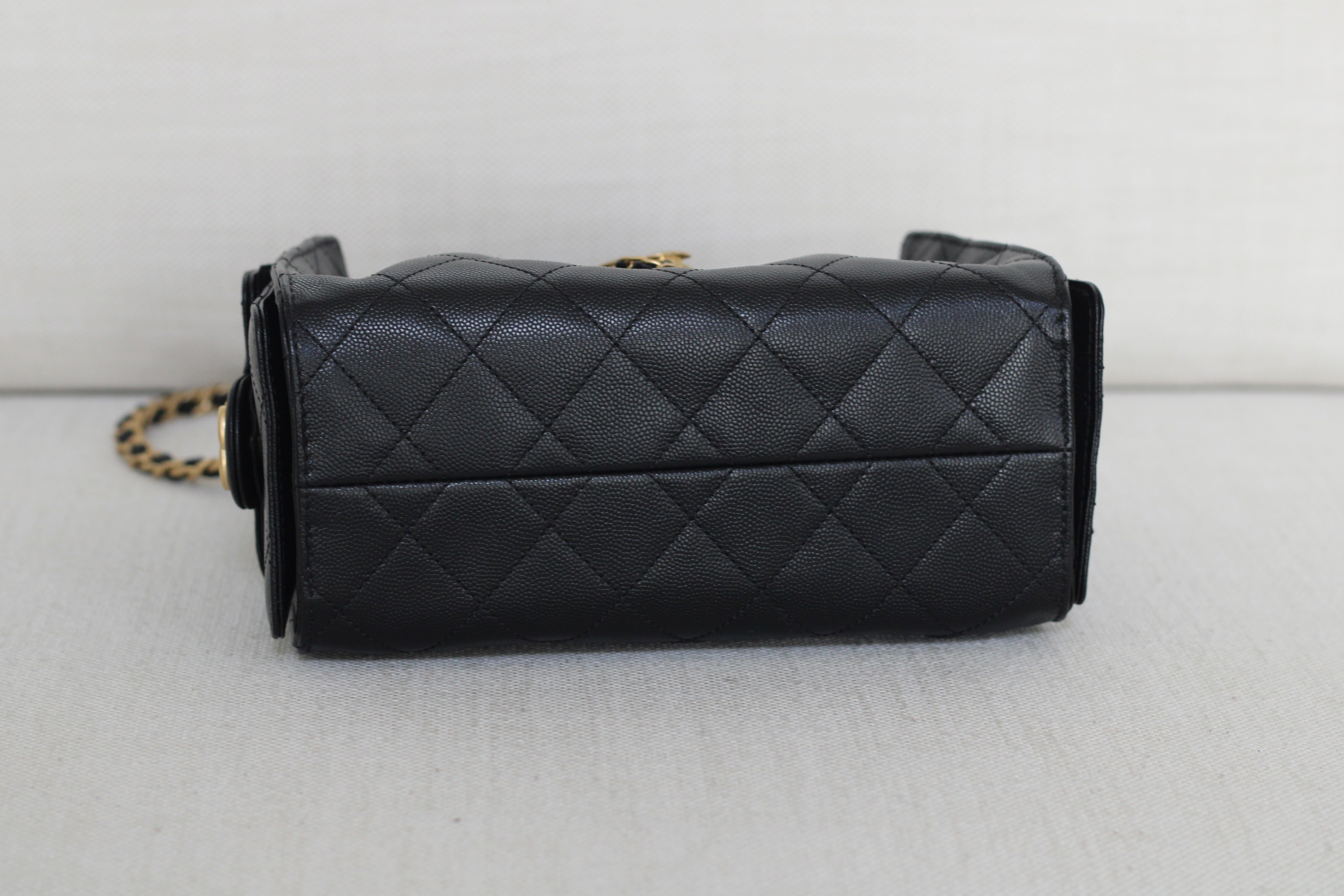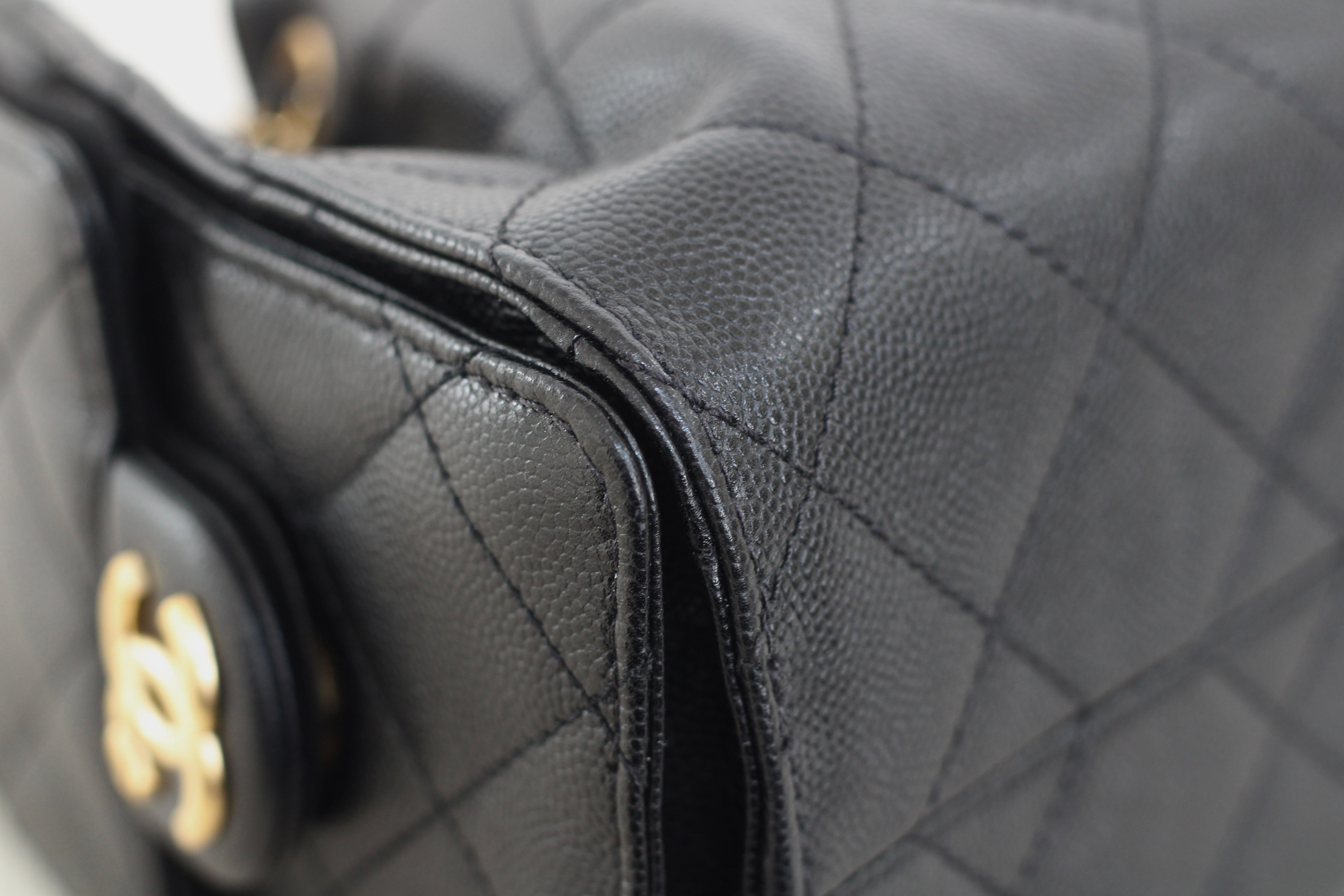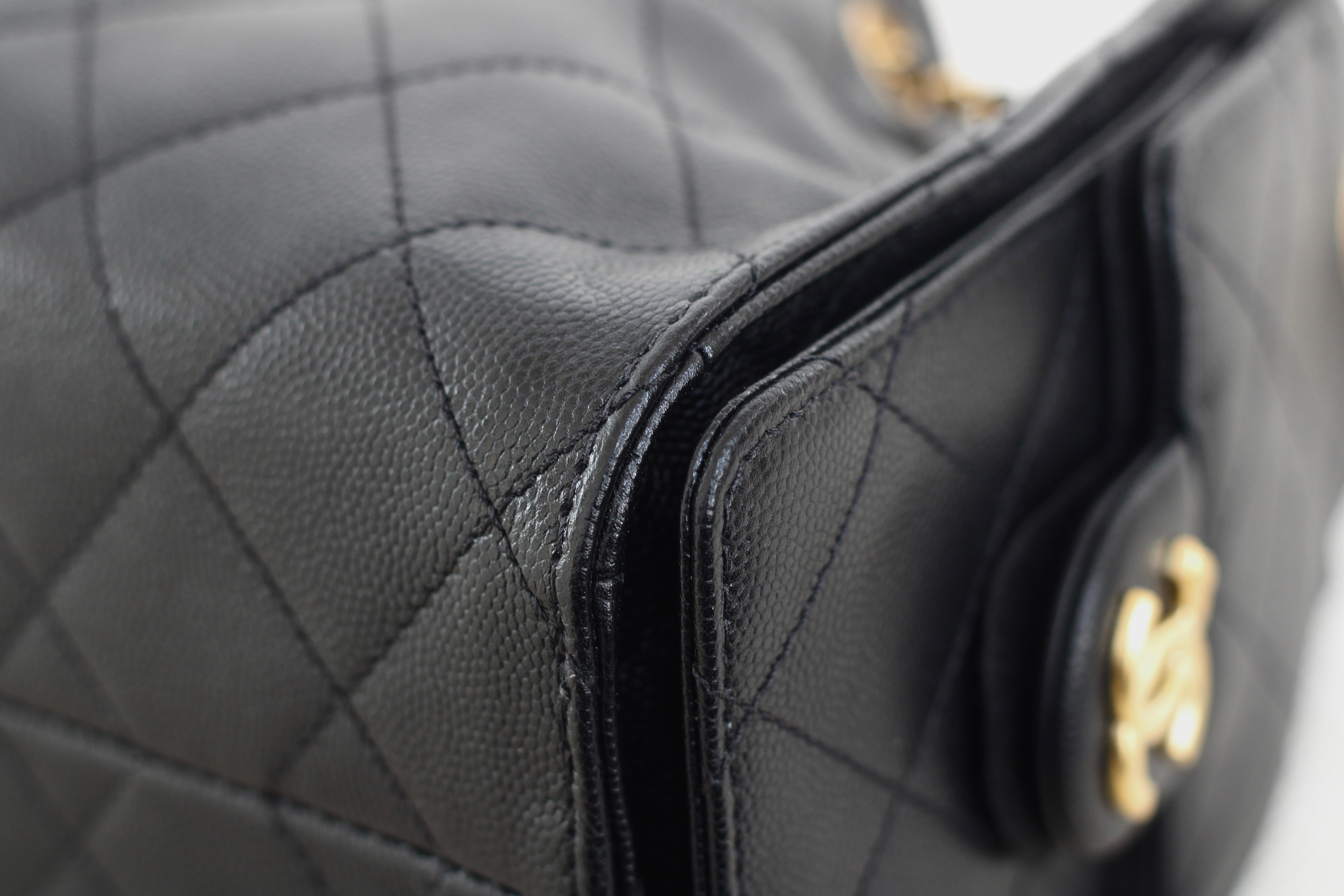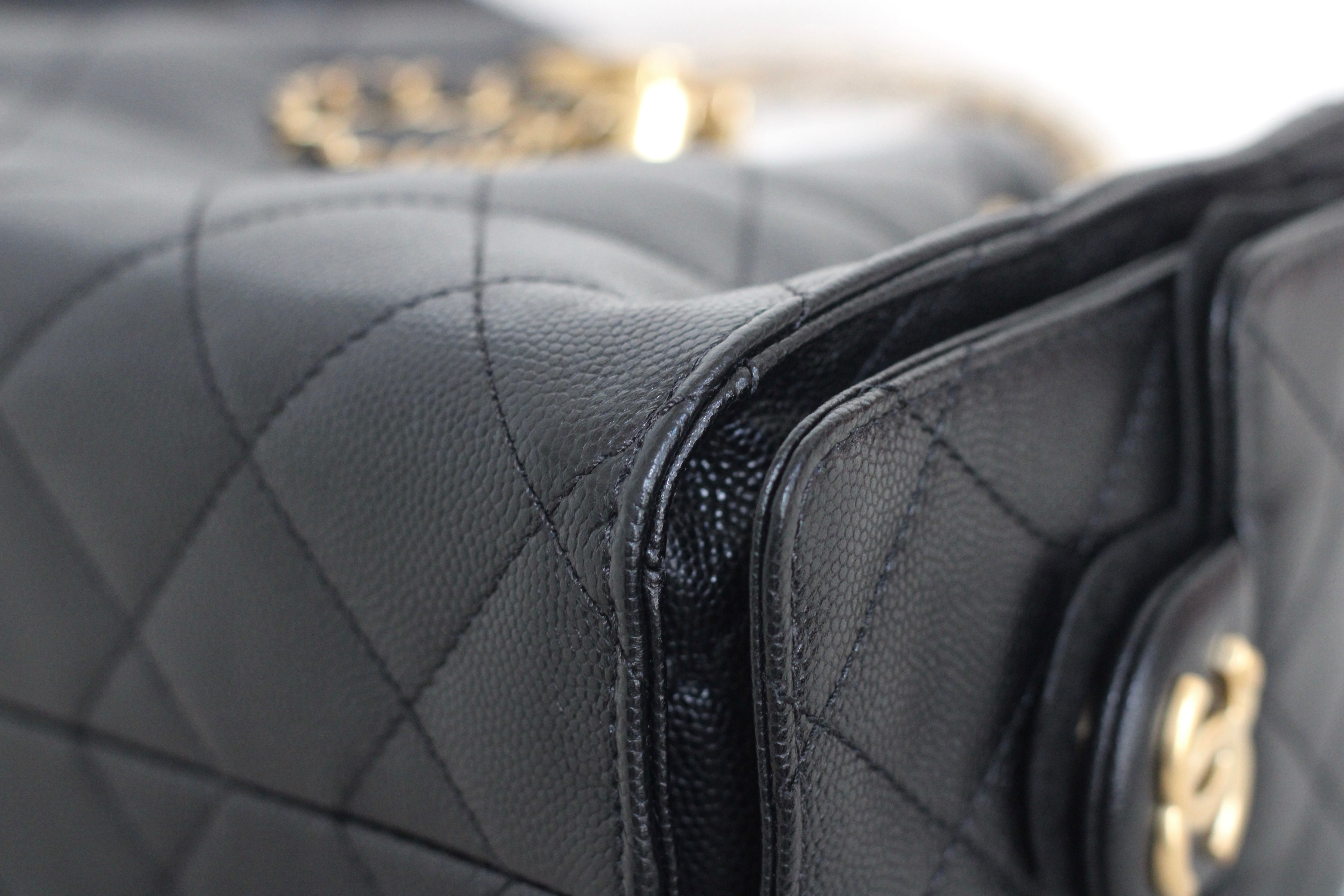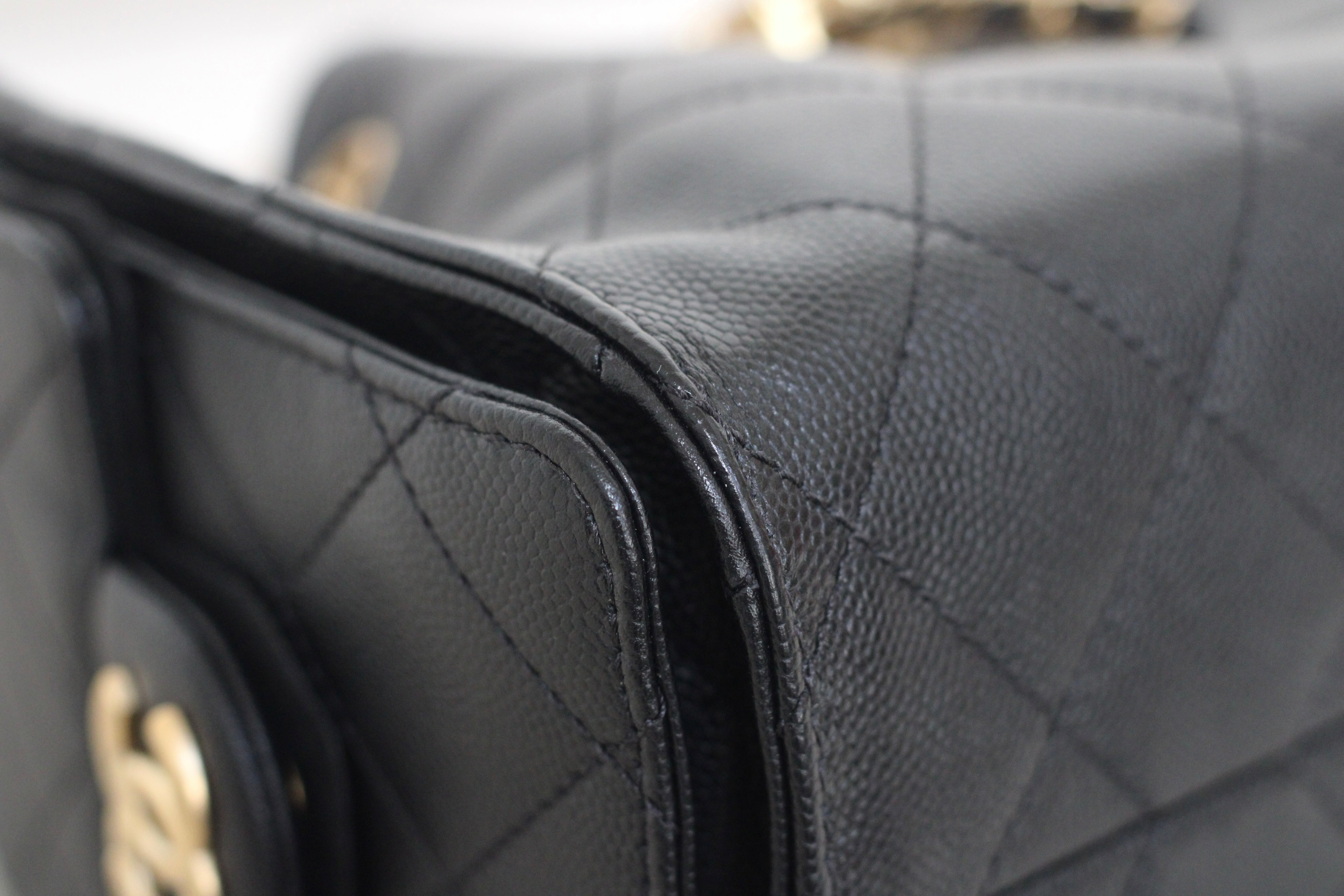 Pristine Condition. Beautifully pebbly black caviar leather with a gorgeous sheen. Stunning aged gold hardware with fine hairline scratches.