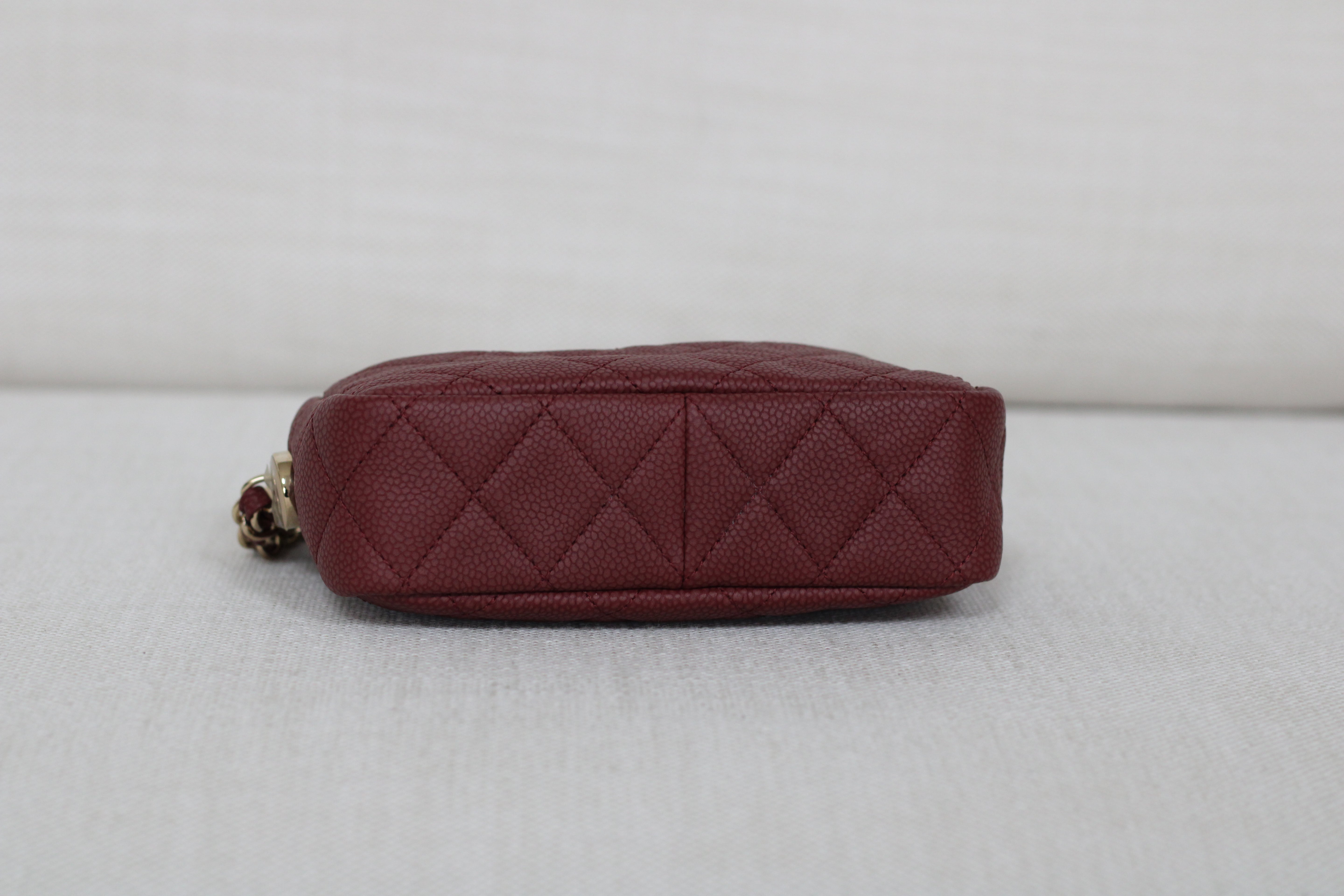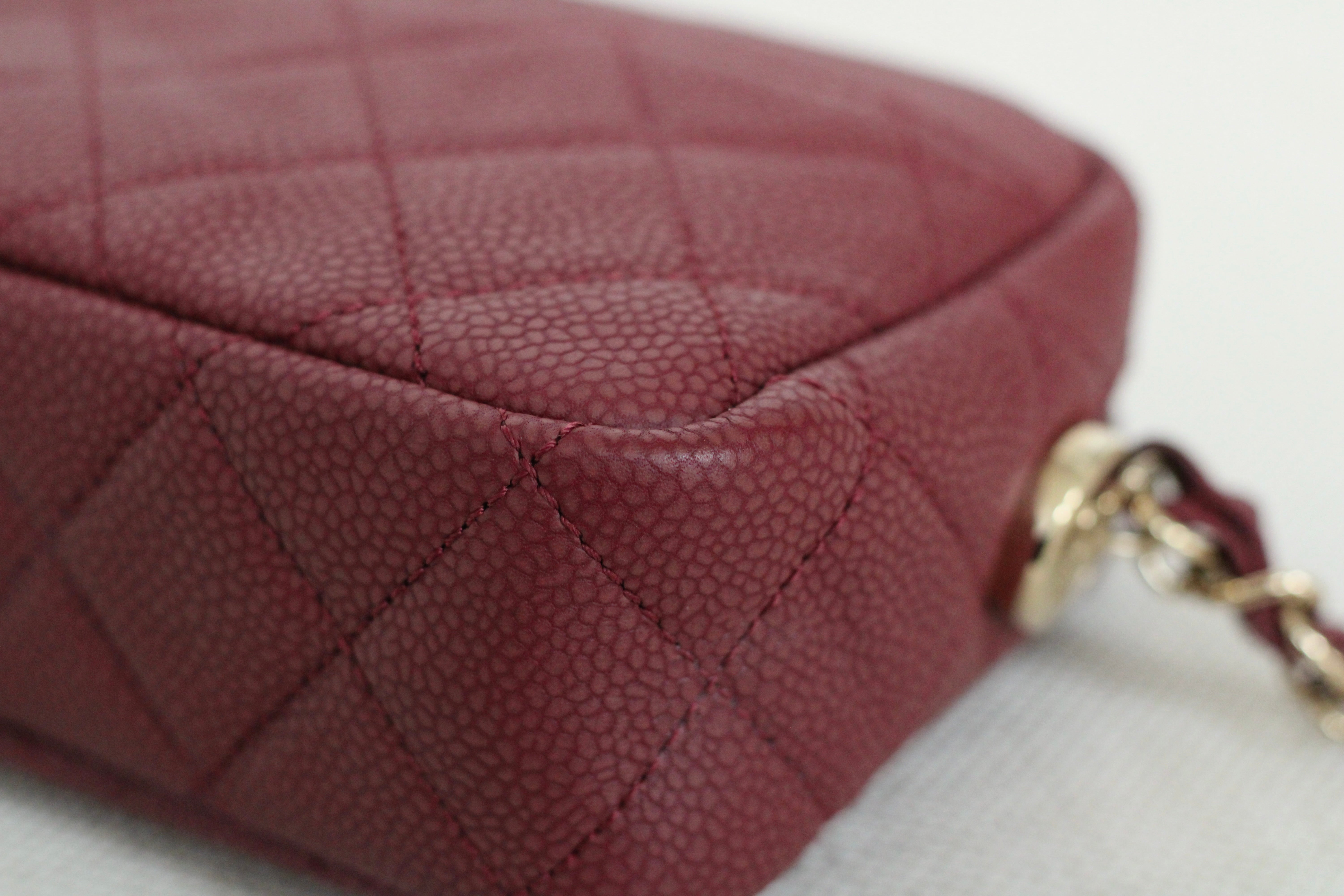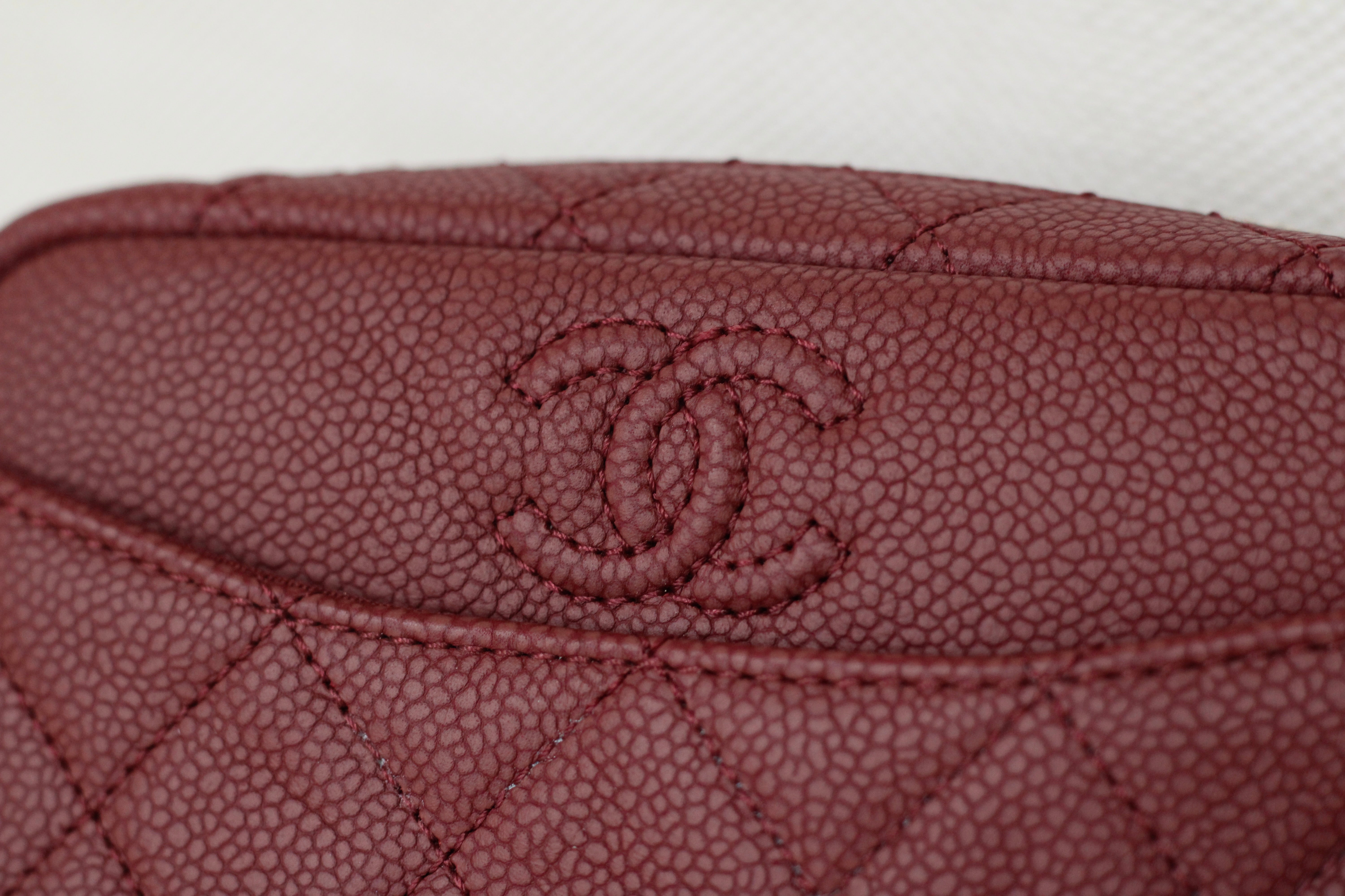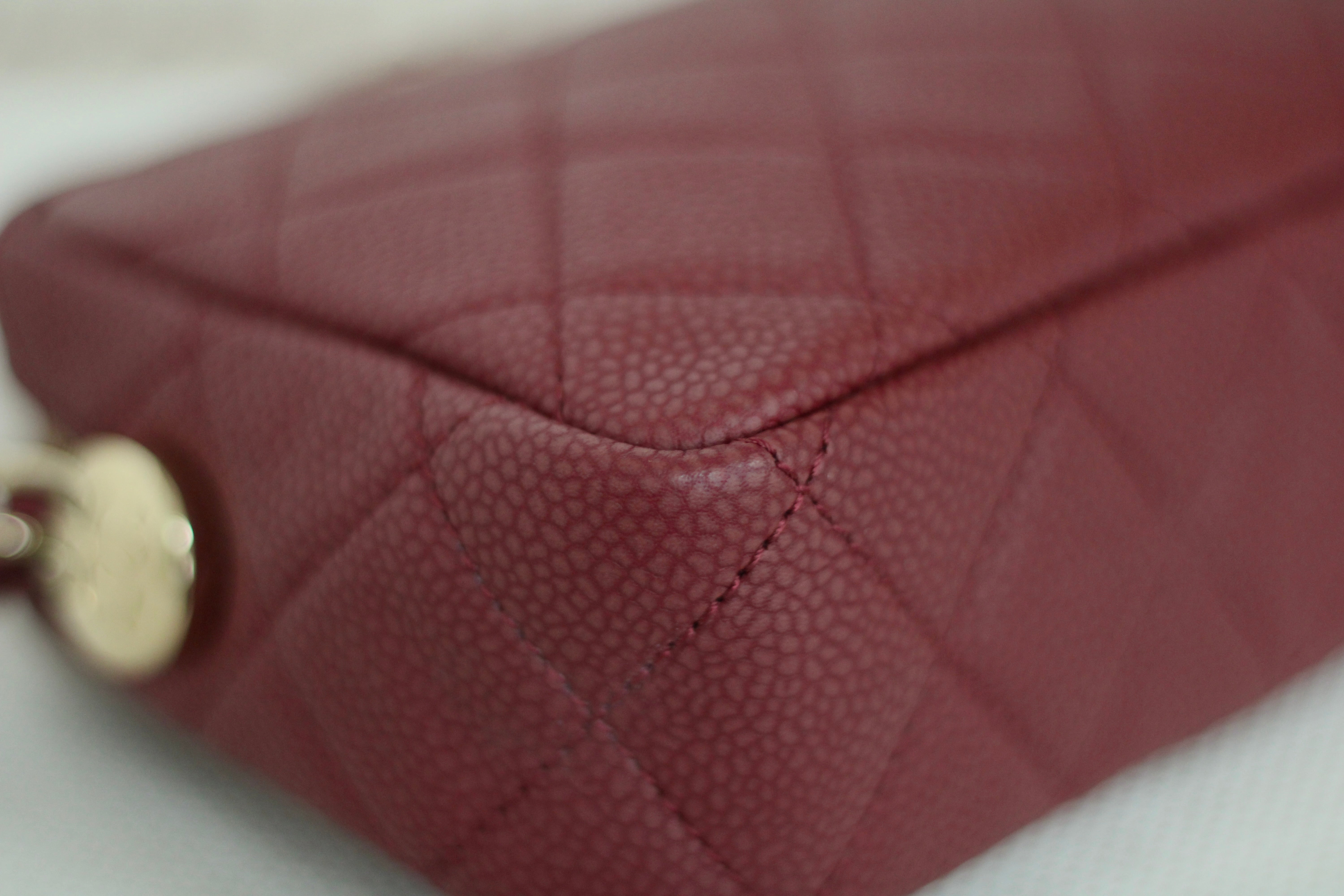 Excellent Condition. Stunning shade of burgundy in beautifully pebbly caviar leather. Excellent structure and corners. Brilliant light gold hardware with minimal hairline scratches.