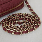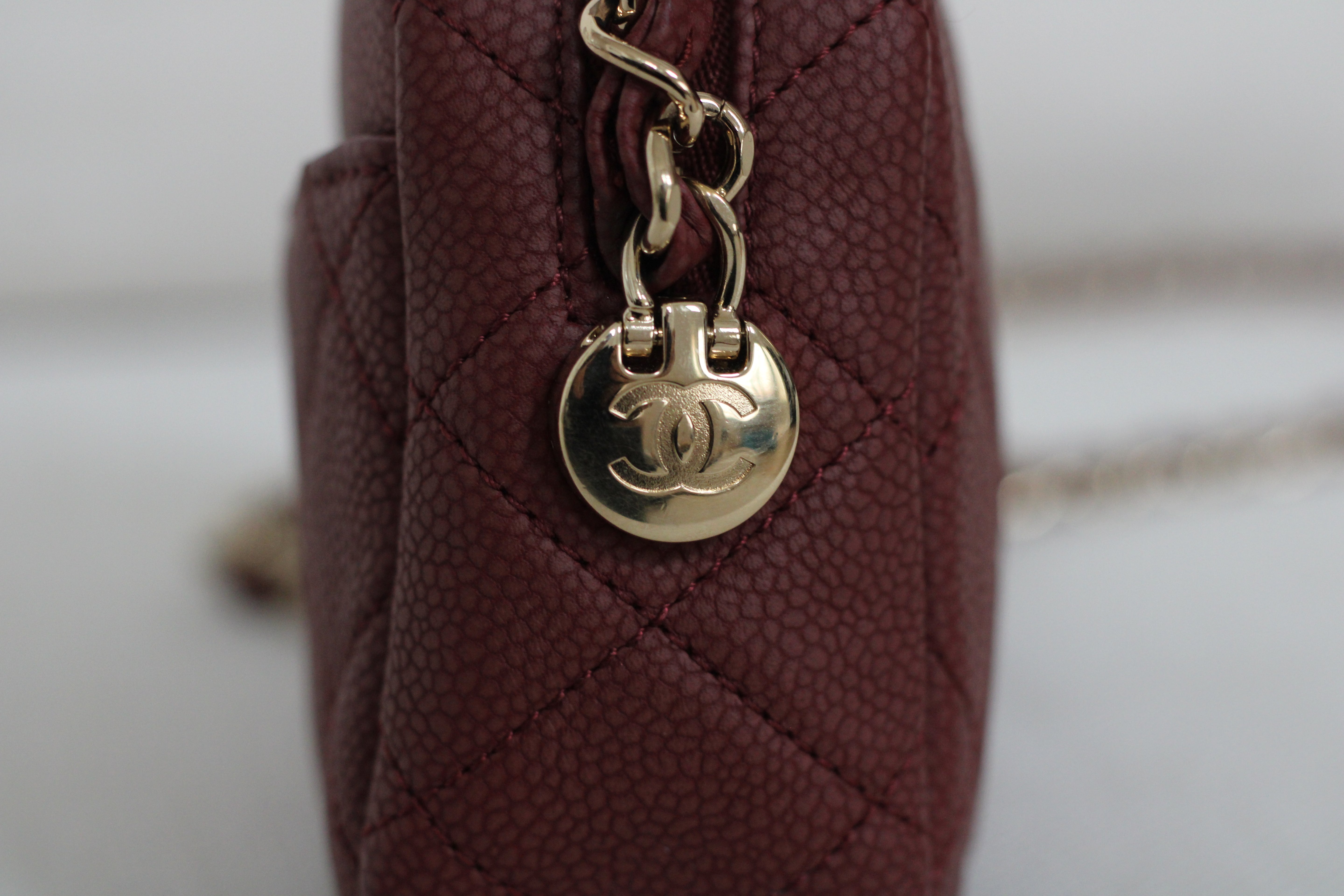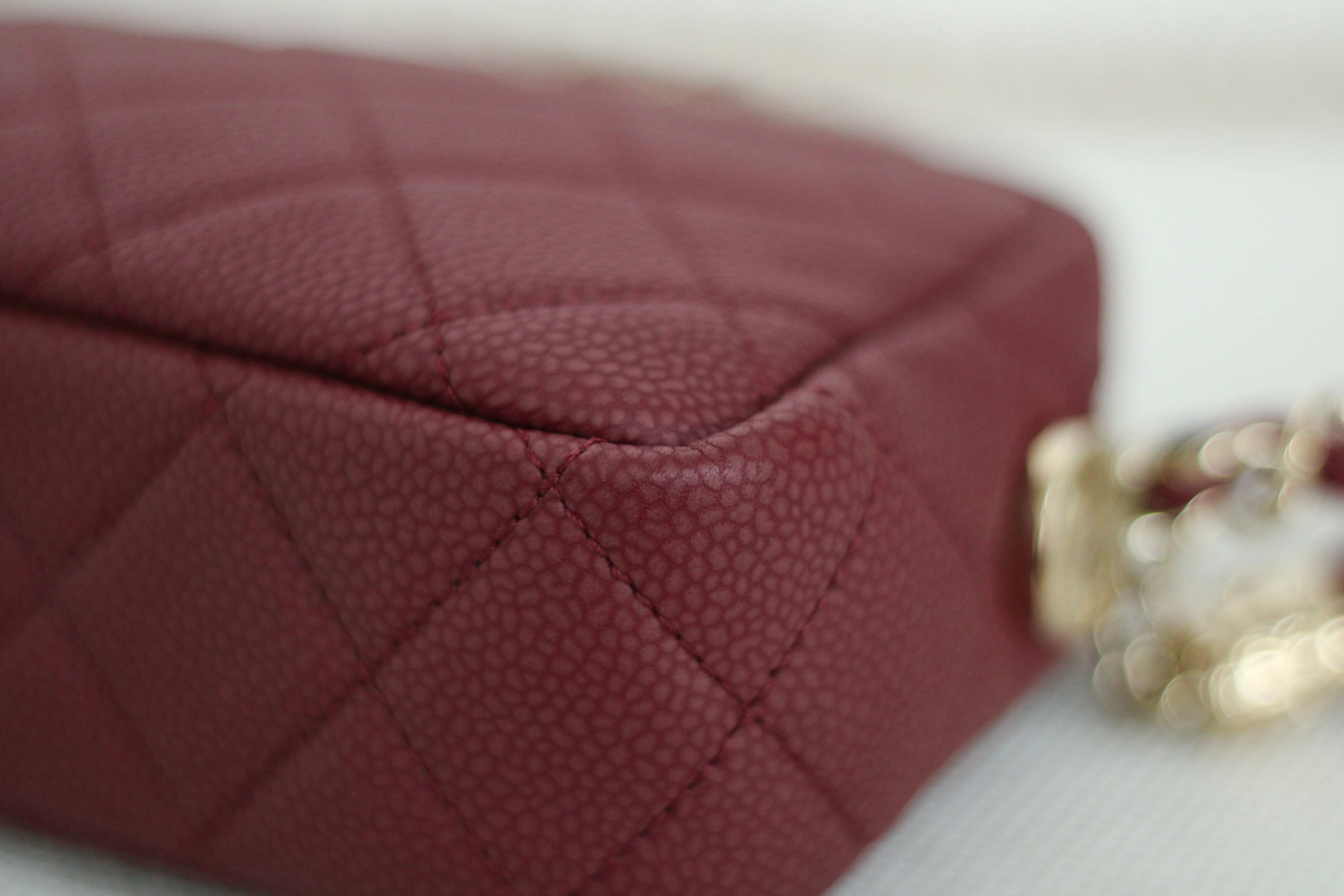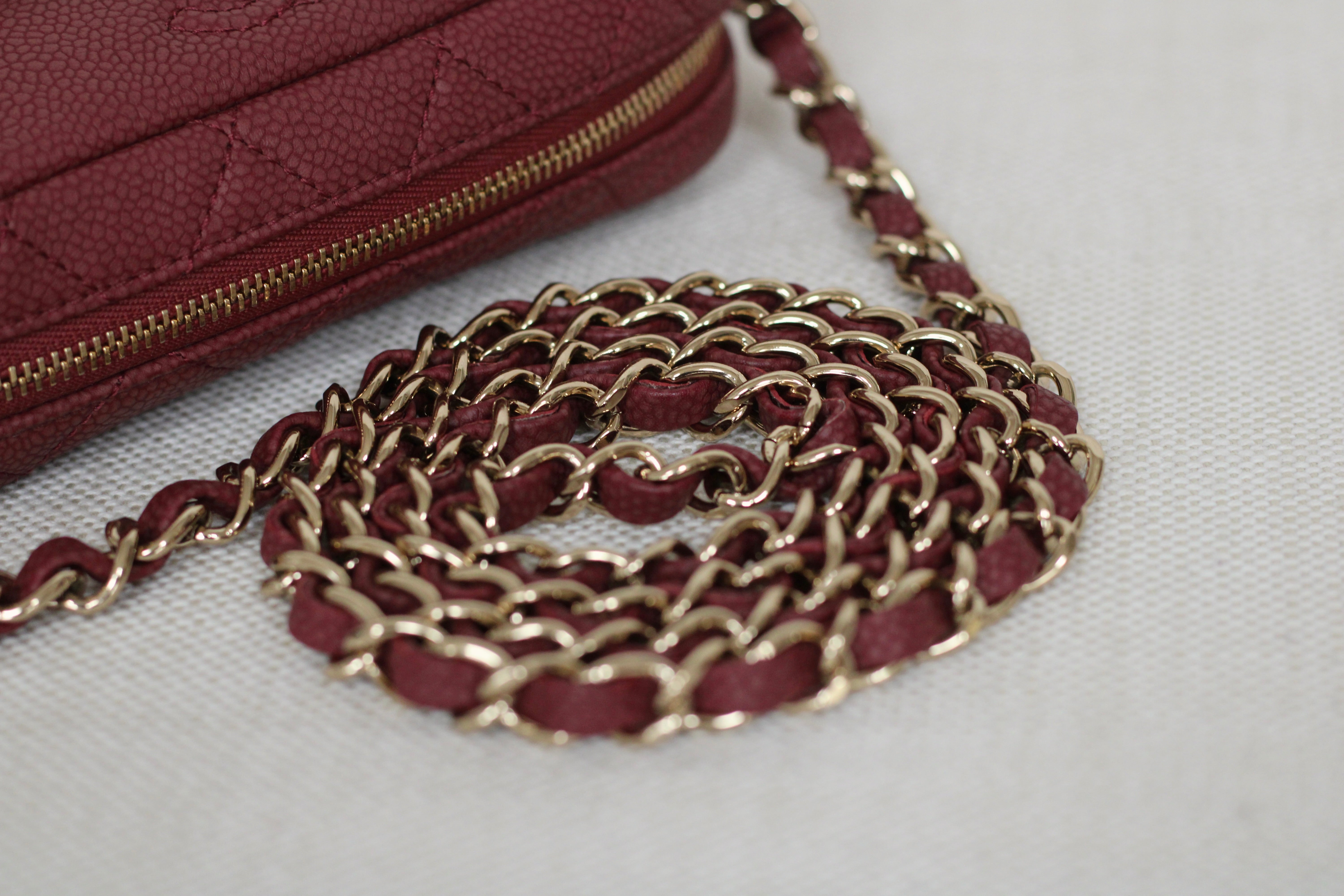 Excellent Condition. Stunning shade of burgundy in beautifully pebbly caviar leather. Excellent structure and corners. Brilliant light gold hardware with minimal hairline scratches.