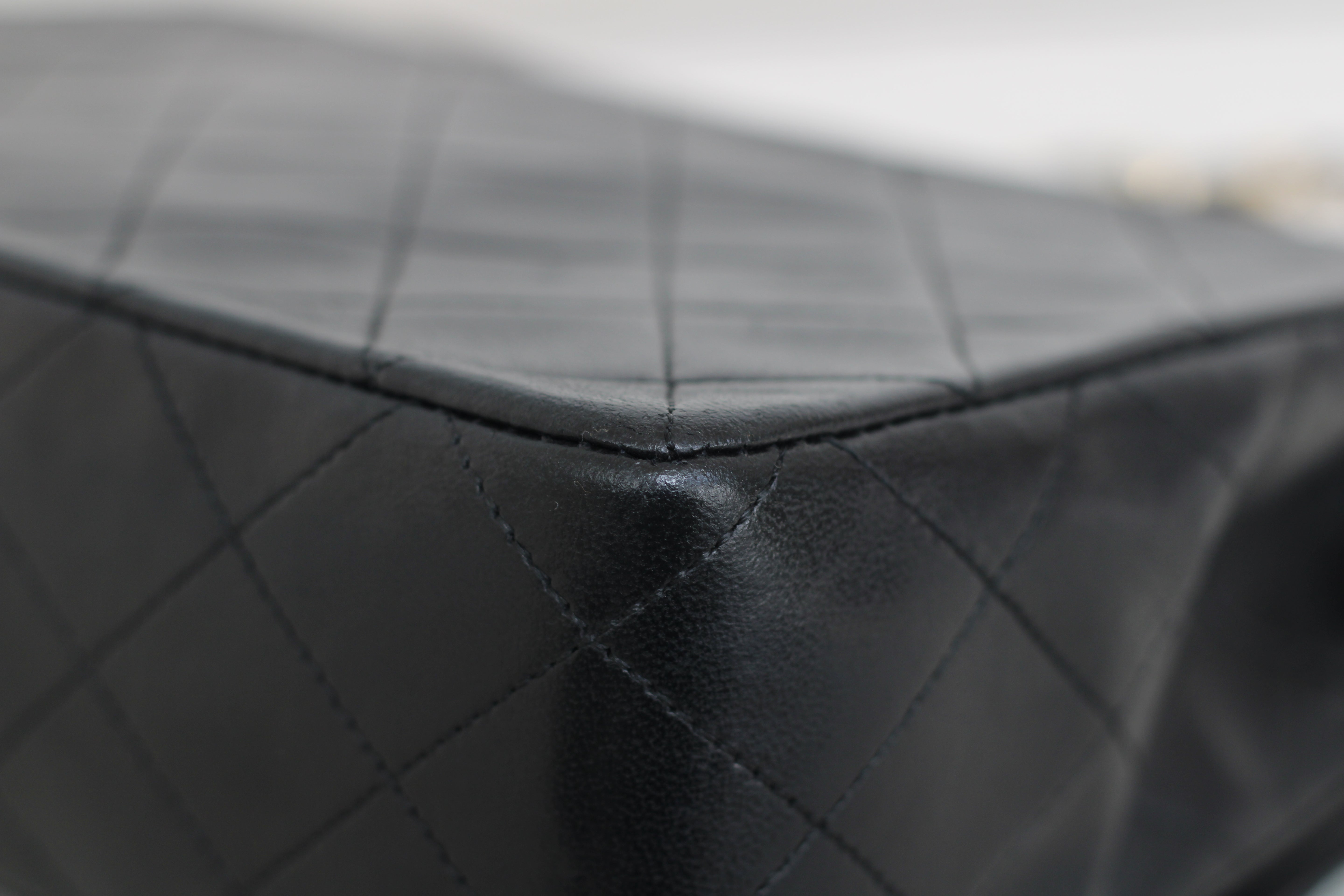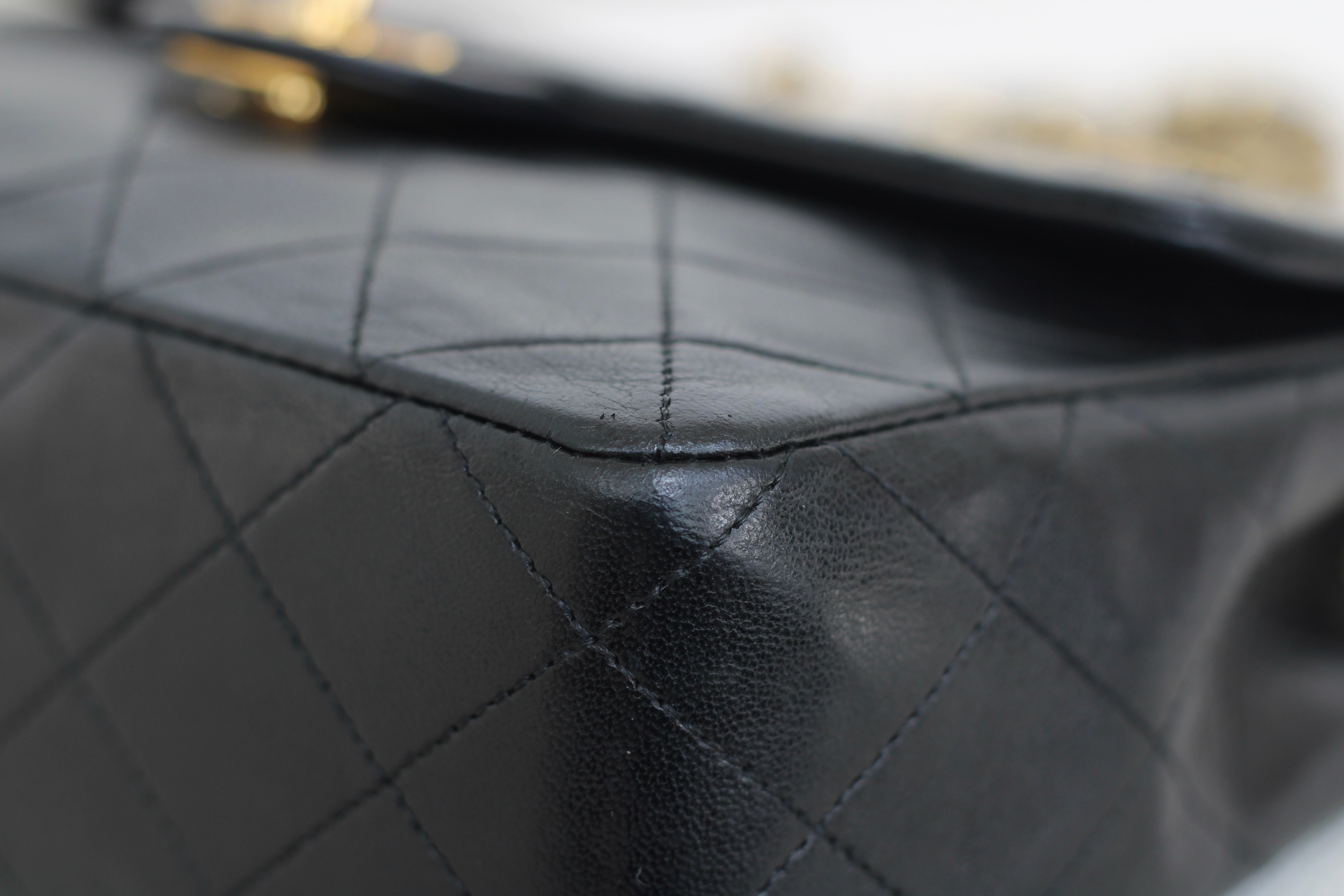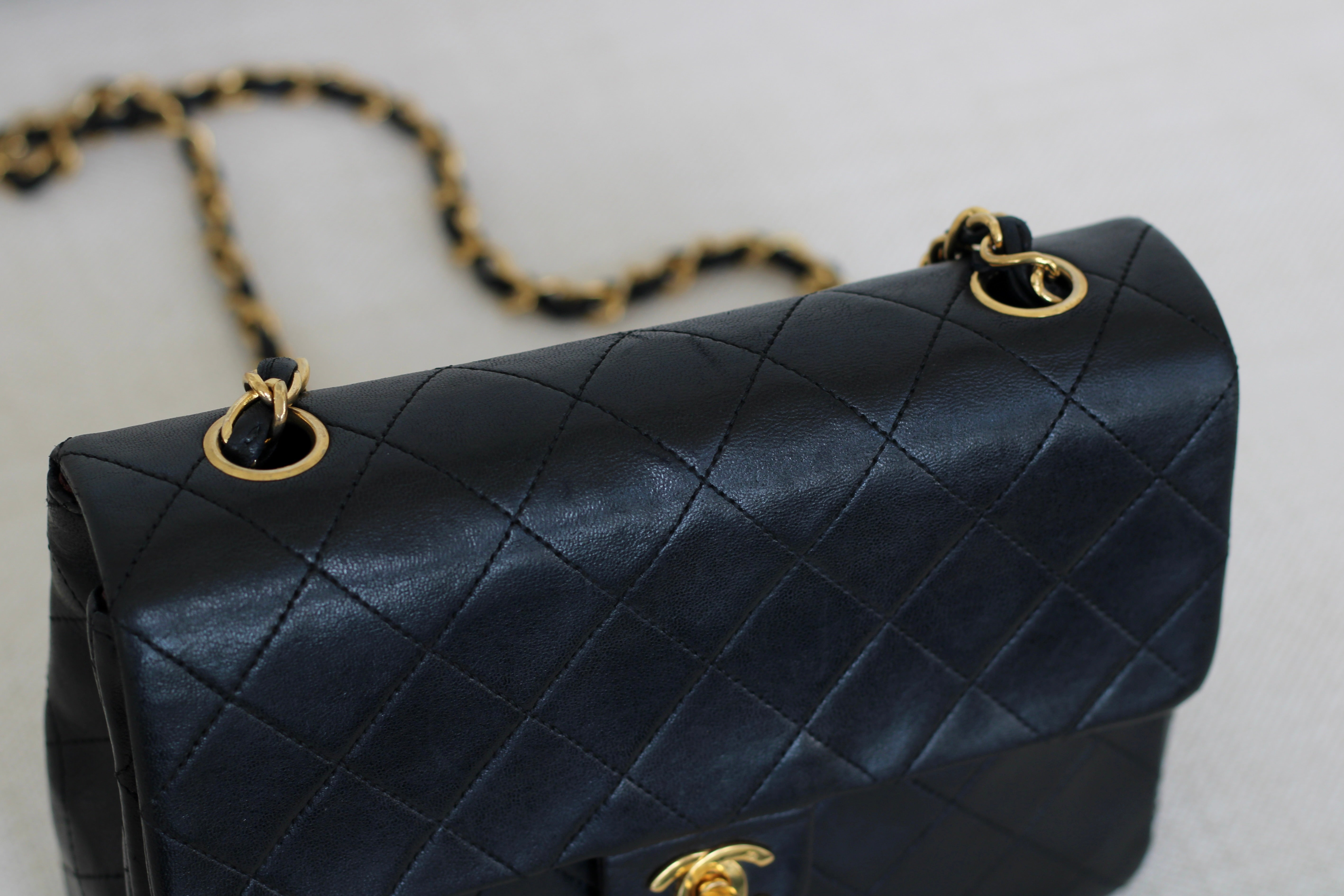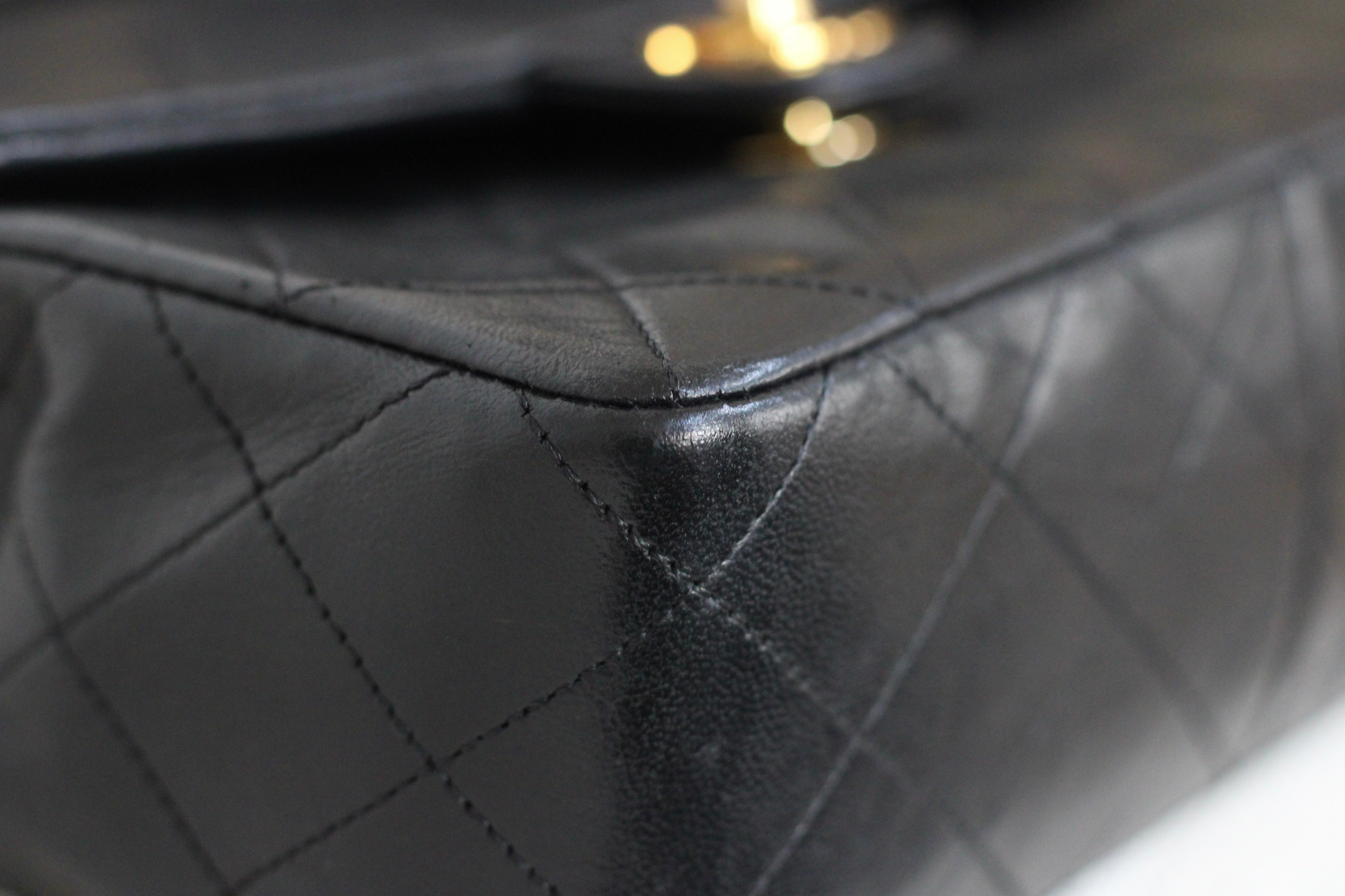Great/Excellent Vintage Condition. Buttery lambskin leather complimented by a stunning sheen. Some light wear on corners. Some lightening on chains. Gorgeous 24k gold plated hardware with light hairline scratches.