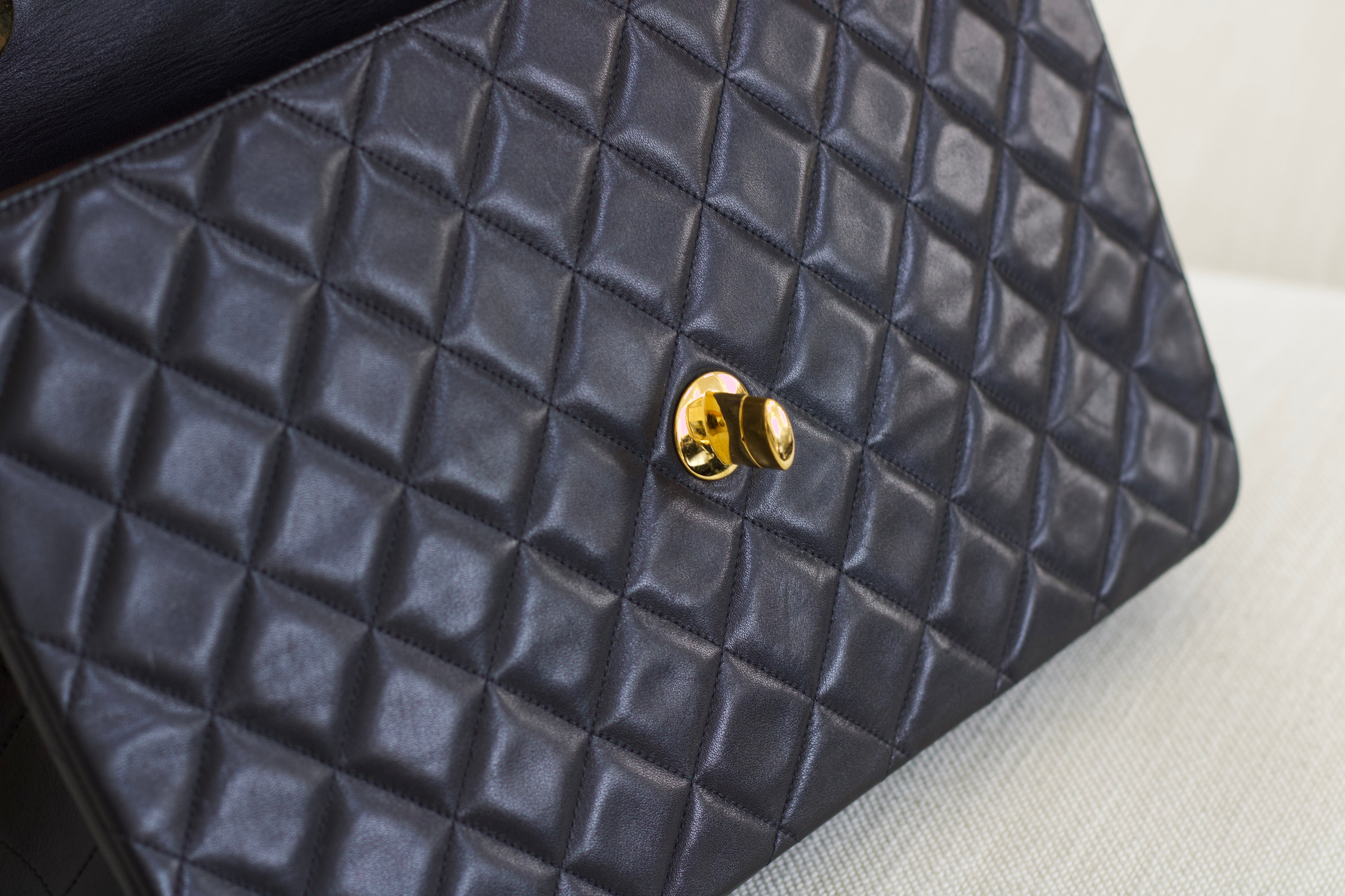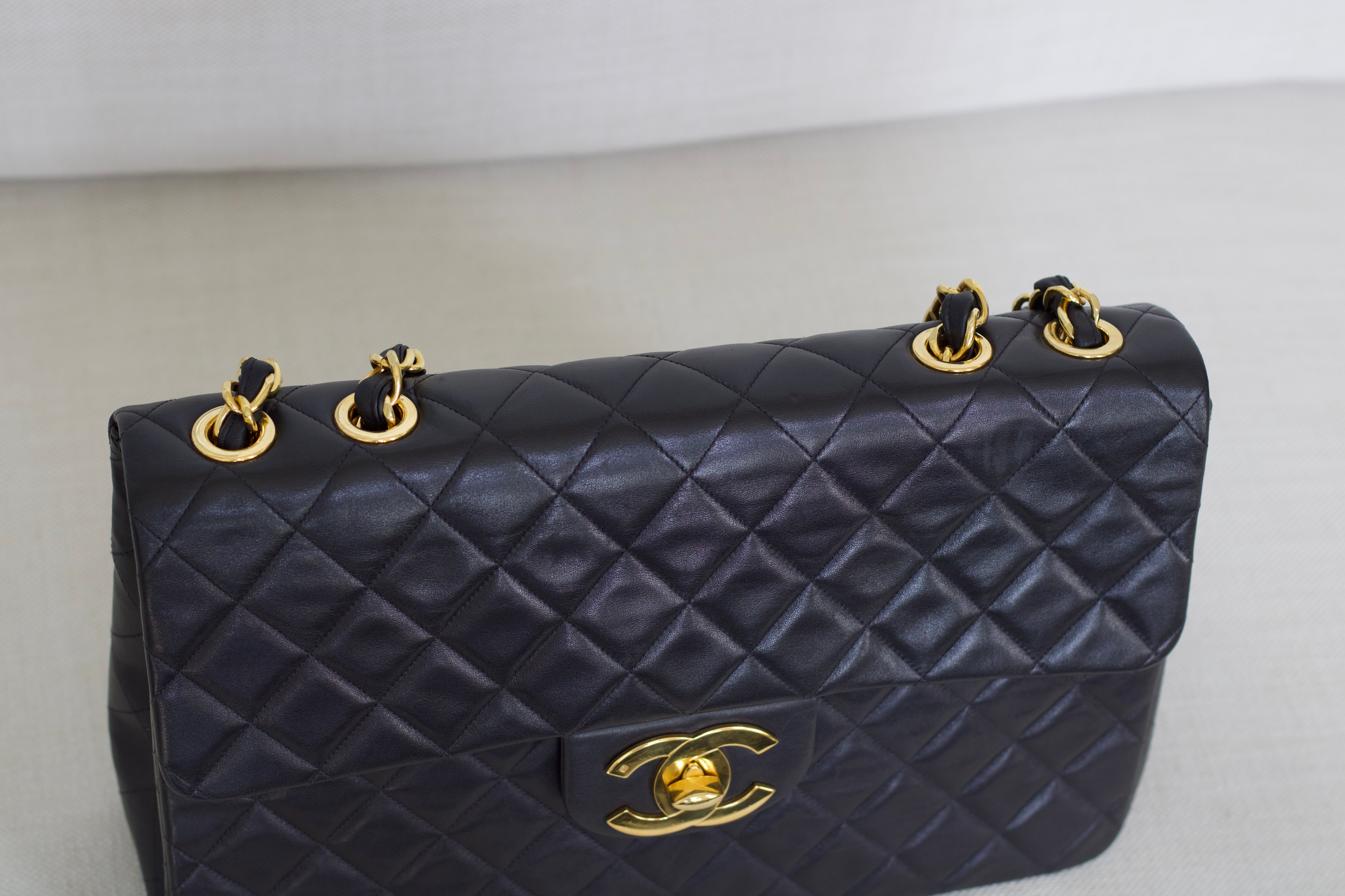 Excellent Vintage Condition. Excellent structure and some minor wear on corners. Plush black lambskin quilts and a beautiful sheen. Shiny 24k gold hardware with light scratches.