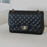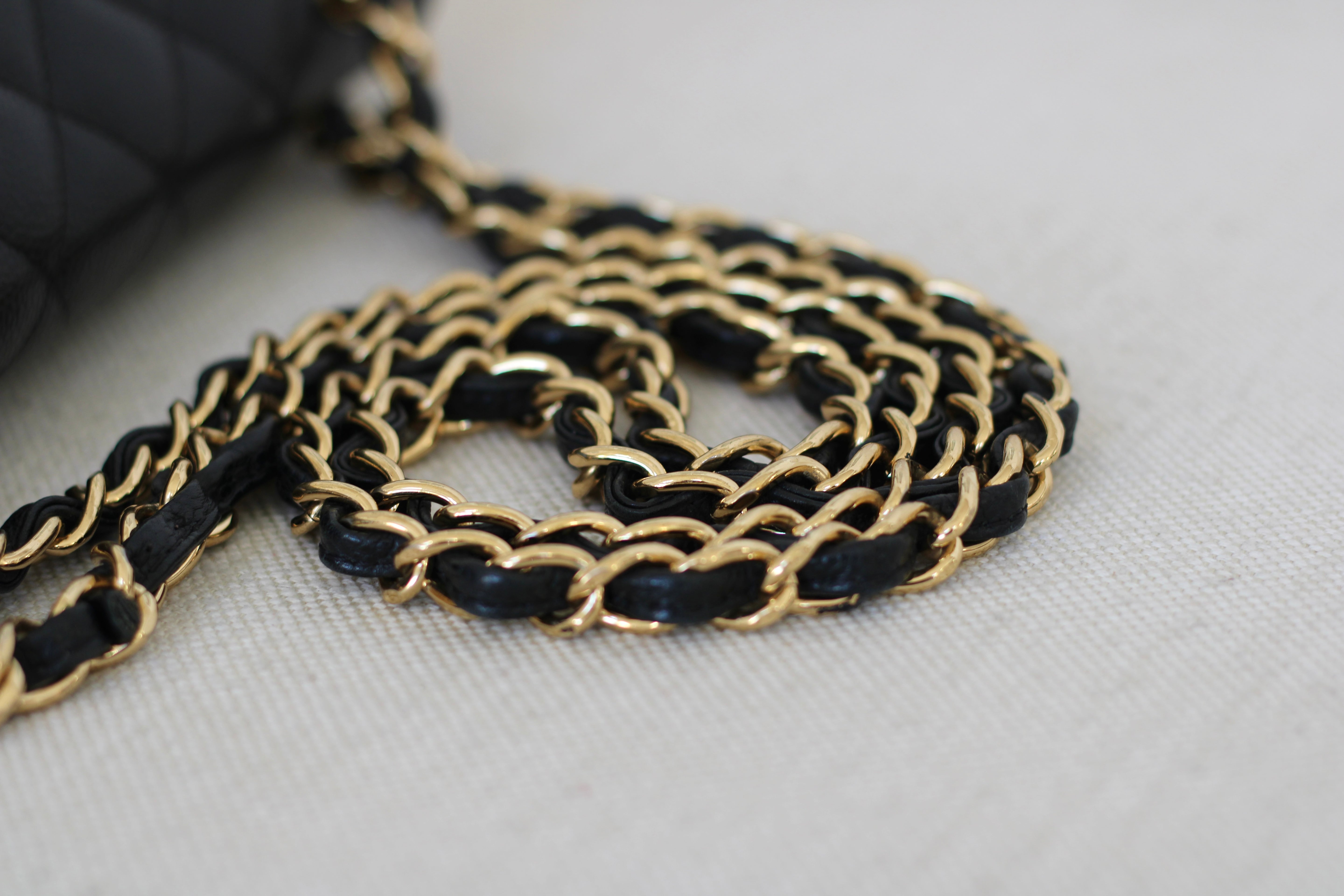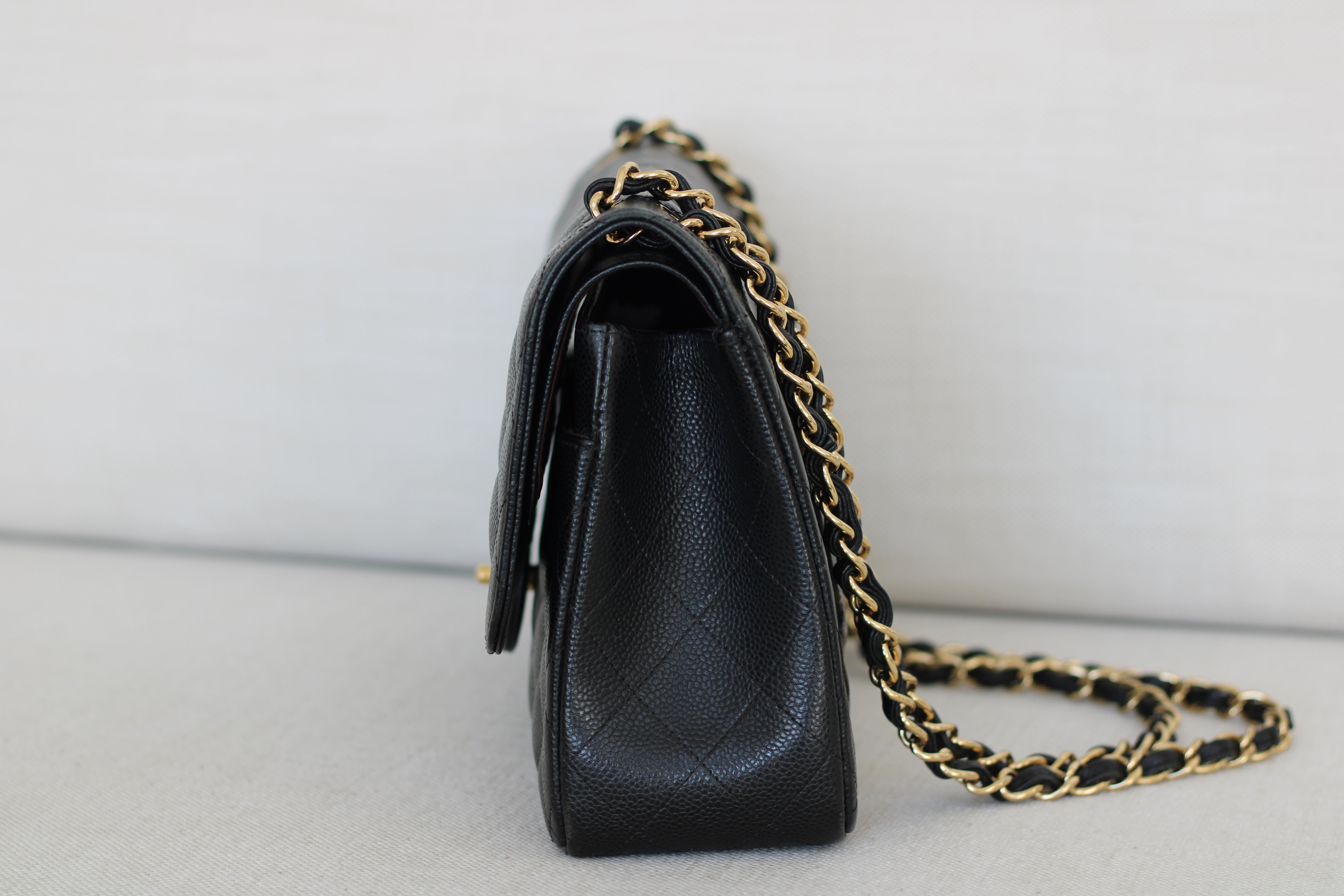 Excellent Condition. Beautifully plush black caviar quilts complimented by a stunning sheen. Excellent structure and some light corner wear as pictured. Stunning gold hardware with fine hairline scratches.