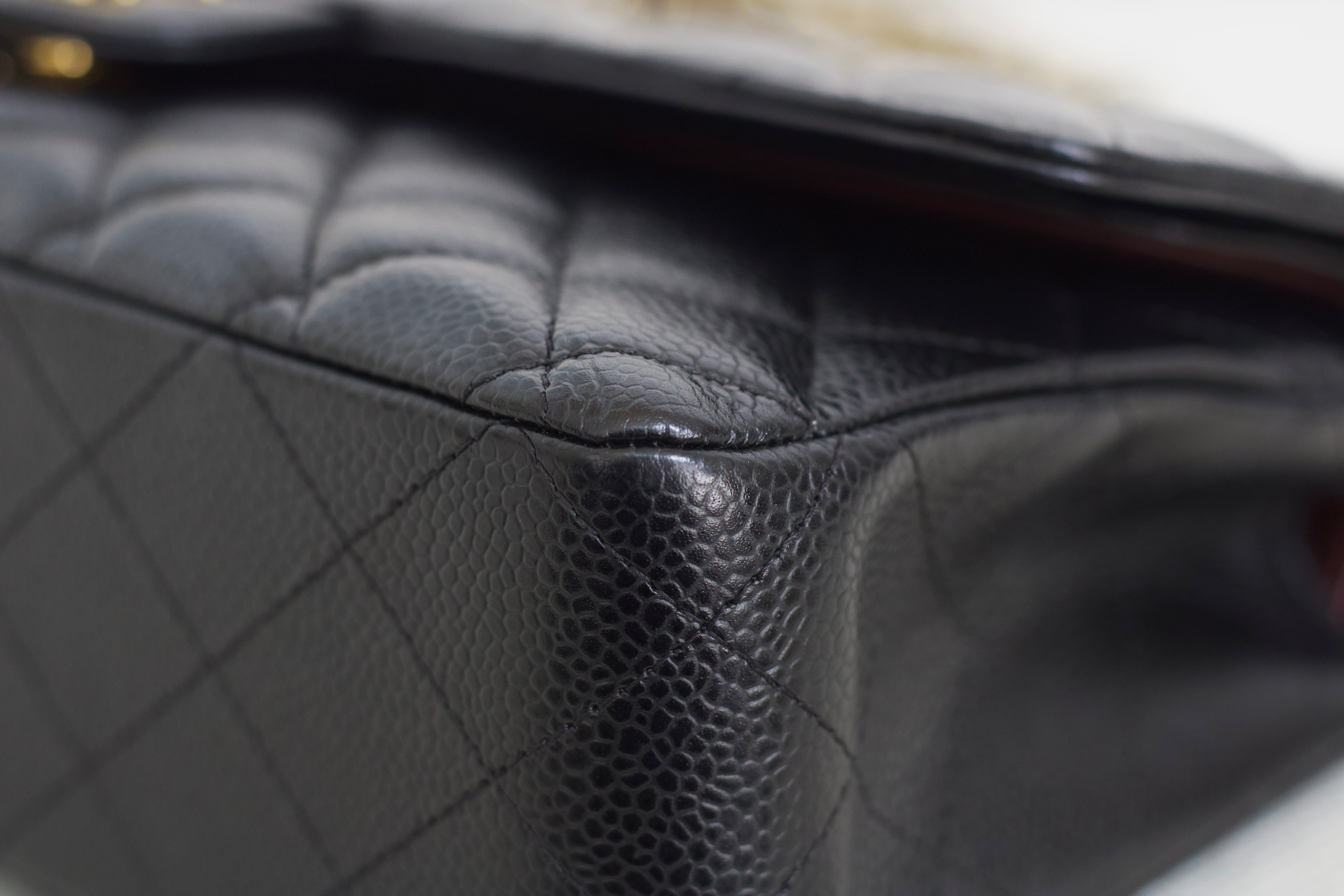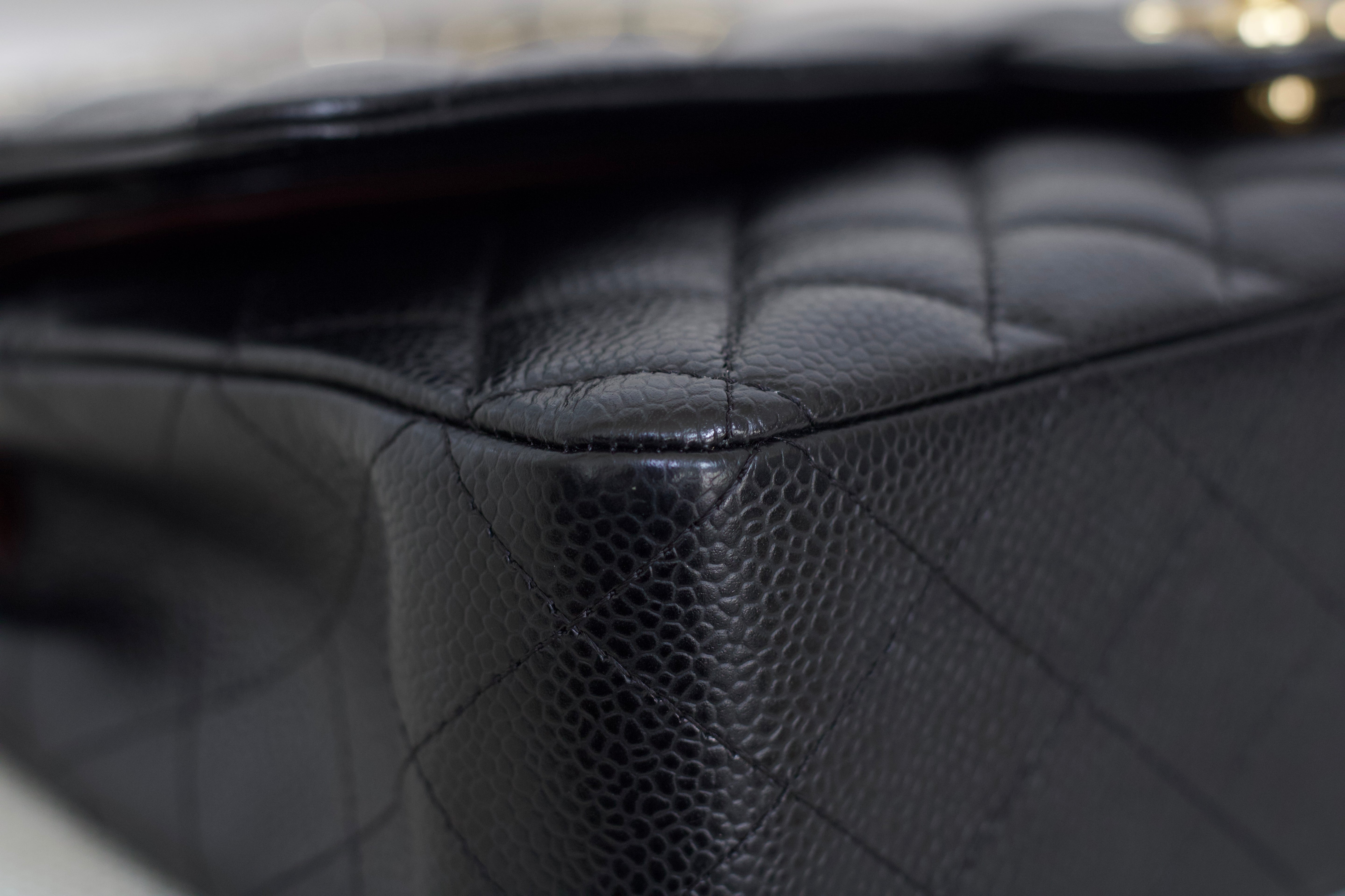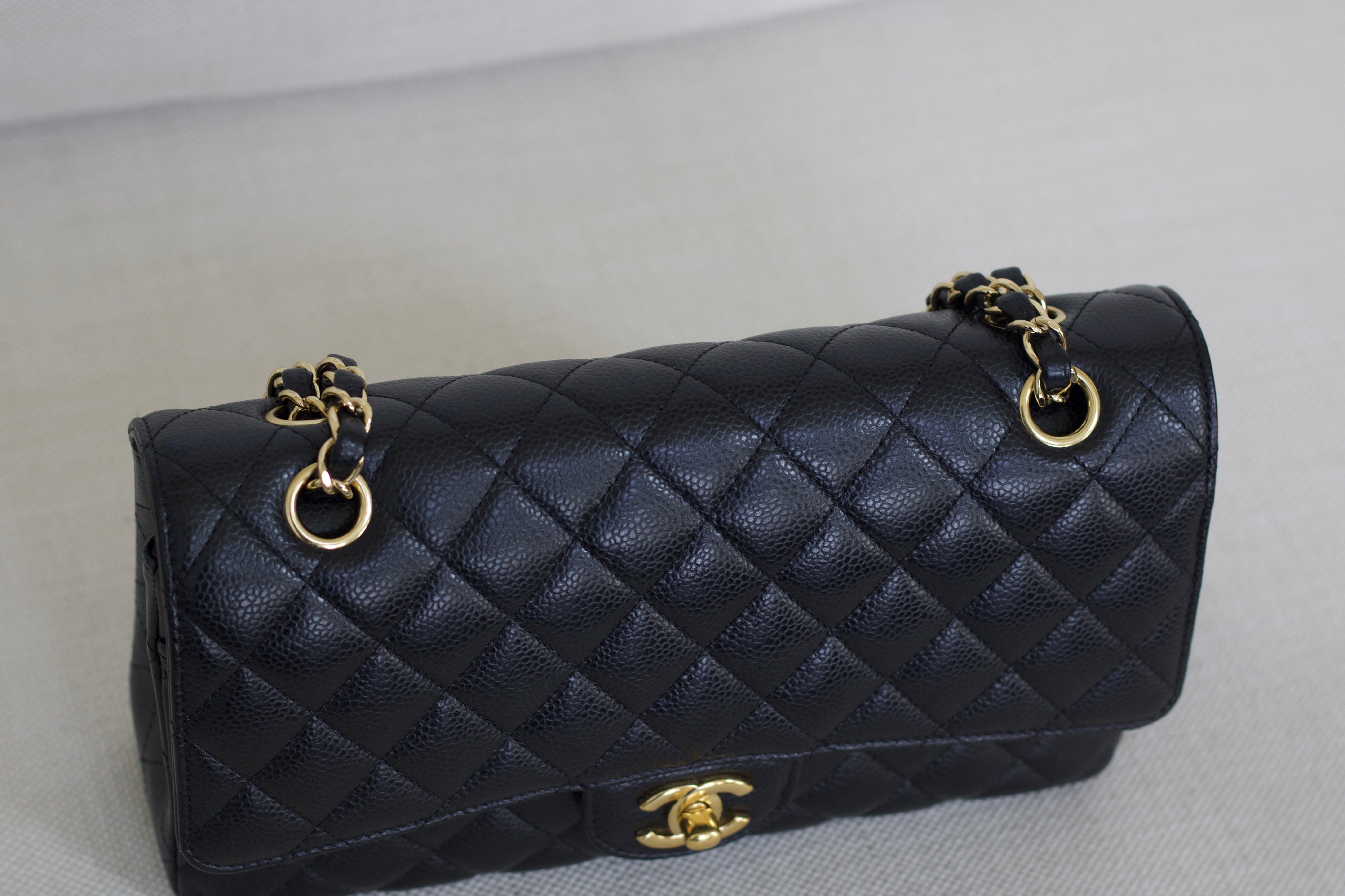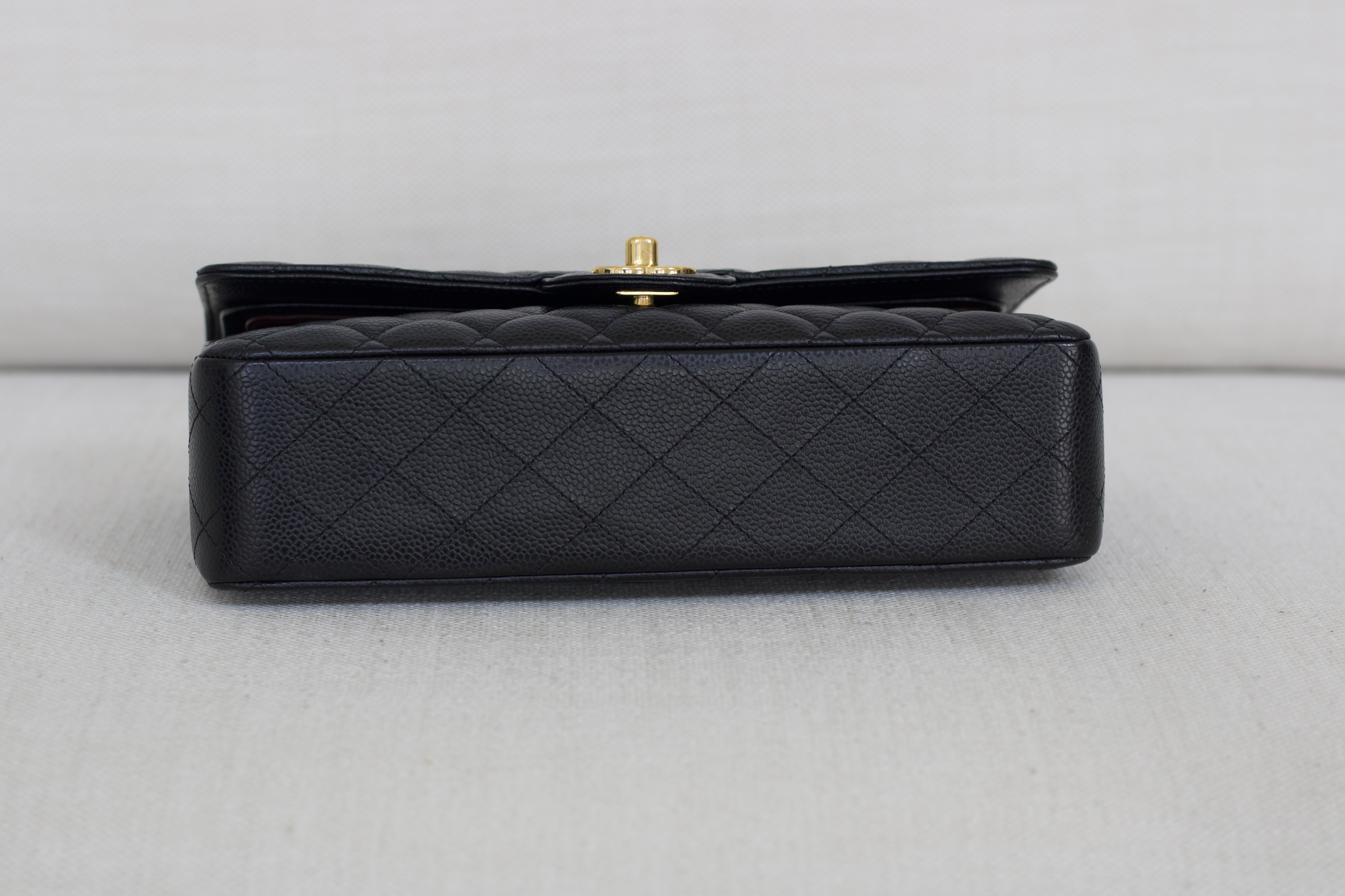 Excellent Condition. Excellent structure and corners. Plush caviar quilts with a stunning sheen. Bright and shiny gold hardware with fine hairline scratches.