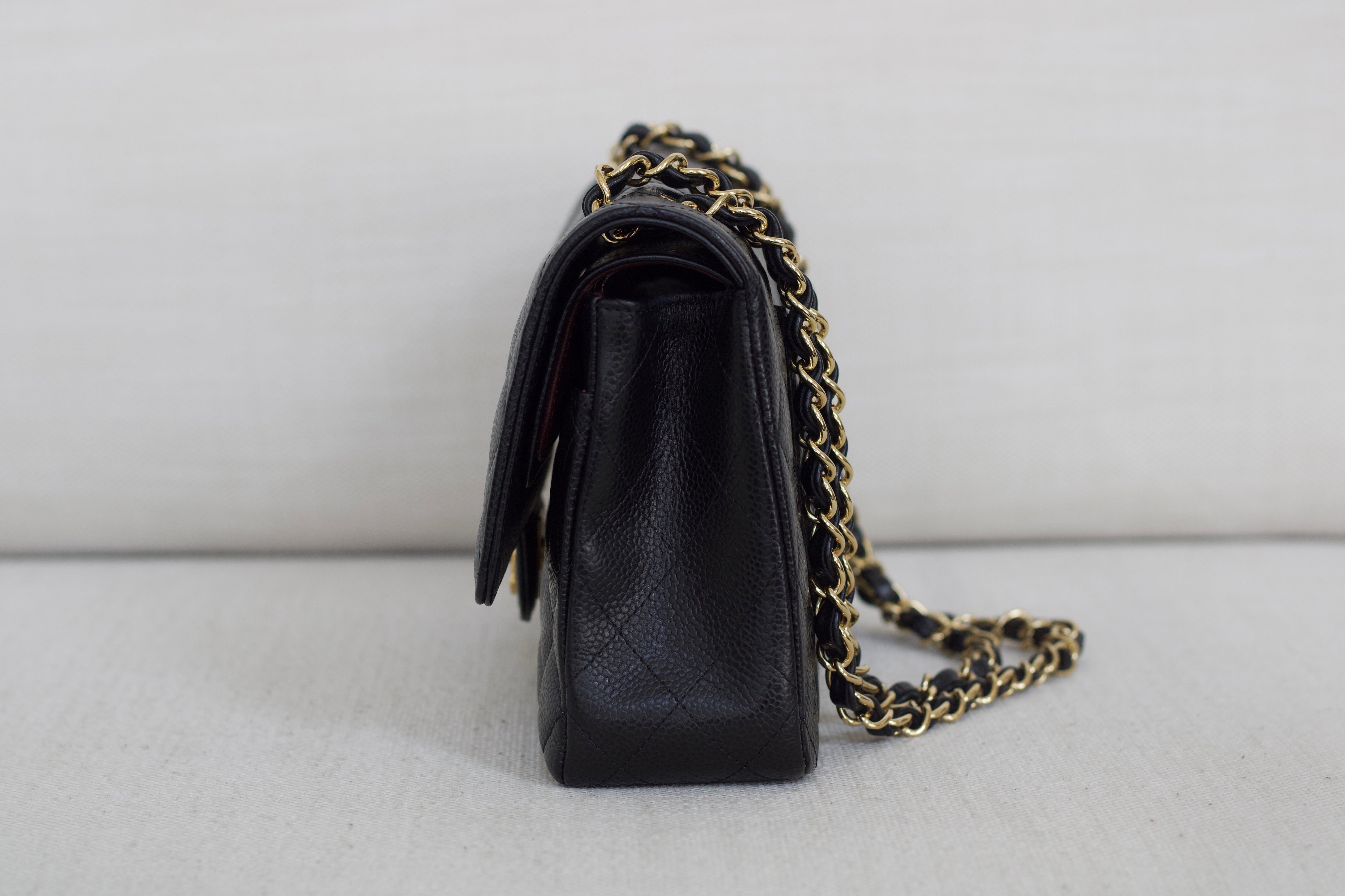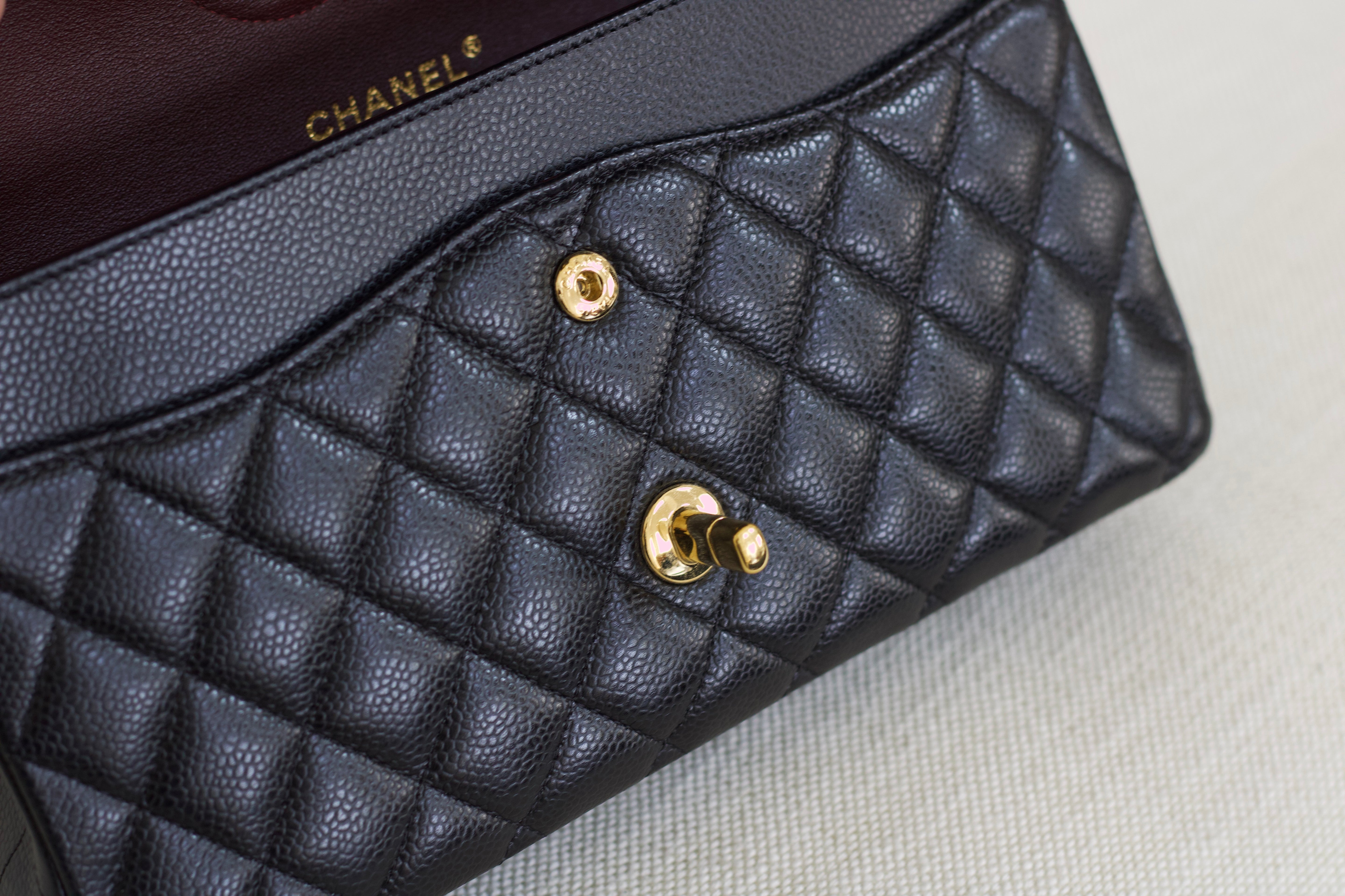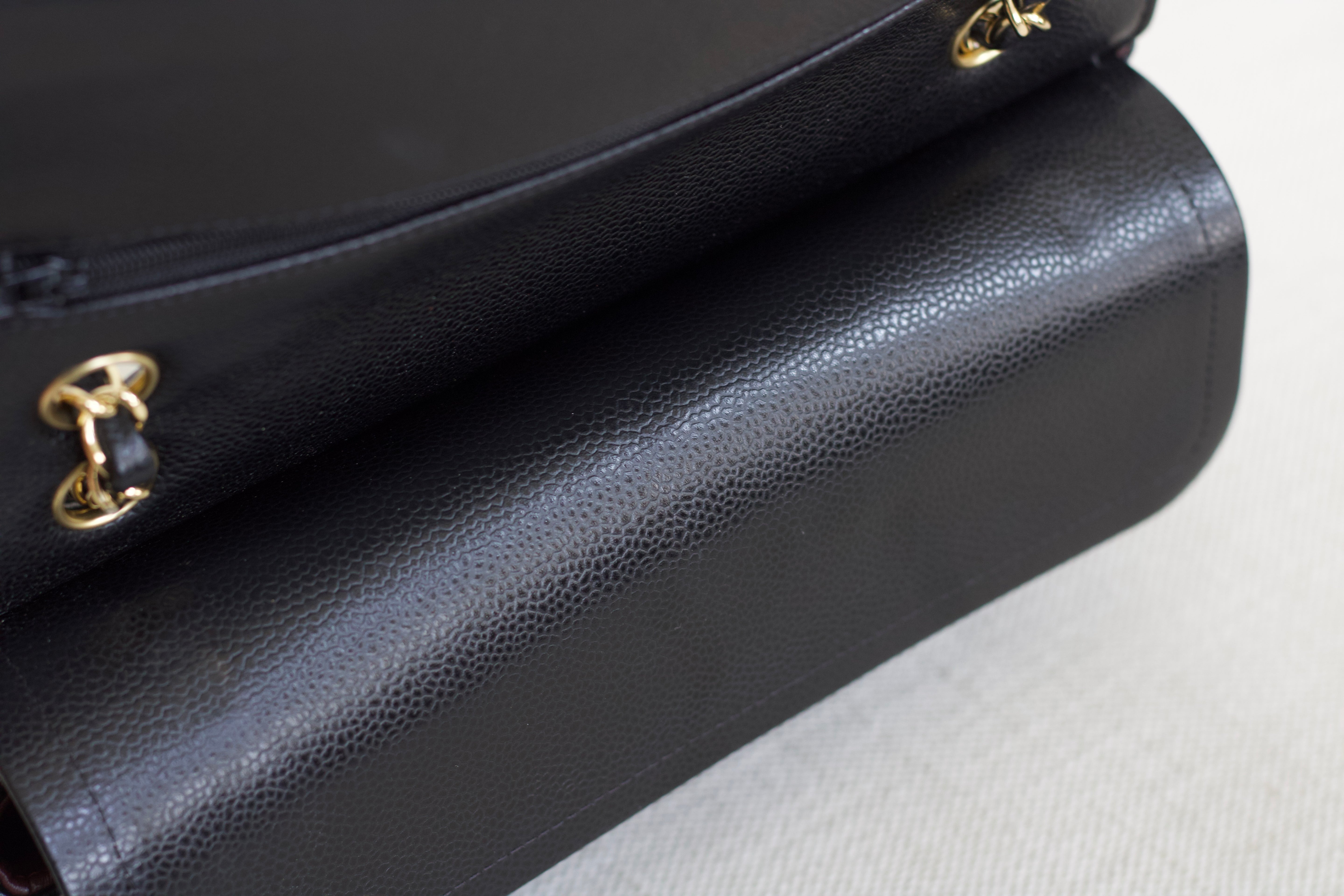 Excellent Condition. Excellent structure and corners. Plush caviar quilts with a stunning sheen. Bright and shiny gold hardware with fine hairline scratches.
