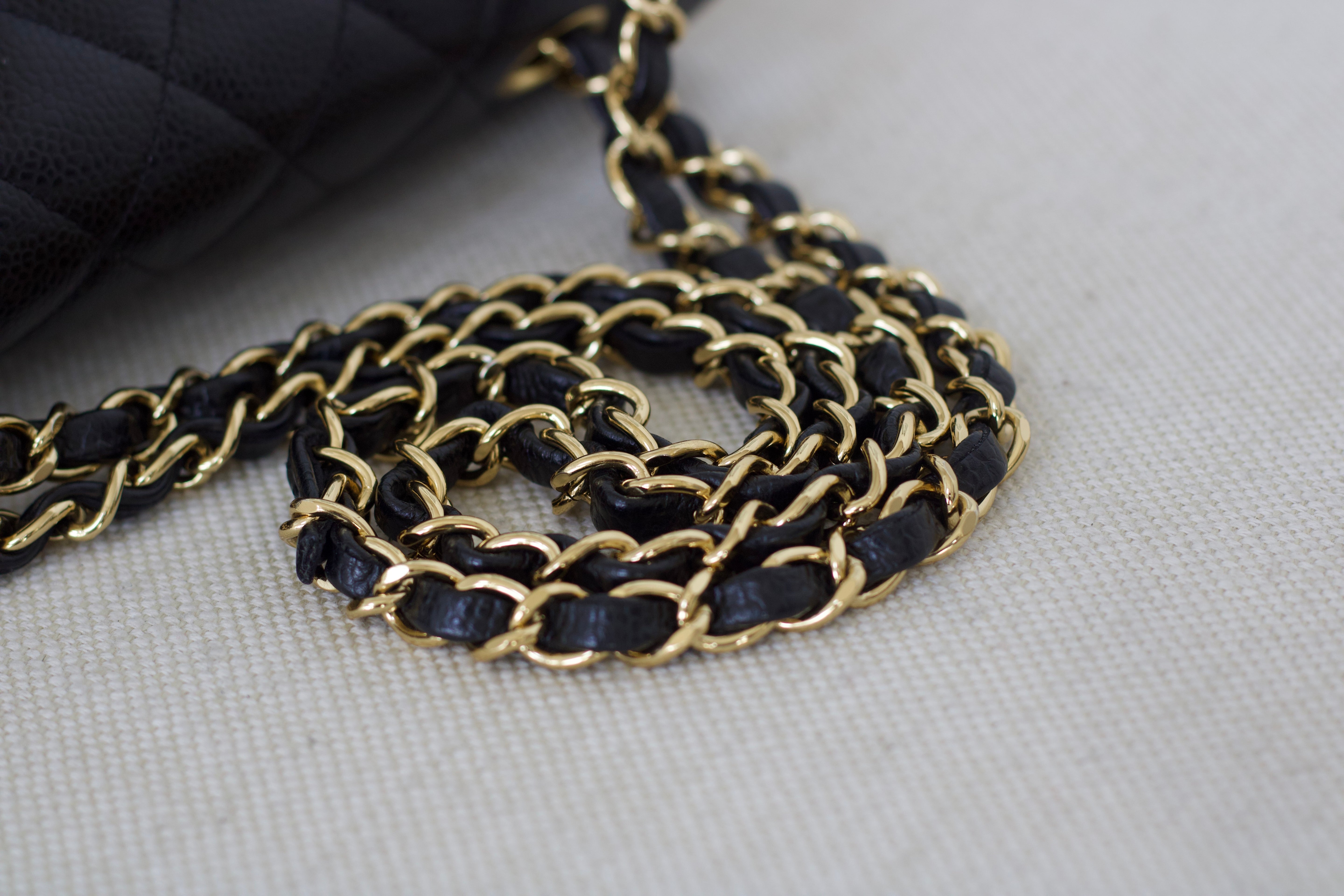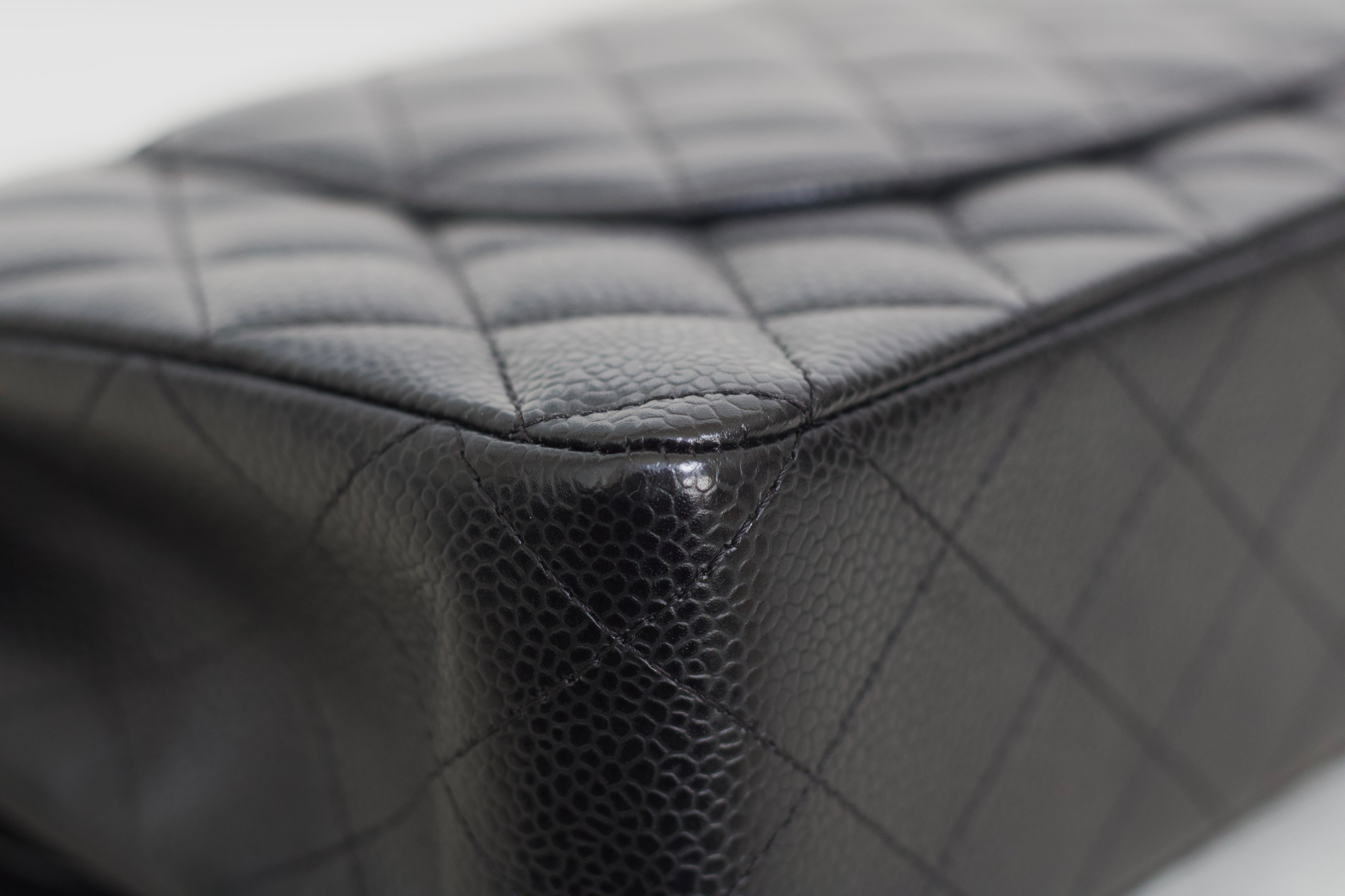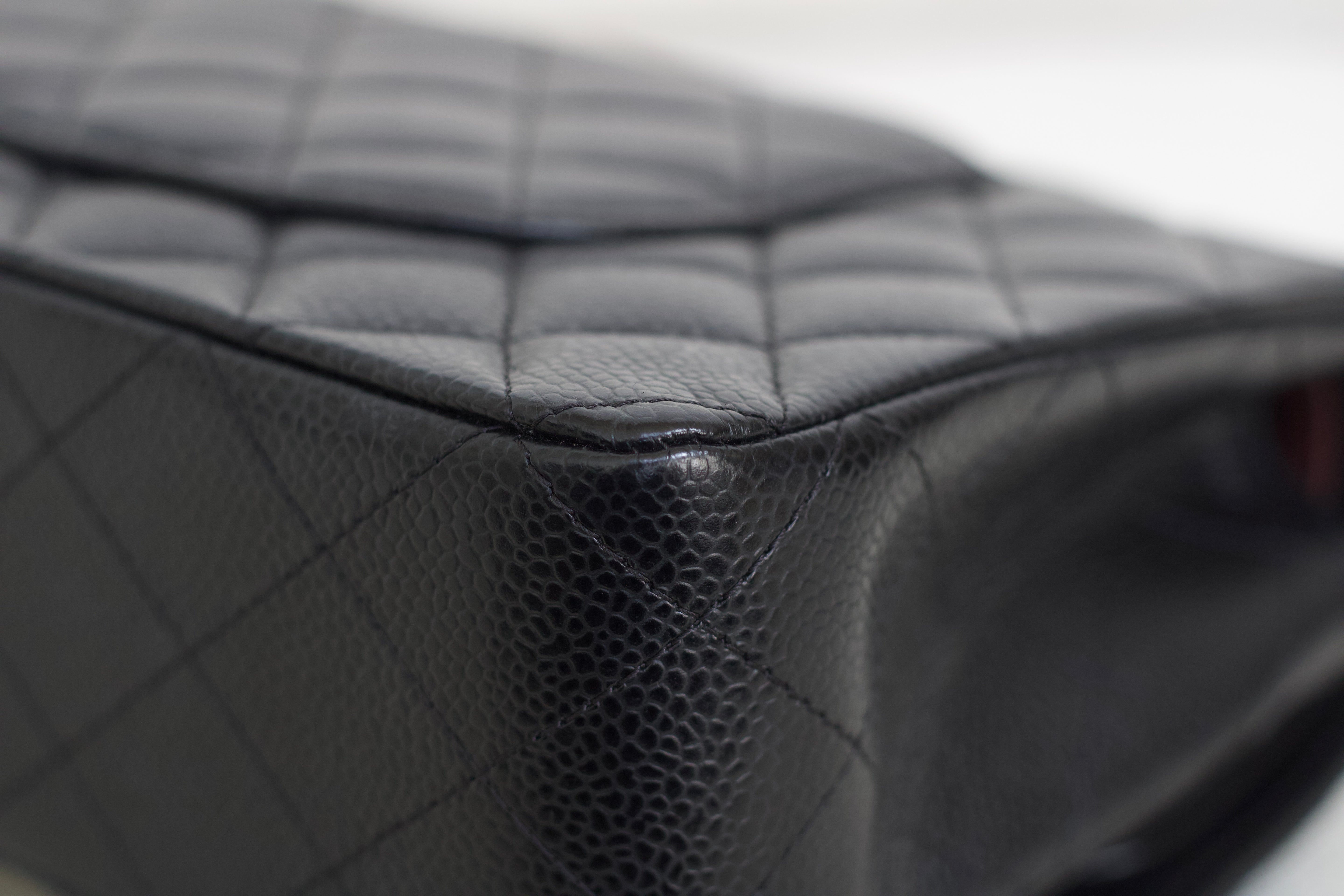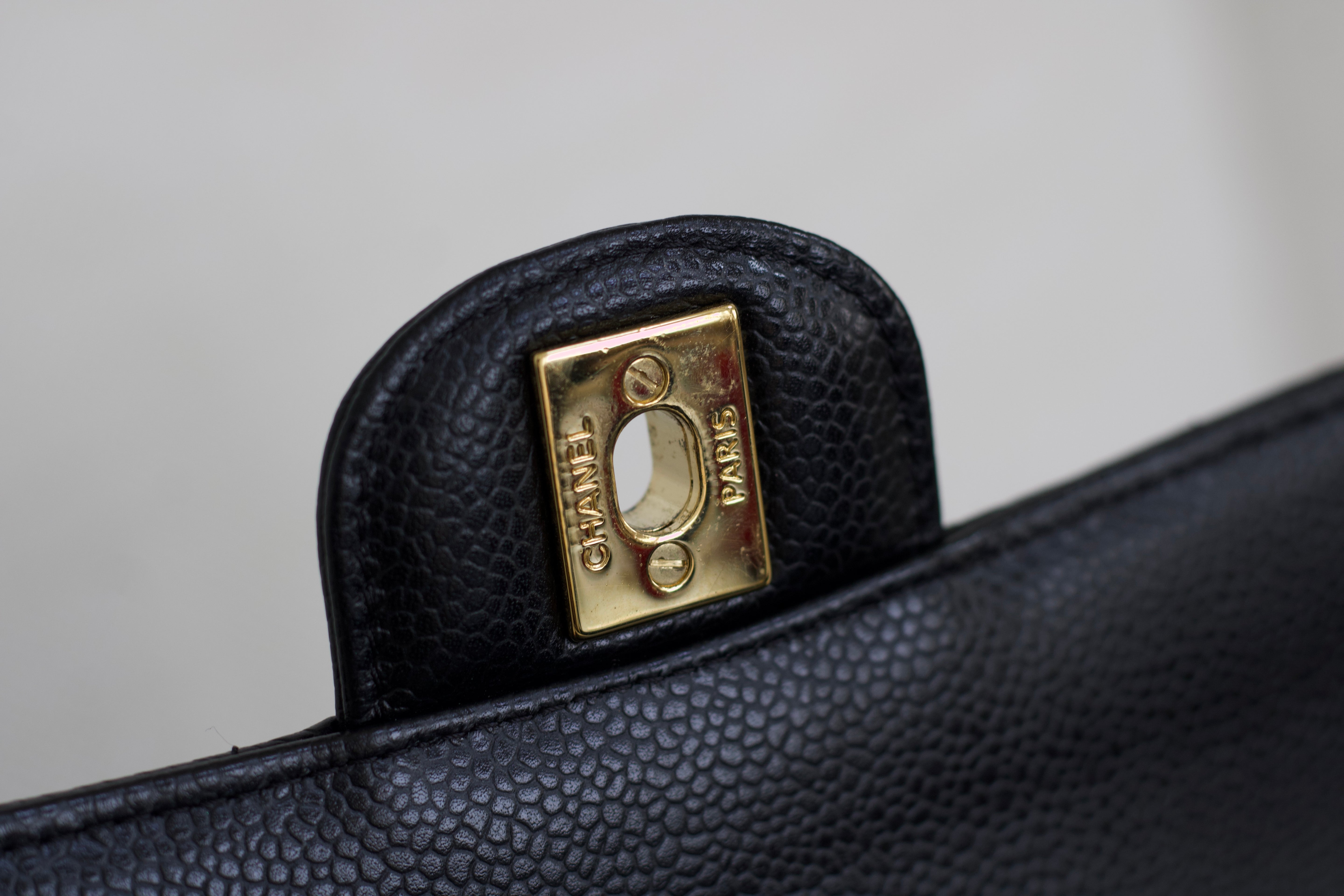 Excellent Condition. Excellent structure and corners. Plush caviar quilts with a stunning sheen. Bright and shiny gold hardware with fine hairline scratches.