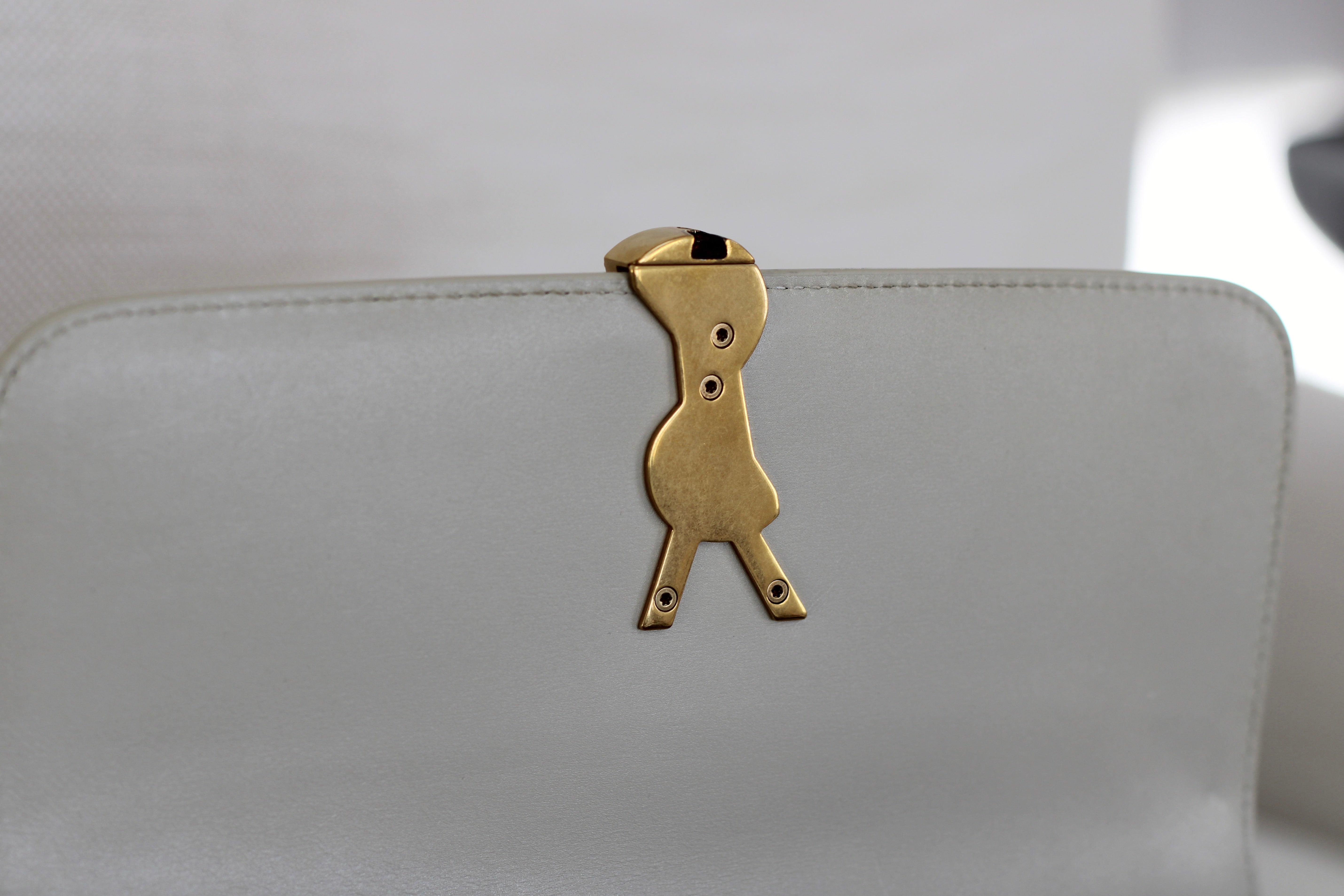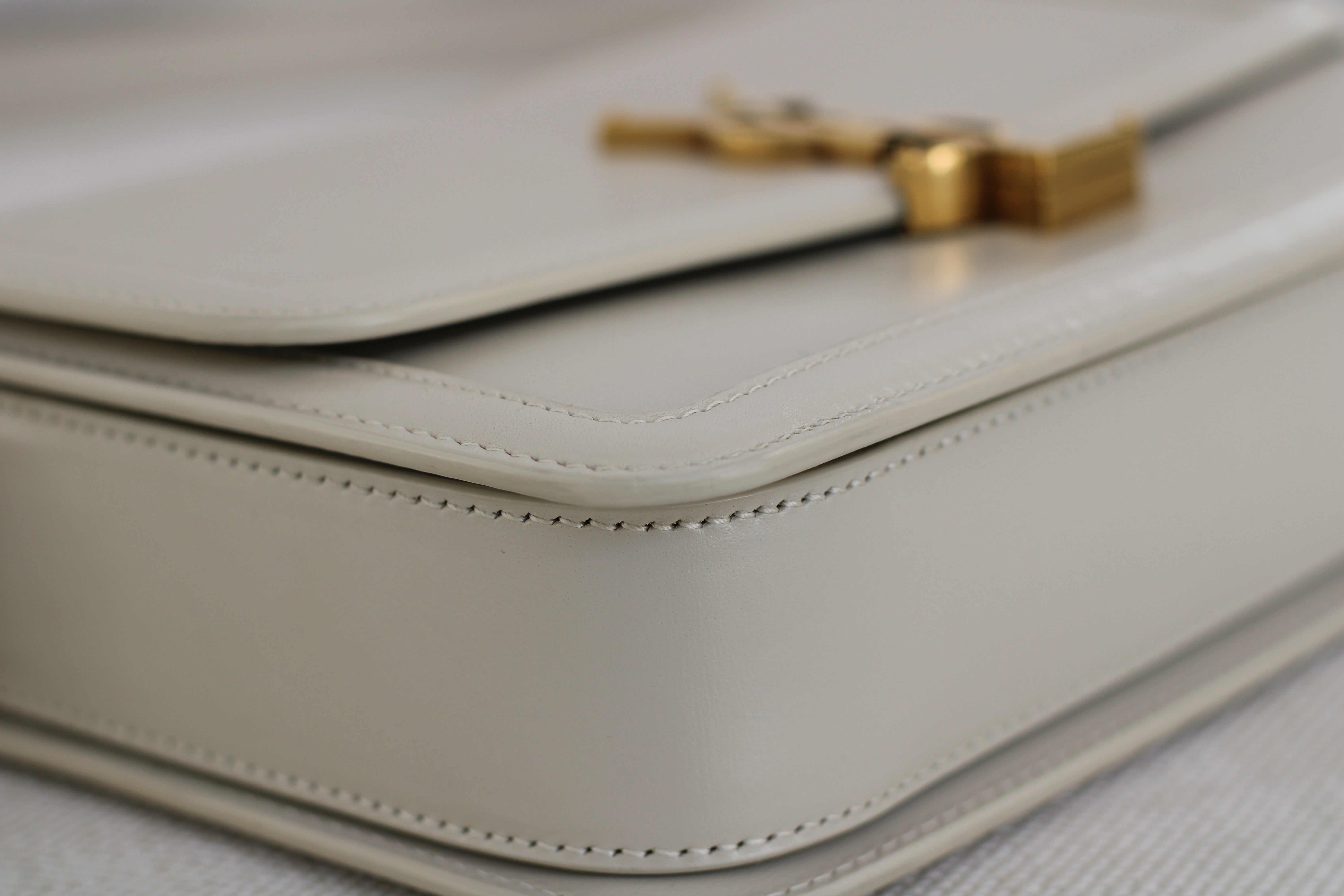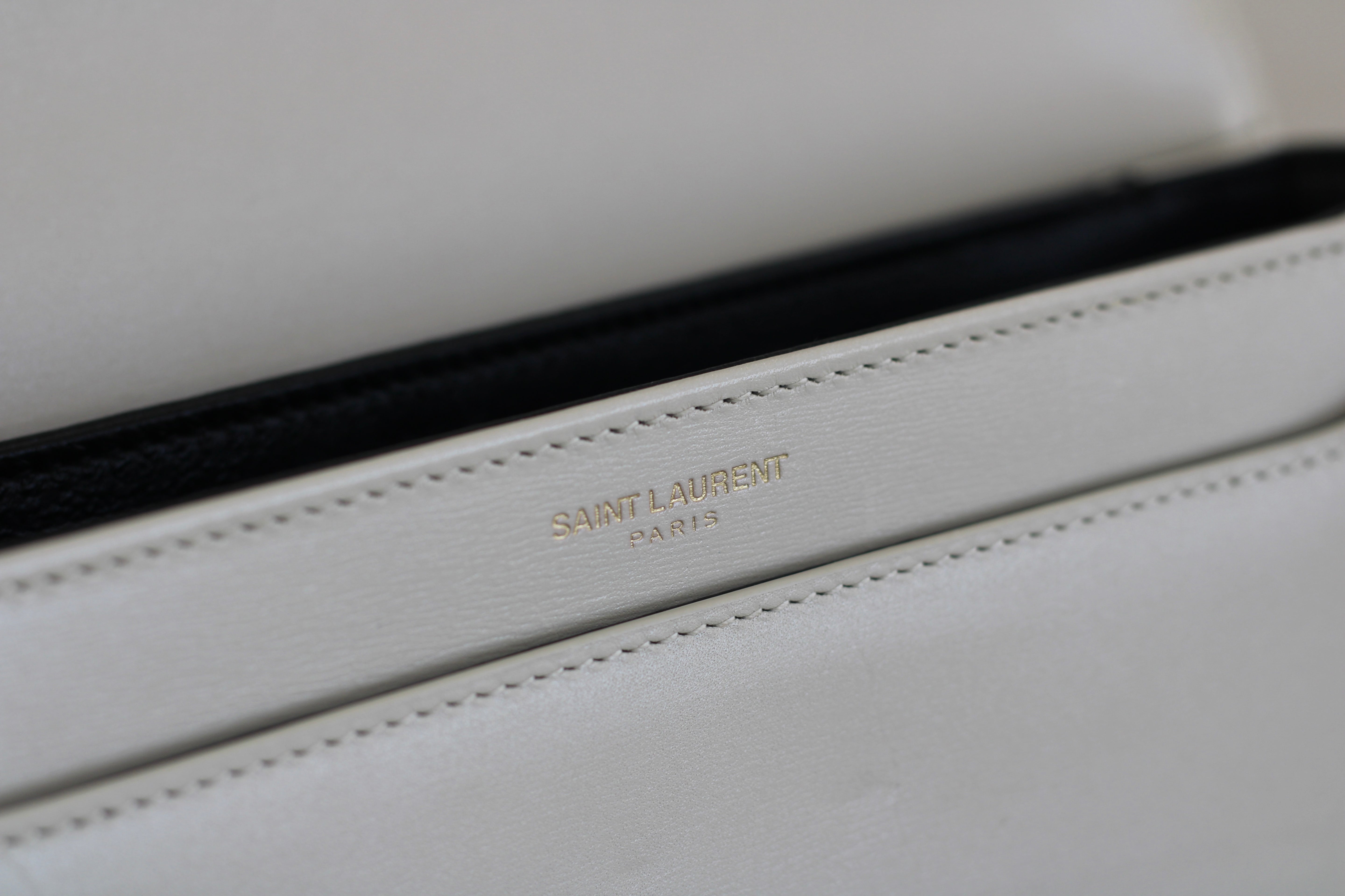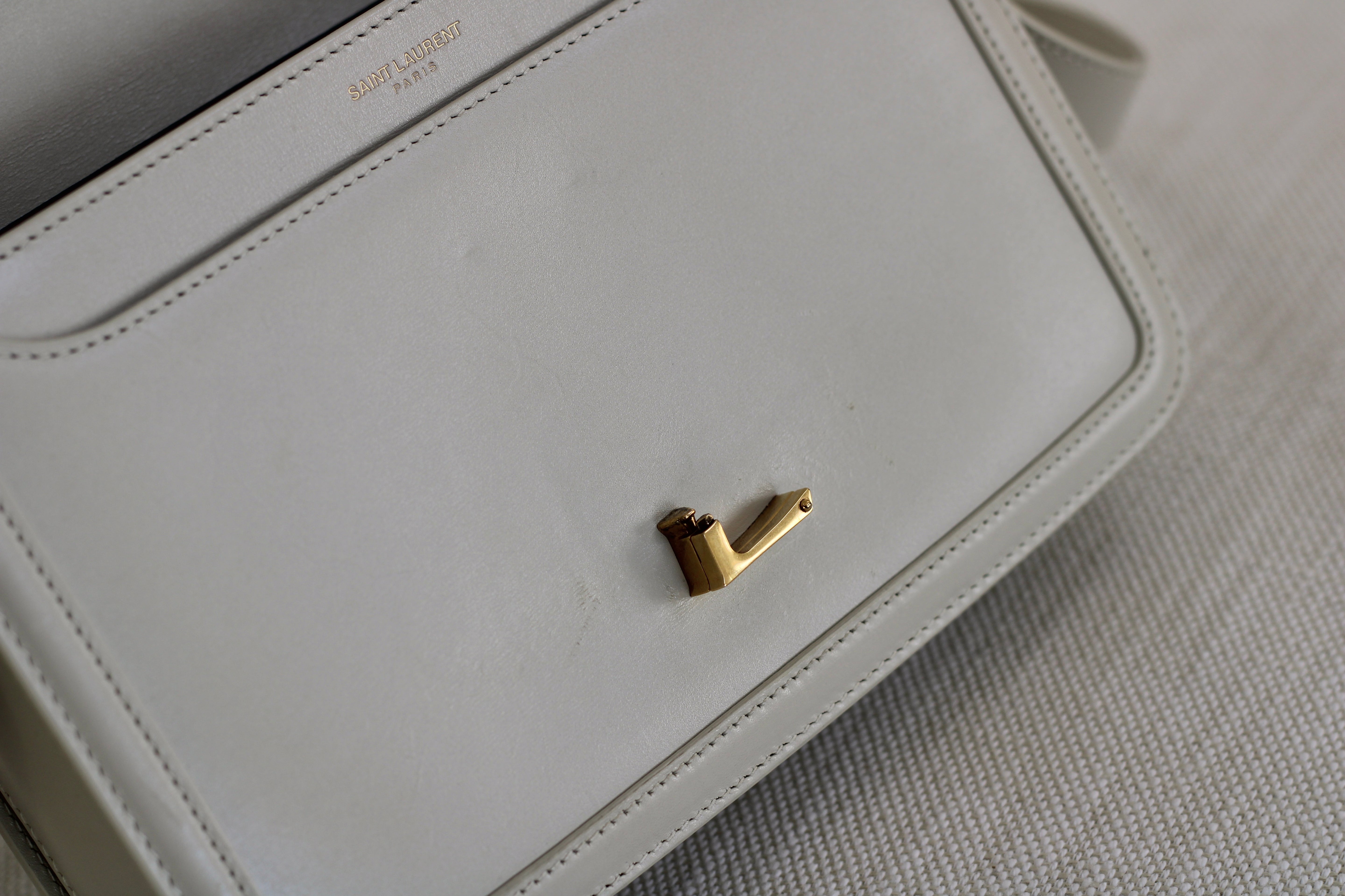 Excellent Condition. Excellent structure and corners. Beautifully supple calfskin leather in a stunning cream shade. Some scratches on interior flap as pictured. Brilliant gold tone hardware with some minor tarnishing on YSL monogram and light hairline scratches.