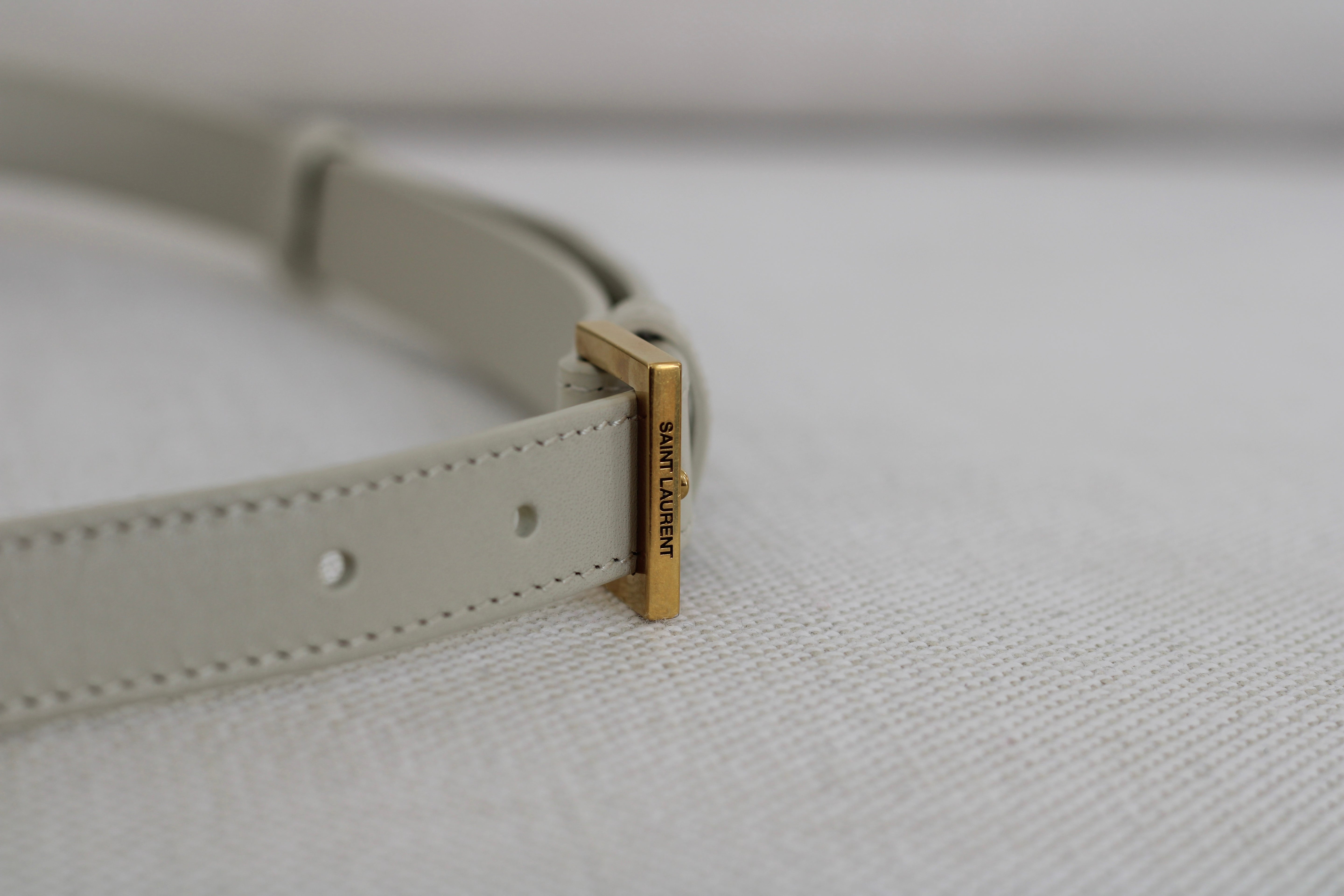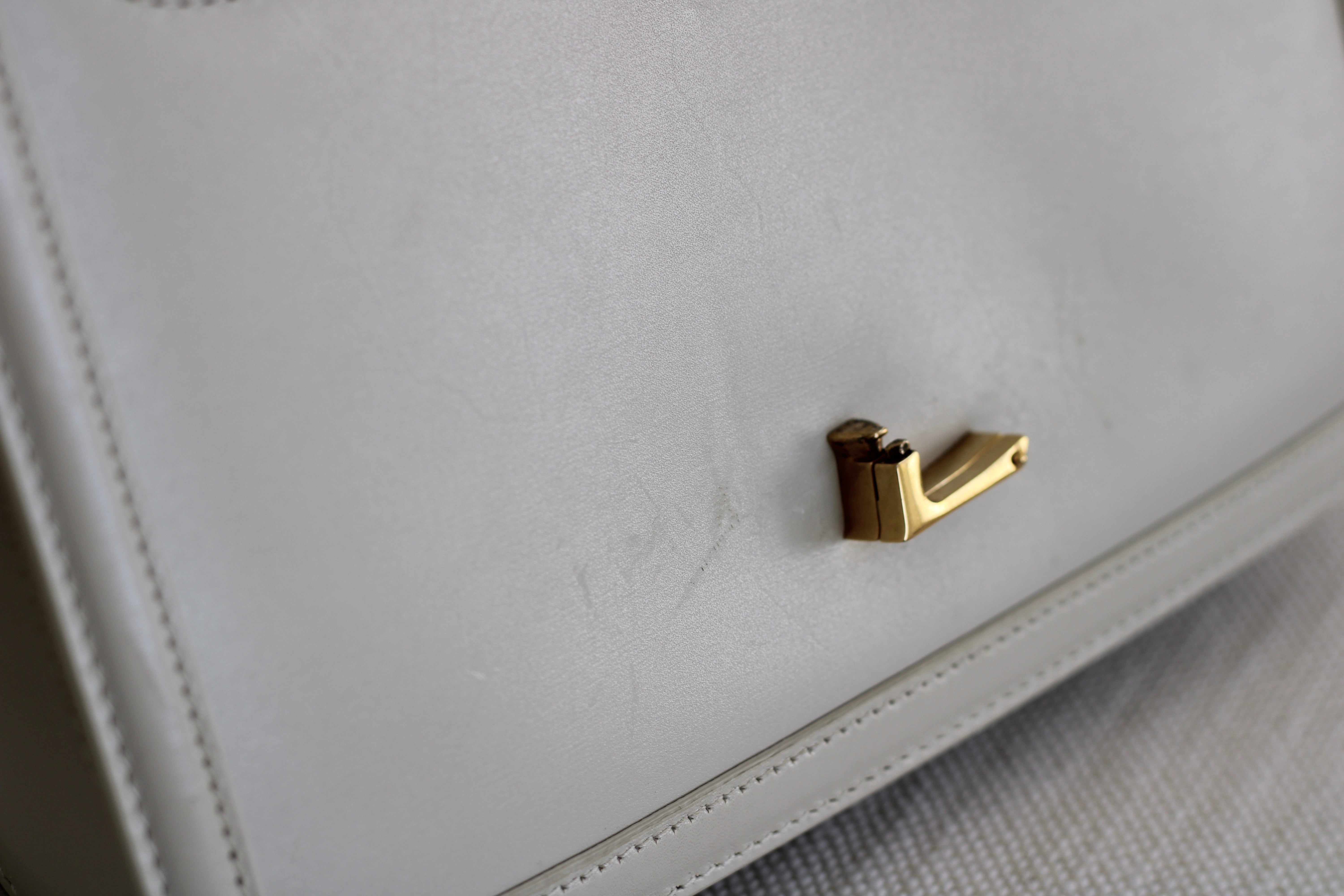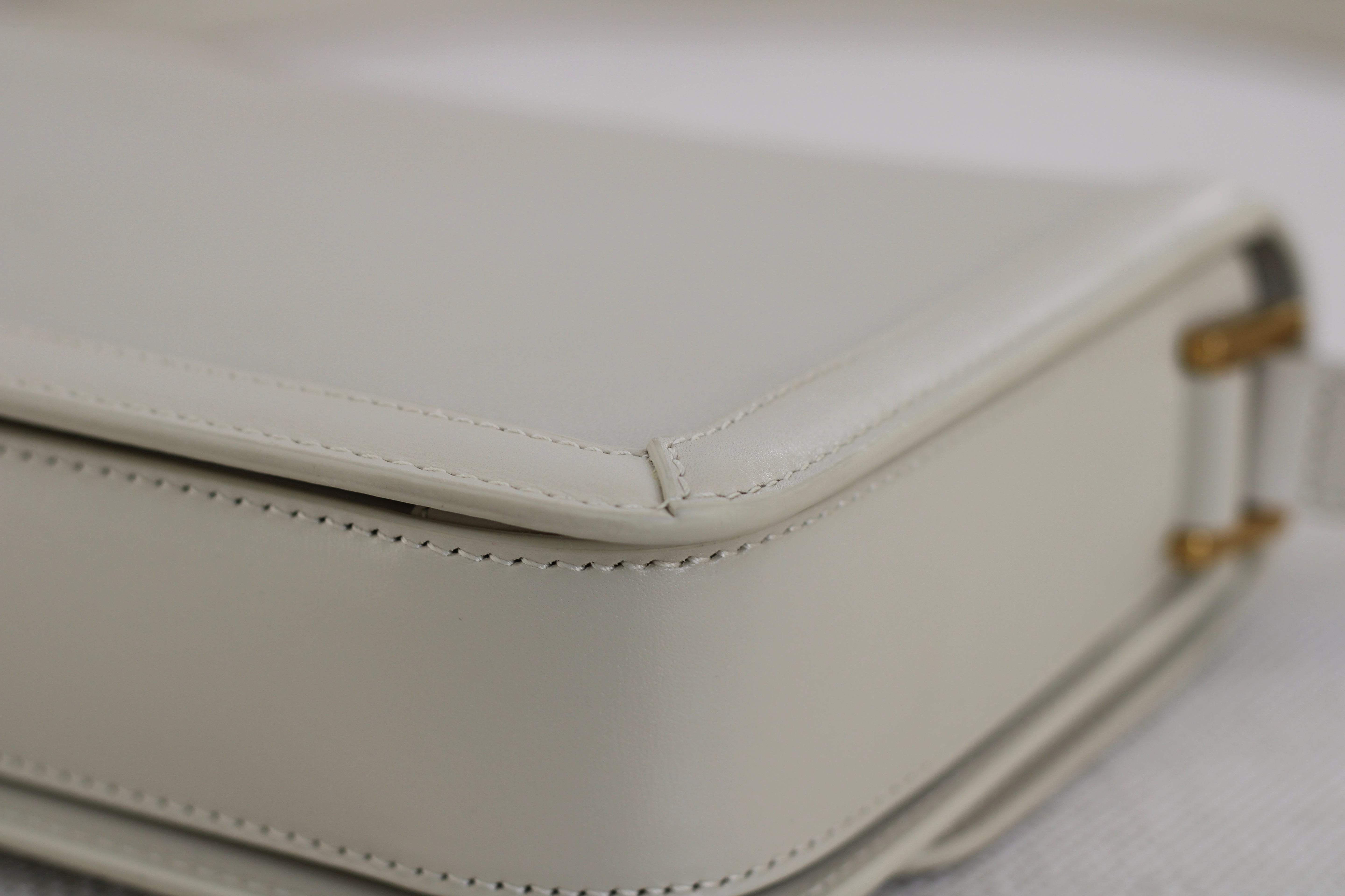 Excellent Condition. Excellent structure and corners. Beautifully supple calfskin leather in a stunning cream shade. Some scratches on interior flap as pictured. Brilliant gold tone hardware with some minor tarnishing on YSL monogram and light hairline scratches.