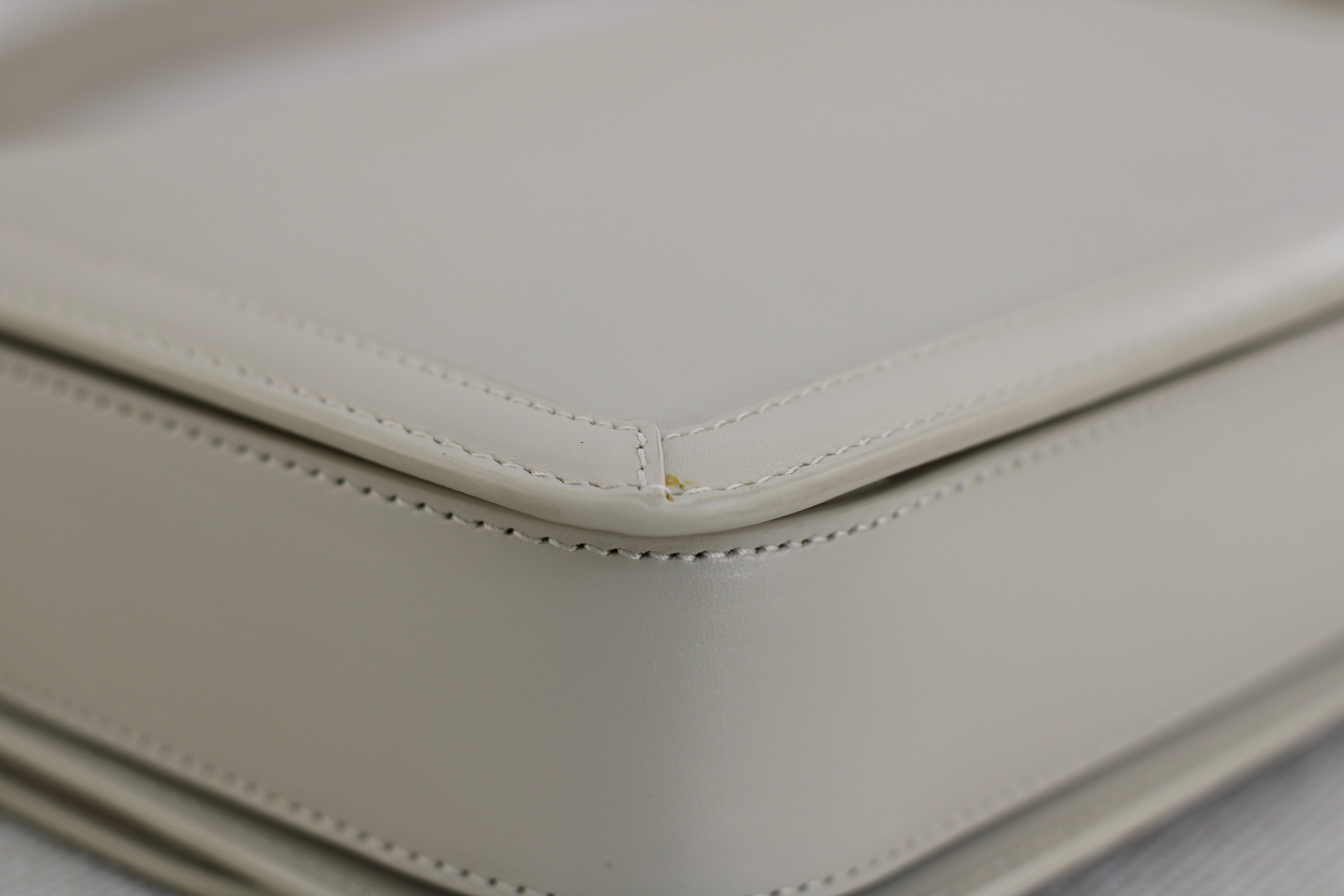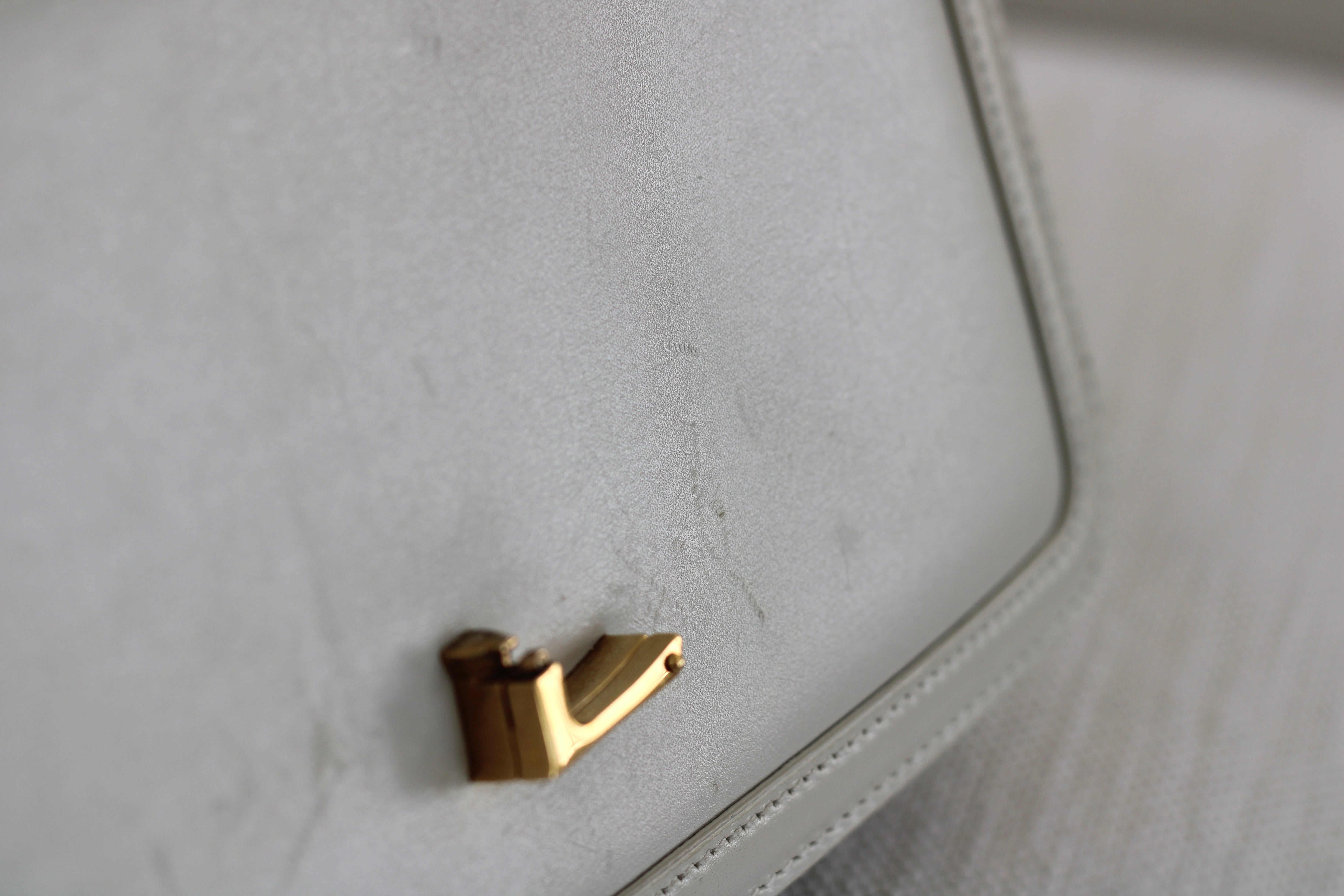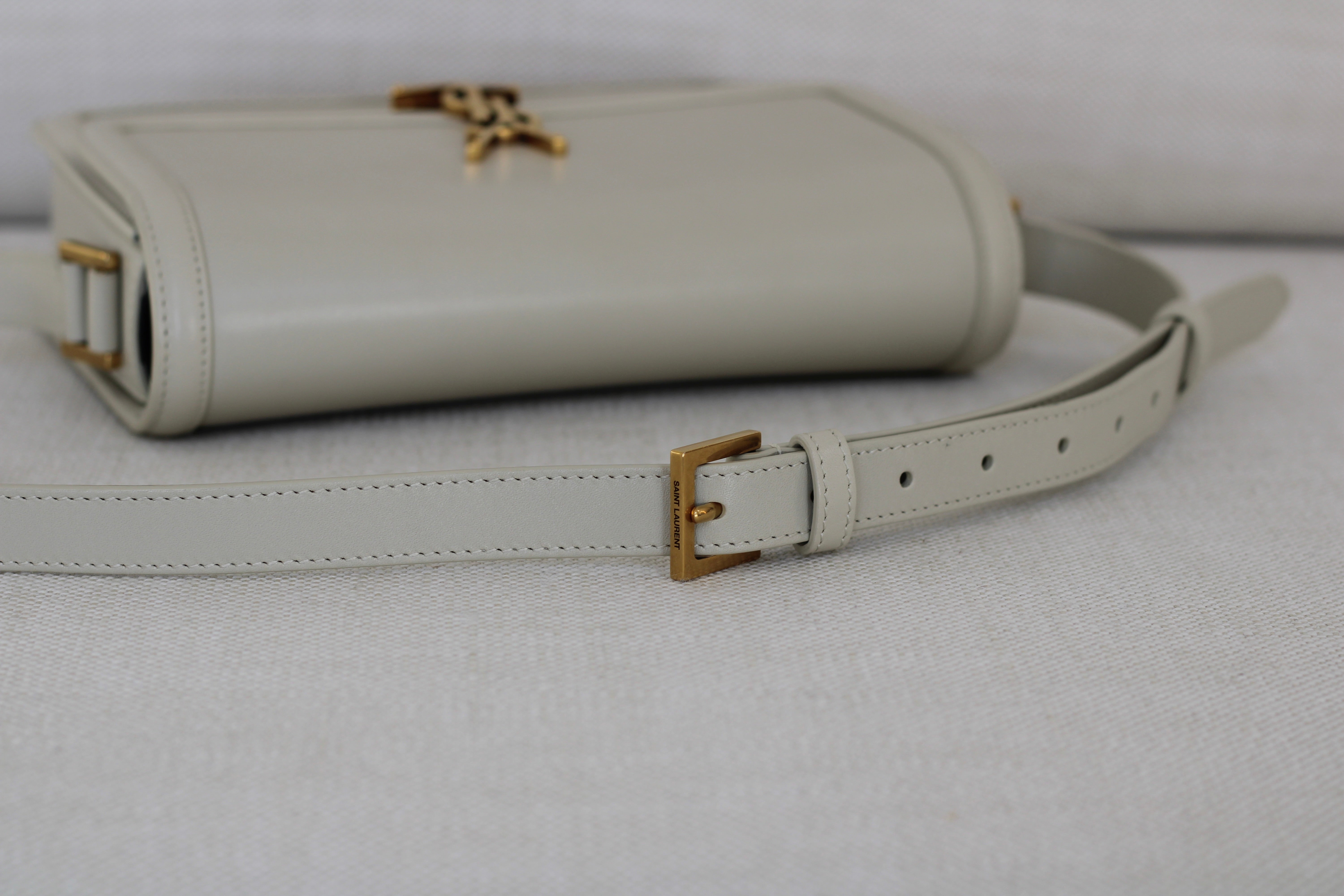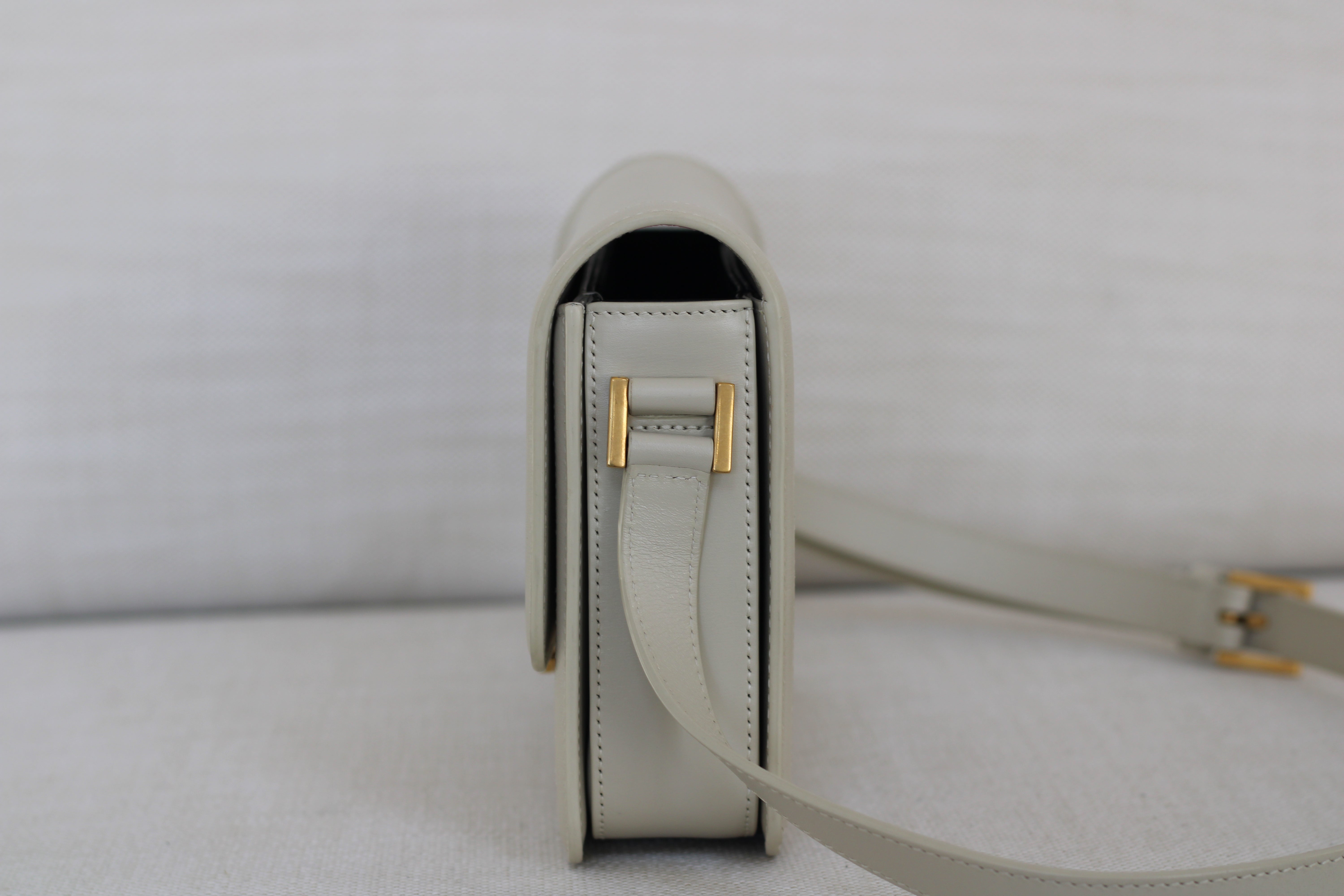 Excellent Condition. Excellent structure and corners. Beautifully supple calfskin leather in a stunning cream shade. Some scratches on interior flap as pictured. Brilliant gold tone hardware with some minor tarnishing on YSL monogram and light hairline scratches.