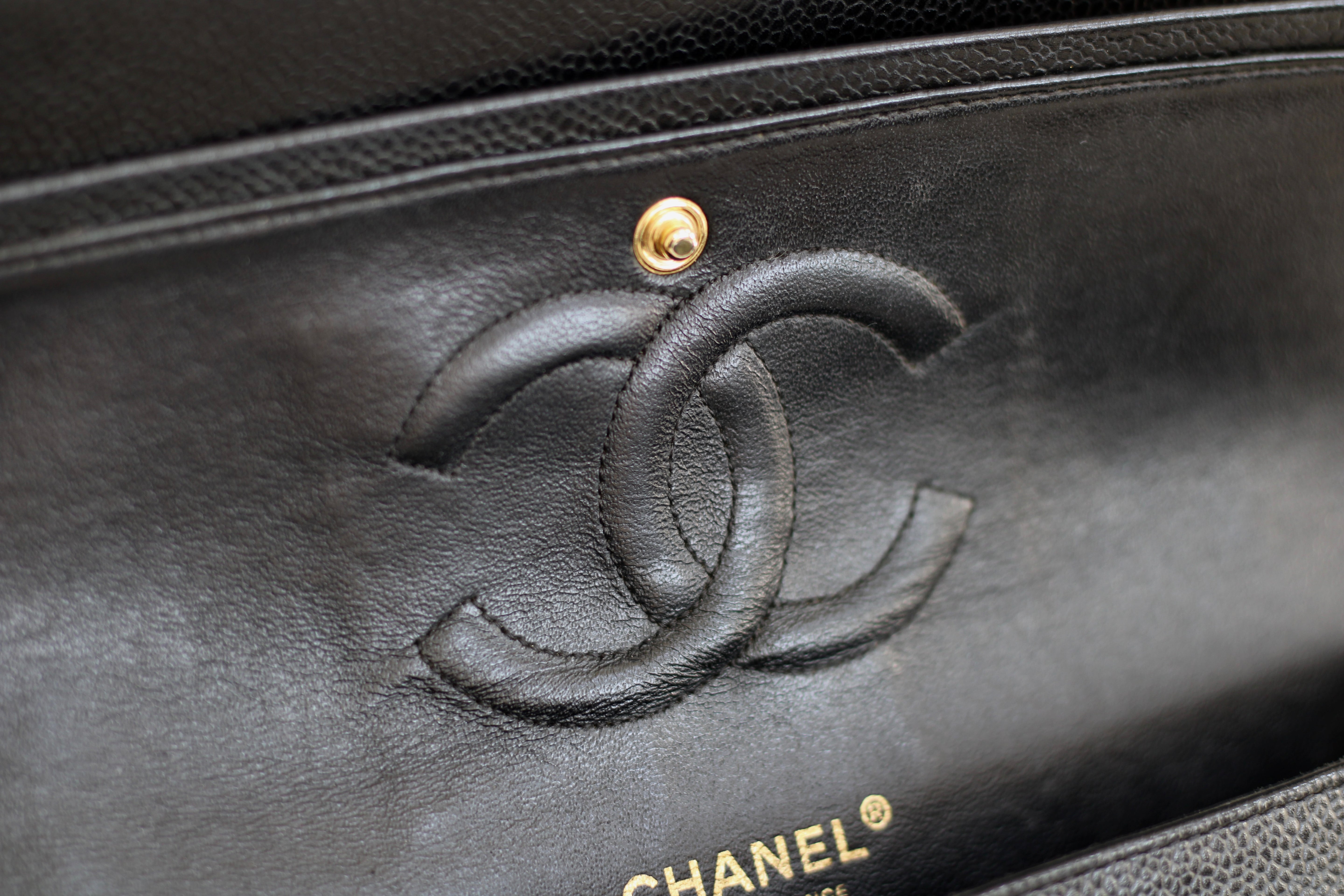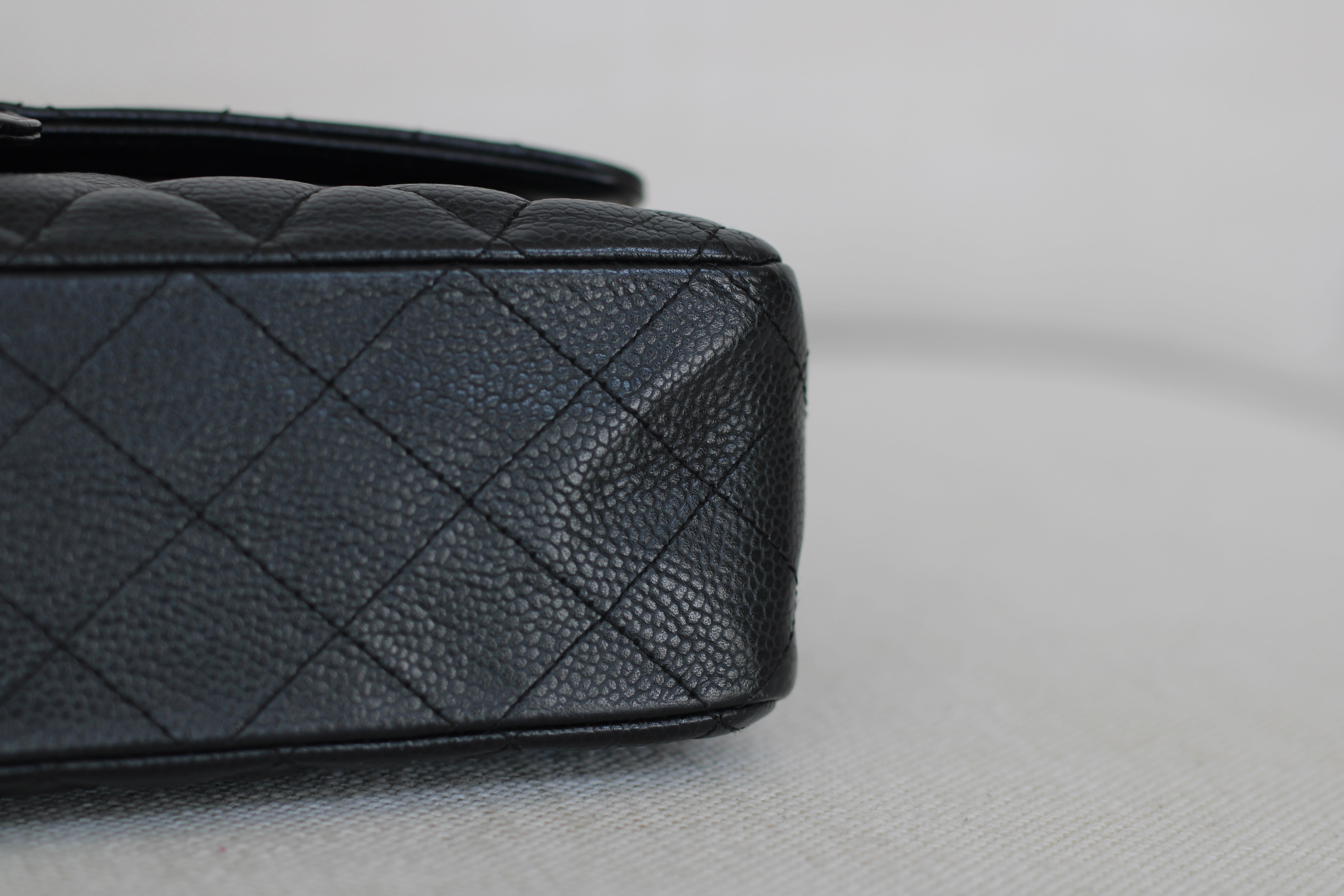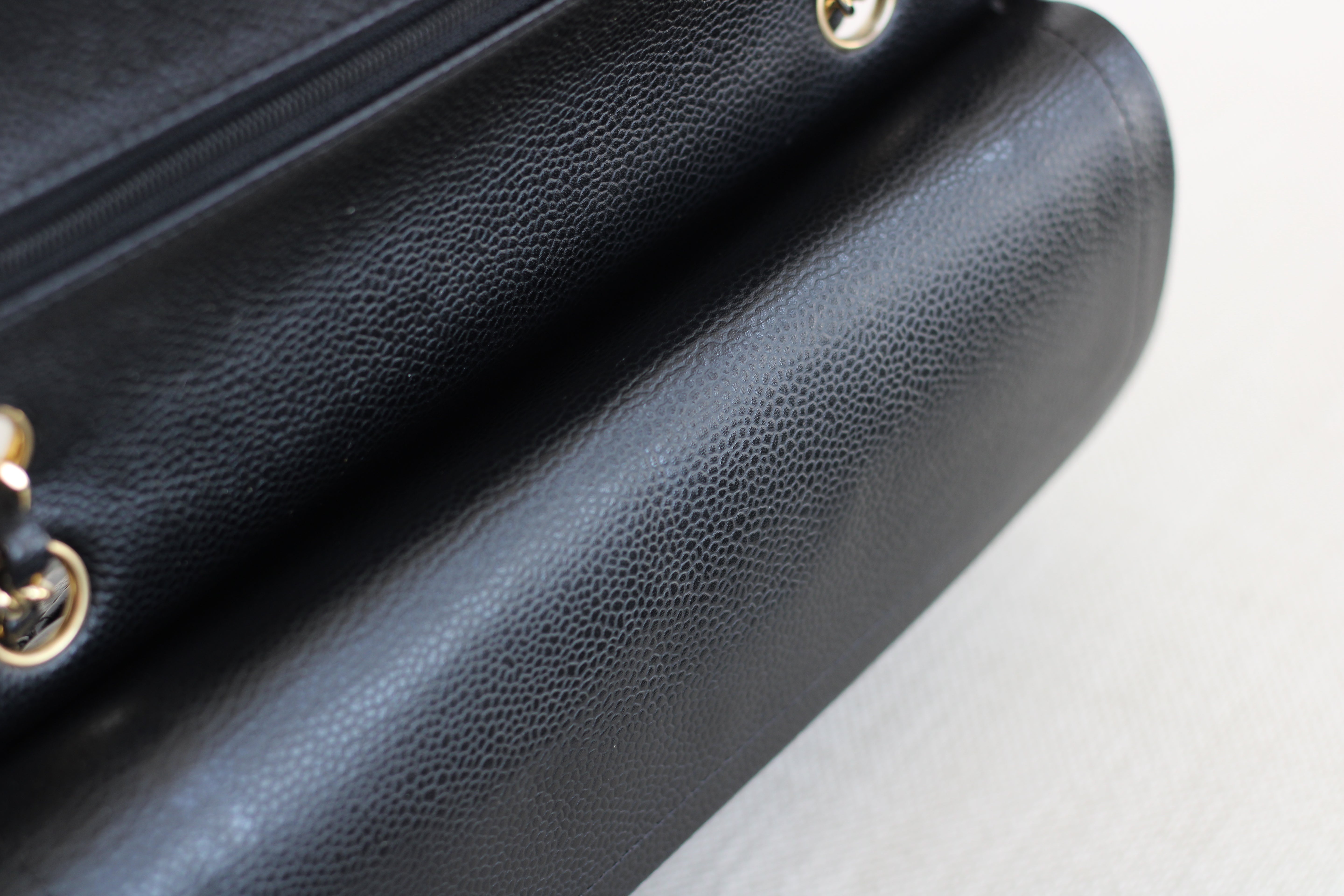 Good/Great Vintage Condition. Beautifully pebbly caviar leather complimented by a stunning sheen. Structure has softened and the bottom has some indents as pictured. Some slight tarnishing/scratches on CC hardware and some minor lightening on chain. Some corner wear.