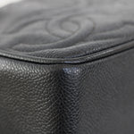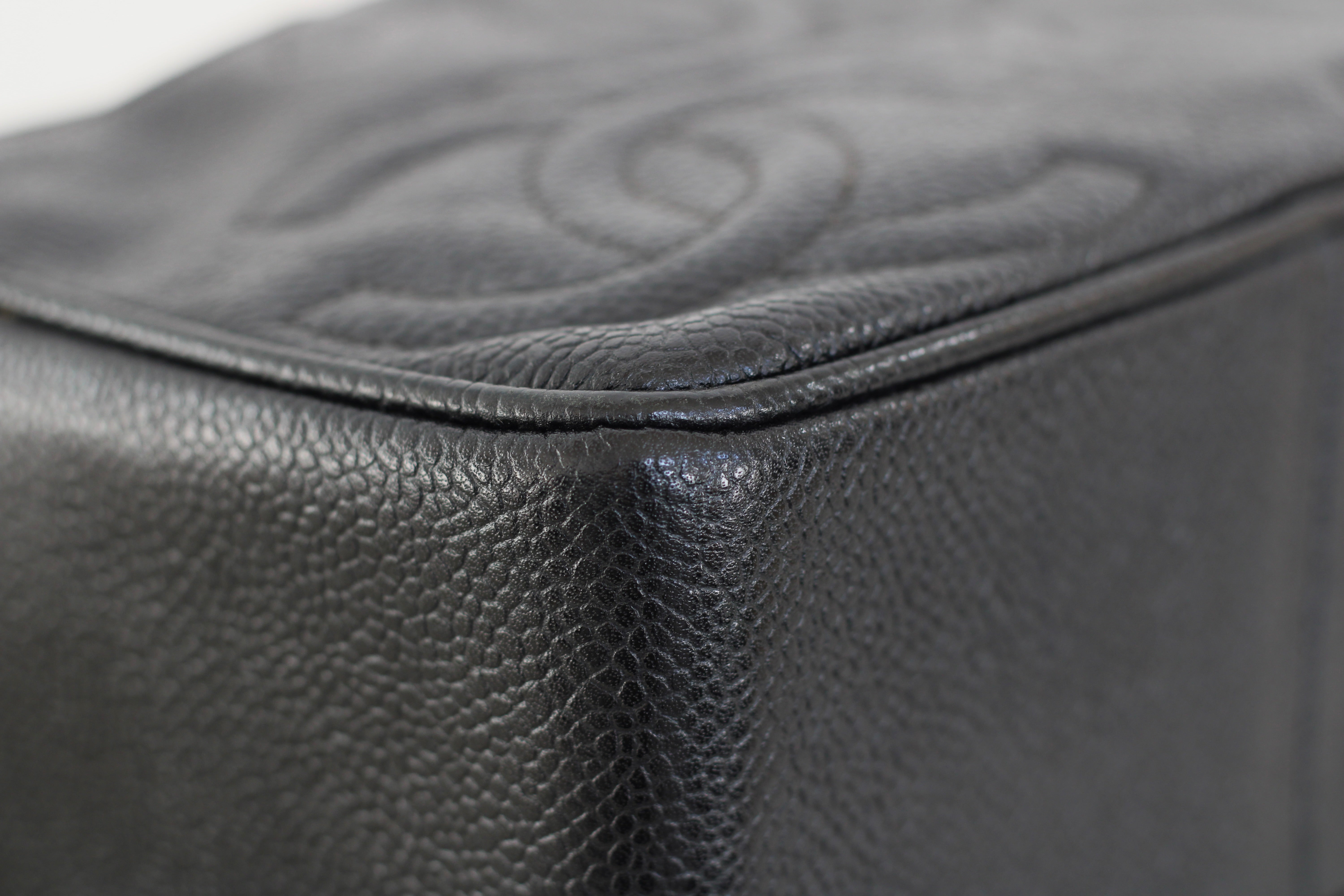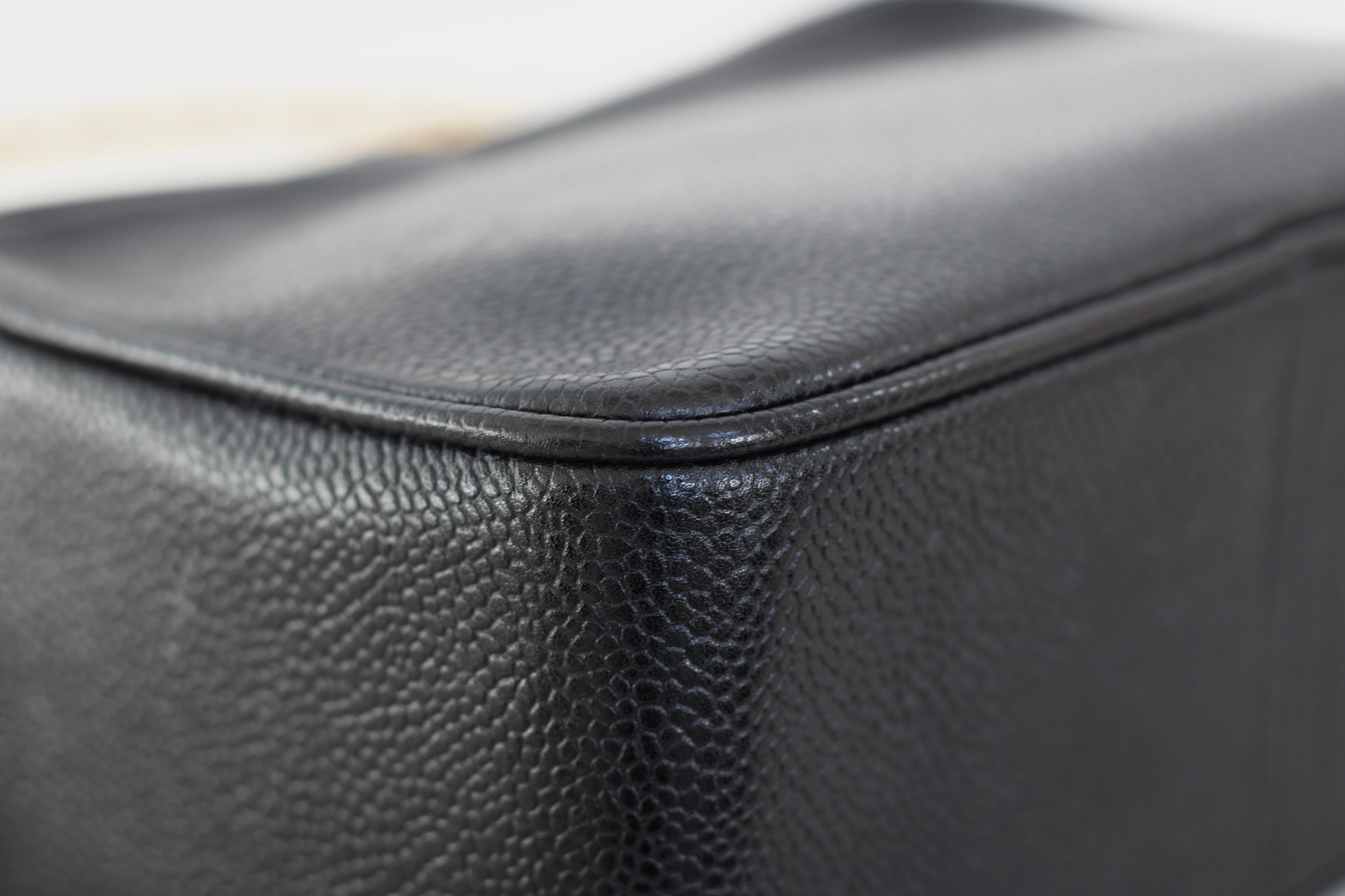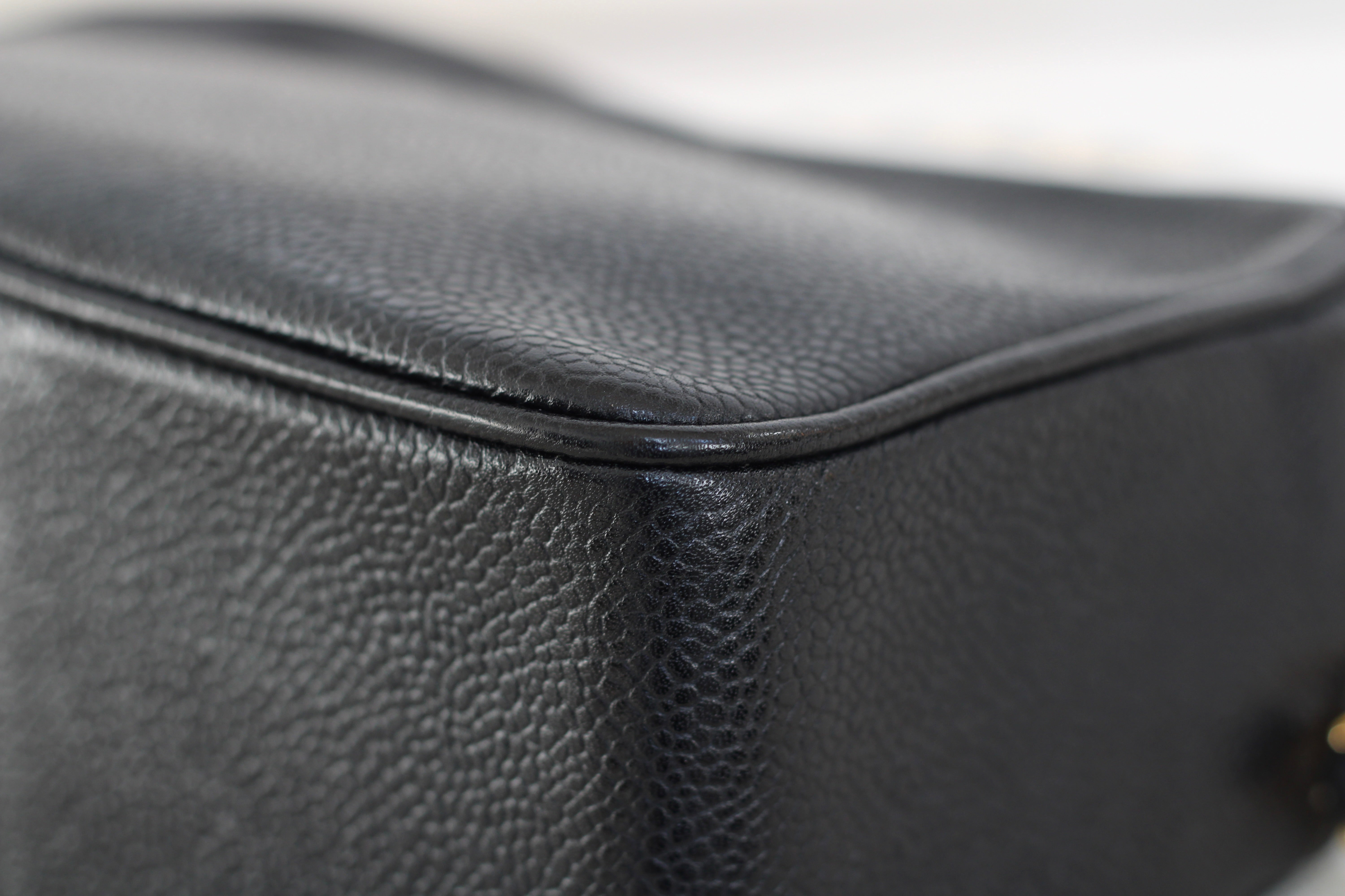 Excellent Vintage Condition. Beautifully pebbly caviar leather complimented by a stunning sheen. Back structure caves in slightly and corners have some wear as pictured. Gorgeous 24k gold hardware with hairline scratches.