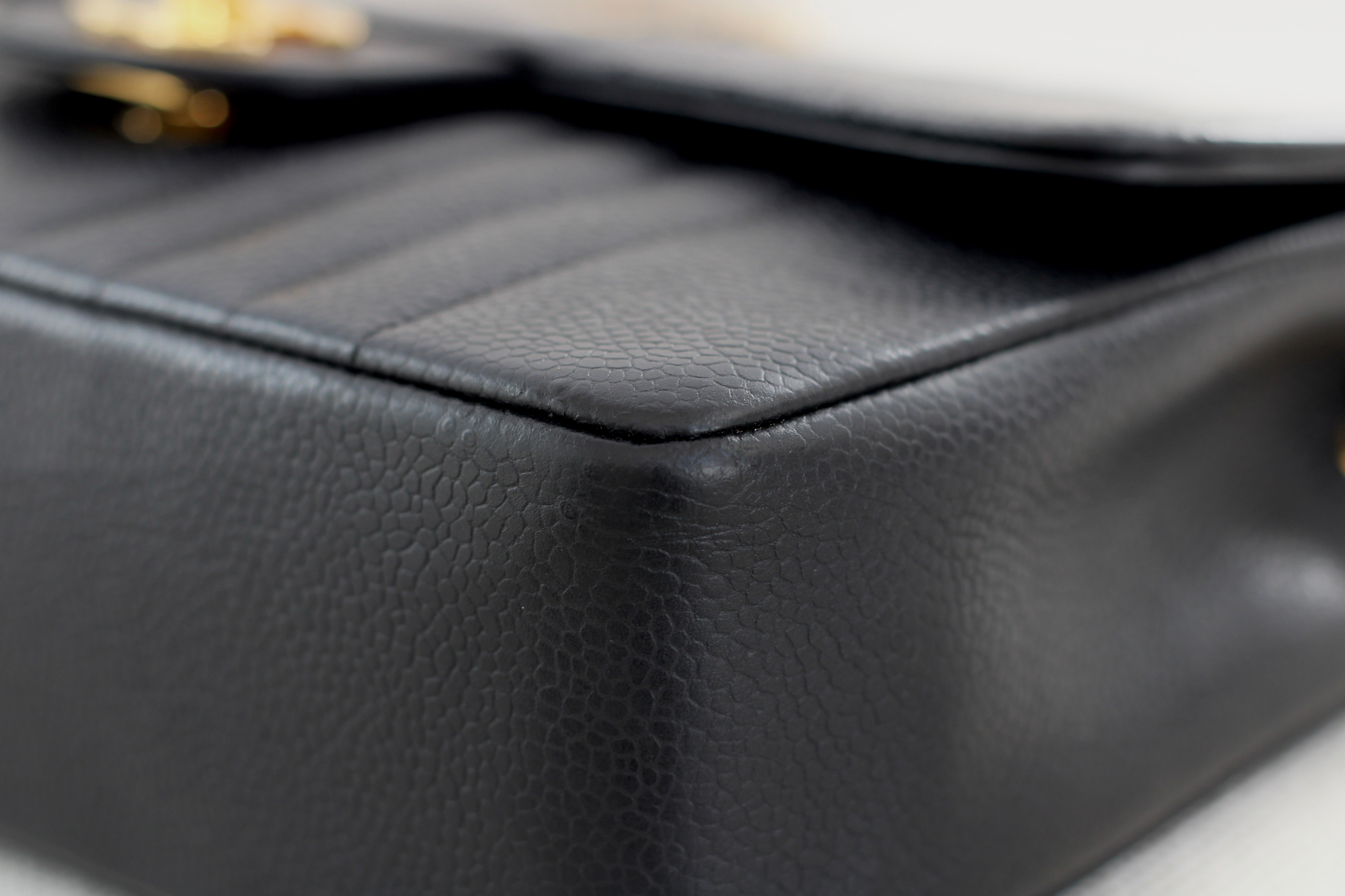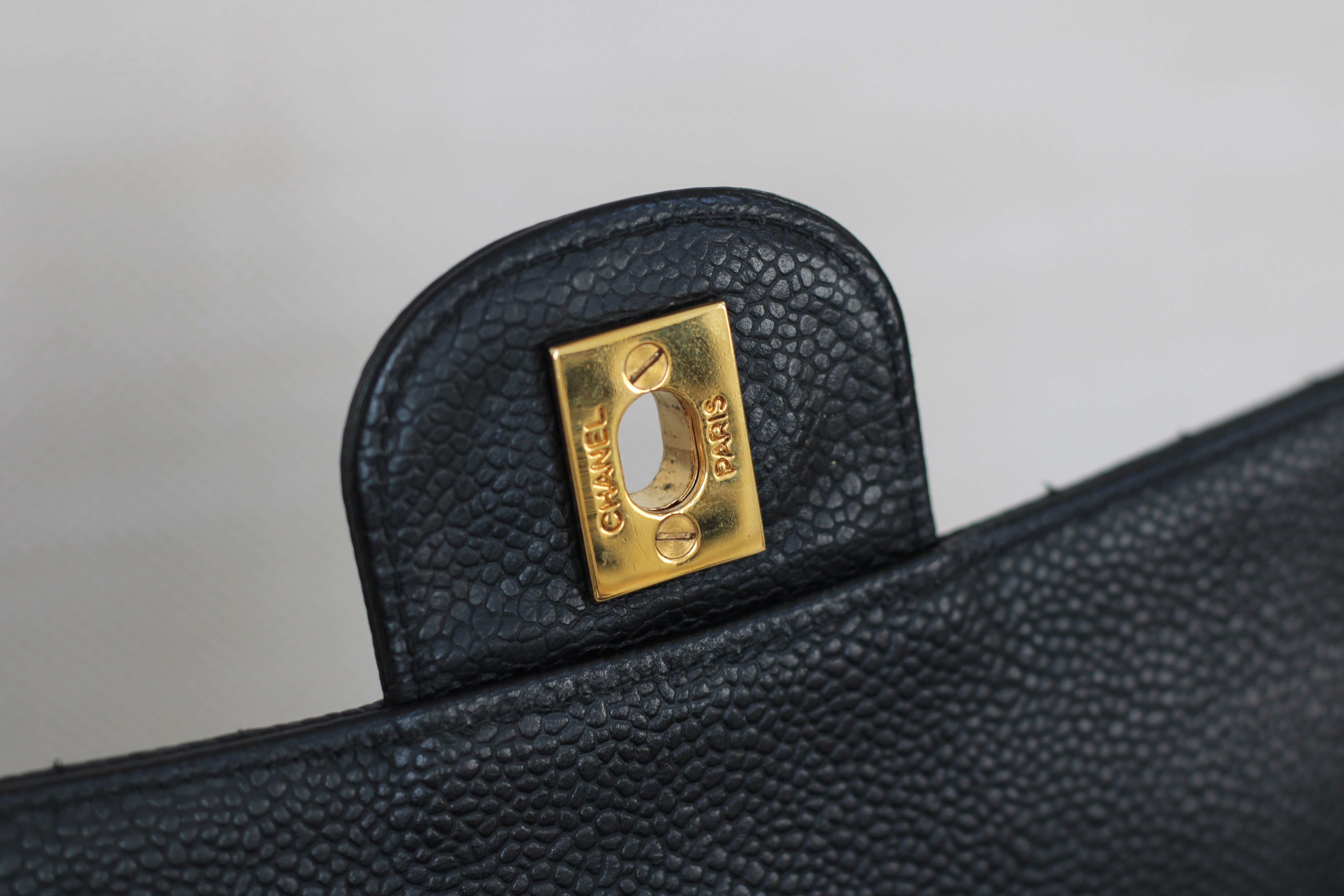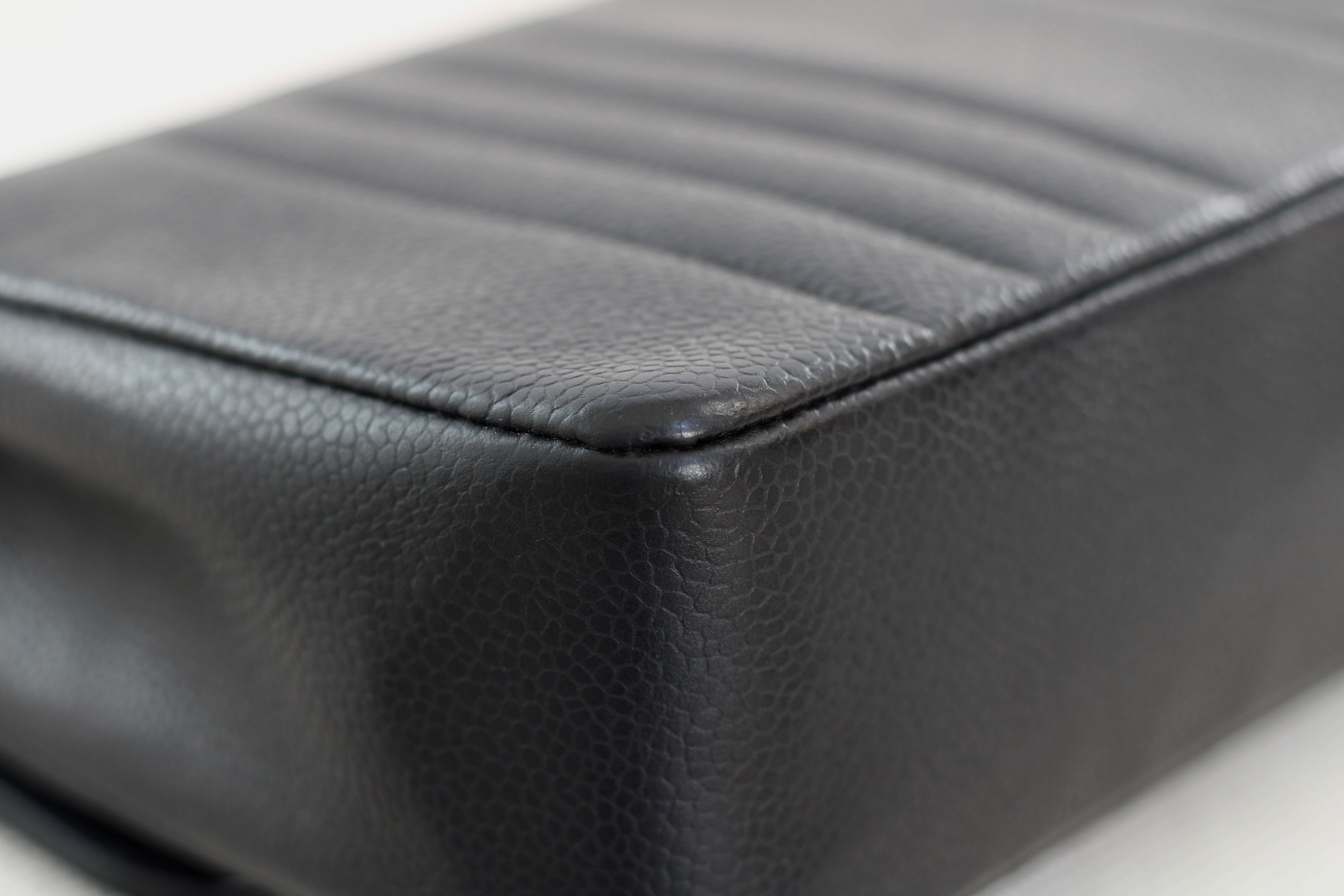 Excellent Vintage Condition. Excellent structure and some light wear on corners. Stunning pebbly caviar leather and brilliant 24k gold hardware with fine hairline scratches. No Hologram.