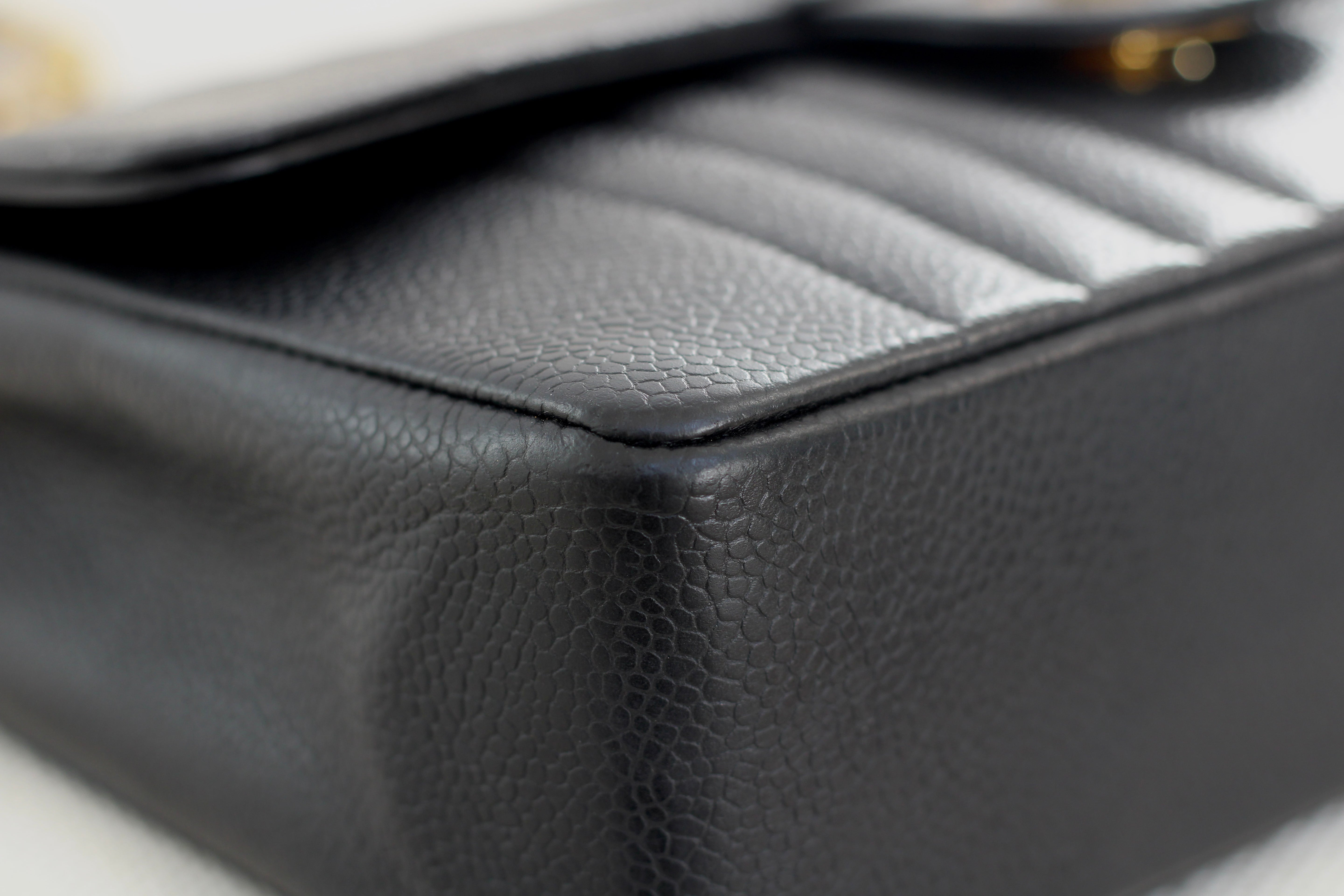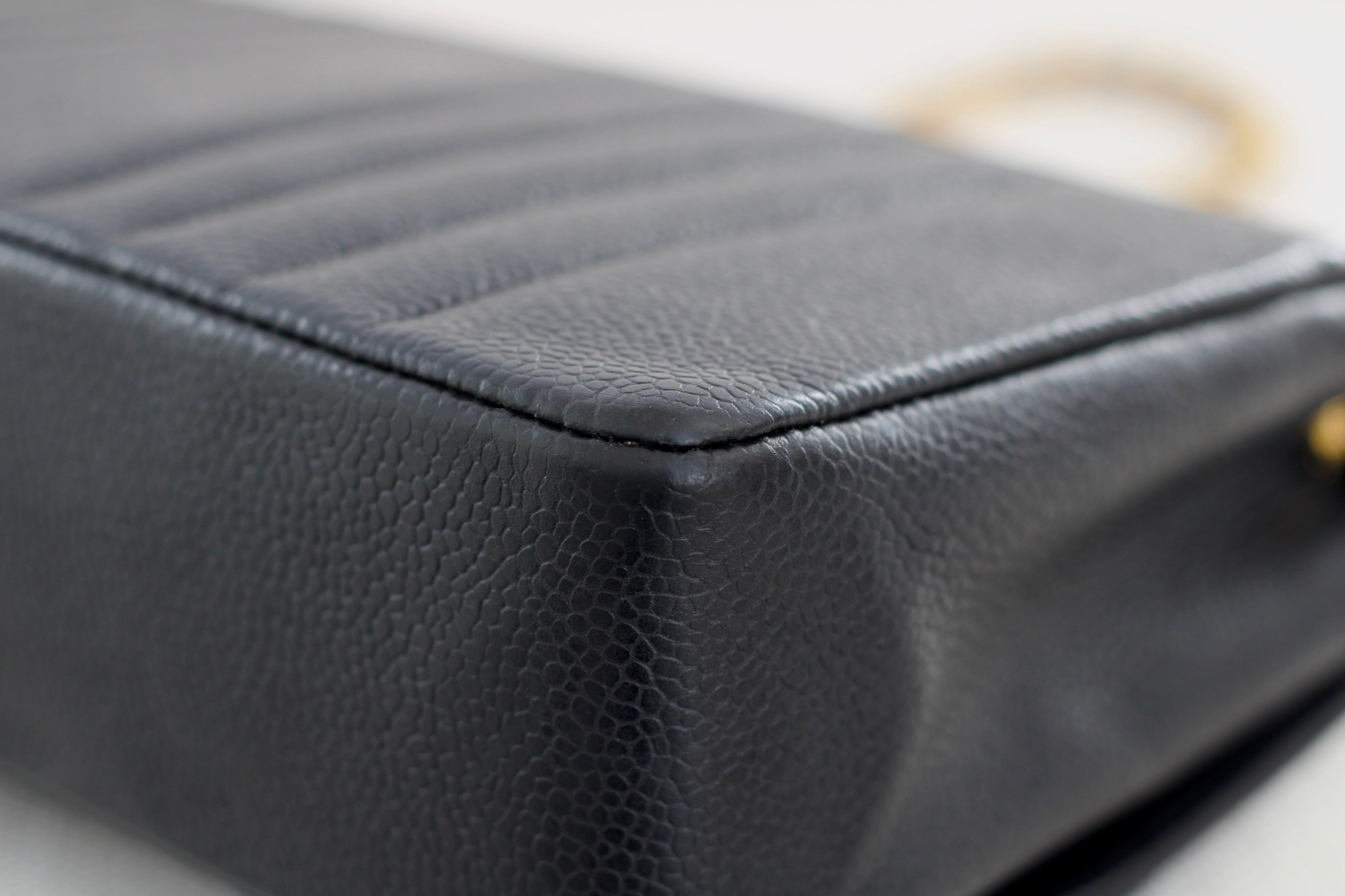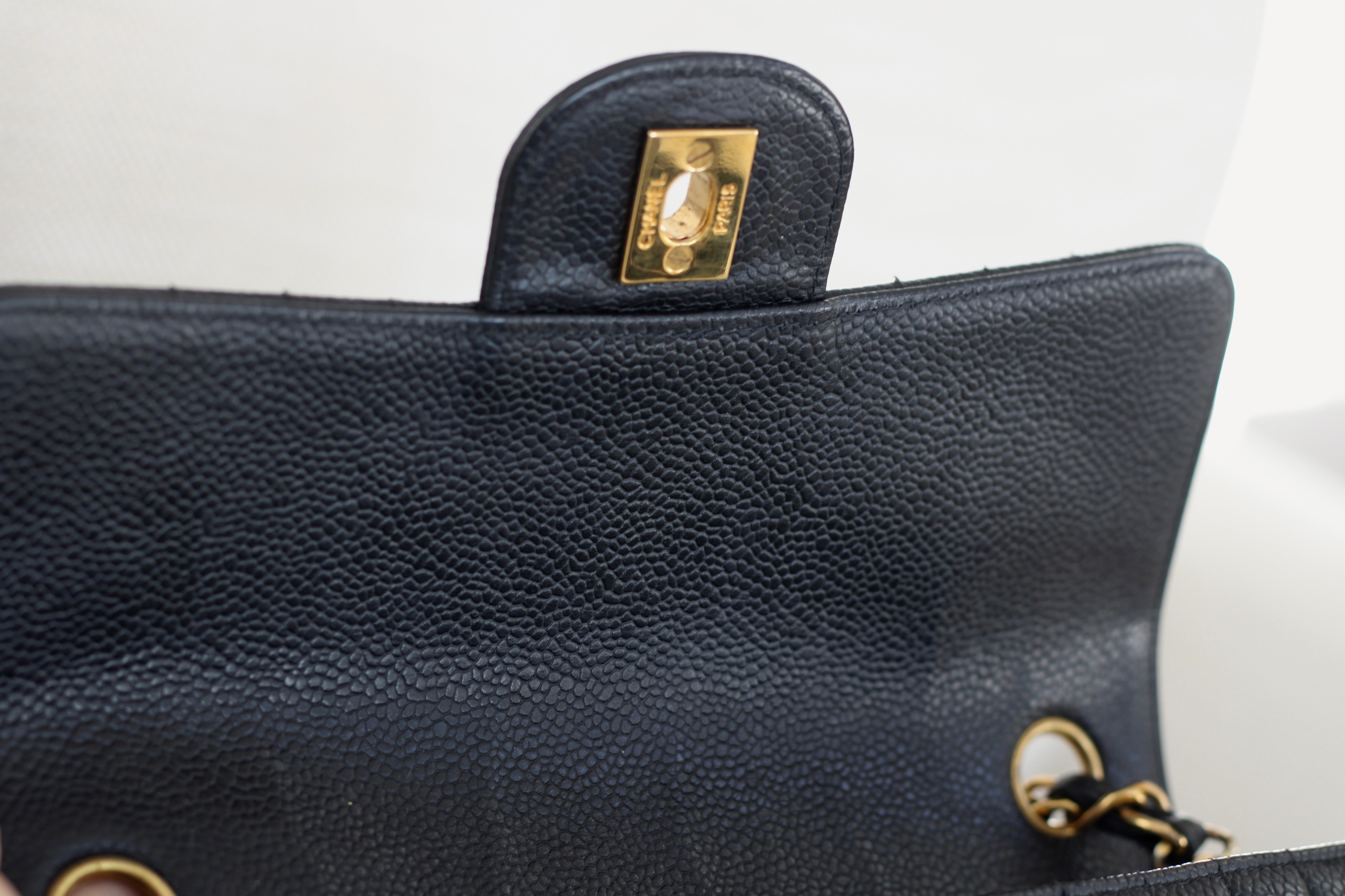 Excellent Vintage Condition. Excellent structure and some light wear on corners. Stunning pebbly caviar leather and brilliant 24k gold hardware with fine hairline scratches. No Hologram.