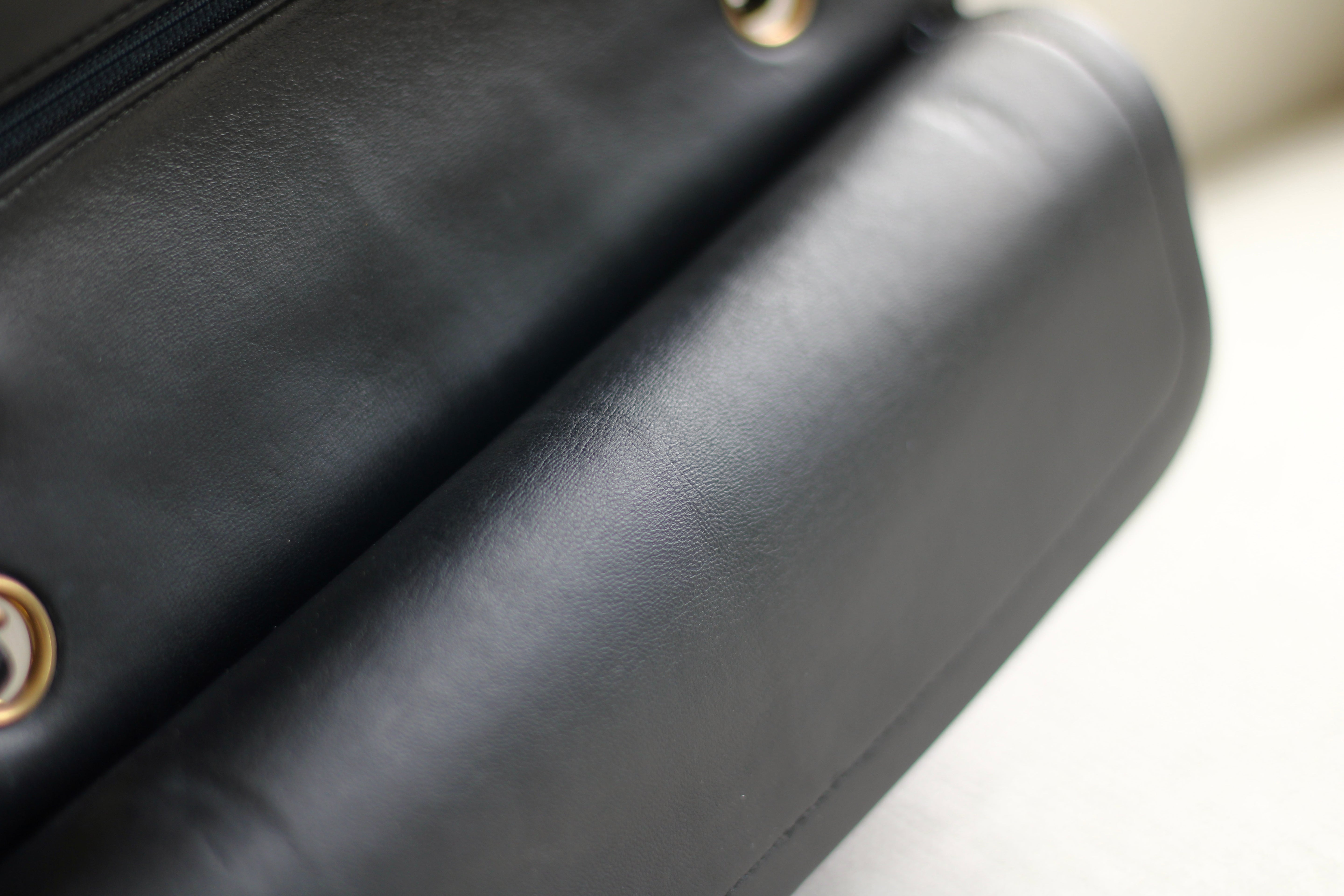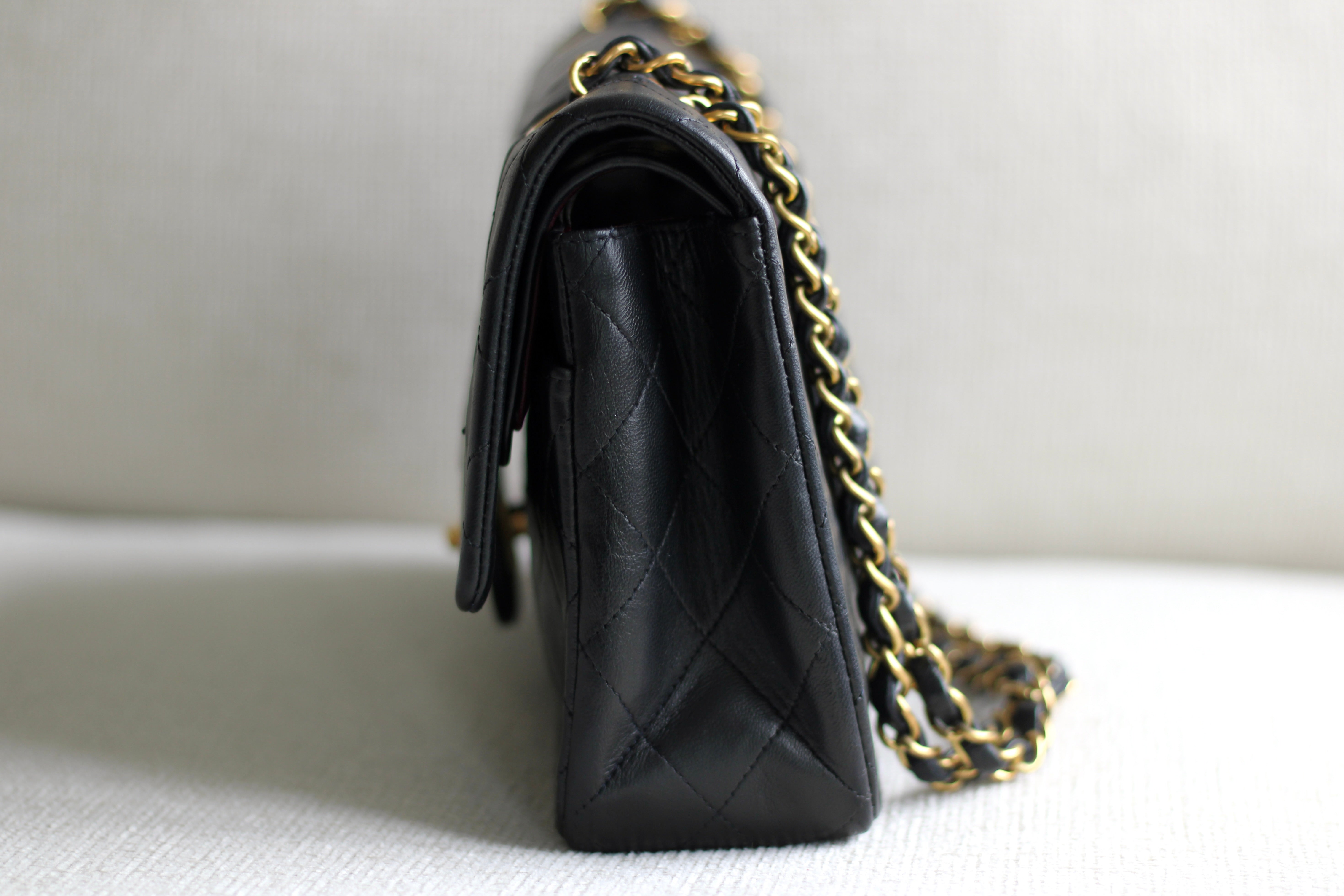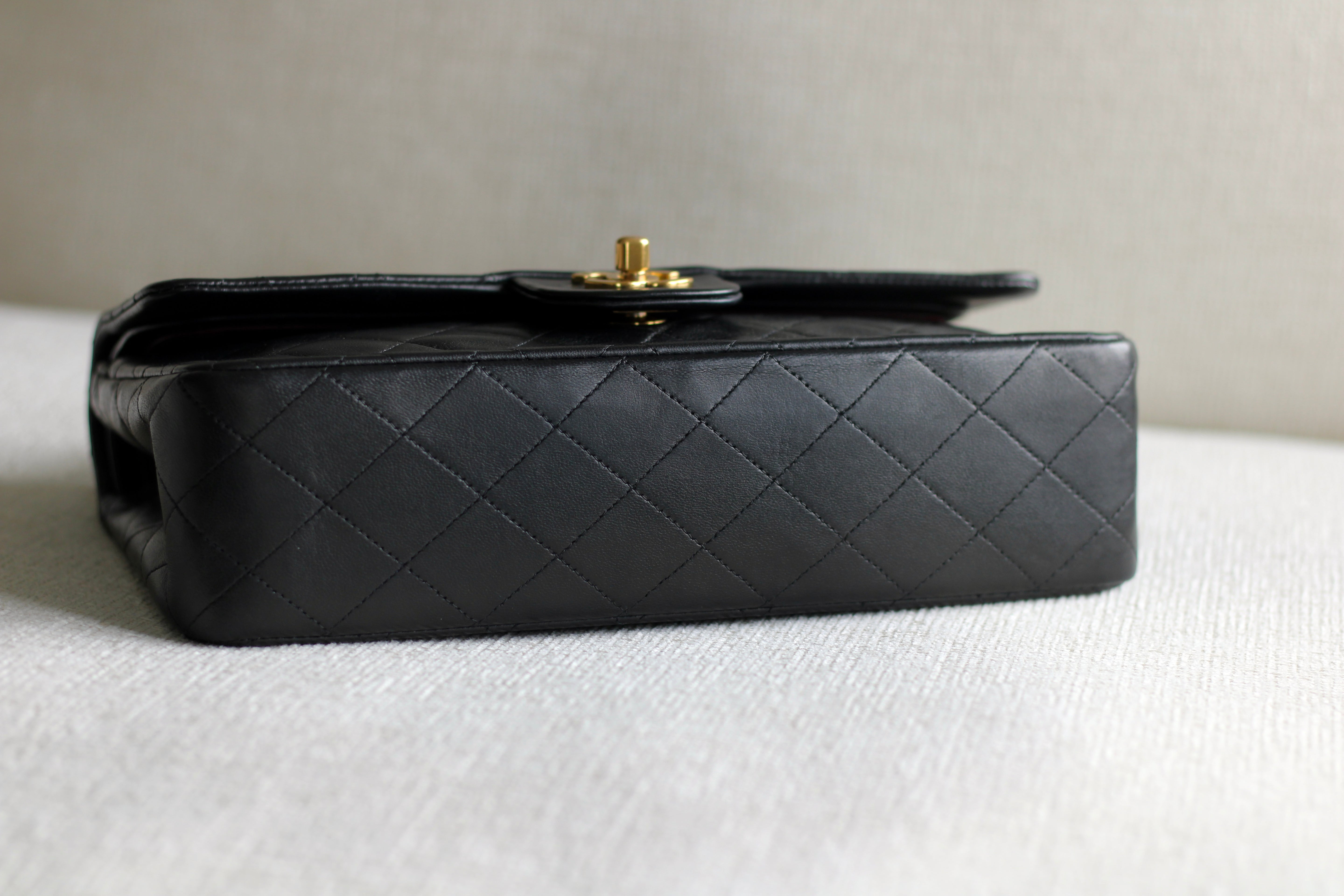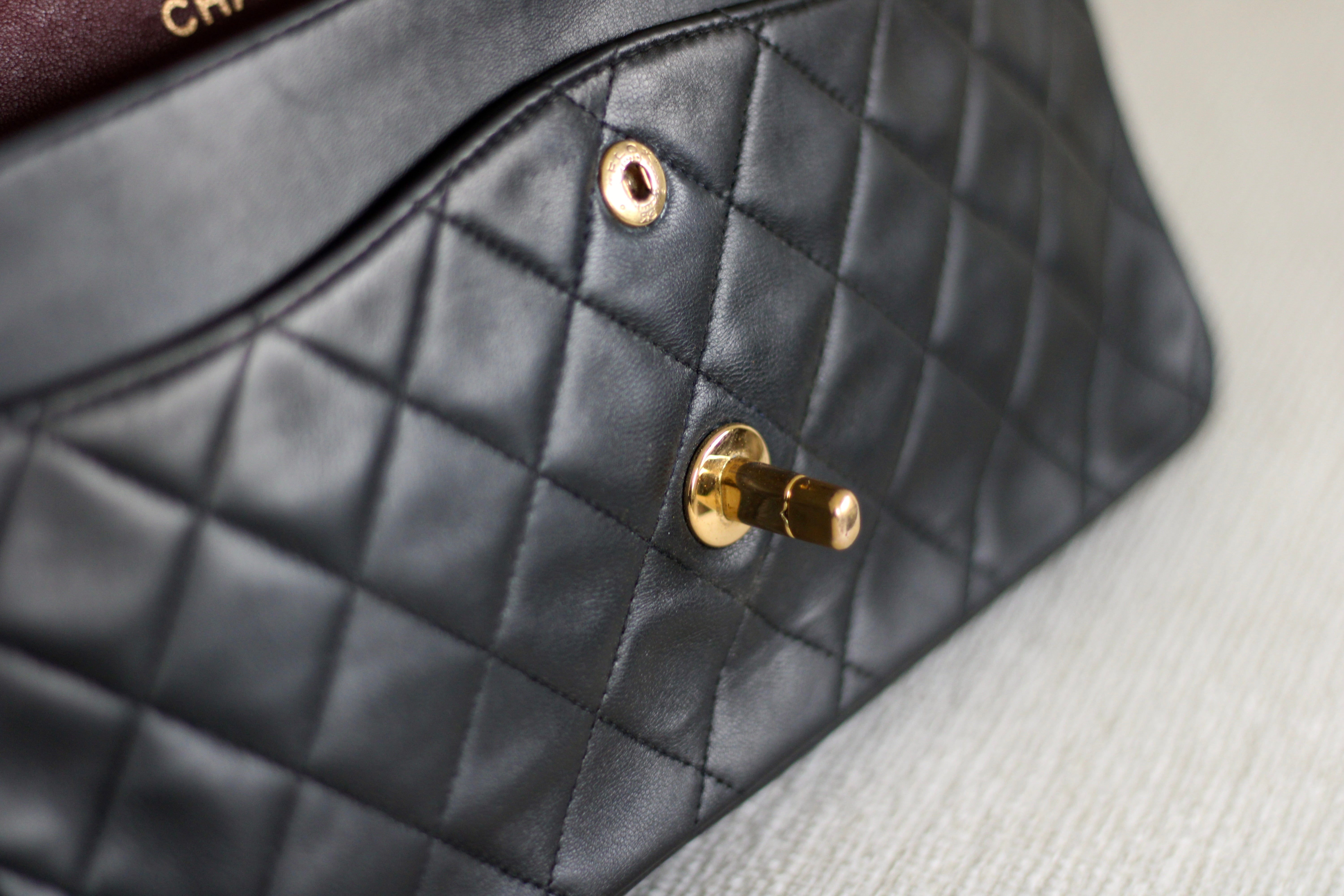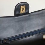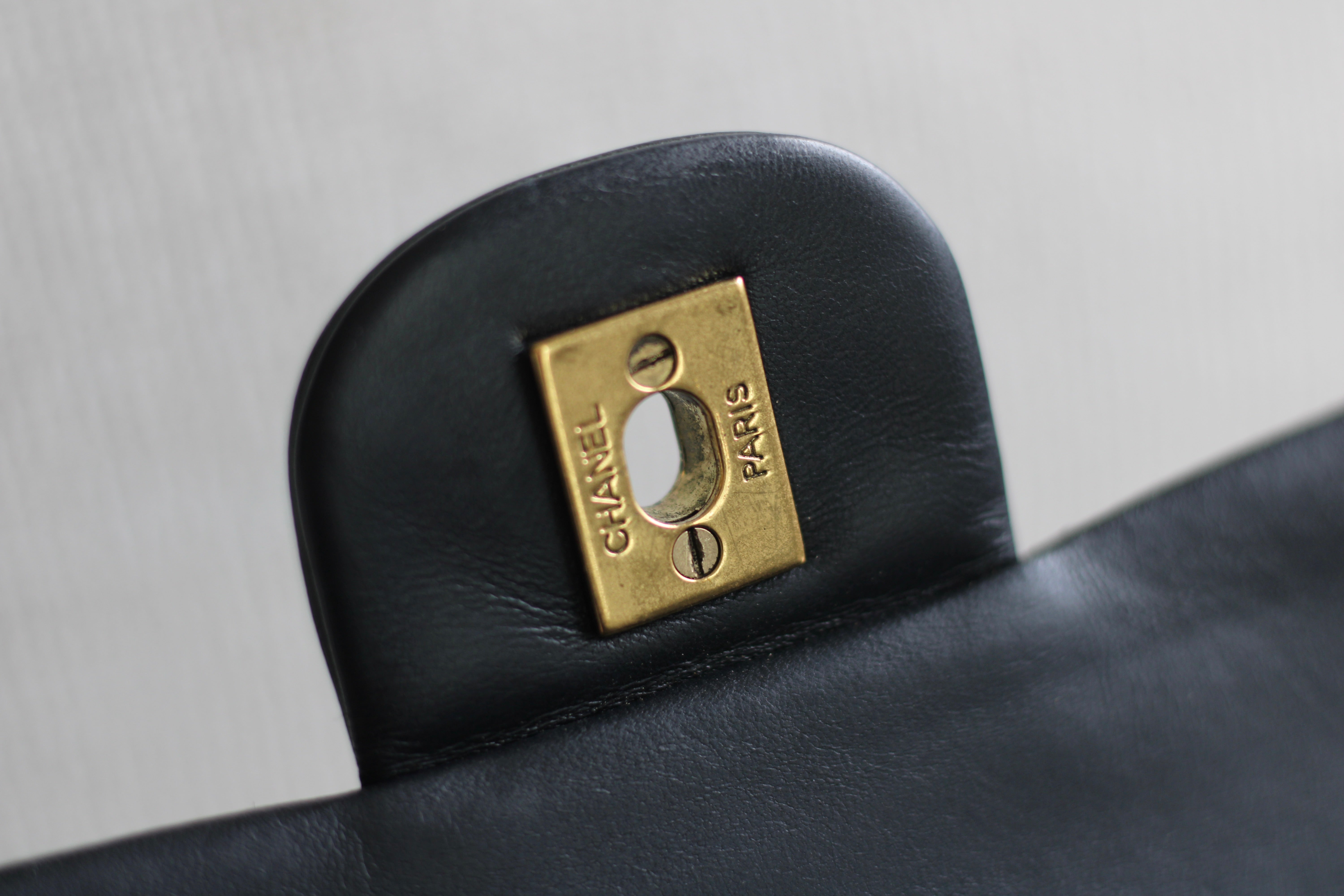 Great Vintage Condition. Gorgeous dark navy but appears as black lambskin leather complimented by stunning 24k gold hardware. A crease along bottom of the front side. Some light tarnishing on male part of turnlock and a tiny scuff on front right side. Interior has a vintage leather scent.
