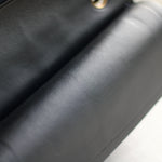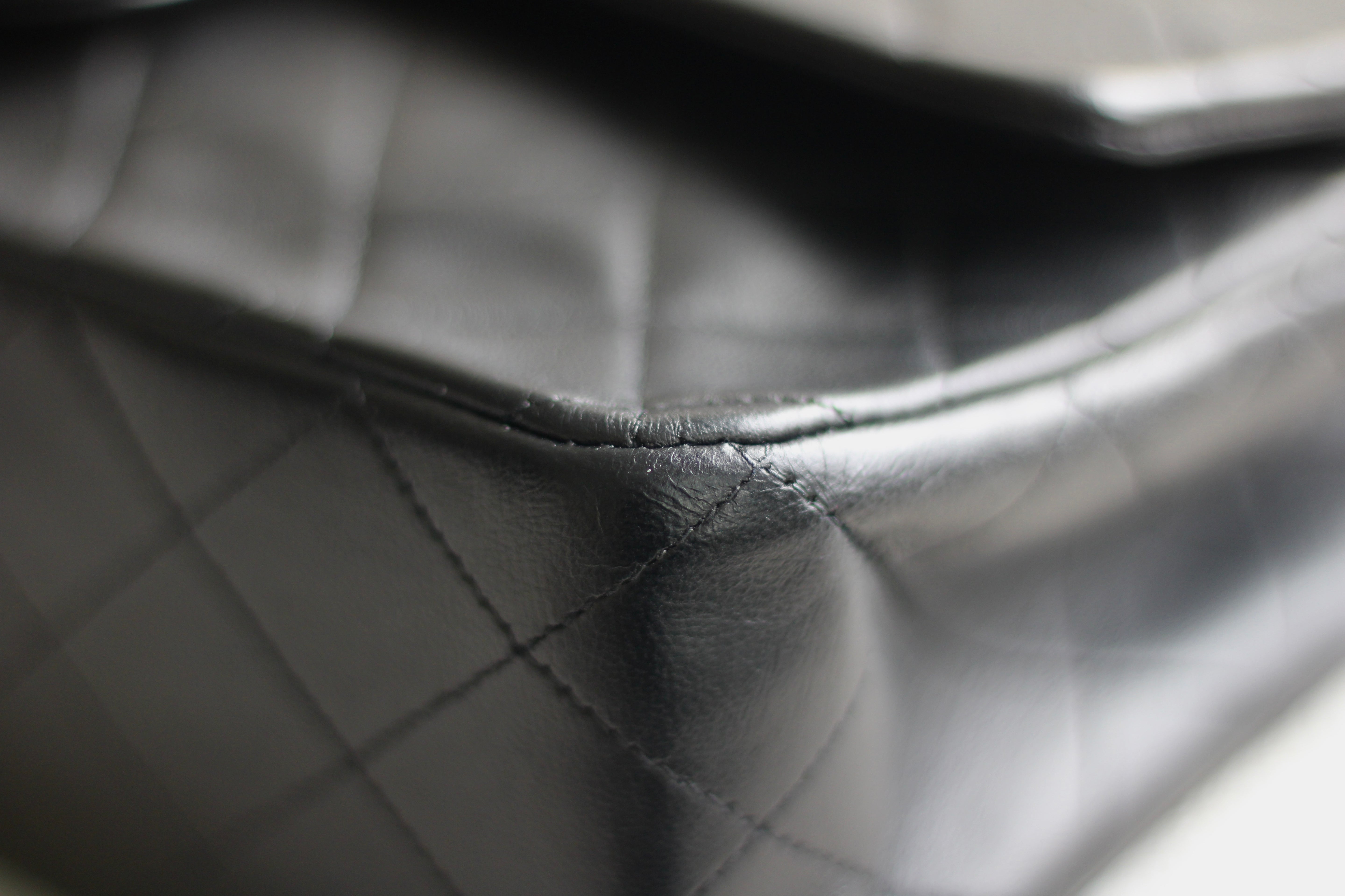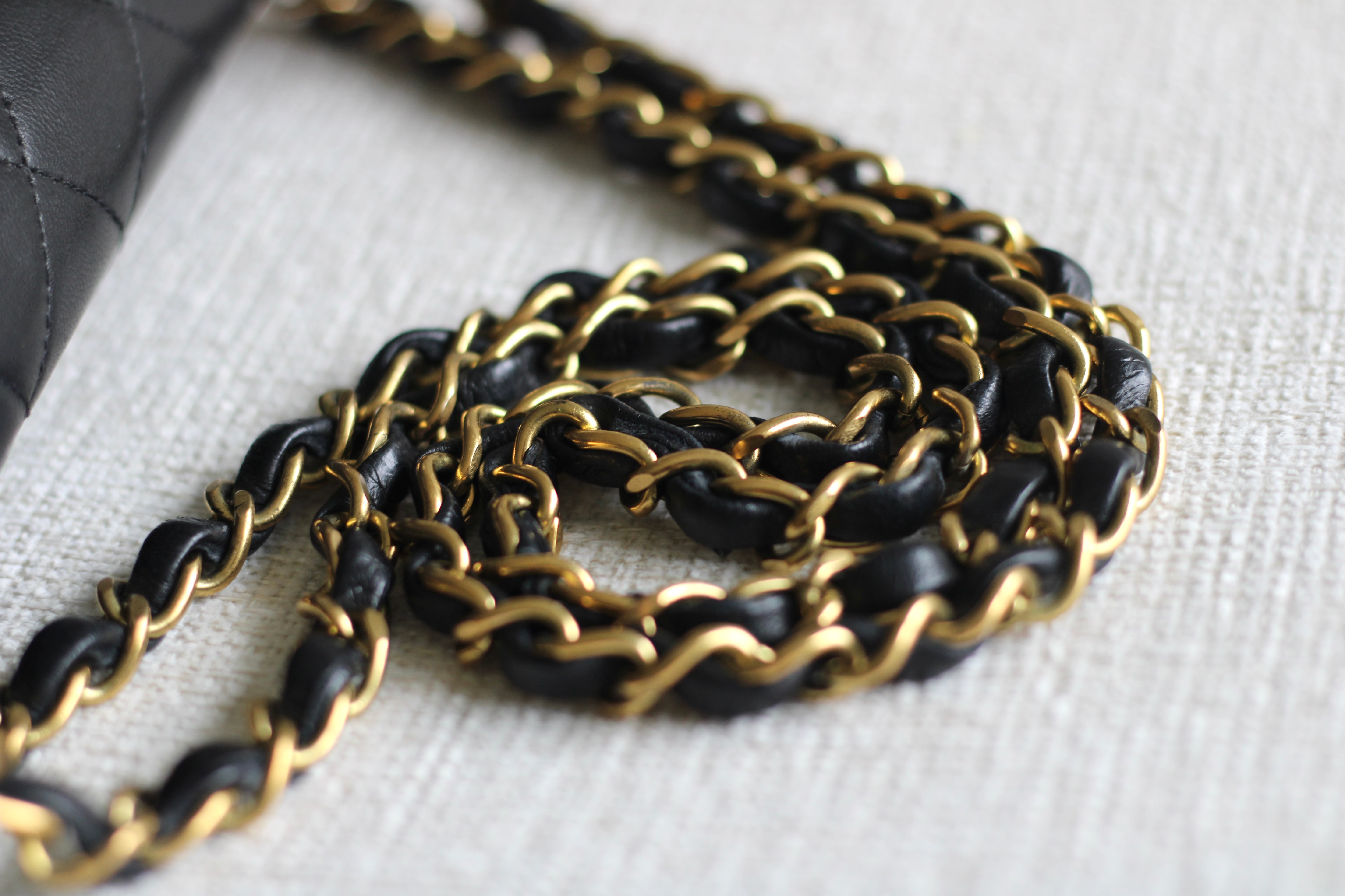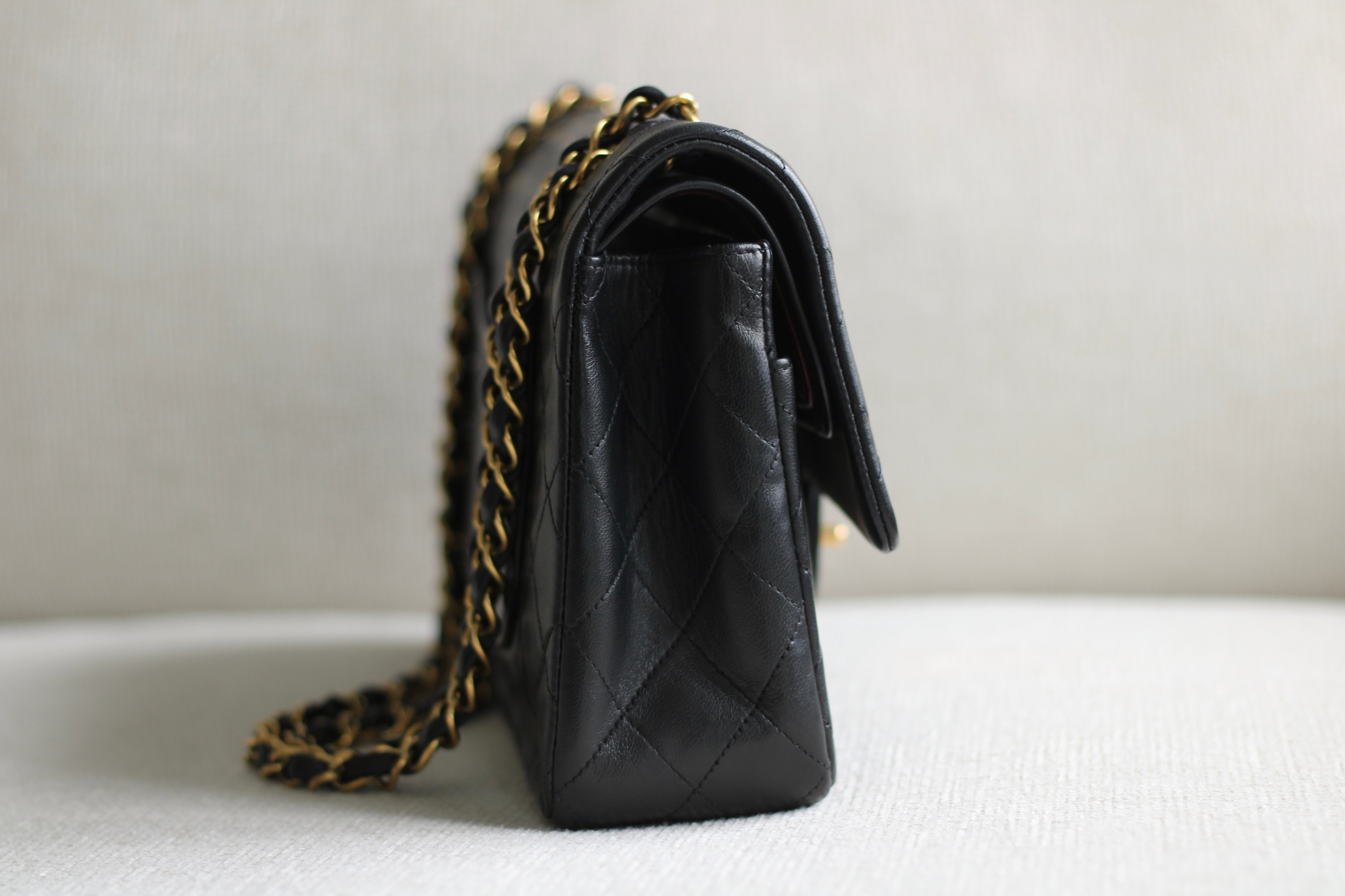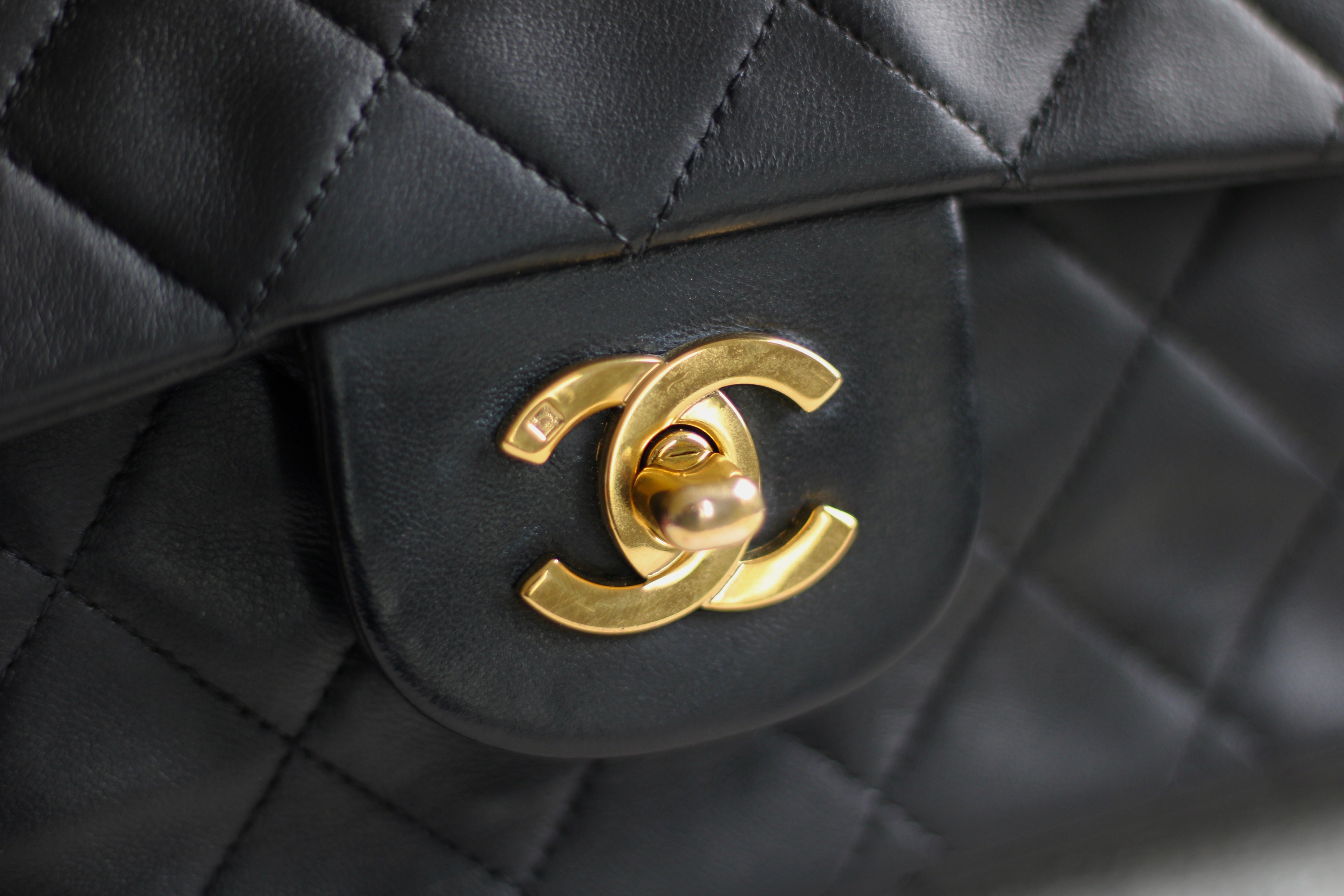 Great Vintage Condition. Gorgeous dark navy but appears as black lambskin leather complimented by stunning 24k gold hardware. A crease along bottom of the front side. Some light tarnishing on male part of turnlock and a tiny scuff on front right side. Interior has a vintage leather scent.