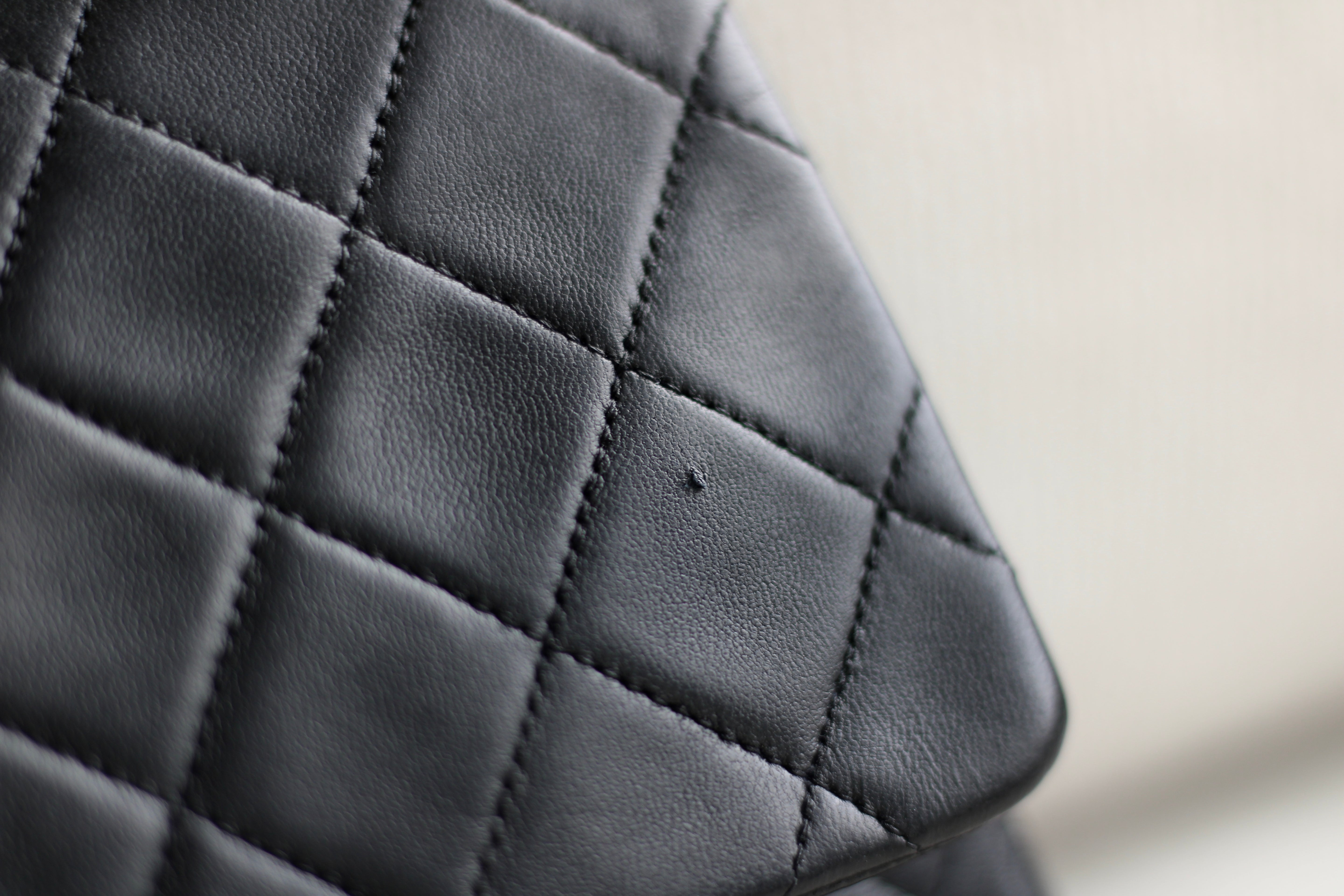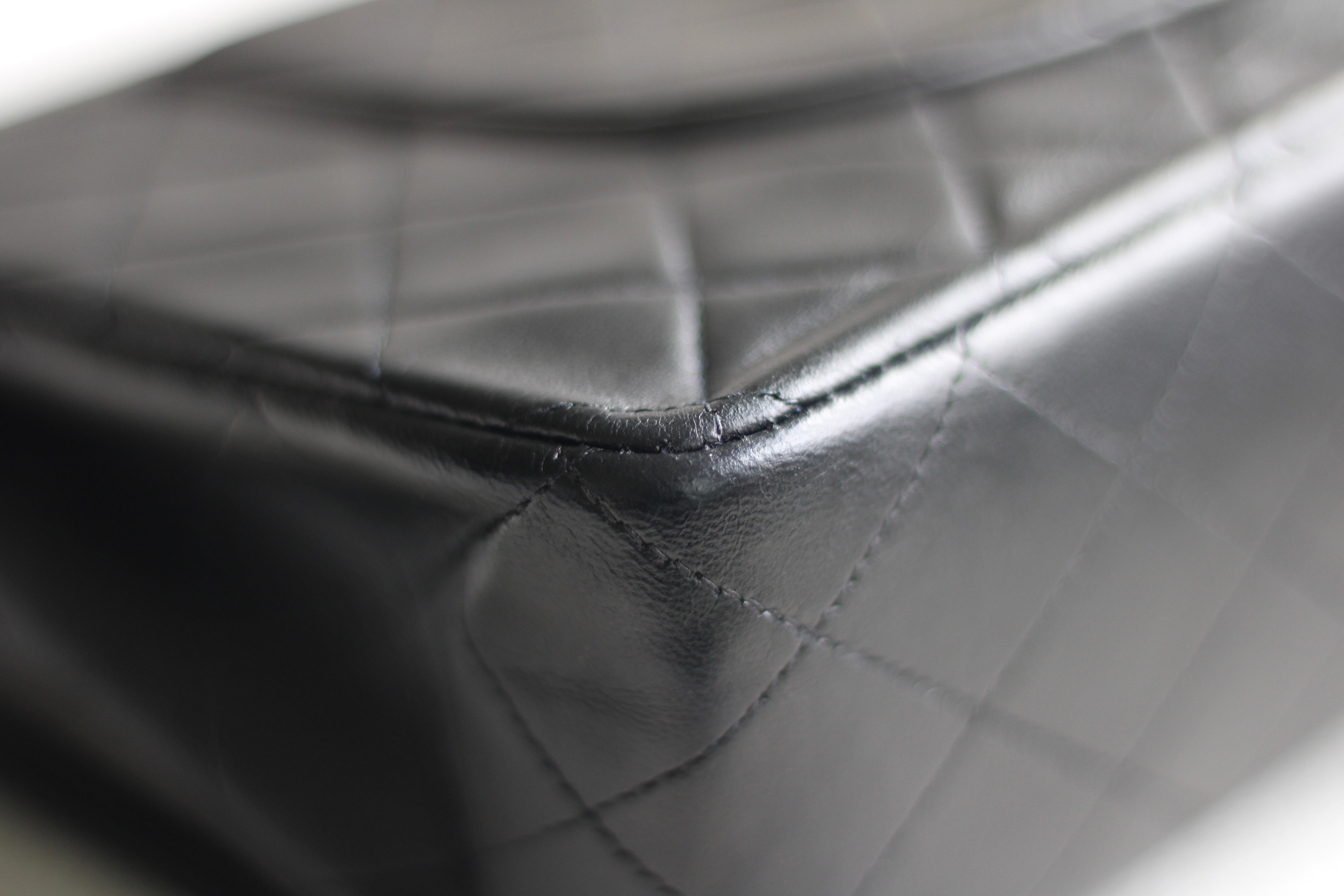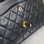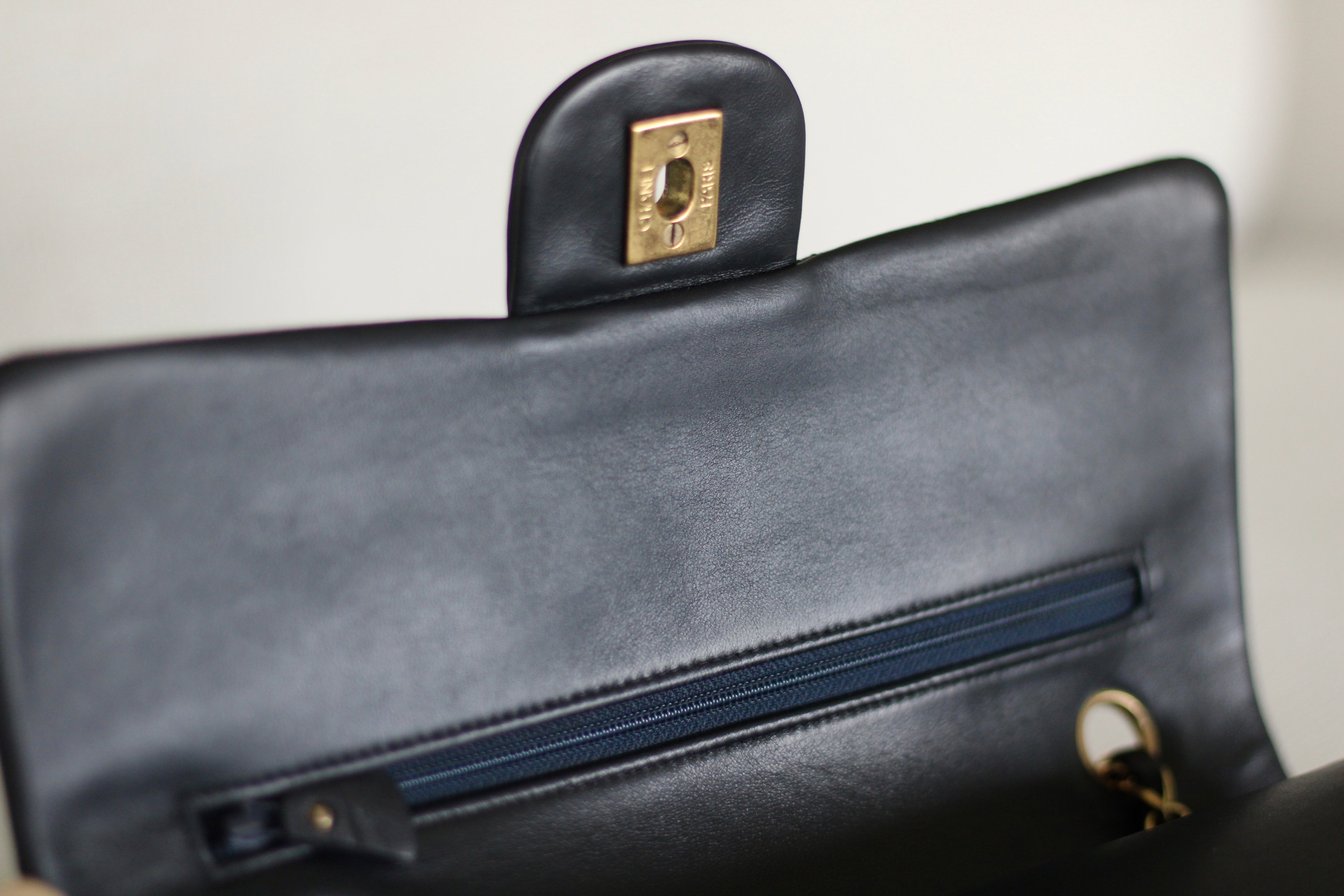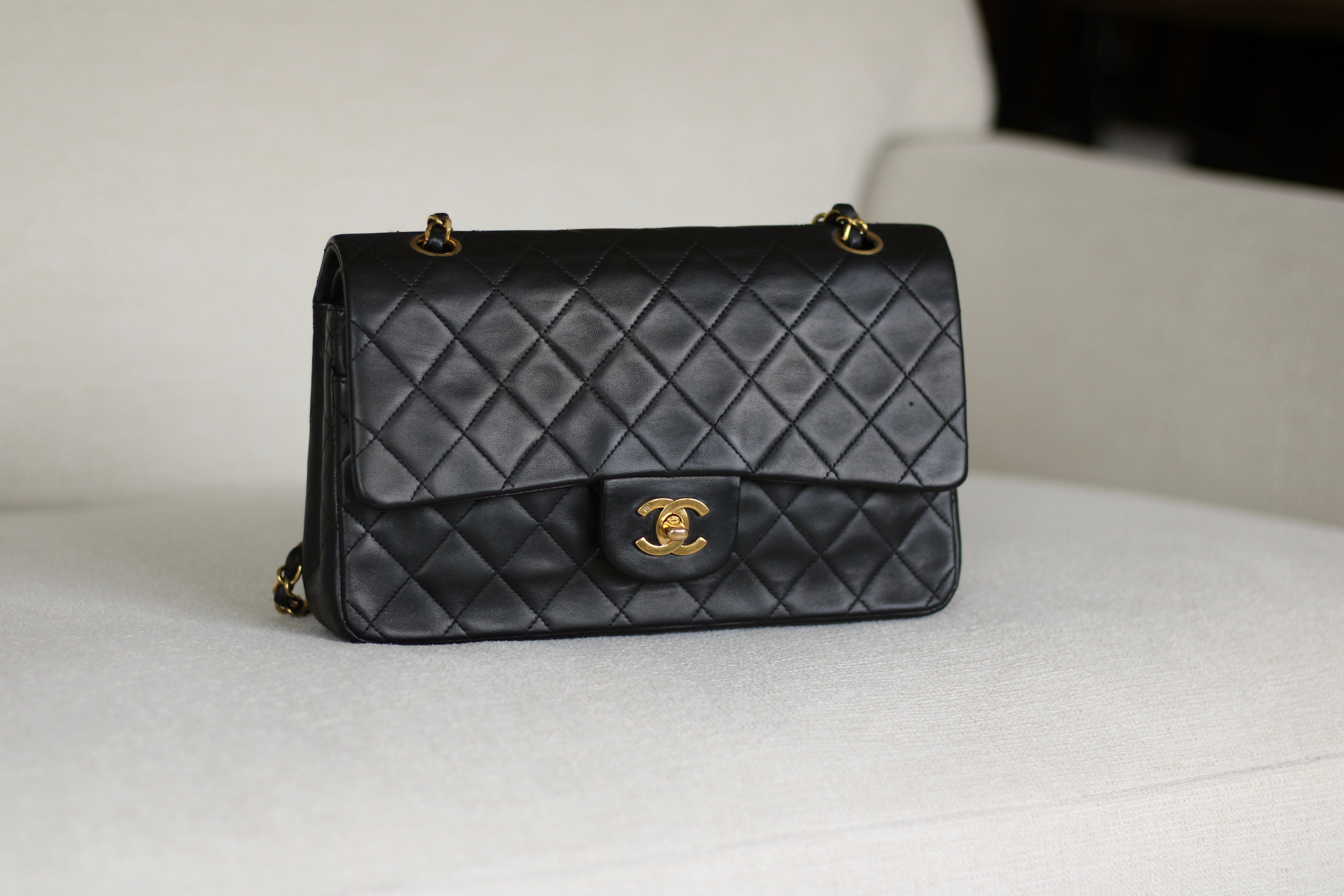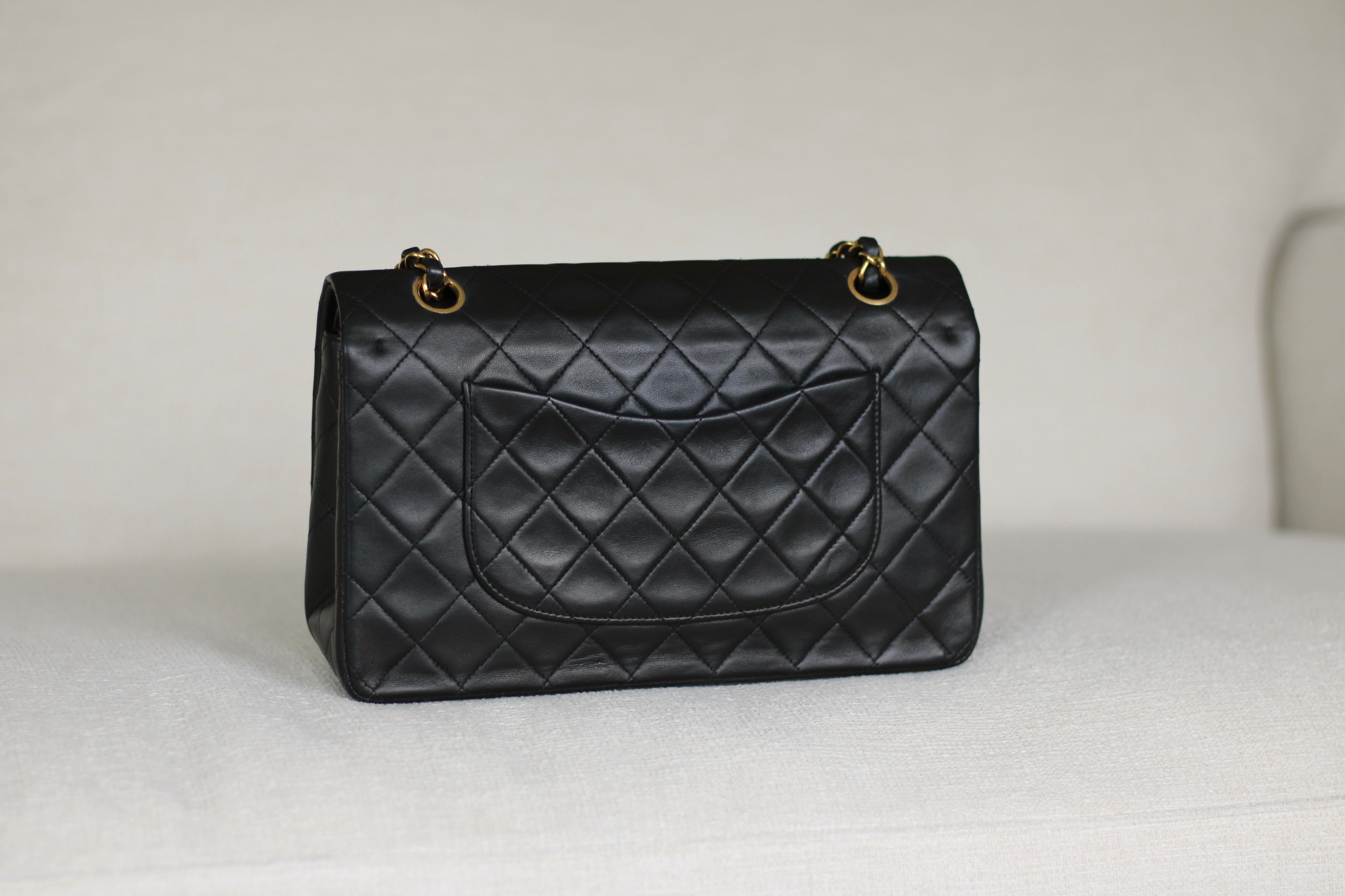 Great Vintage Condition. Gorgeous dark navy but appears as black lambskin leather complimented by stunning 24k gold hardware. A crease along bottom of the front side. Some light tarnishing on male part of turnlock and a tiny scuff on front right side. Interior has a vintage leather scent.