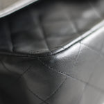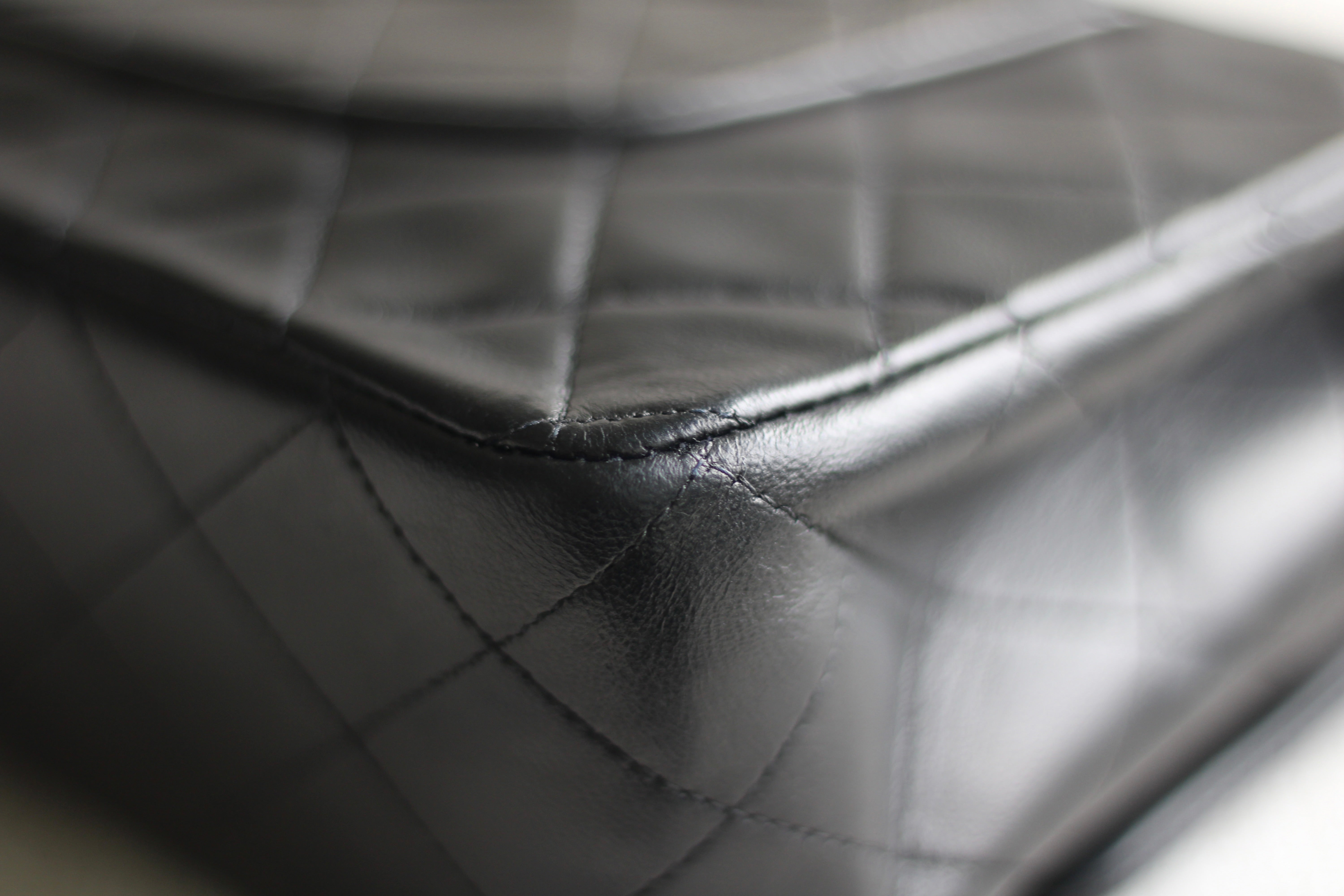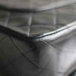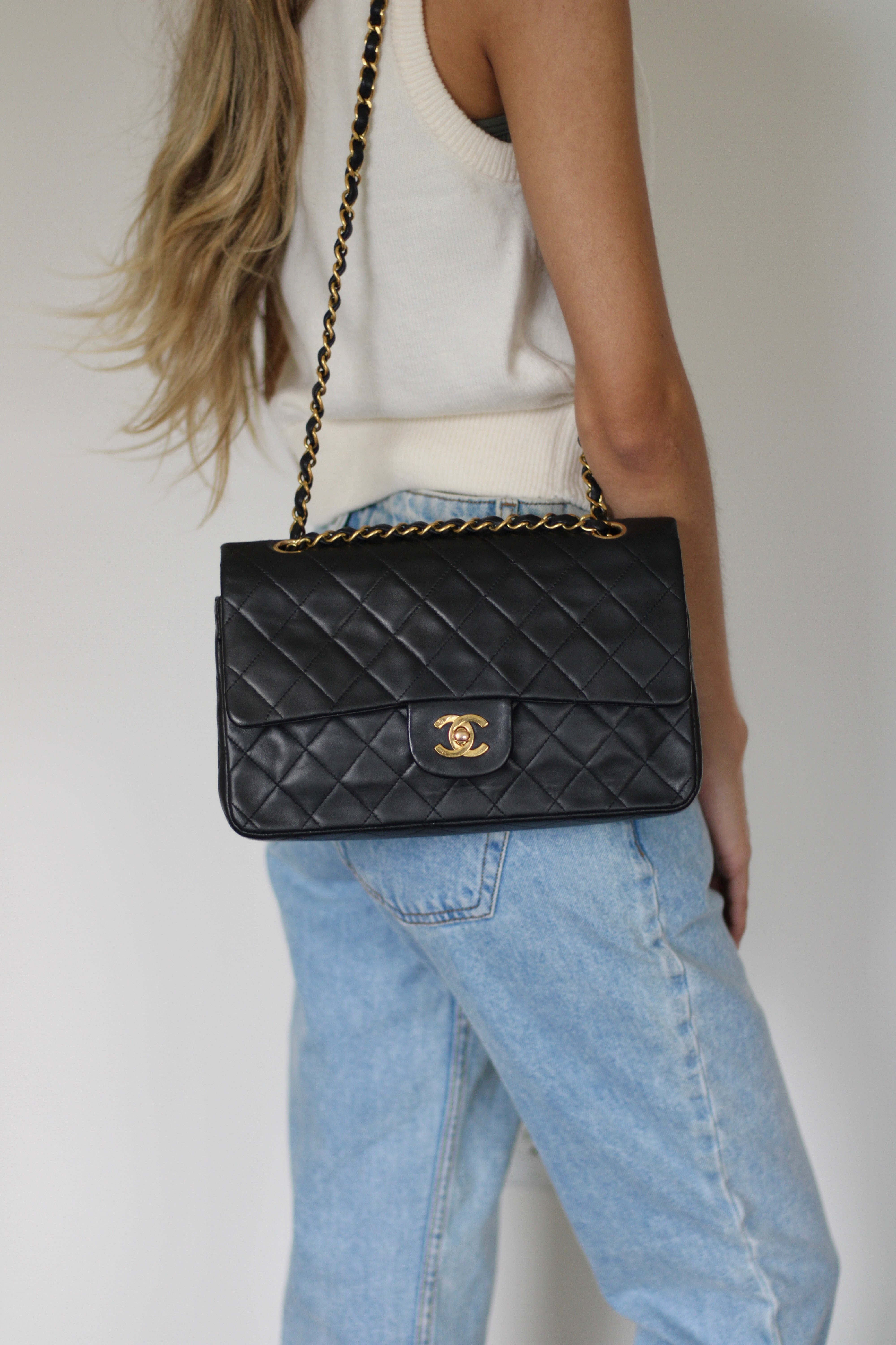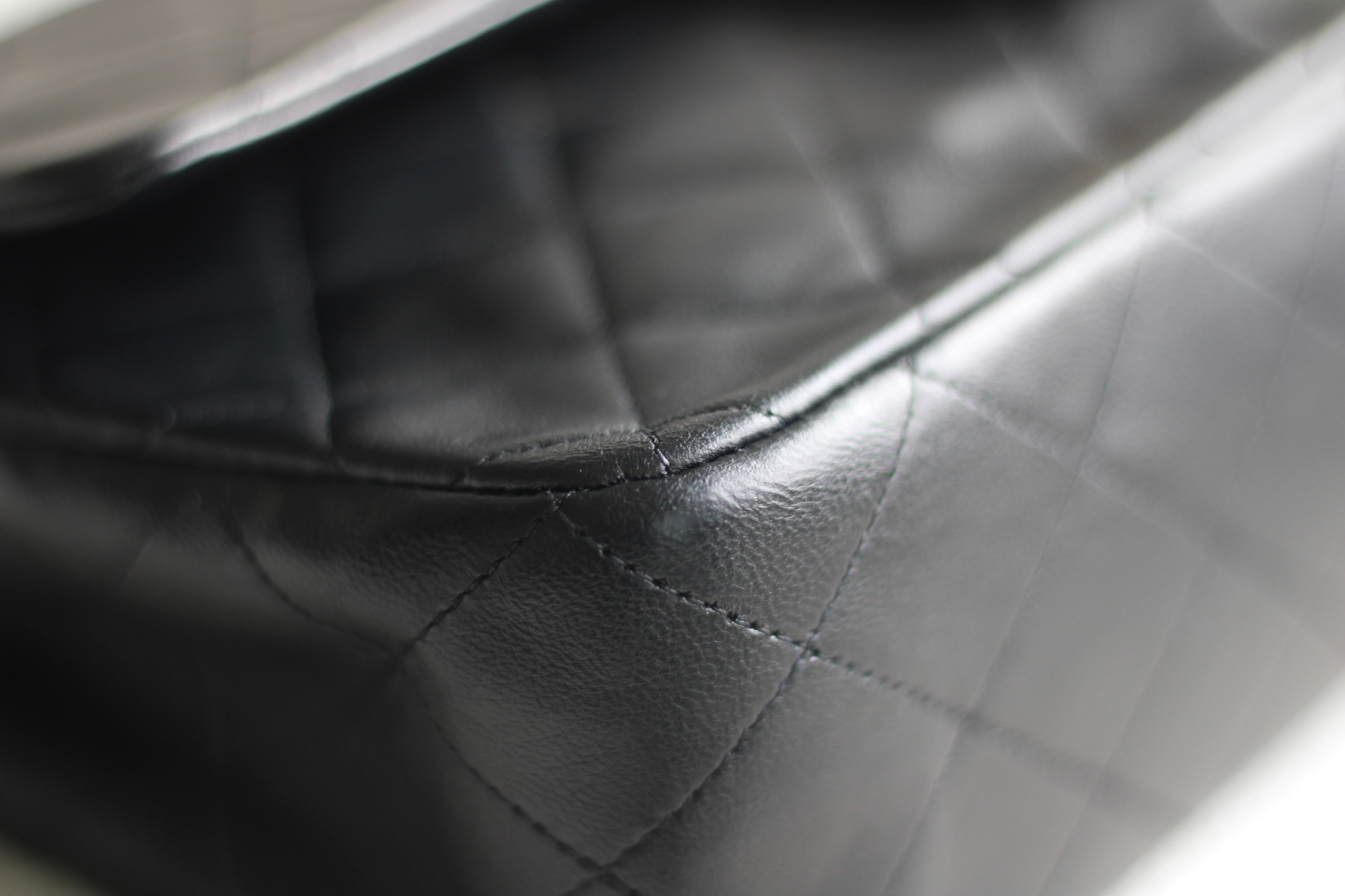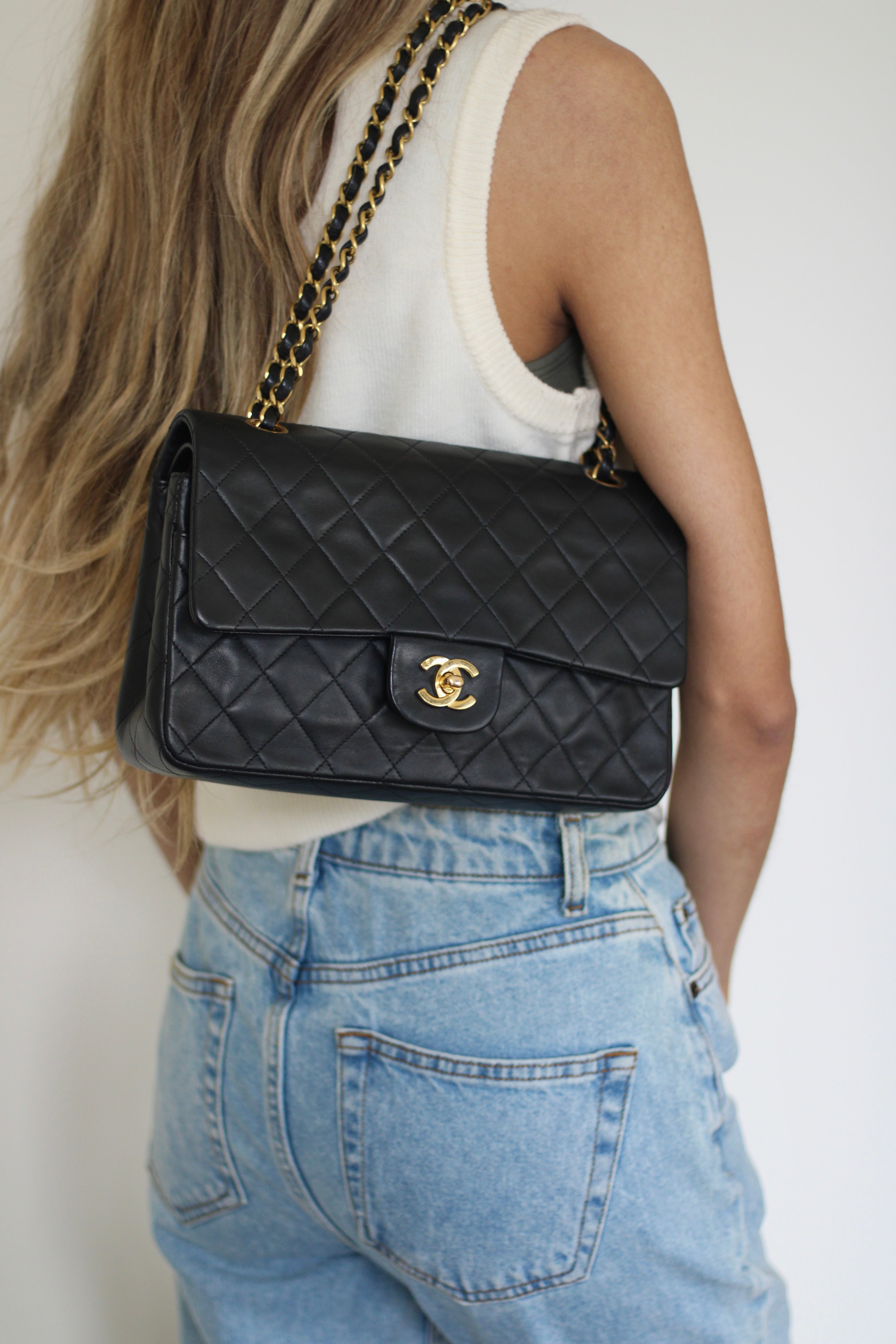 Great Vintage Condition. Gorgeous dark navy but appears as black lambskin leather complimented by stunning 24k gold hardware. A crease along bottom of the front side. Some light tarnishing on male part of turnlock and a tiny scuff on front right side. Interior has a vintage leather scent.