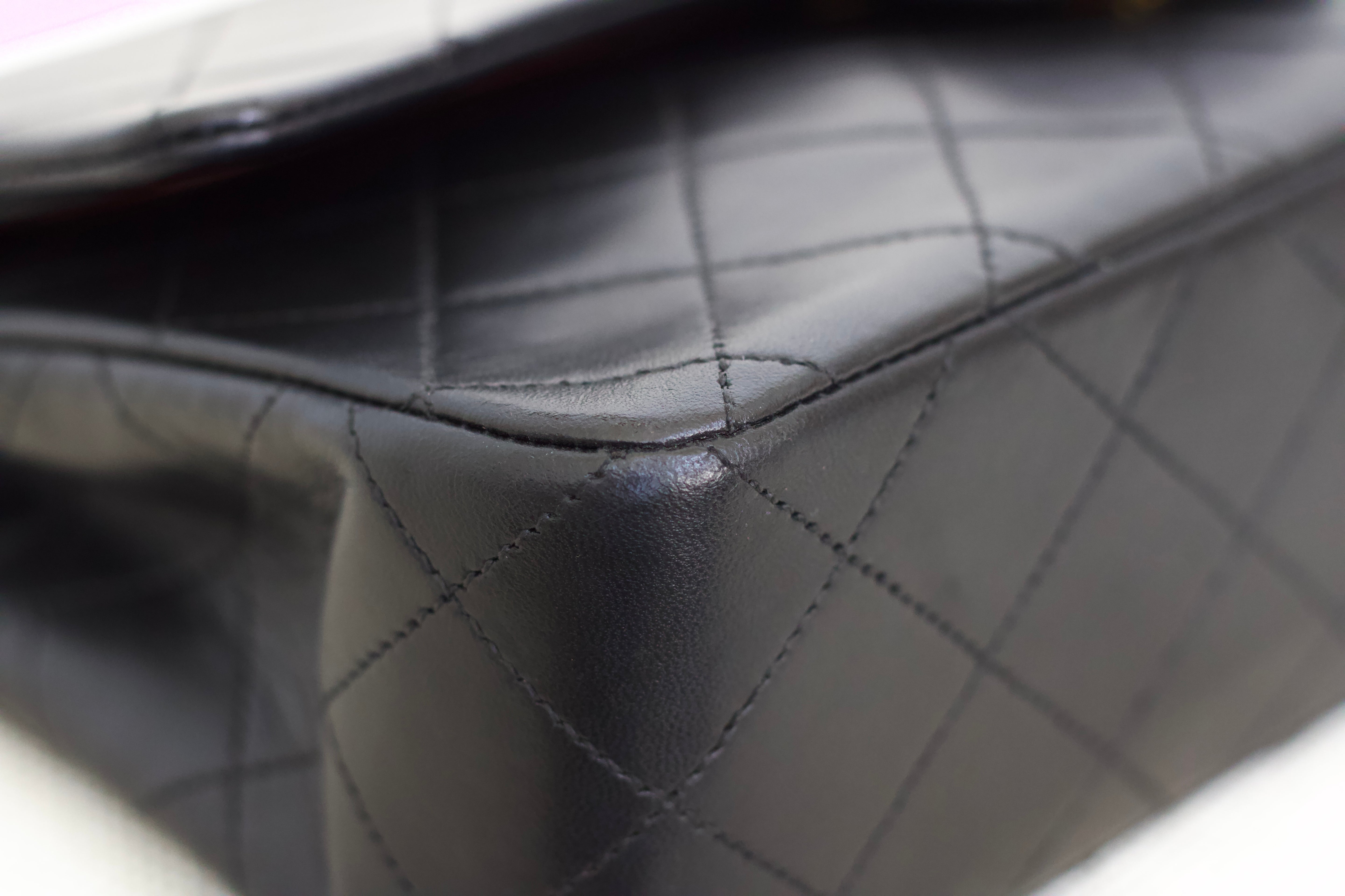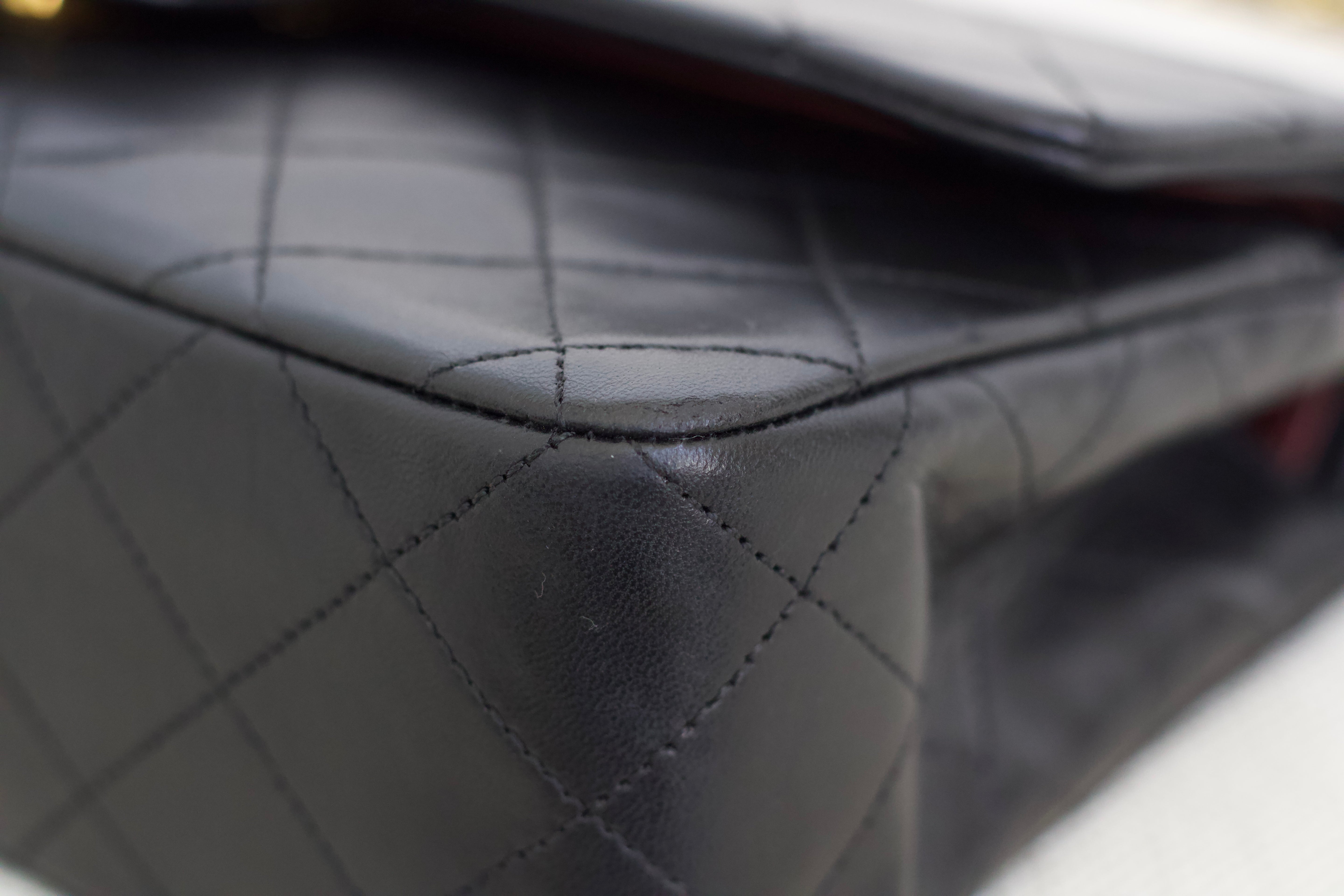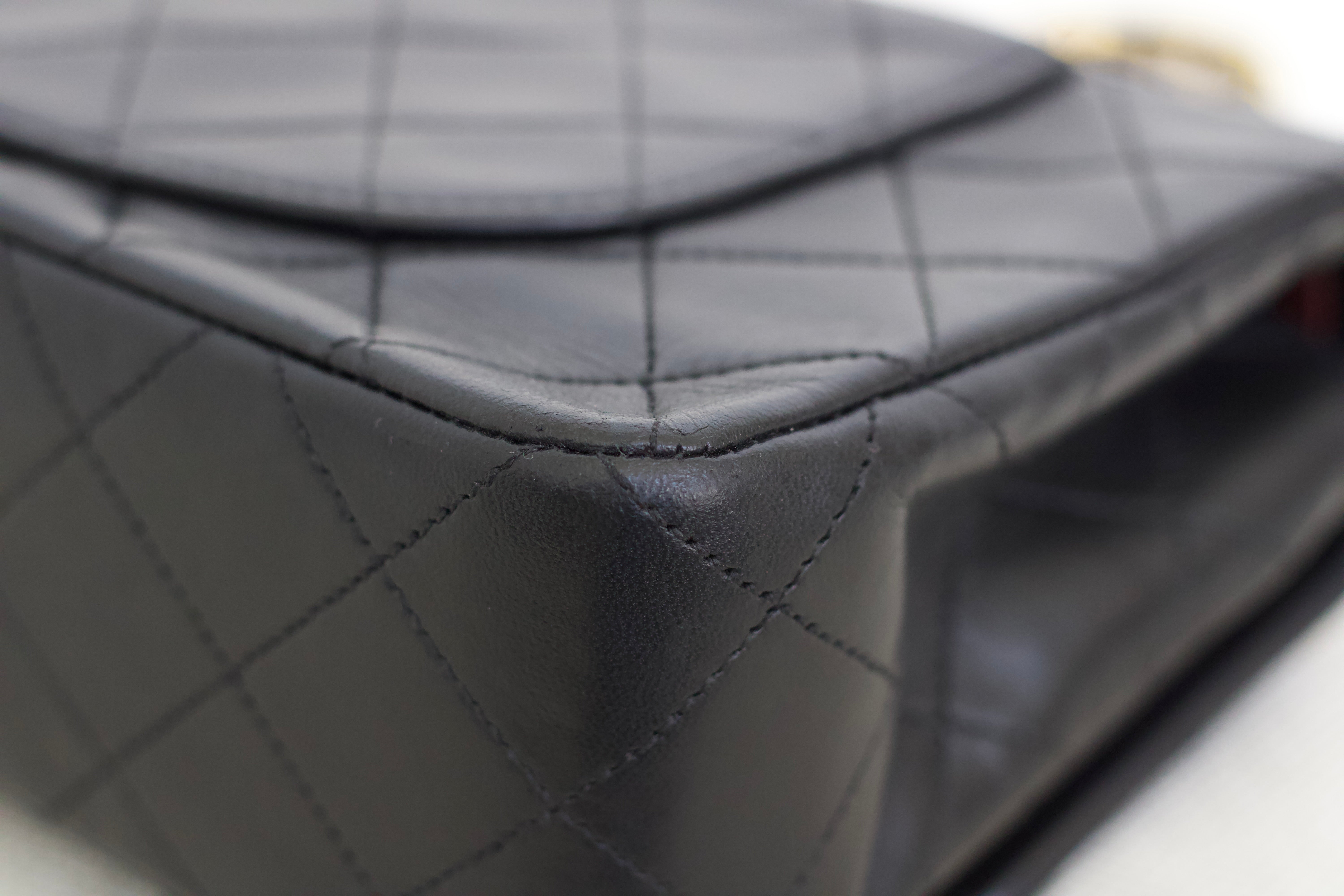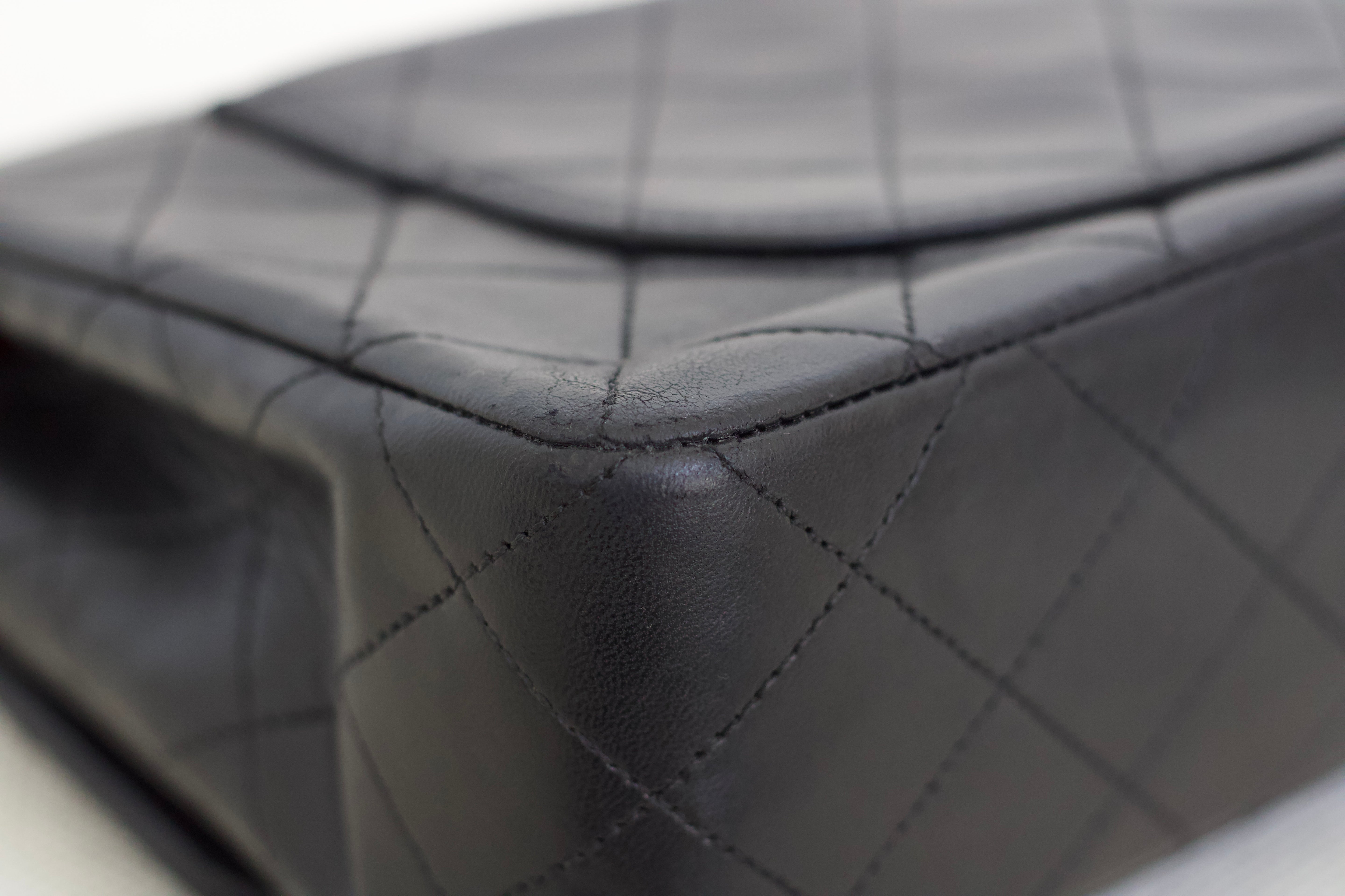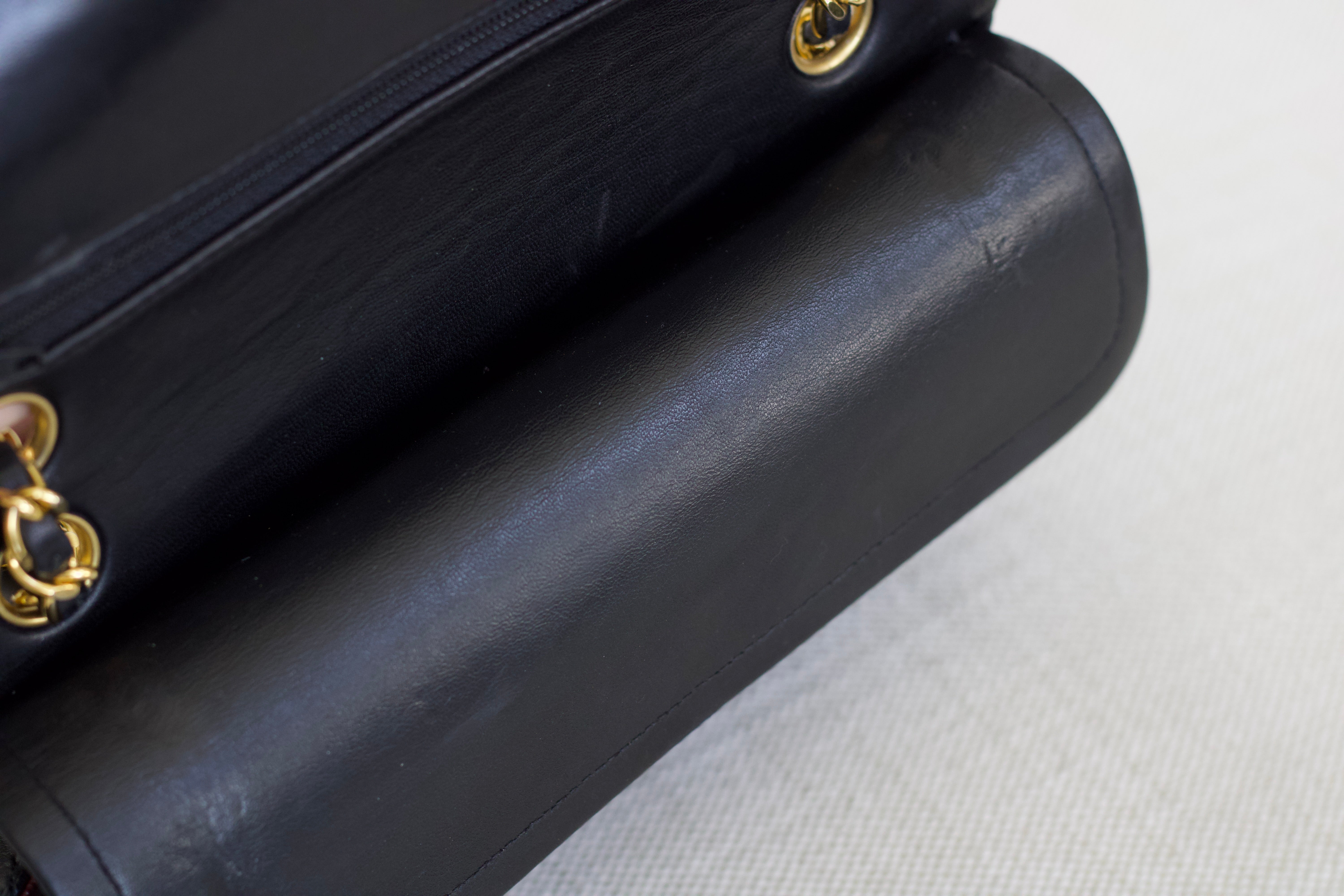 Great Vintage Condition. Gorgeous black lambskin leather complimented with 24k gold hardware with some scratches. Excellent structure and some minor wear on corners. Has possibly been retouched, most likely on the back pocket.