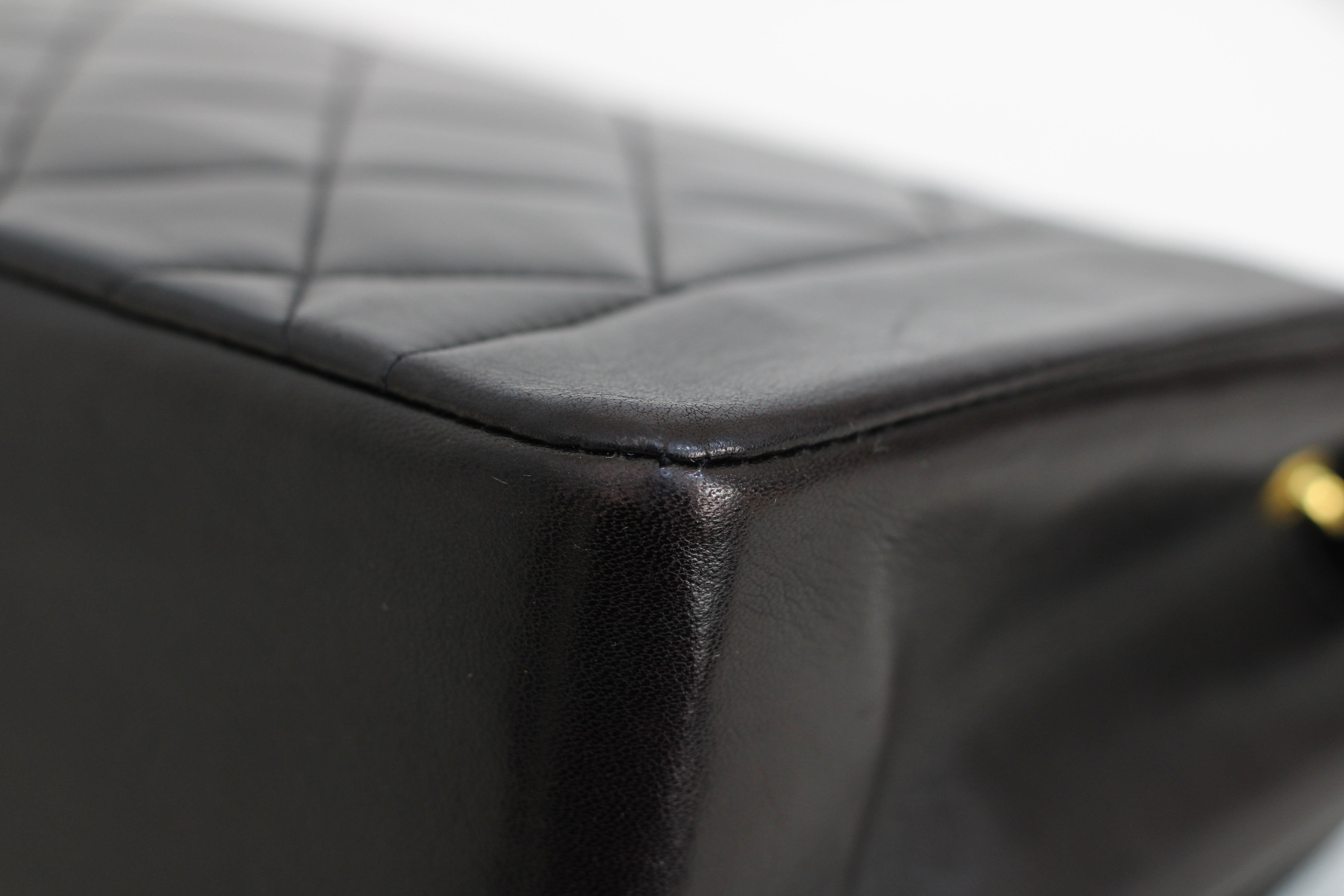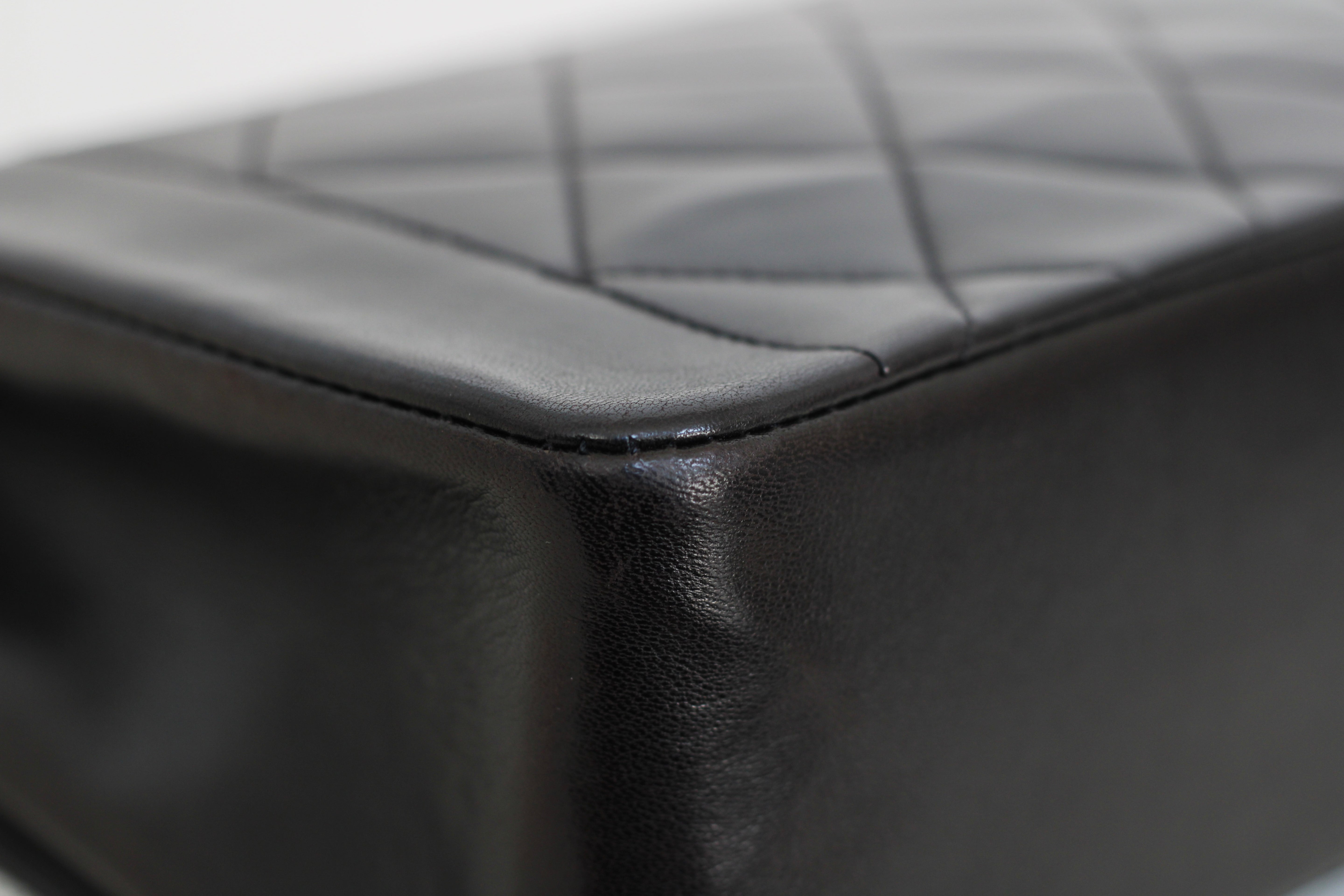 Excellent Vintage Condition. Buttery lambskin leather complimented by a stunning sheen. A slight crease along bottom and some light wear on corners as pictured. Brilliant 24k gold hardware with hairline scratches.