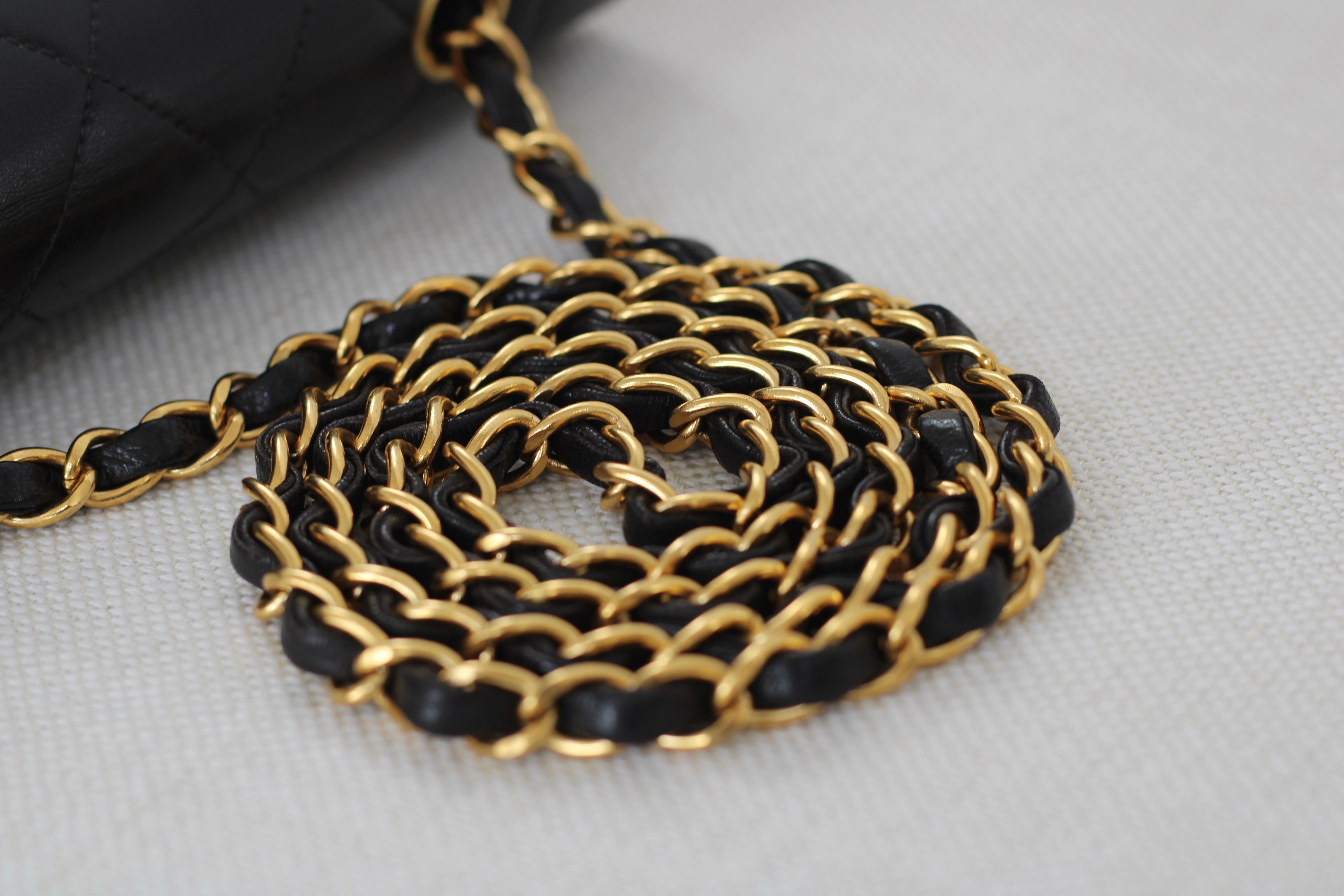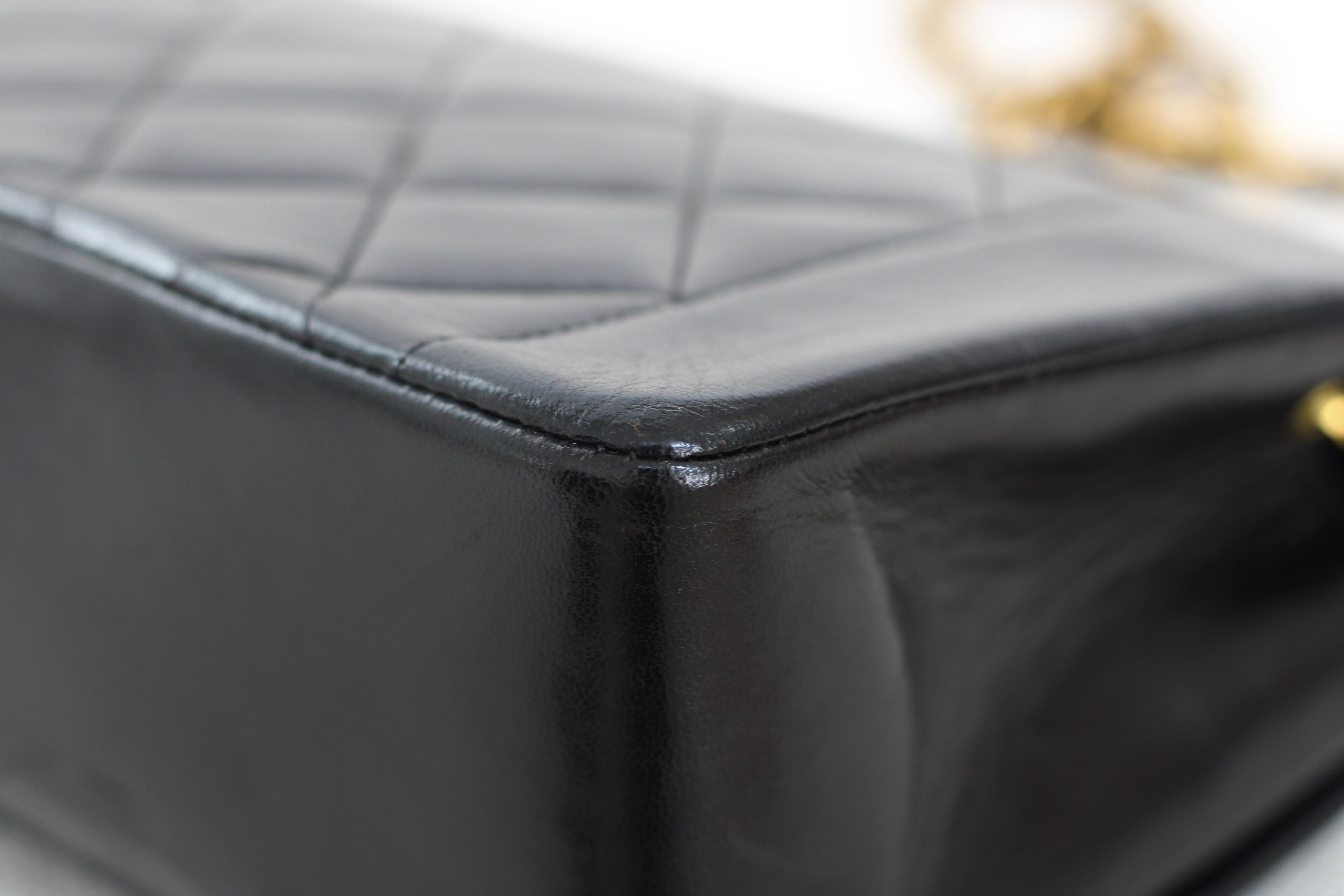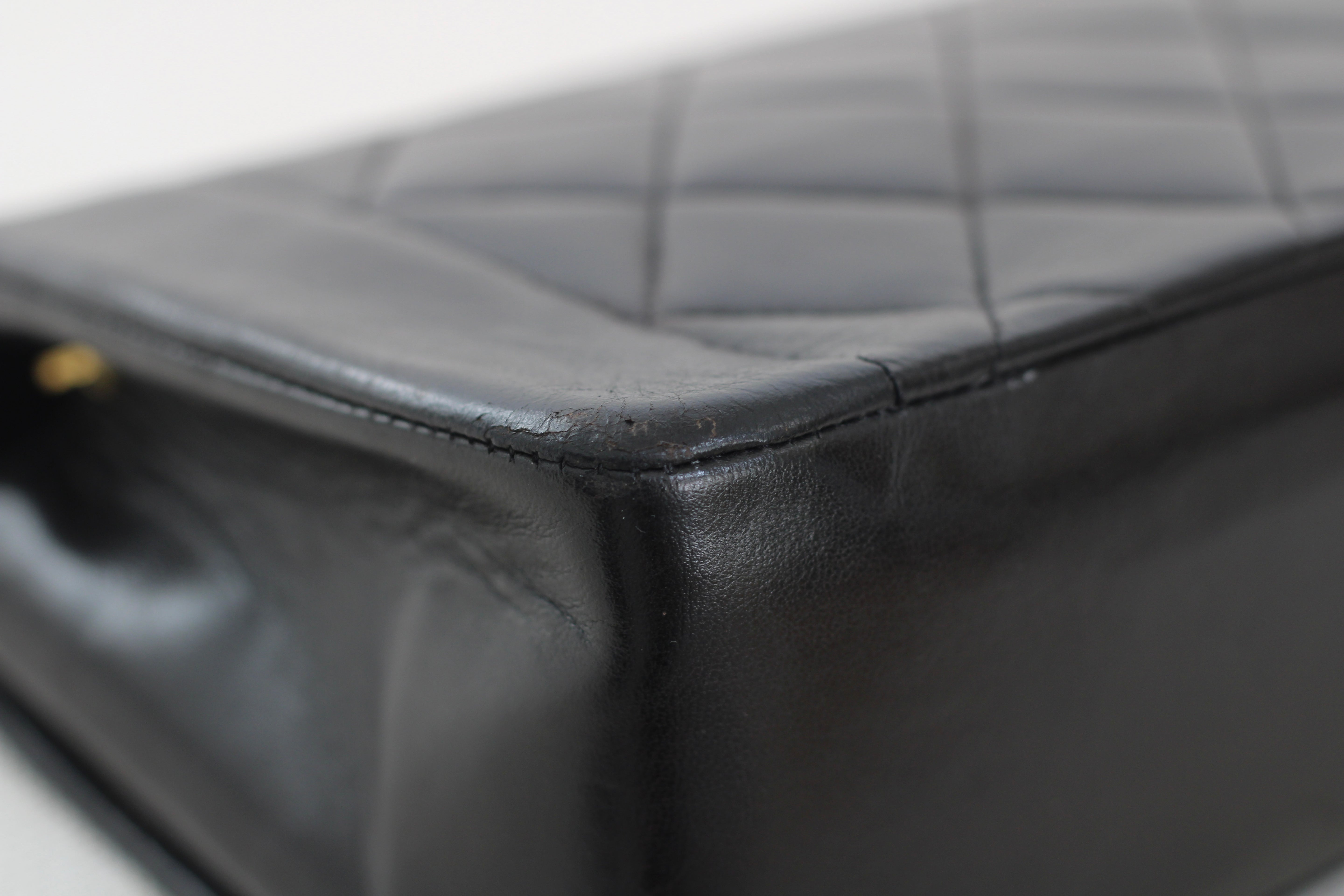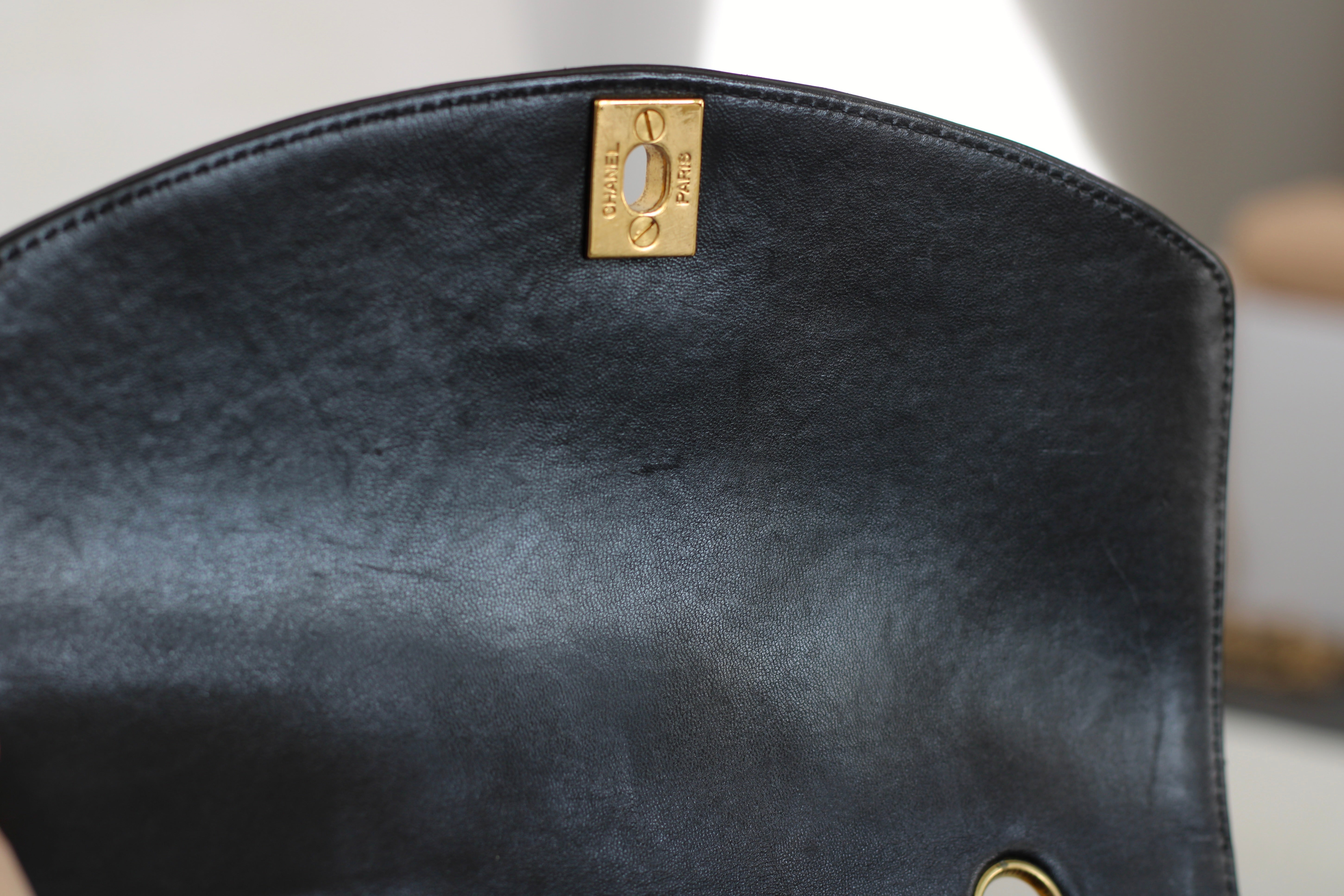 Excellent/Great Vintage Condition. Beautifully soft and supple black lambskin with a stunning sheen. Some scratches. A crease running along bottom of front side and some wear on corners. Brilliant 24k gold hardware with scratches.