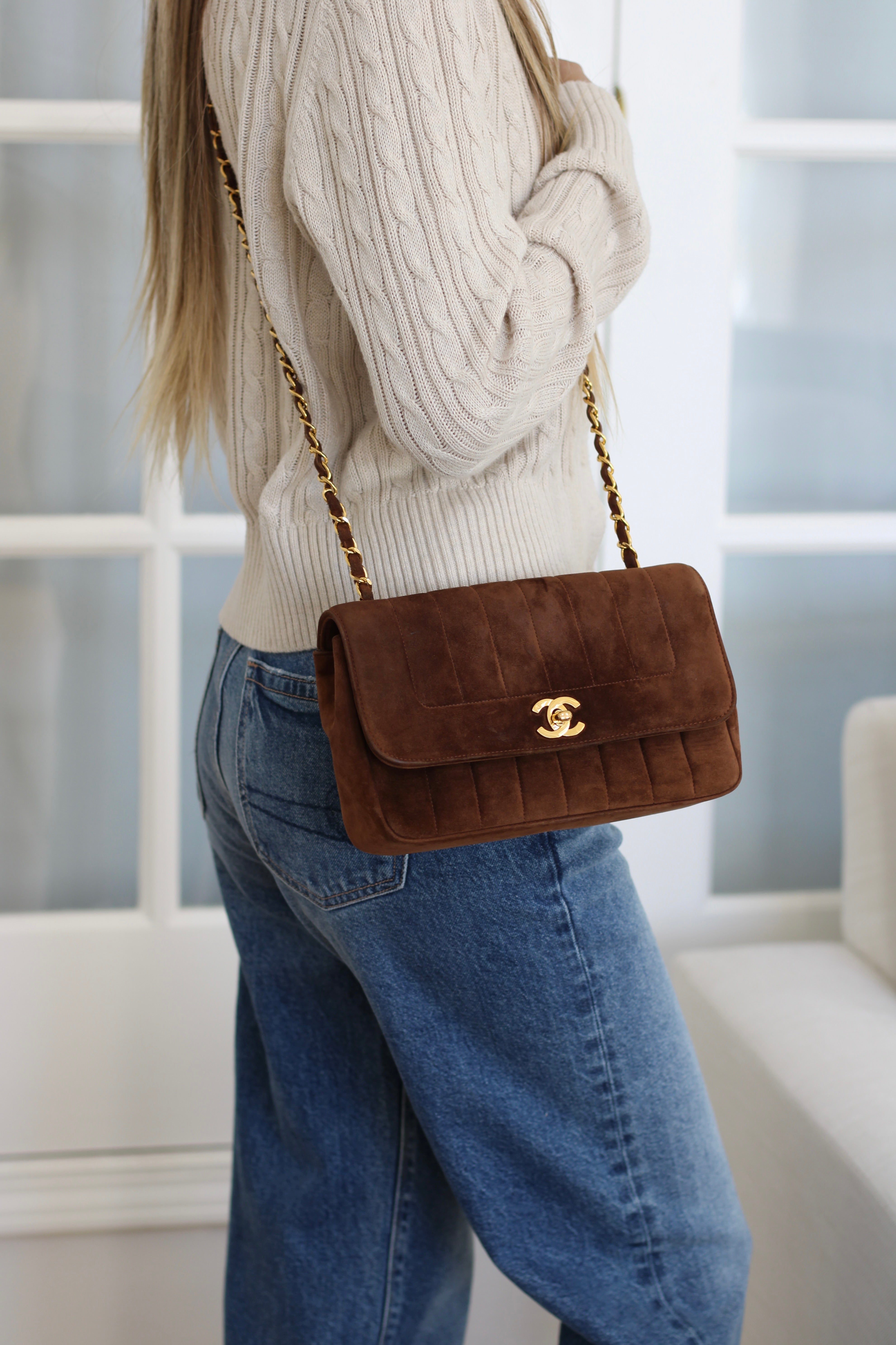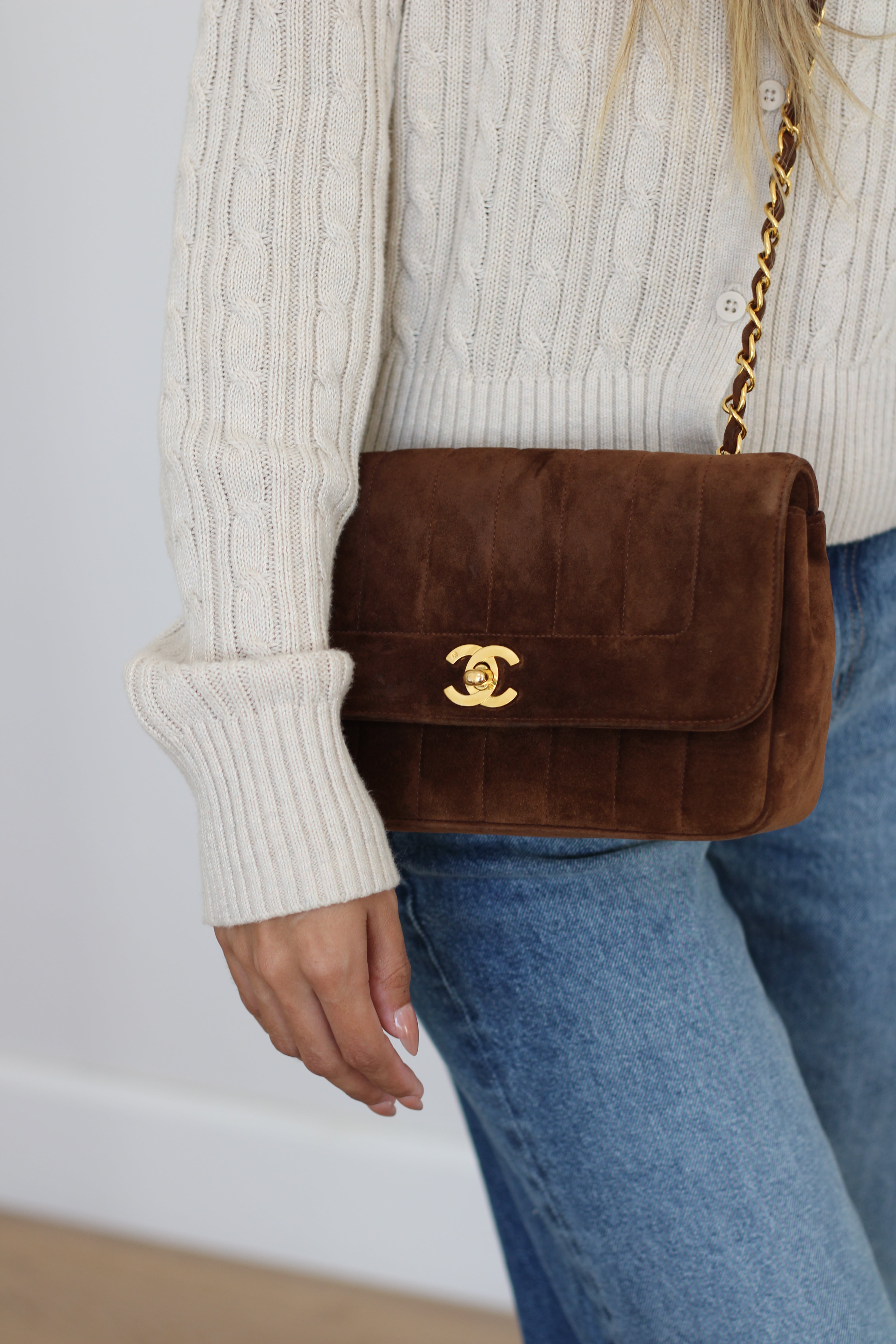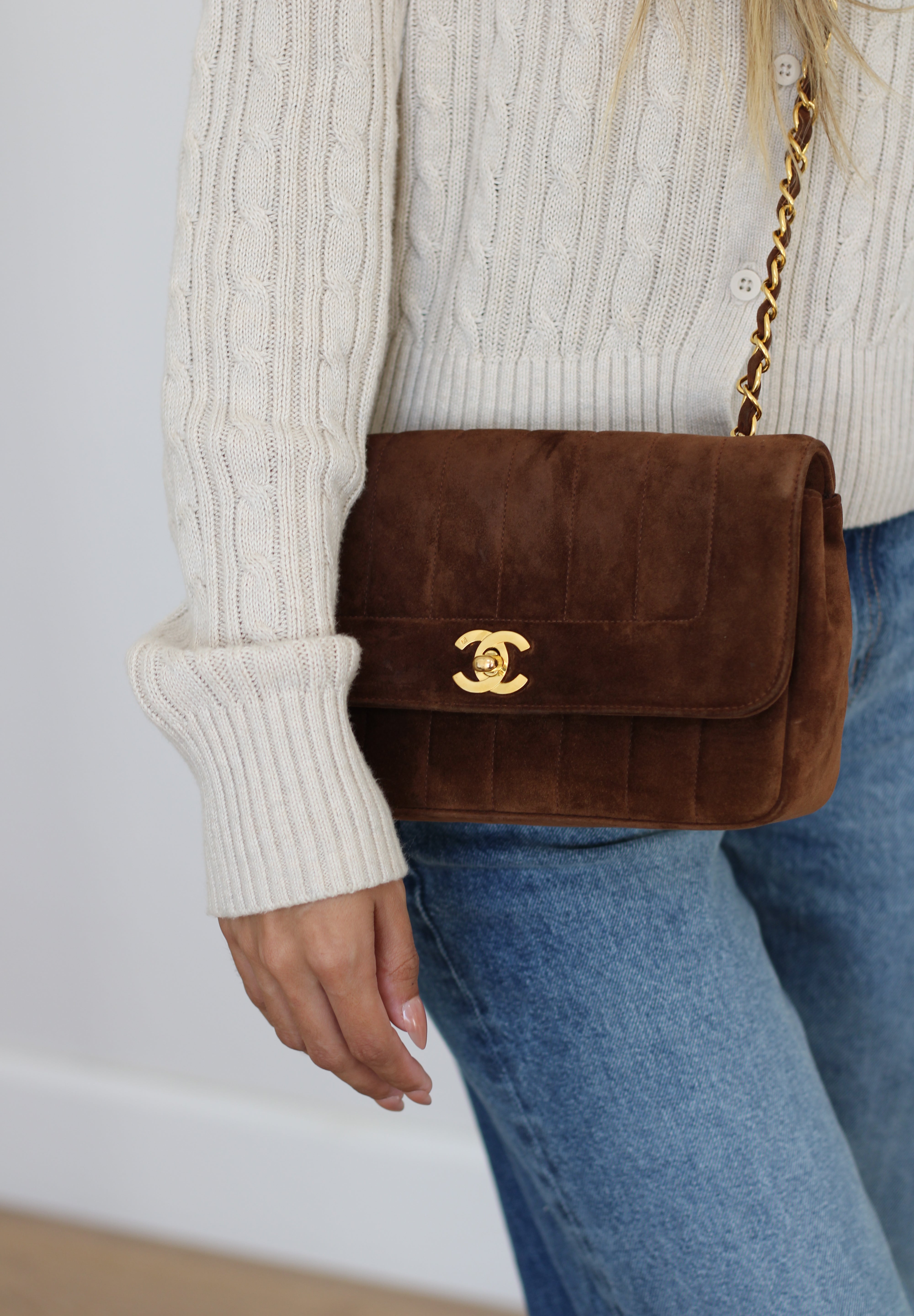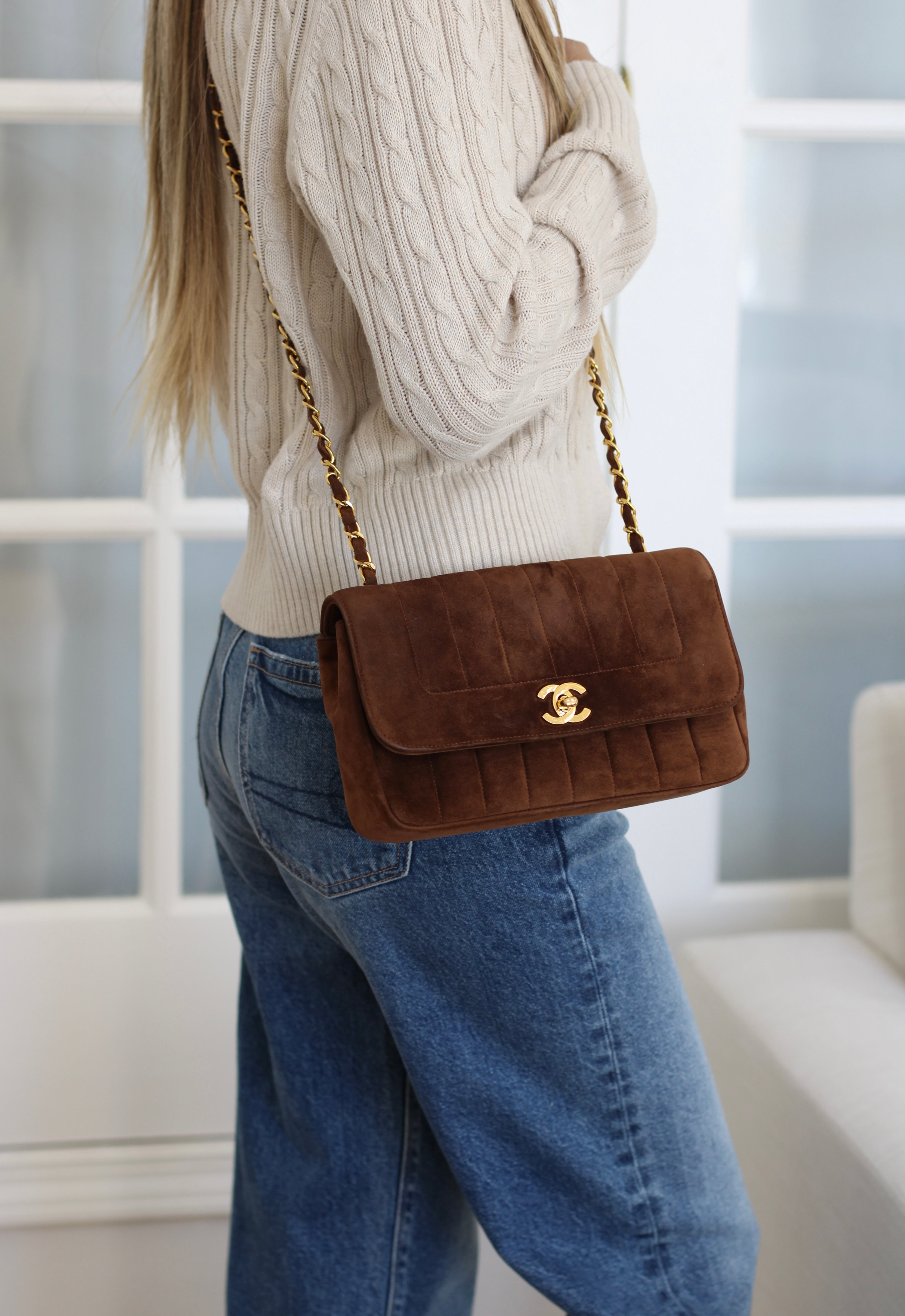 Vintage Chanel Brown Suede Sheepskin Vertical Flap with 24k Gold Hardware
