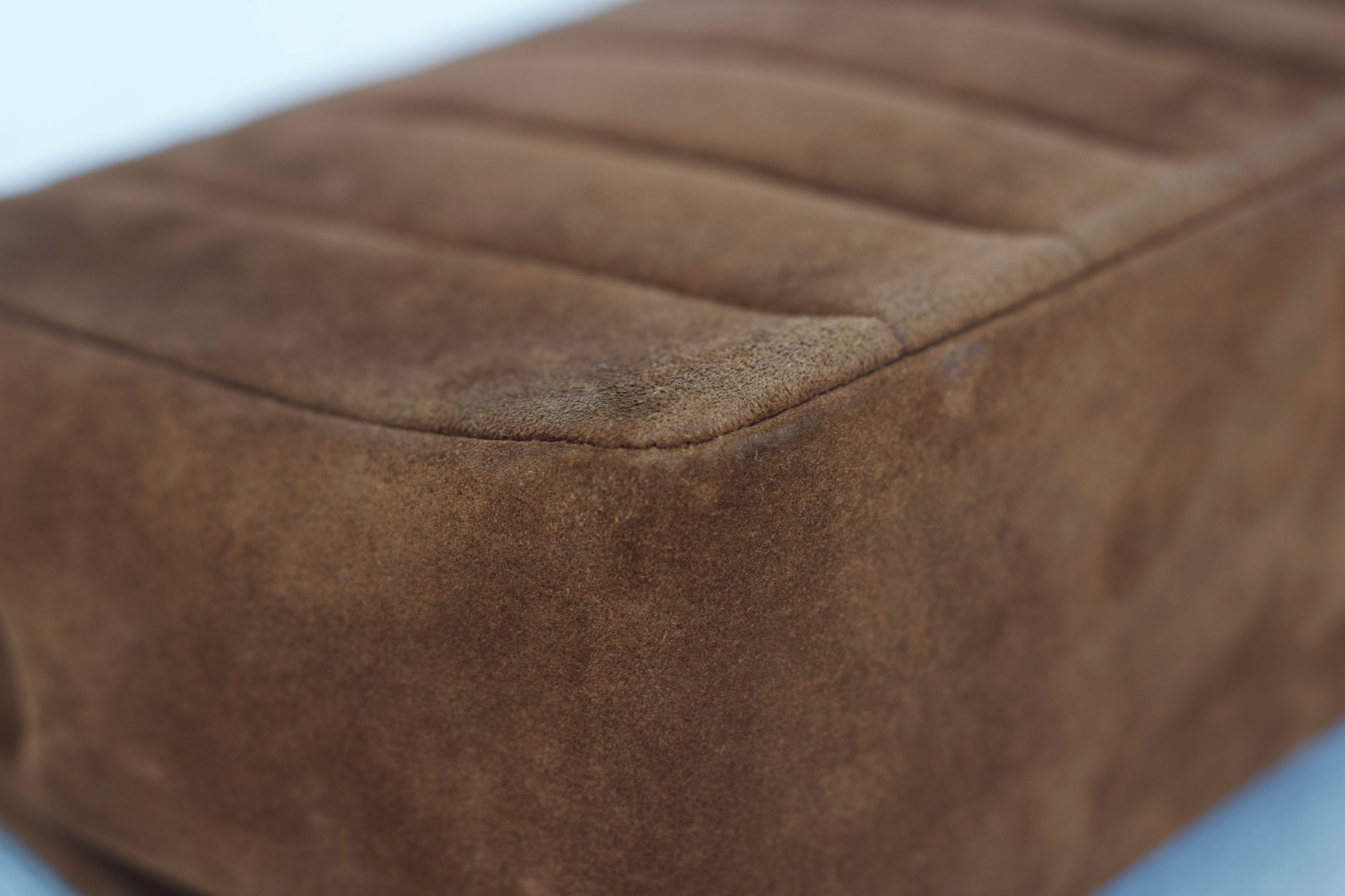 Excellent Vintage Condition. Beautifully soft suede sheepskin leather complimented by stunning 24k gold plated hardware. Very light rubbing on corners and sides stick out very slightly. Some very light stains on front.