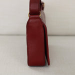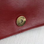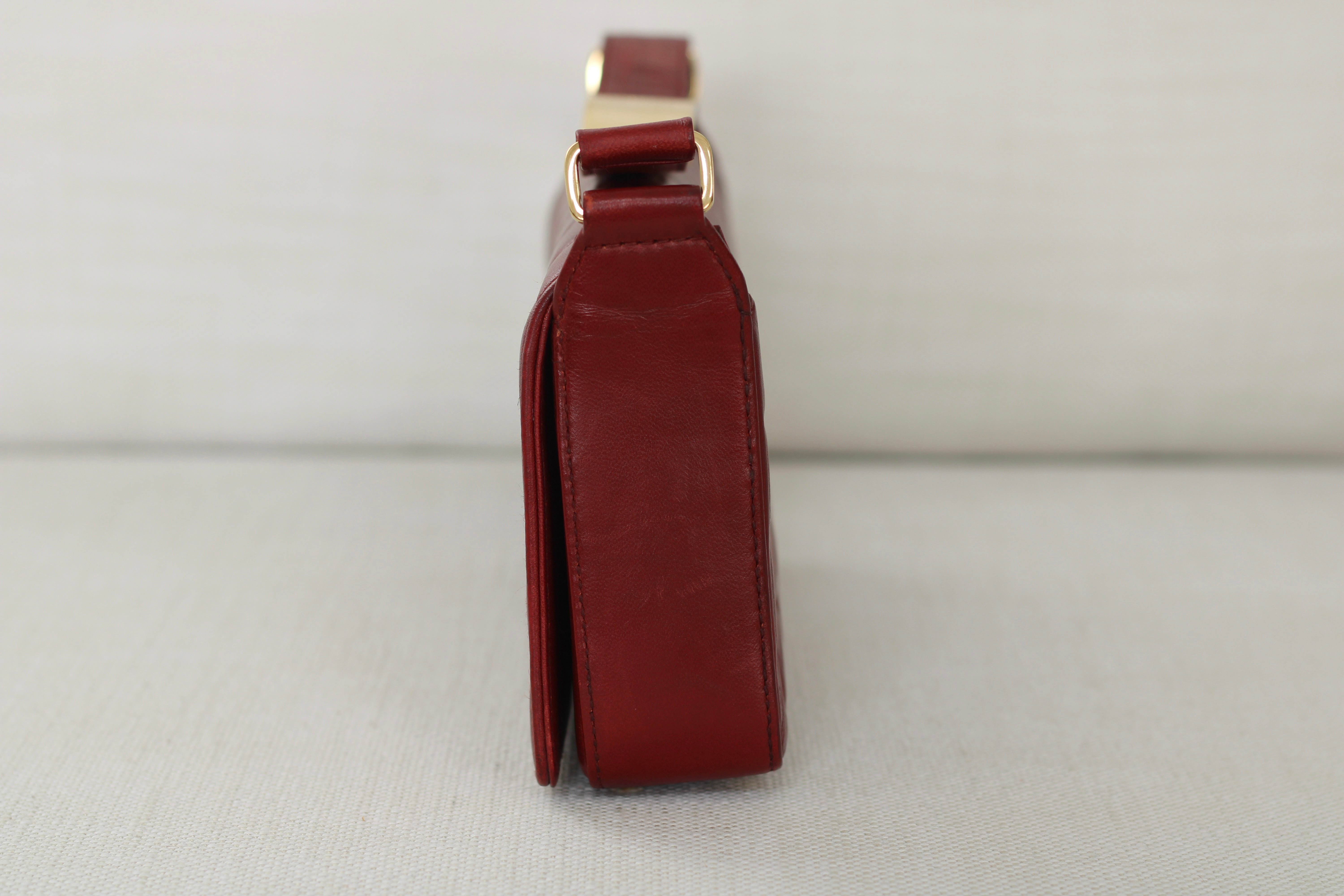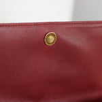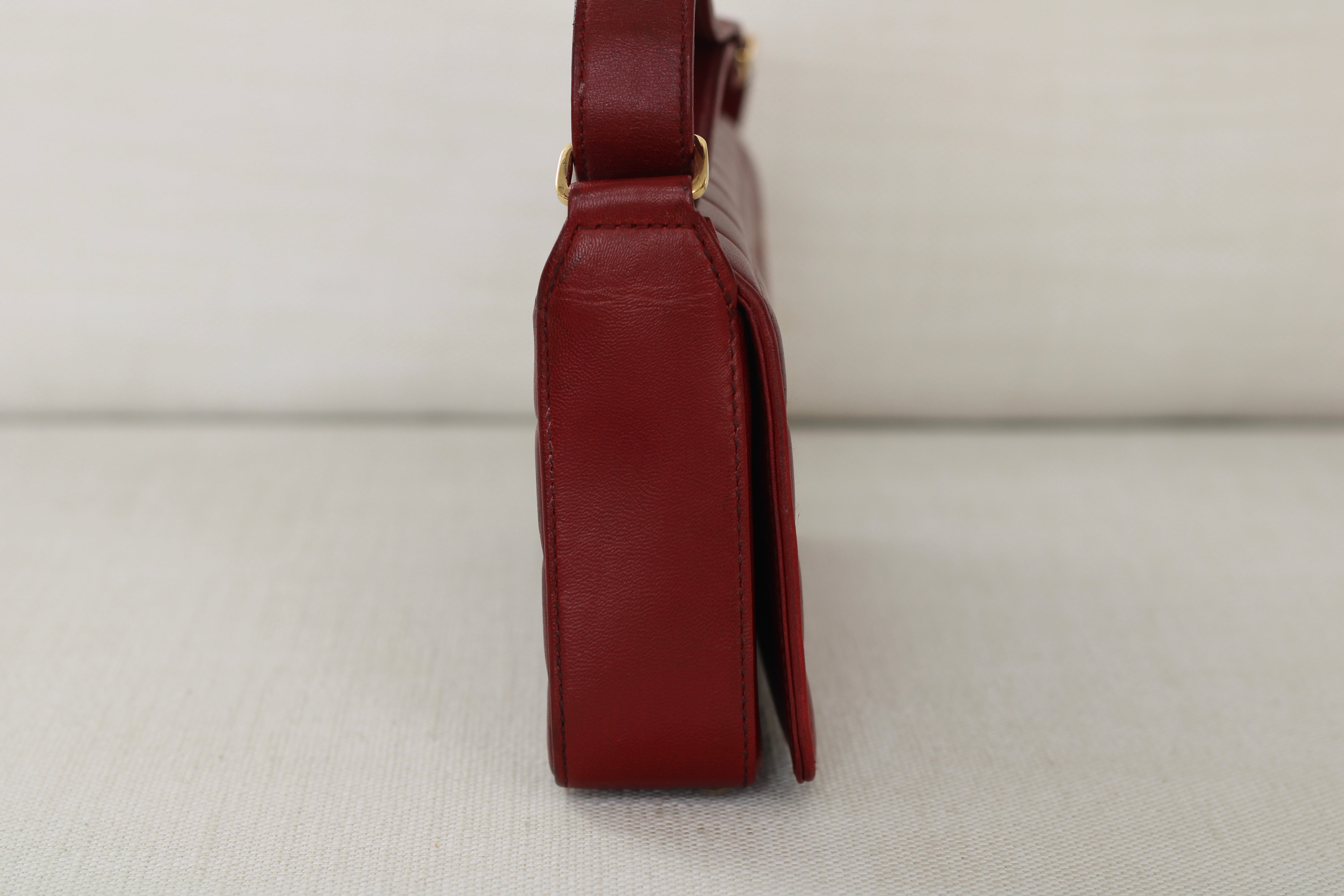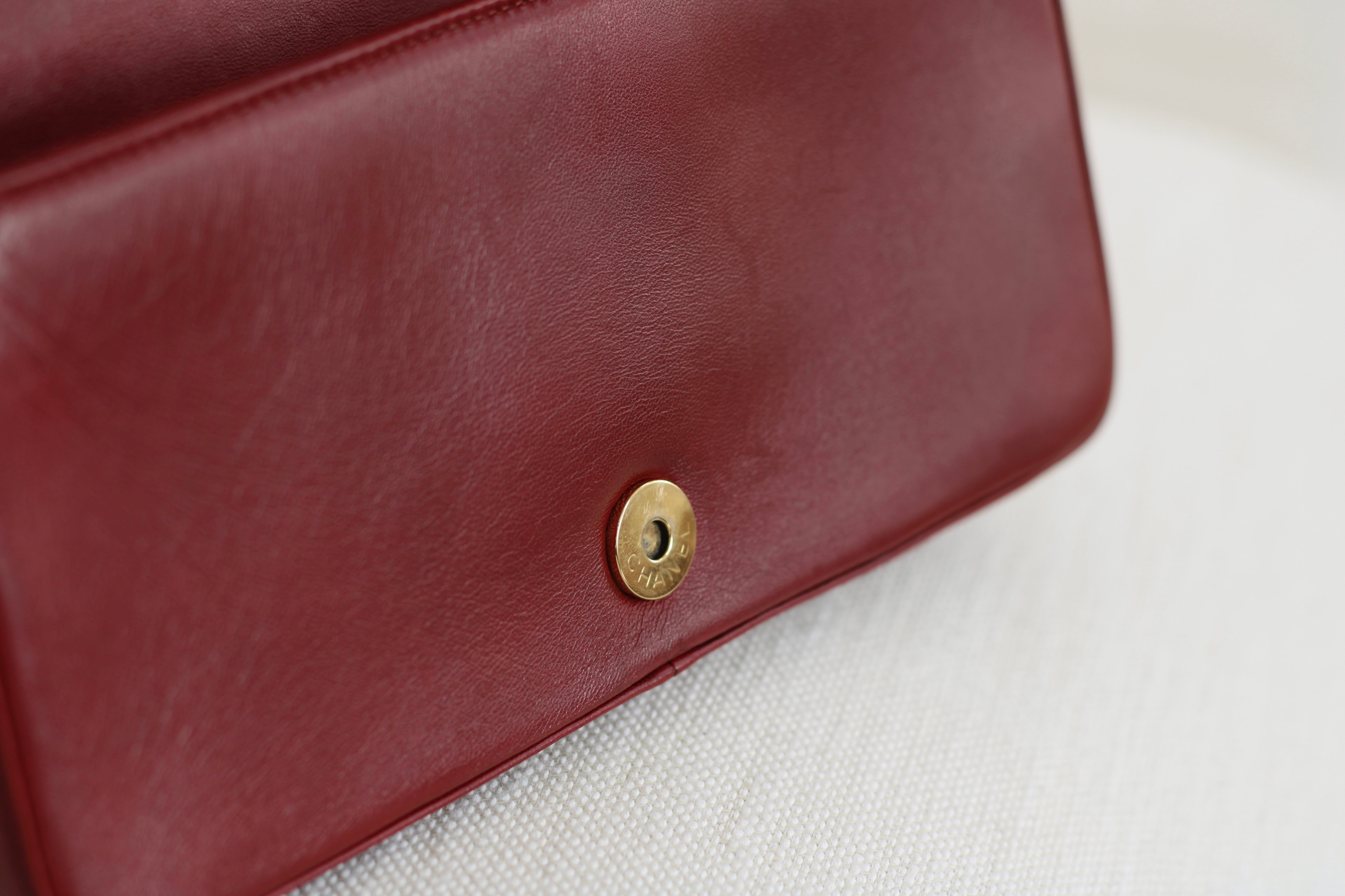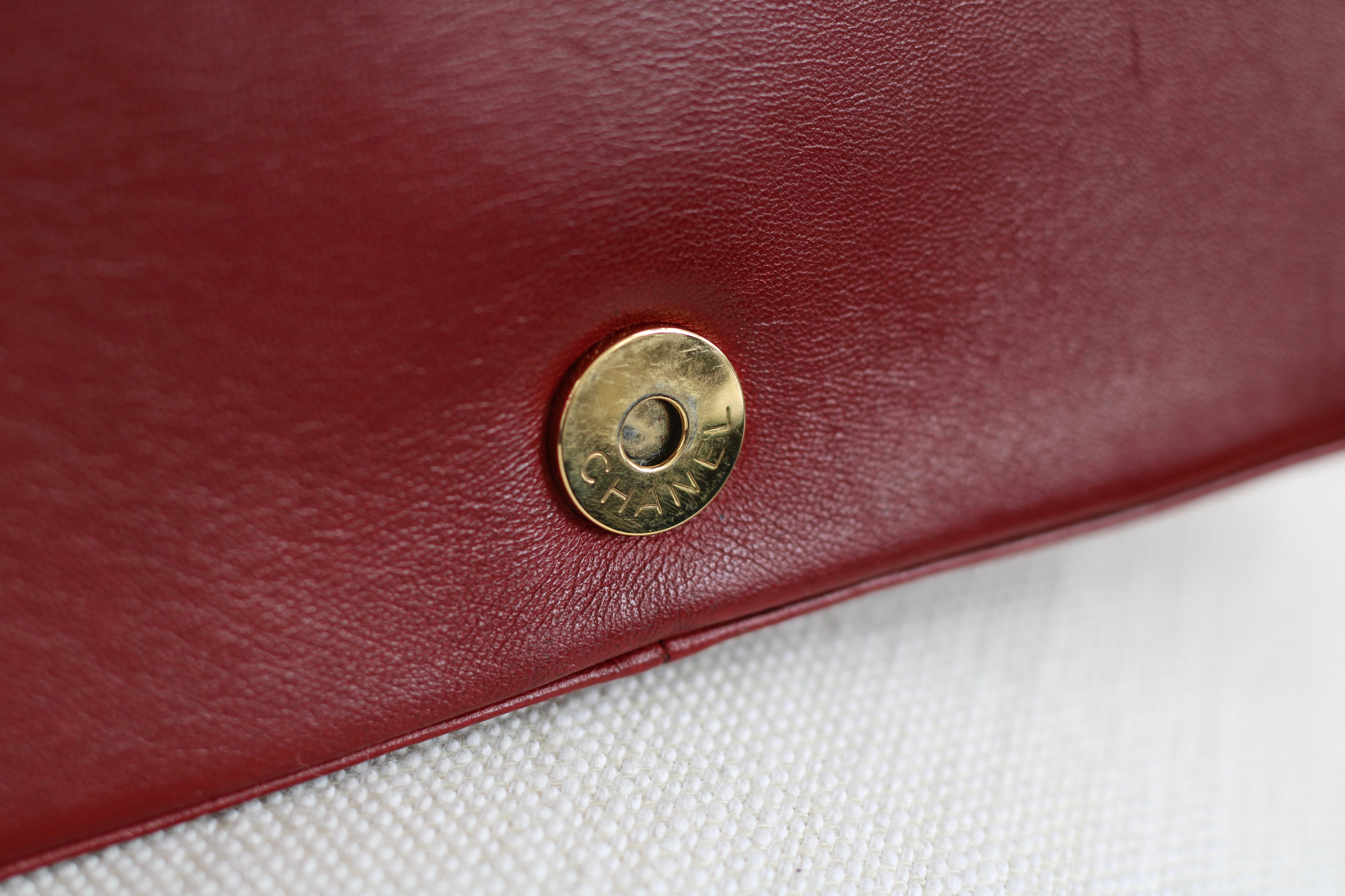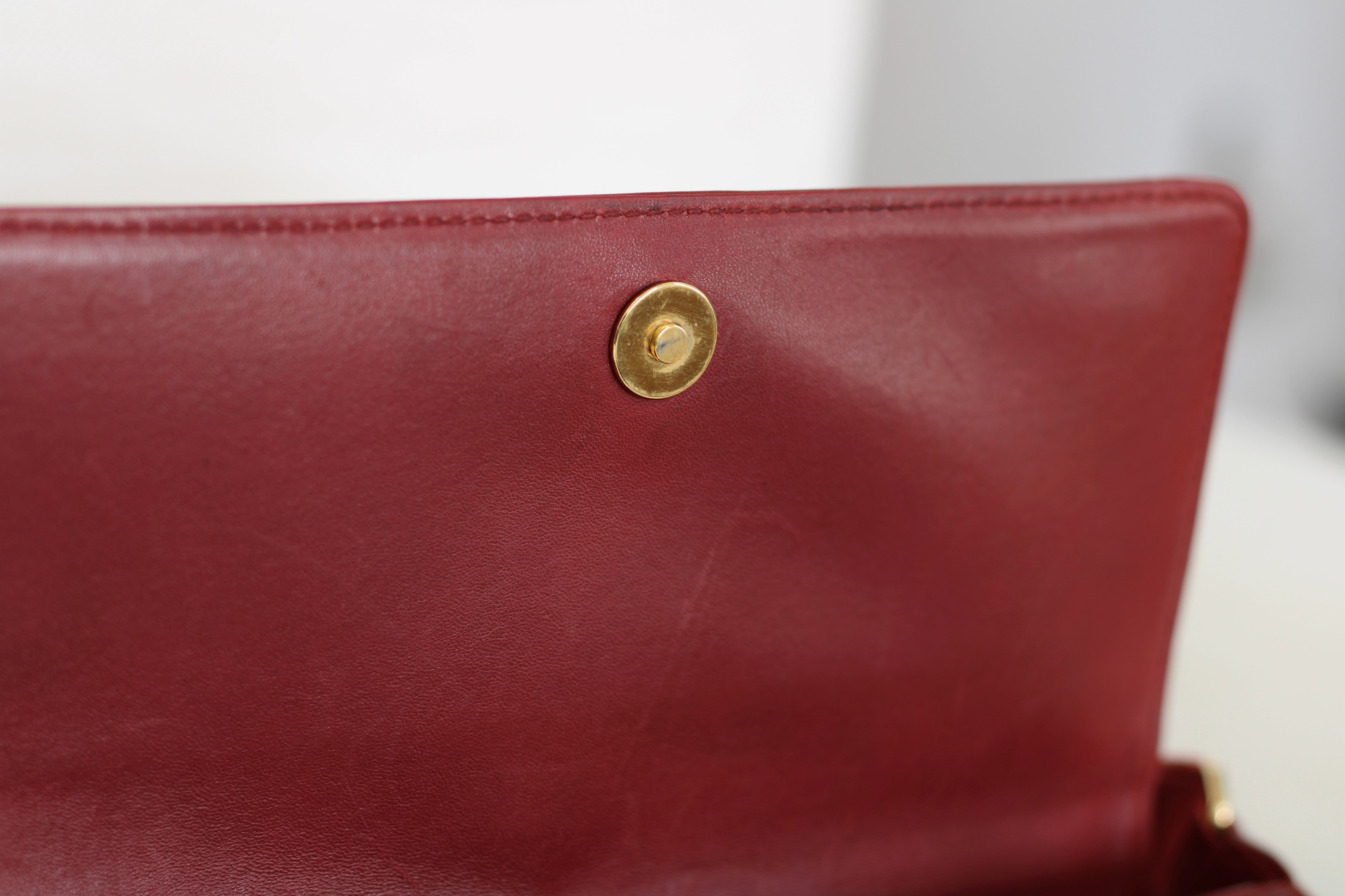 Excellent Vintage Condition. Beautiful shade of burgundy in soft lambskin leather. Excellent structure and light corner wear. Some minor darkening throughout. Gorgeous gold hardware with scratches.