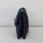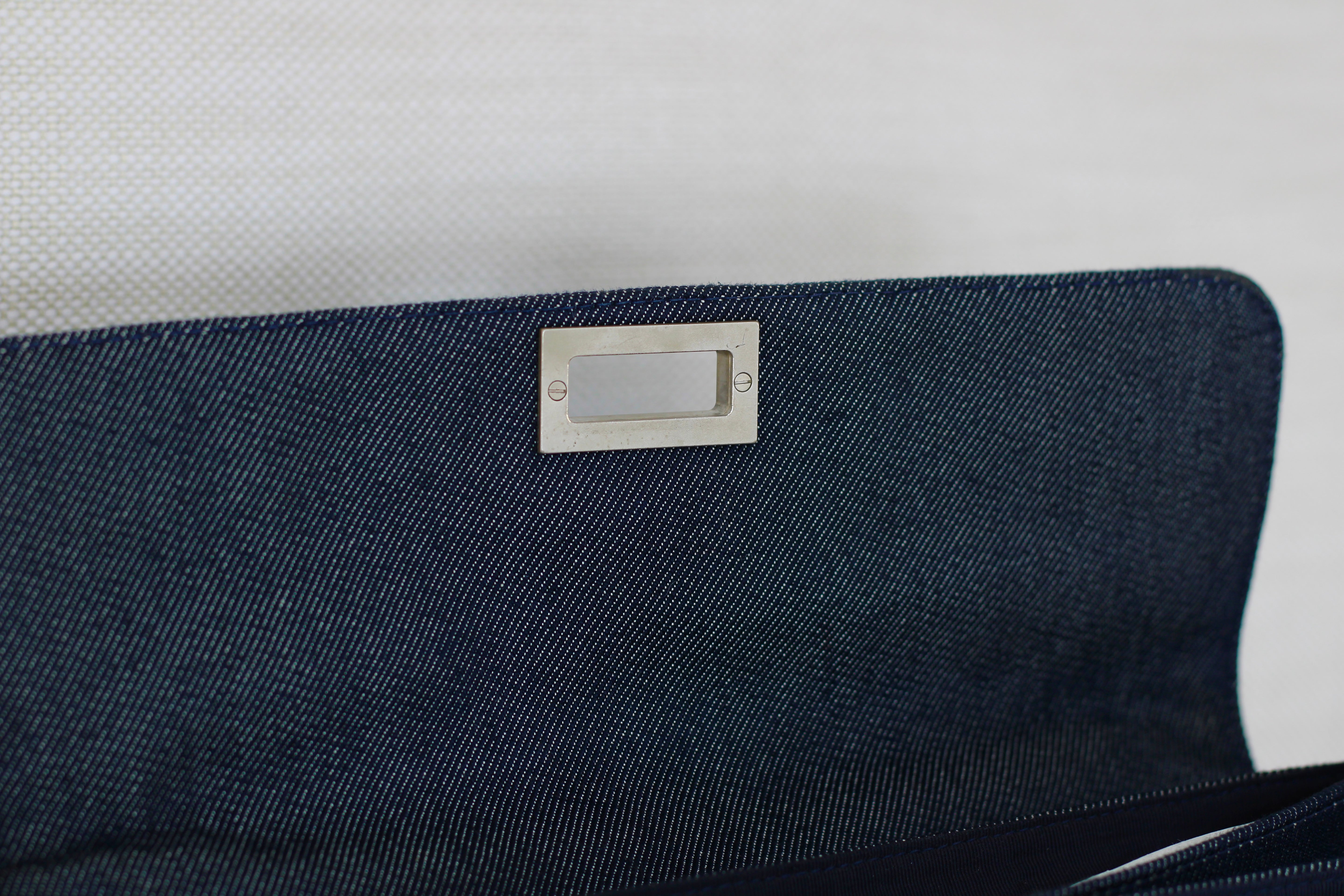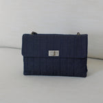 Excellent Vintage Condition. Stunning chocolate bar quilts in beautiful dark blue denim. Excellent structure and corners. Gorgeous aged silver tone hardware with some light tarnishing on turnlock and chains.